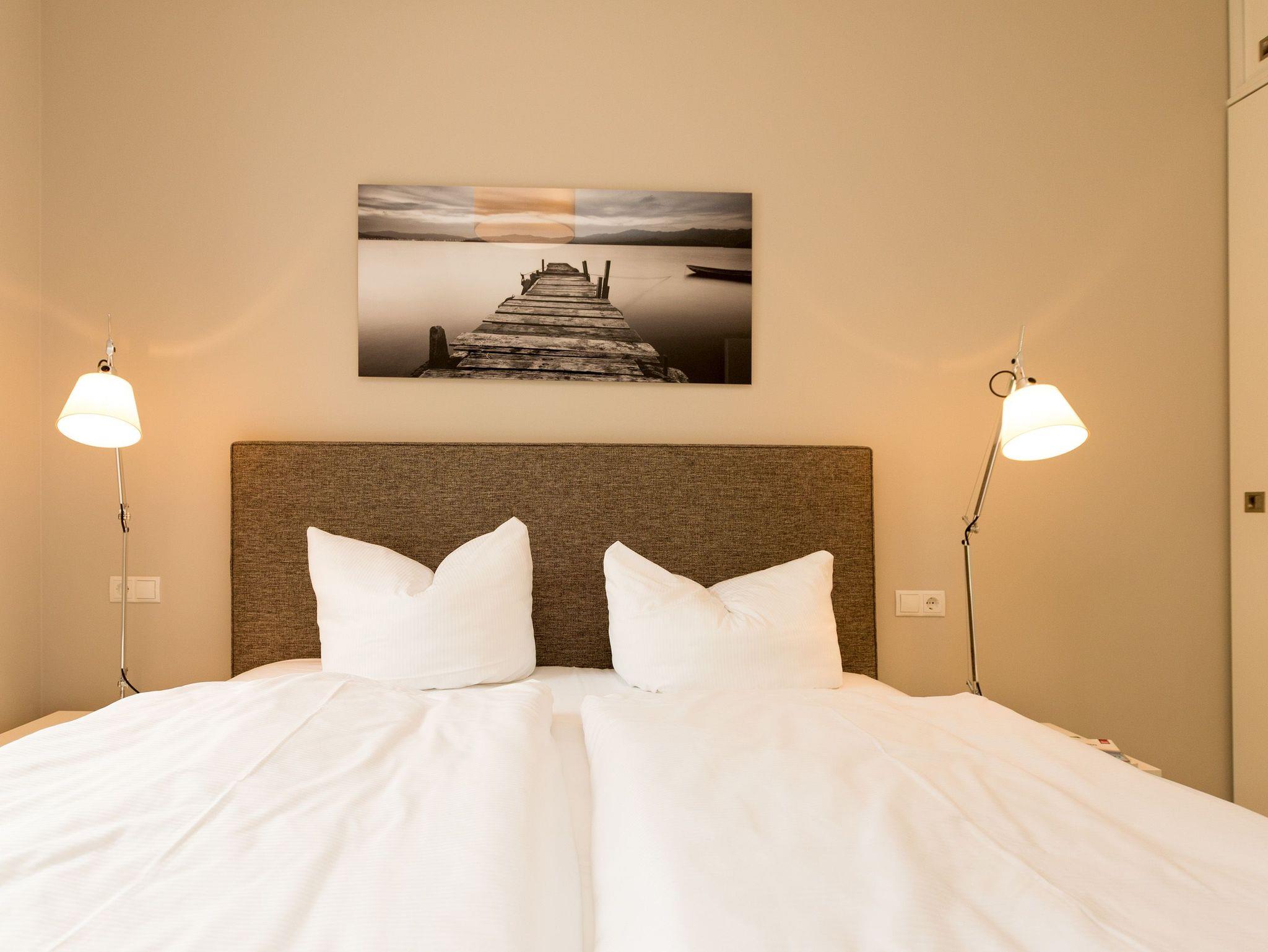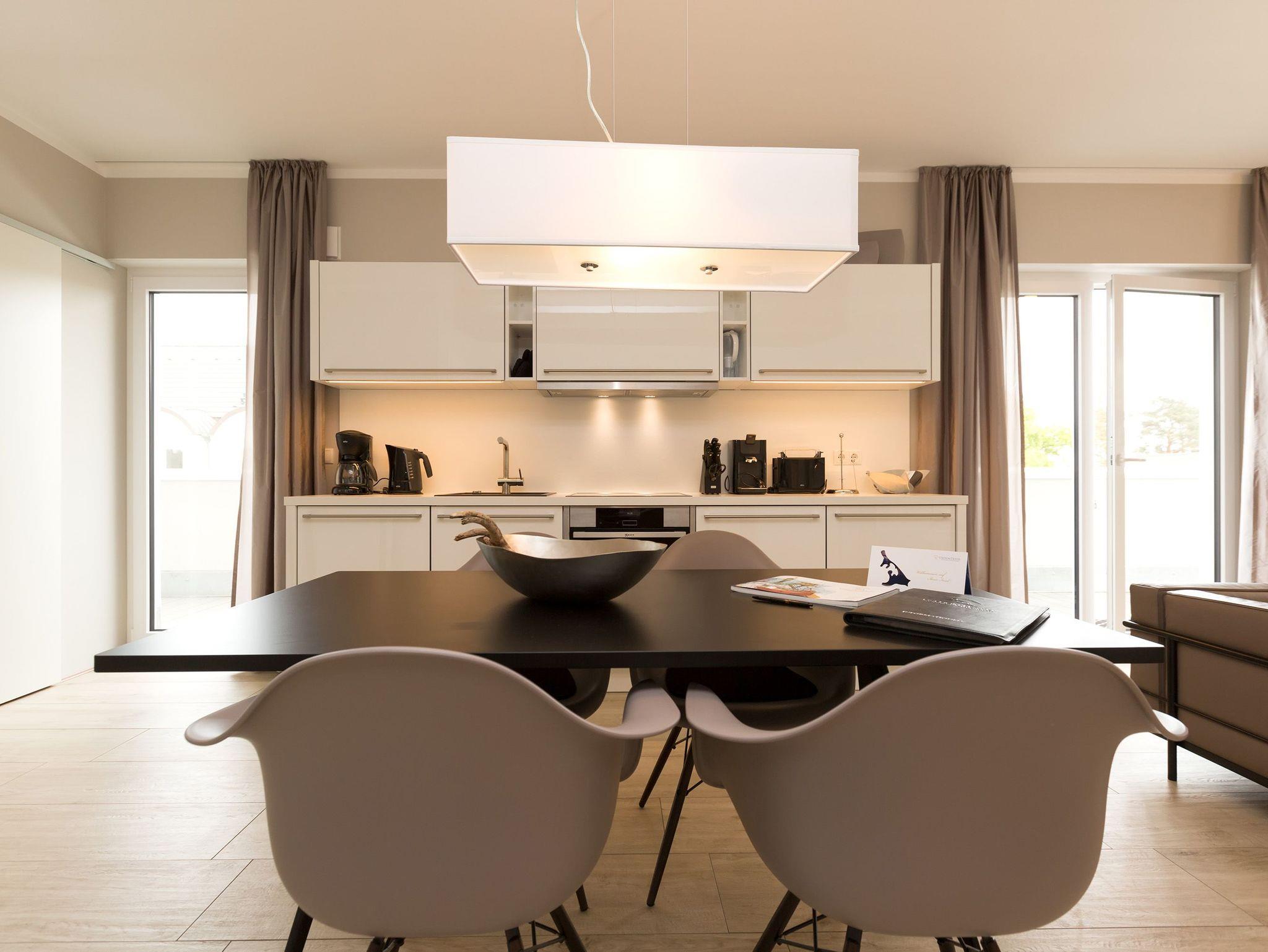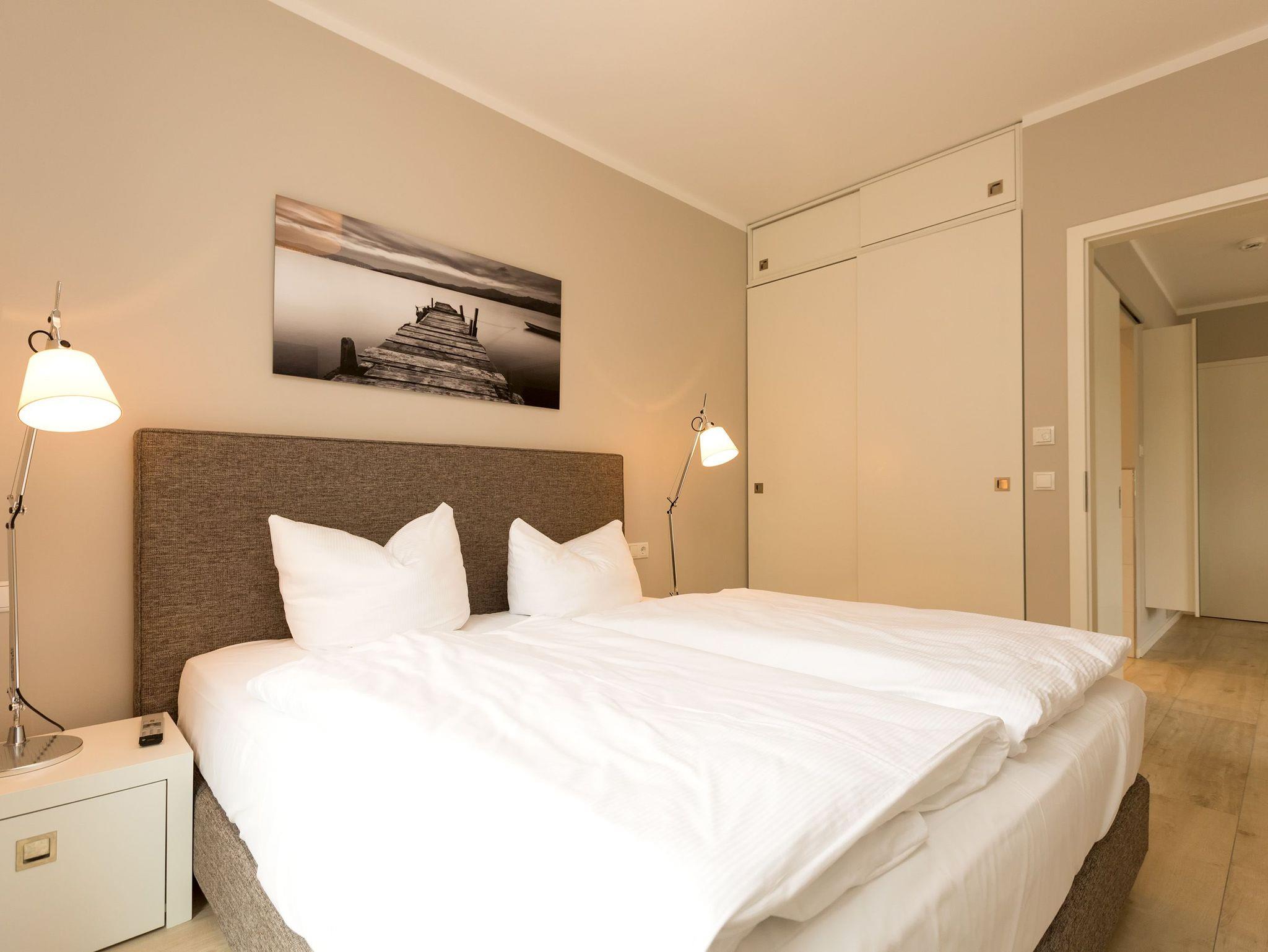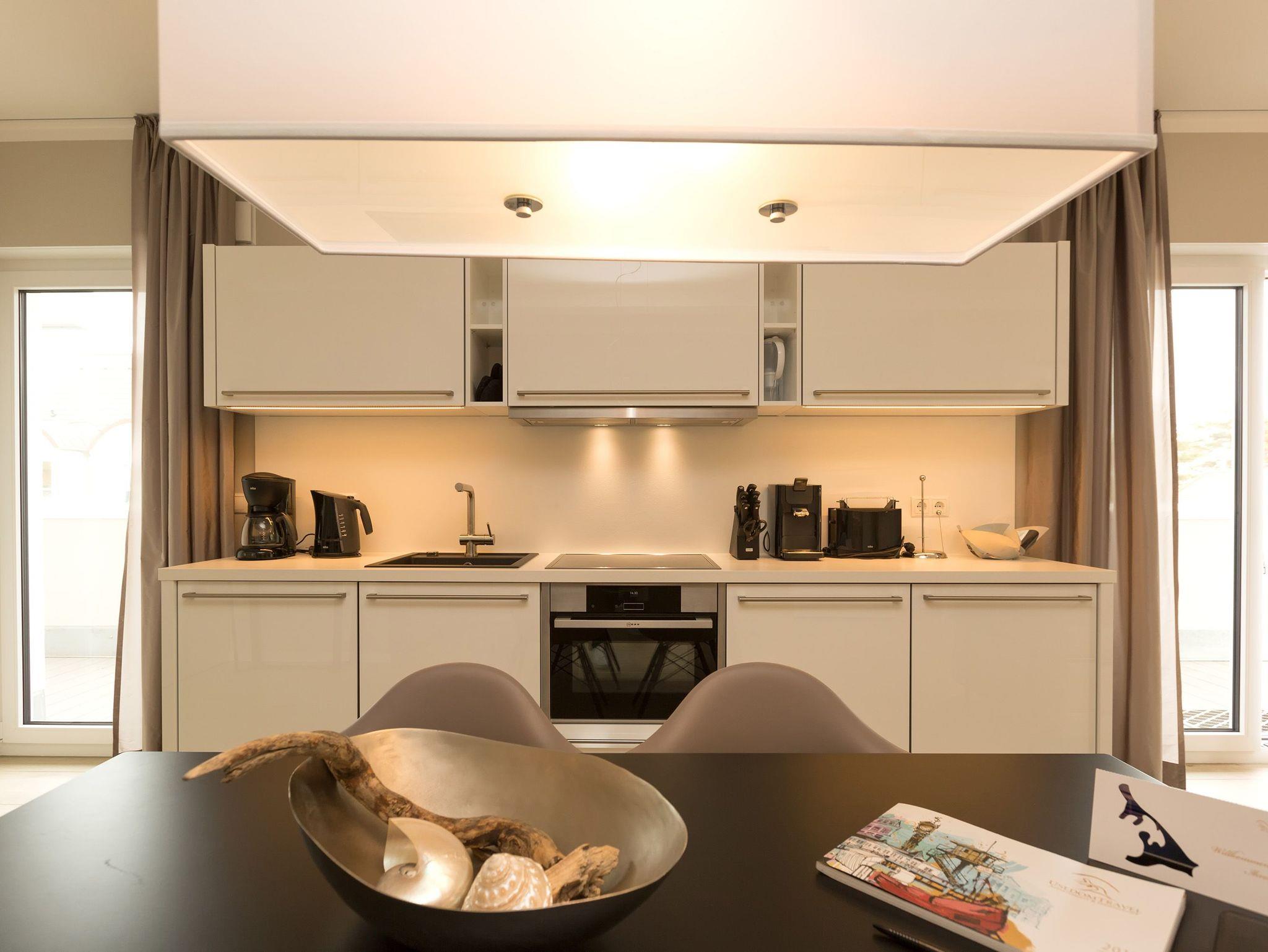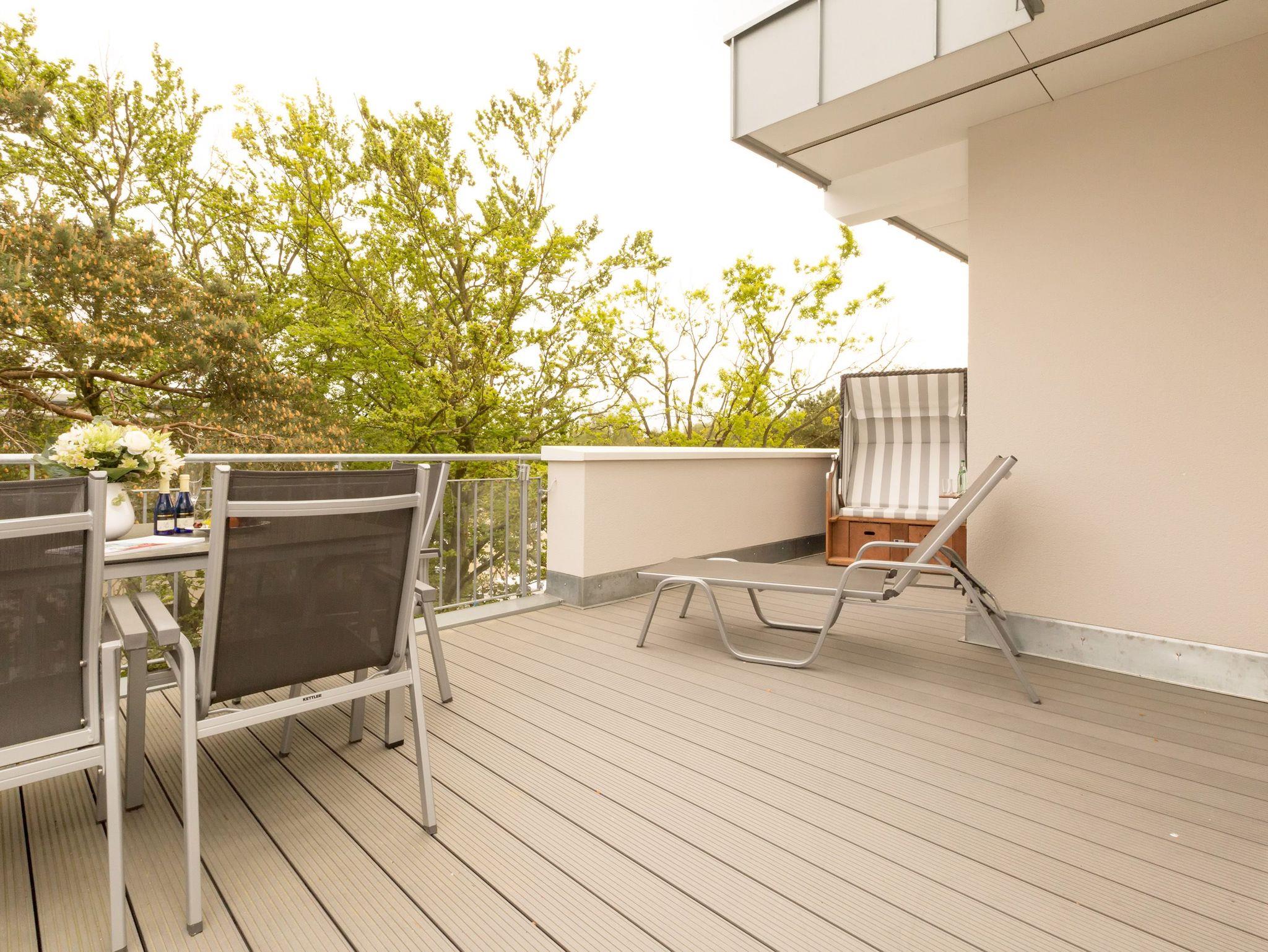 Stil. Extravaganz. Beste Lage mit Meerblick von der Dachterrasse! Edle sandfarbene Töne schaffen für Sie einen Ort der Ruhe. Nie aufdringlich, sondern leise und dezent, edel und geschmackvoll. Eine wunderschöne 3-Raum-Ferienwohnung (72 qm) für 4 Personen und ein Kleinkind (bis 3 Jahre im Babyreisebett). Der zentrale Essplatz mit komplett ausgestatteter Küchenzeile ist der Mittelpunkt des Appartements und ein idealer Platz für gemütliches Beisammensein. Hier lässt es sich entspannt frühstücken und dinieren. Ihr äußerst geschmackvoll designter Wohnbereich empfängt Sie lichtdurchflutet, mit Zugang zur großzügigen Dachterrasse. Die stylische Sitzgruppe von Cassina wird ergänzt durch den Flat-TV, Blue-Ray-Player und eine Hifi-Anlage mit ipod-Dock. Perfekte Rahmenbedingungen für einen kuscheligen Abend schafft der moderne Elektrokamin ganz einfach per Knopfdruck. Das erste Schlafzimmer ist mit einem exklusiven Treca interiors Paris Doppelboxspringbett (1,80m x 2,00m), Einbauschrank und Flat-TV ausgestattet. Das zweite, kleinere Schlafzimmer verfügt ebenfalls über ein Treca interiors Paris Doppelboxspringbett (1,60m x 2,00m), wertige Einbauten, über einen eigenen Flat-TV und ist mit einer Schiebetür vom Wohnbereich getrennt. Auf der Nord-Ost Dachterrasse darf ein Strandkorb ebenso wenig fehlen, wie das Gartenmobiliar. Durch die Kiefern auf der Düne zeigt sich das Meer - von hier nur einen Steinwurf entfernt, Meeresrauschen [&] Sonnenaufgang inklusive. Für Ihren Komfort sind die Betten bei der Anreise bezogen und Handtücher liegen bereit. Für kleine Gäste kann ein Kinderreisebett und ein Kinderhochstuhl (gegen Gebühr) bestellt werden. Ein Pkw-Stellplatz befindet sich in der Tiefgarage (max. Einfahrtshöhe 1,85 m).