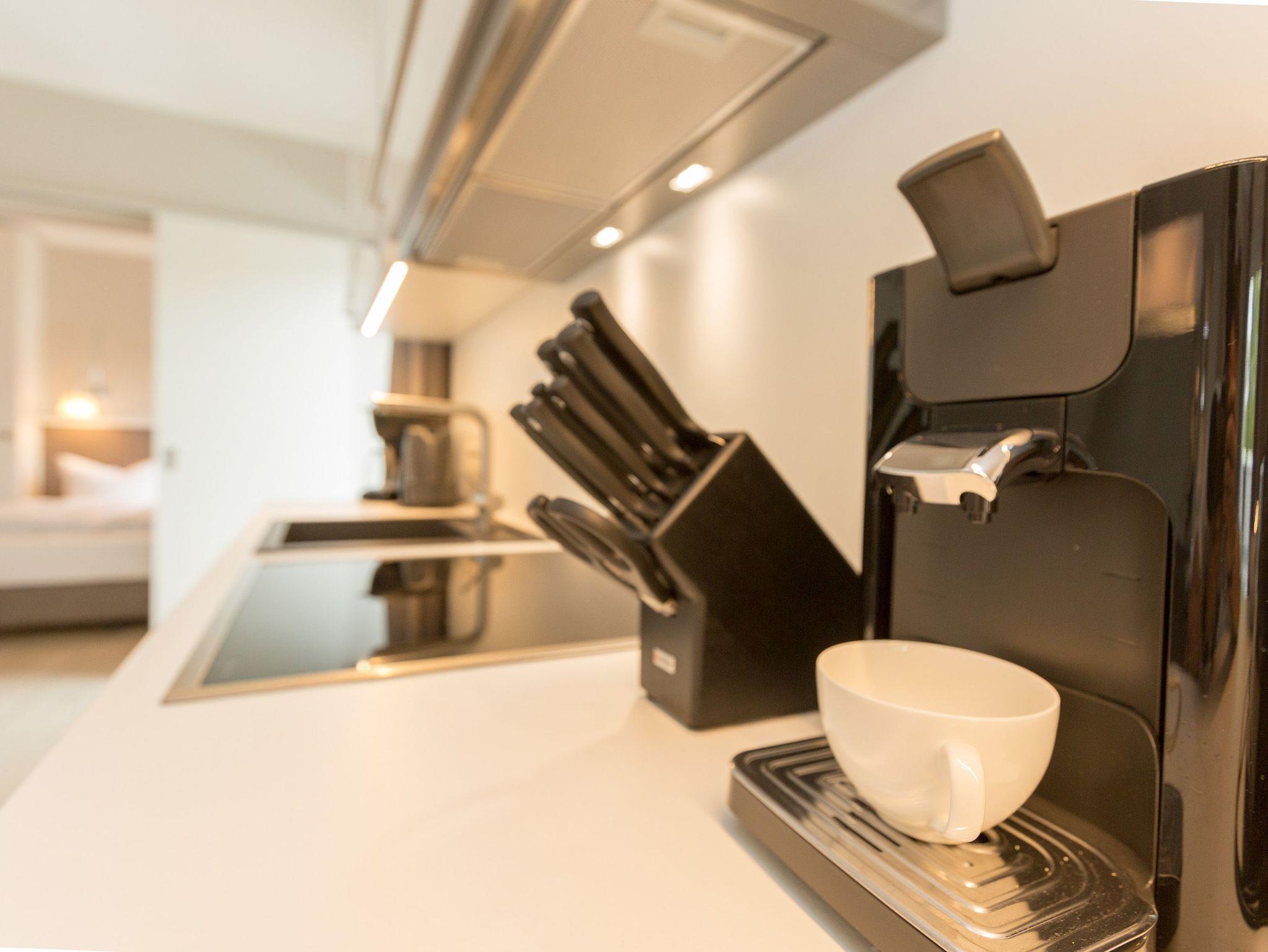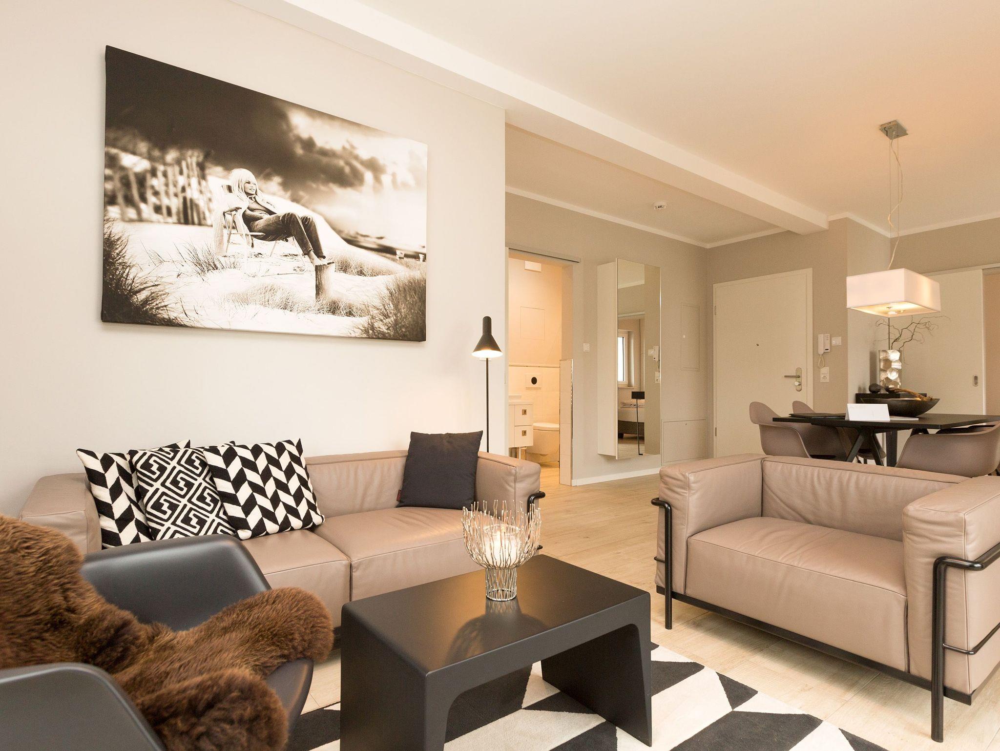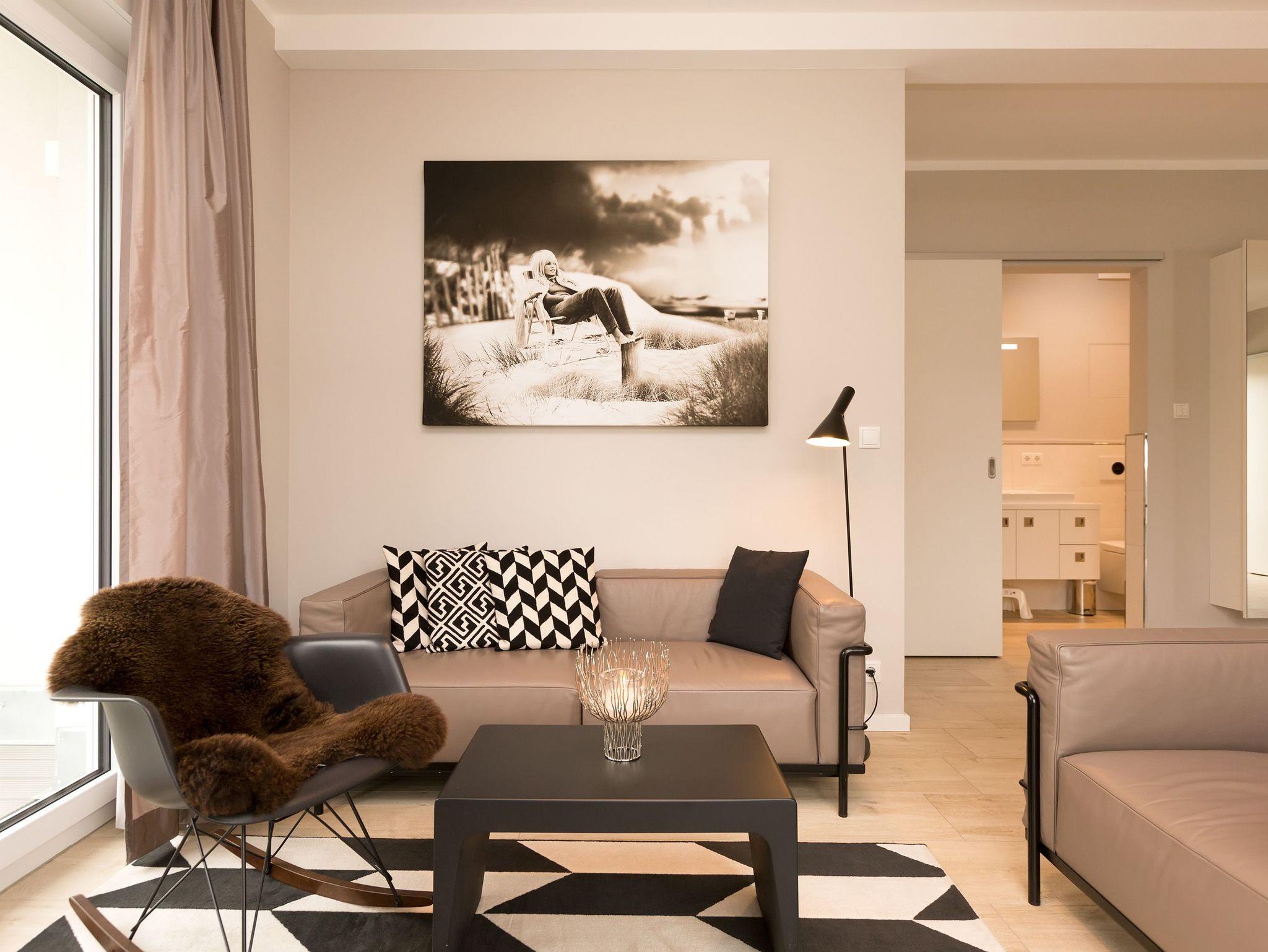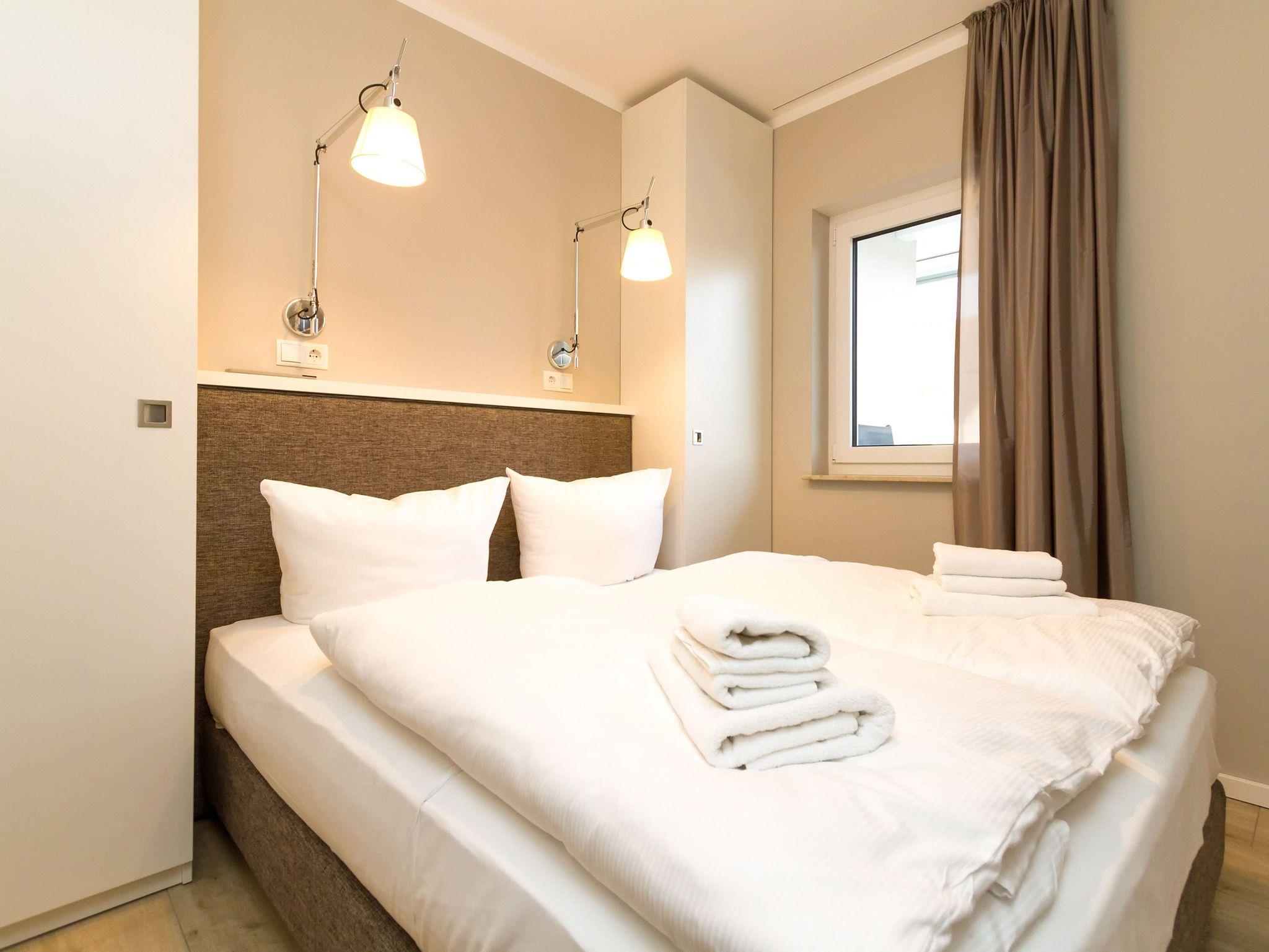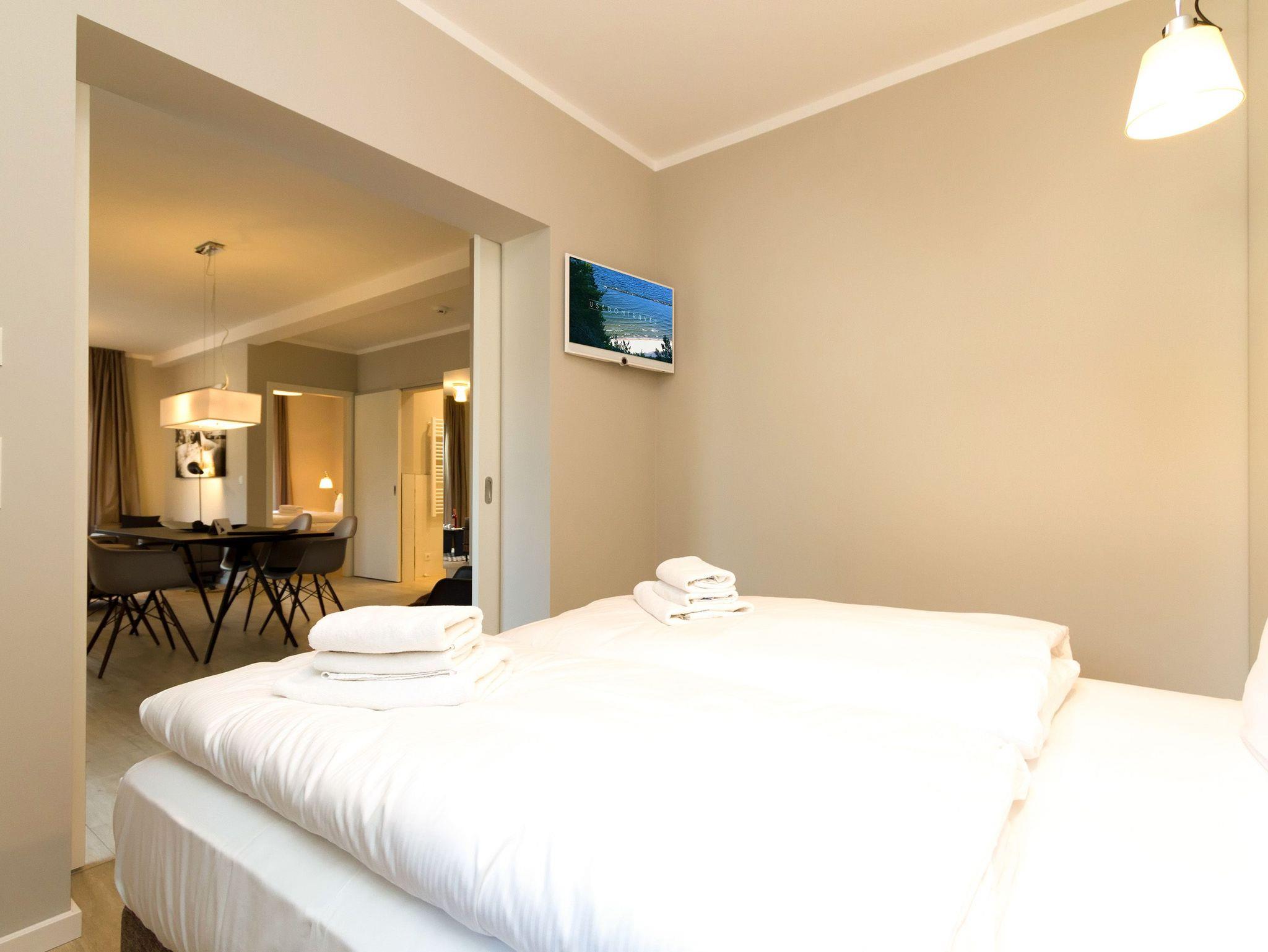 Stil. Extravaganz. Beste Lage mit Meerblick von der Dachterrasse! Edle sandfarbene Töne schaffen für Sie einen Ort der Ruhe. Nie aufdringlich, sondern leise und dezent, edel und geschmackvoll. Eine wunderschöne 3-Raum-Ferienwohnung (72 qm) für 4 Personen und ein Kleinkind (bis 3 Jahre im Babyreisebett). Der zentrale Essplatz mit komplett ausgestatteter Küchenzeile ist der Mittelpunkt des Appartements und ein idealer Platz für gemütliches Beisammensein. Hier lässt es sich entspannt frühstücken und dinieren. Ihr äußerst geschmackvoll designter Wohnbereich empfängt Sie lichtdurchflutet, mit Zugang zur großzügigen Dachterrasse. Die stylische Sitzgruppe von Cassina wird ergänzt durch den Flat-TV, Blue-Ray-Player und eine Hifi-Anlage mit ipod-Dock. Perfekte Rahmenbedingungen für einen kuscheligen Abend schafft der moderne Elektrokamin ganz einfach per Knopfdruck. Das erste Schlafzimmer ist mit einem exklusiven Treca interiors Paris Doppelboxspringbett (1,80m x 2,00m), Einbauschrank und Flat-TV ausgestattet. Das zweite, kleinere Schlafzimmer verfügt ebenfalls über ein Treca interiors Paris Doppelboxspringbett (1,60m x 2,00m), wertige Einbauten, über einen eigenen Flat-TV und ist mit einer Schiebetür vom Wohnbereich getrennt. Auf der Nord-Ost Dachterrasse darf ein Strandkorb ebenso wenig fehlen, wie das Gartenmobiliar. Durch die Kiefern auf der Düne zeigt sich das Meer - von hier nur einen Steinwurf entfernt, Meeresrauschen [&] Sonnenaufgang inklusive. Für Ihren Komfort sind die Betten bei der Anreise bezogen und Handtücher liegen bereit. Für kleine Gäste kann ein Kinderreisebett und ein Kinderhochstuhl (gegen Gebühr) bestellt werden. Ein Pkw-Stellplatz befindet sich in der Tiefgarage (max. Einfahrtshöhe 1,85 m).