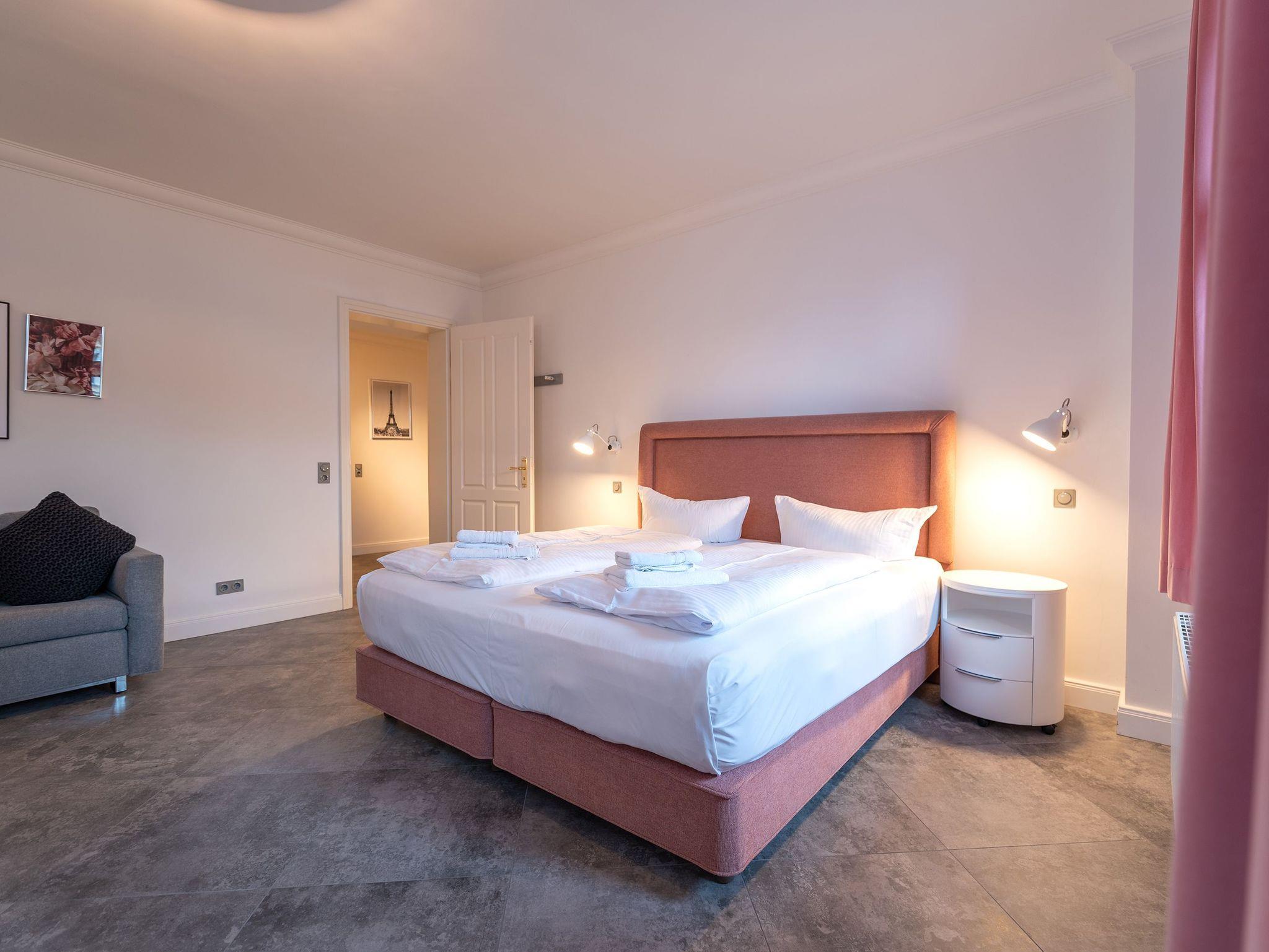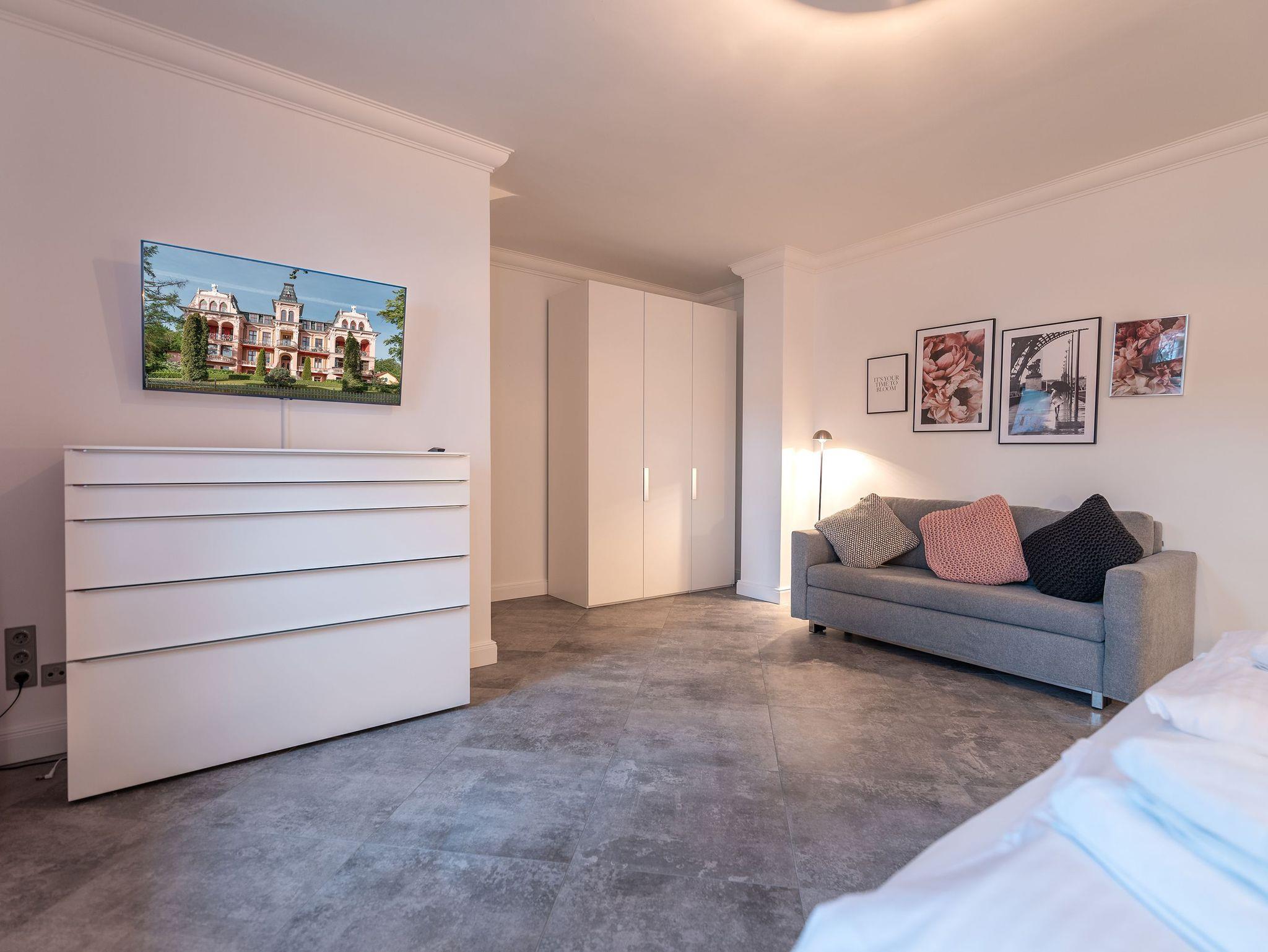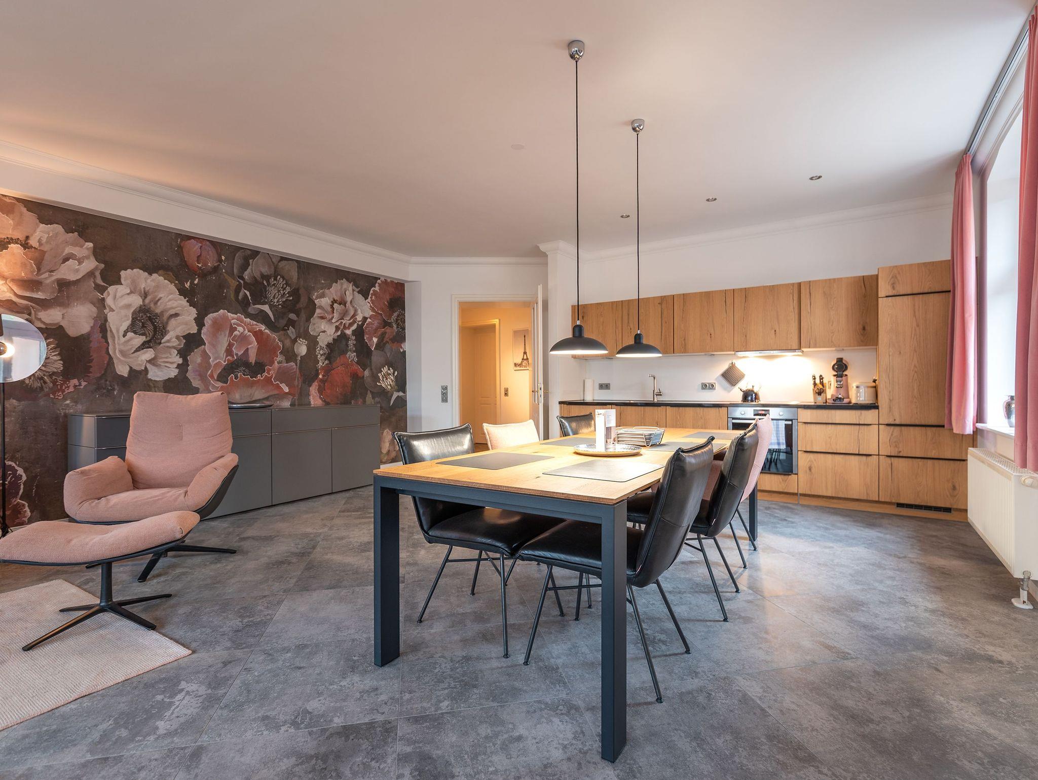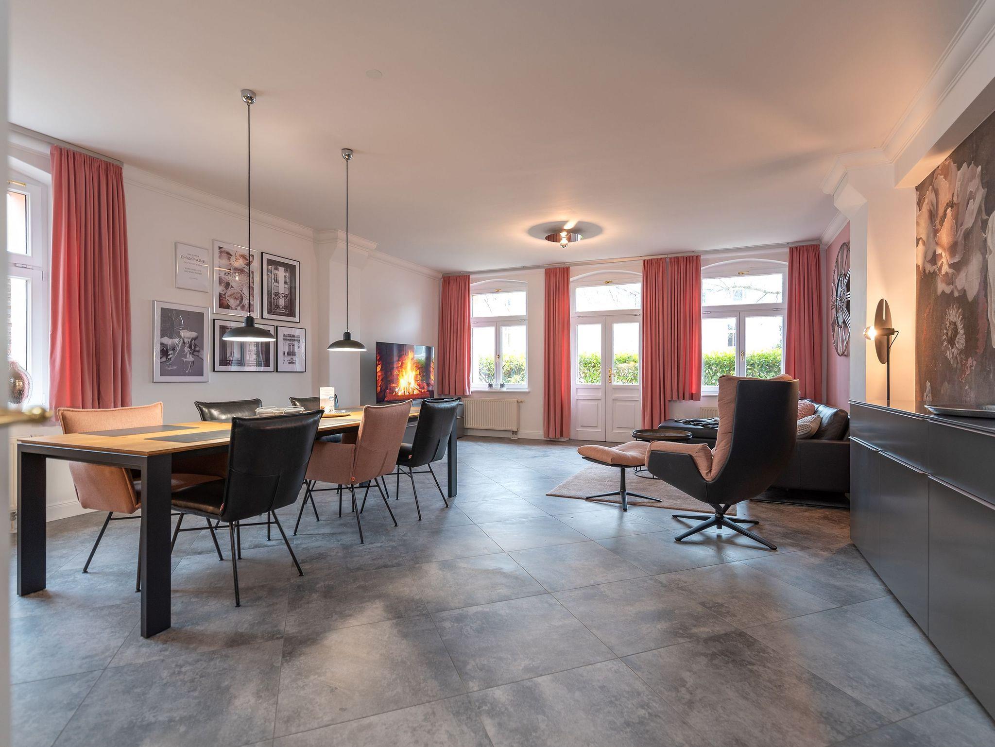 Das Appartement ?Sommerresidenz? im Erdgeschoss bietet mit 118 Quadratmetern großzügig gestalteten Wohnraum für einen unvergleichlichen Urlaub. Sie profitieren von zwei Schlafzimmern, ausgestattet mit handgefertigten englischen Boxspringbetten, einem modernen Wohnbereich mit komfortabler Couch, Fernsehsessel und einem großen Smart-TV inklusive PlayStation 4. Der großzügige Essbereich lädt mit Platz für bis zu sechs Personen zu gemeinsamen Mahlzeiten ein, während die offene Küche keine kulinarischen Wünsche offenlässt.