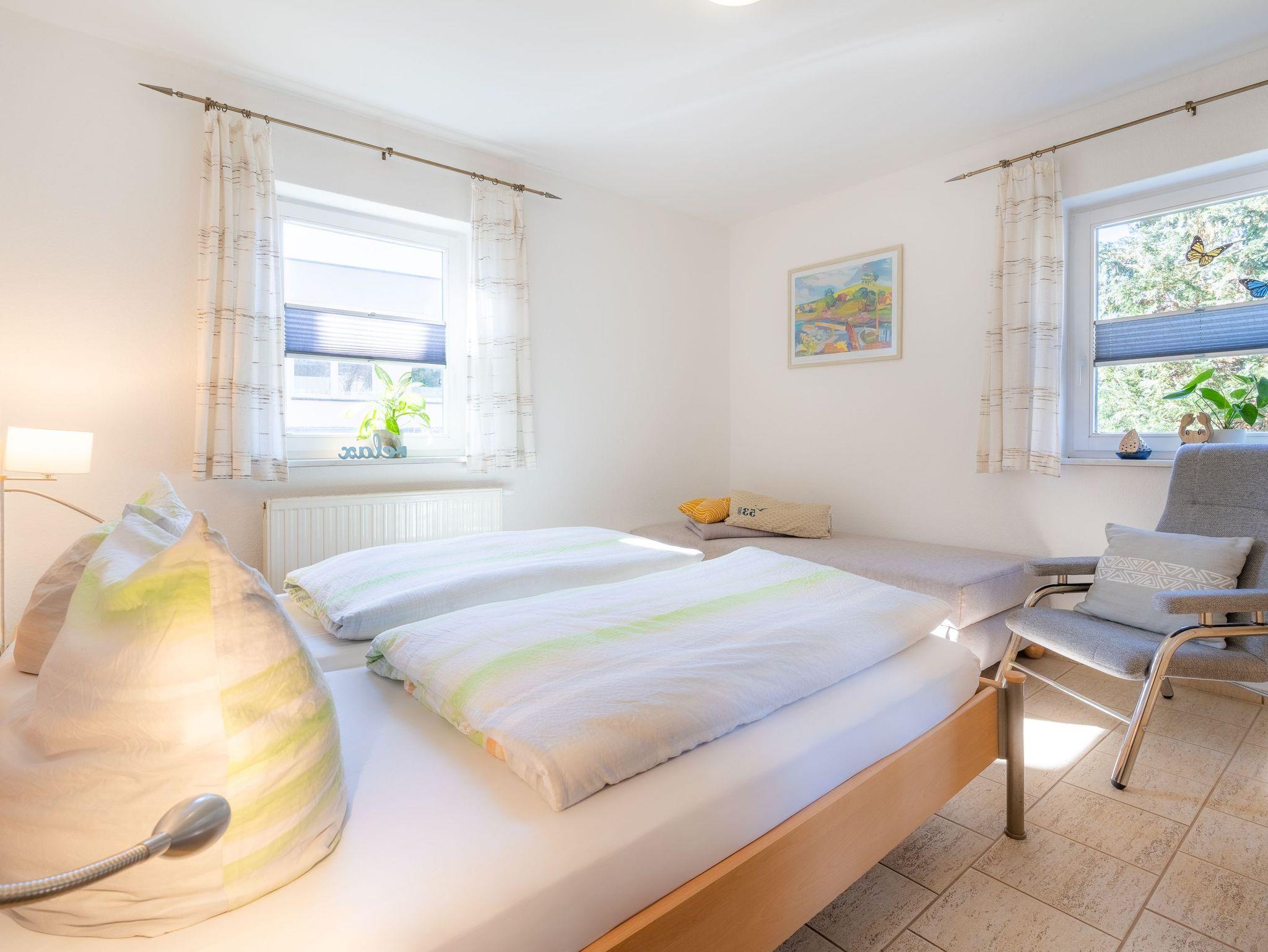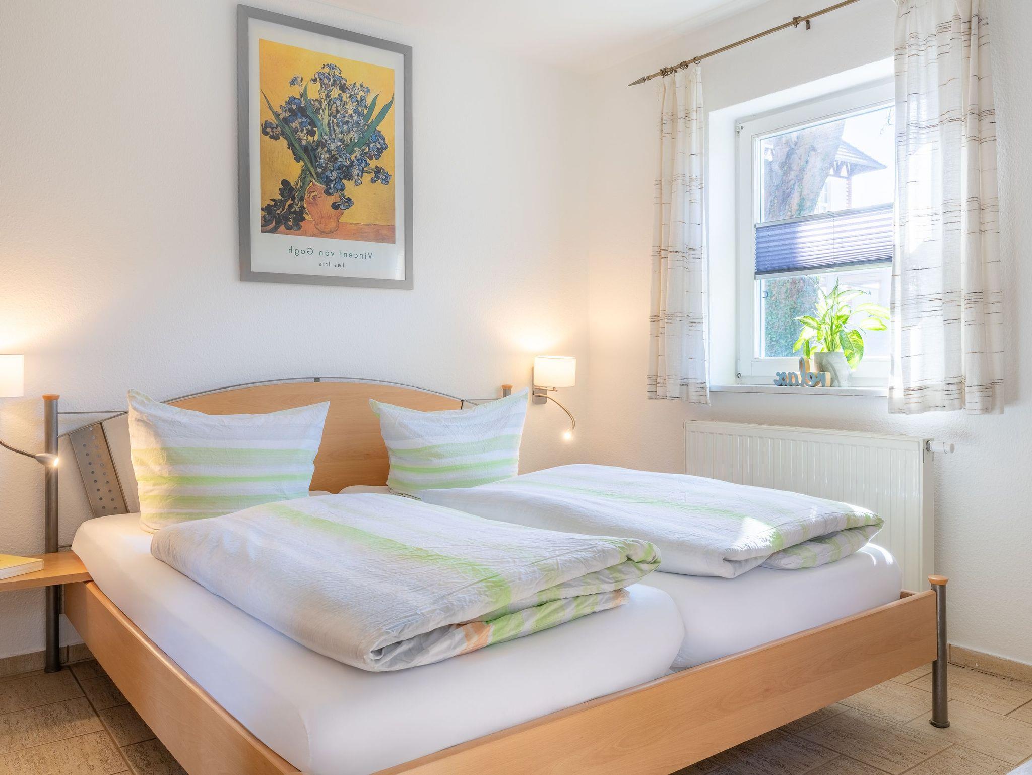 Vom Wohnzimmer erreichen Sie Ihre private Süd-West-Terrasse, die zum Sonnenbaden oder zur abendlichen Spielrunde mit Blick in den Garten einlädt. Grill-Liebhaber kommen ebenfalls auf Ihre Kosten, denn auf der Terrasse ist das Grillen im Grünen selbstverständlich gestattet. Das freundlich eingerichtete Schlafzimmer ist mit einem bequemen Doppelbett (180 x 200cm / zwei getrennte Matratzen) und Plissees an den Fenstern zum Abdunkeln ausgestattet.
