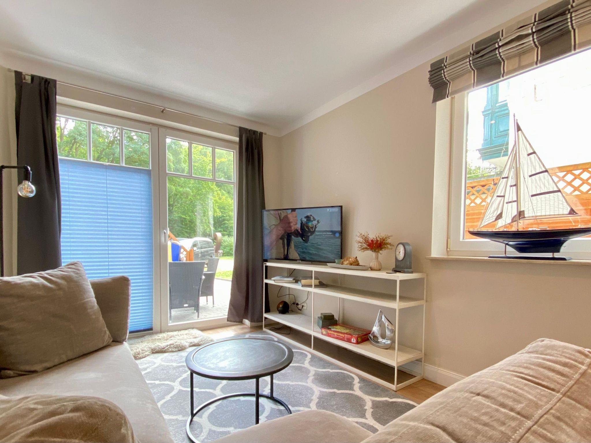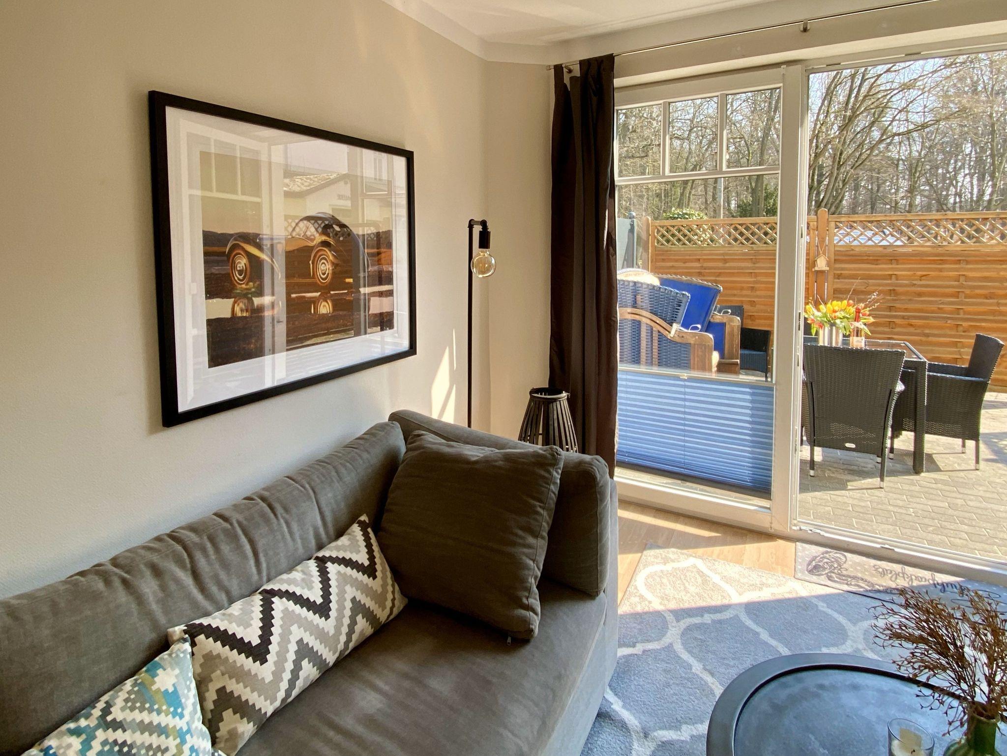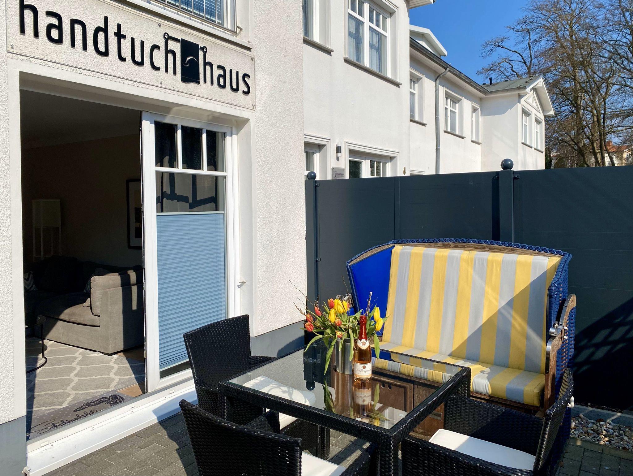 Da das Handtuchhaus über zwei Ebenen verfügt, bietet es ausreichend Platz für vier Personen (plus Babybett ). Der Wohnbereich liegt im Erdgeschoss: Hier erwartet die Gäste ein modernes Ecksofa, ein Flat-TV und eine gemütliche Sitzecke mit zwei Sesseln. Von hier aus gelangen Sie bequem auf die Terrasse mit den Strandkorbsitzmöbeln. Genießen Sie hier das Leben im Freien z.B. Ihr Frühstück. Im Erdgeschoss befindet sich außerdem der Küchenbereich, der komplett ausgestattet ist (Filter-Kaffeemaschine, Nespresso, Eierkocher, Toaster, Wasserkocher, Minibackofen, Mikrowelle). Hier schließt sich ein schöner Esstisch mit Loungesofa an. Das Duschbad und eine Sauna (Wärmekabine) befinden sich ebenfalls auf der unteren Wohnebene. Eine breite Treppe führt in den oberen Wohnbreich: Hier gibt es zwei moderne Schlafzimmer mit jeweils einem Boxspringbett und Flat-TV. Weiterhin erwartet Sie hier oben ein größeres Duschbad.