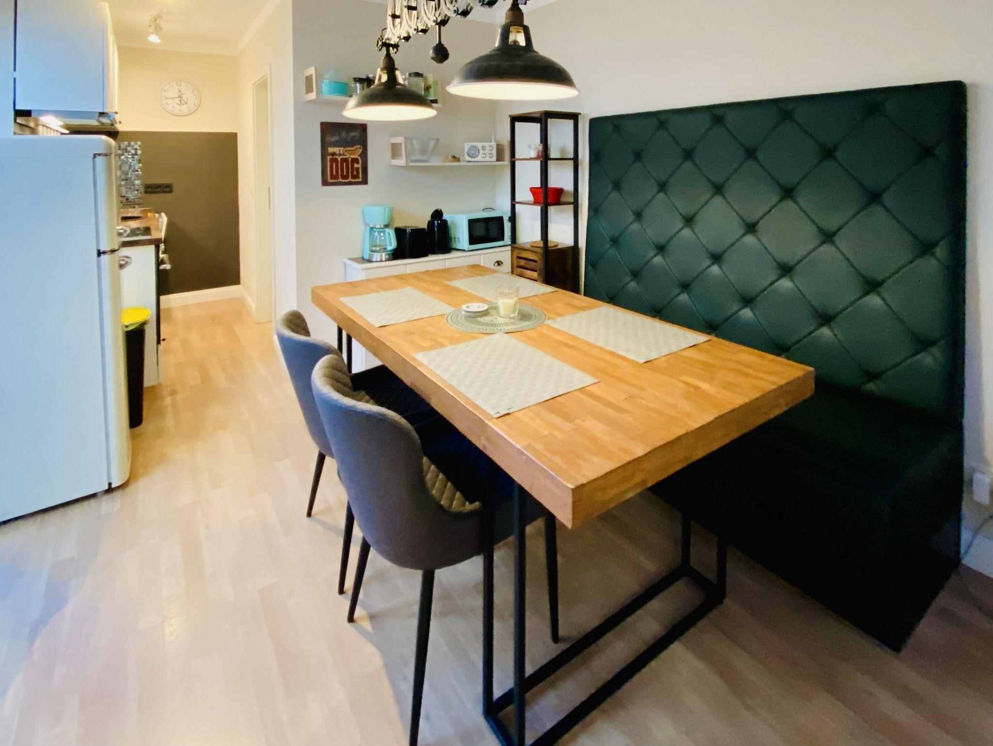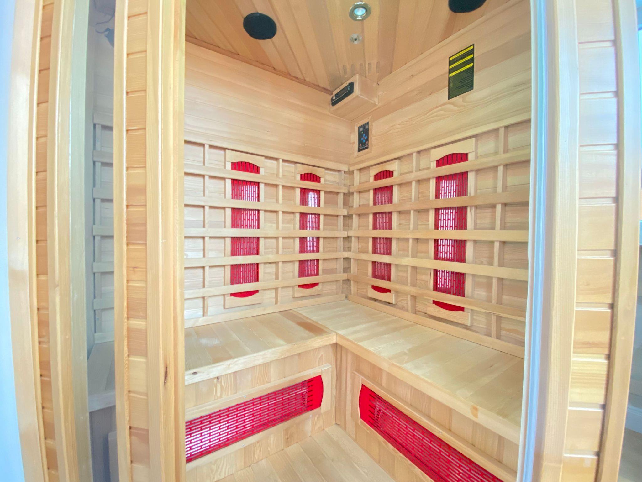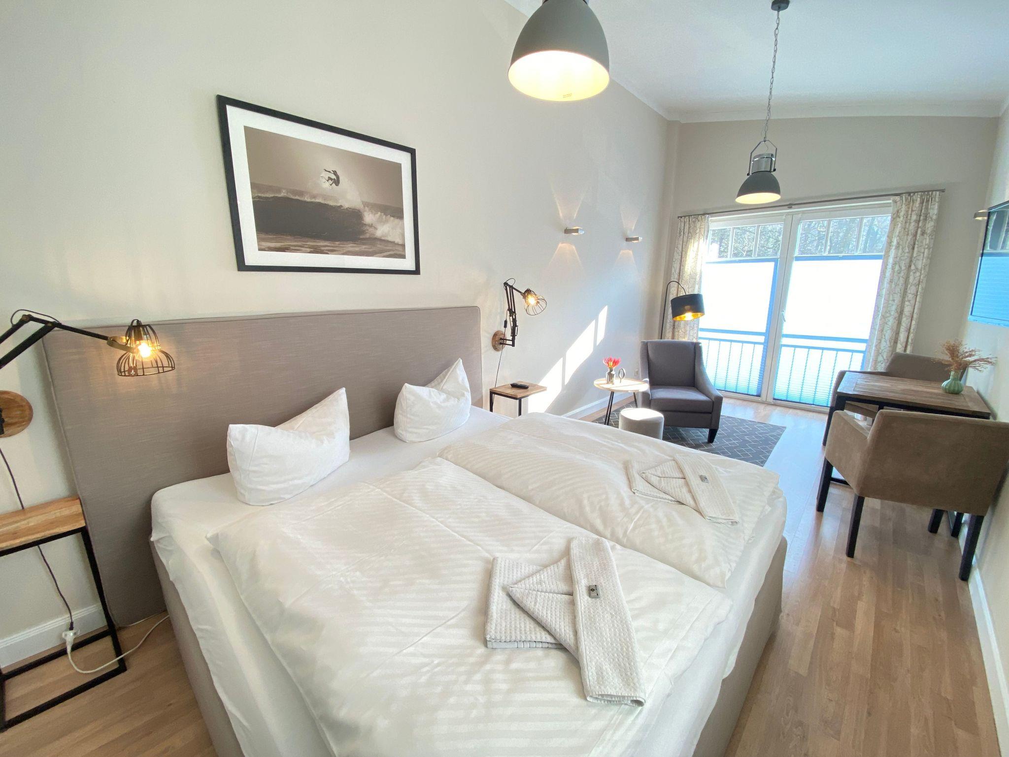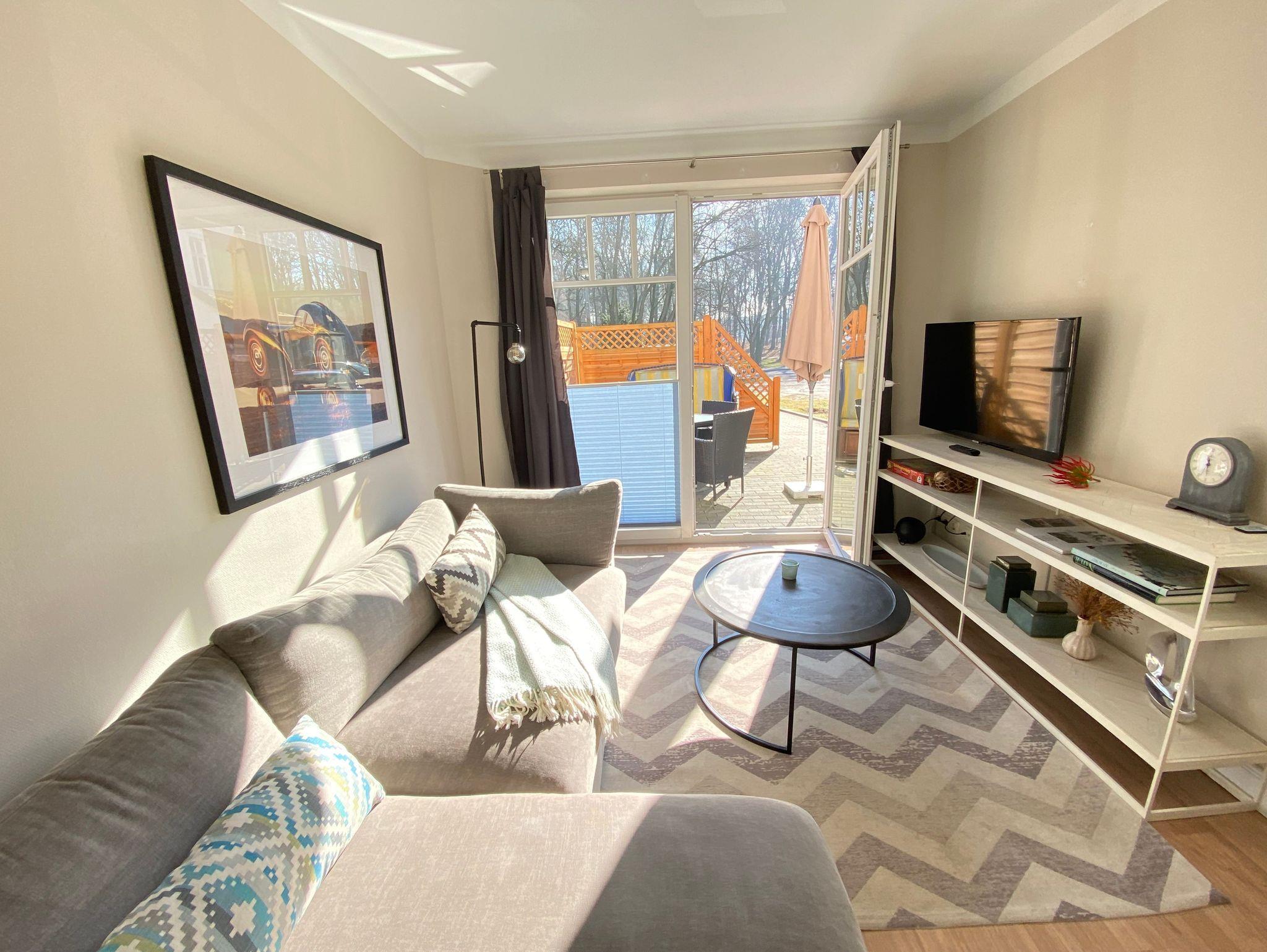 Da das Handtuchhaus über zwei Ebenen verfügt, bietet es ausreichend Platz für vier Personen (plus Babybett ). Der Wohnbereich liegt im Erdgeschoss: Hier erwartet die Gäste ein modernes Ecksofa, ein Flat-TV und eine gemütliche Sitzecke mit zwei Sesseln. Von hier aus gelangen Sie bequem auf die Terrasse mit den Strandkorbsitzmöbeln. Genießen Sie hier das Leben im Freien z.B. Ihr Frühstück. Im Erdgeschoss befindet sich außerdem der Küchenbereich, der komplett ausgestattet ist (Filter-Kaffeemaschine, Nespresso, Eierkocher, Toaster, Wasserkocher, Minibackofen, Mikrowelle). Hier schließt sich ein schöner Esstisch mit Loungesofa an. Das Duschbad und eine Sauna (Wärmekabine) befinden sich ebenfalls auf der unteren Wohnebene. Eine breite Treppe führt in den oberen Wohnbreich: Hier gibt es zwei moderne Schlafzimmer mit jeweils einem Boxspringbett und Flat-TV. Weiterhin erwartet Sie hier oben ein größeres Duschbad.