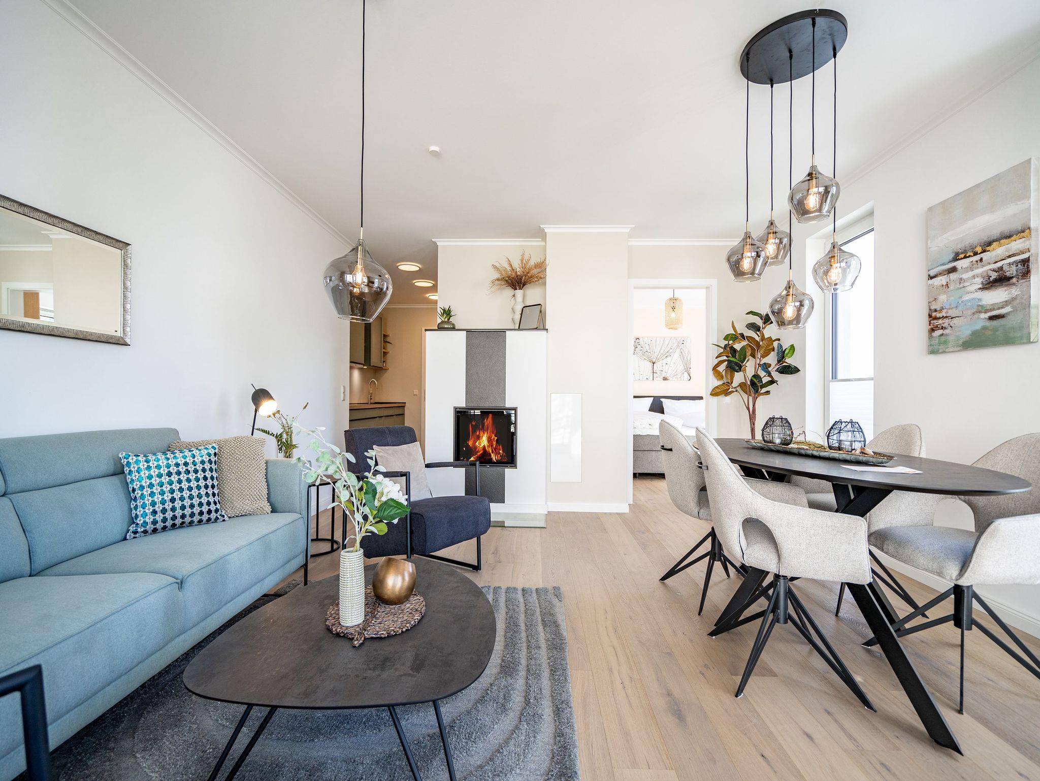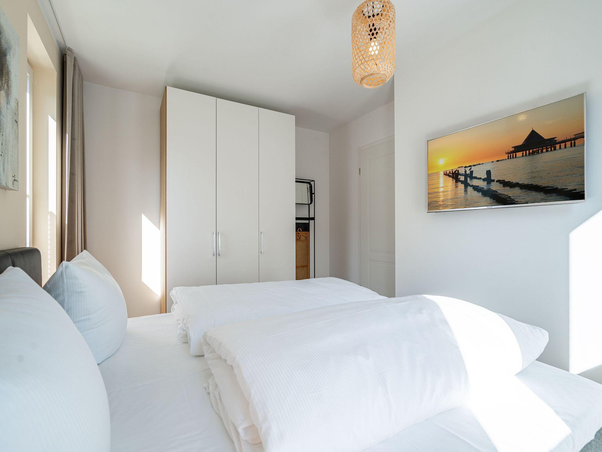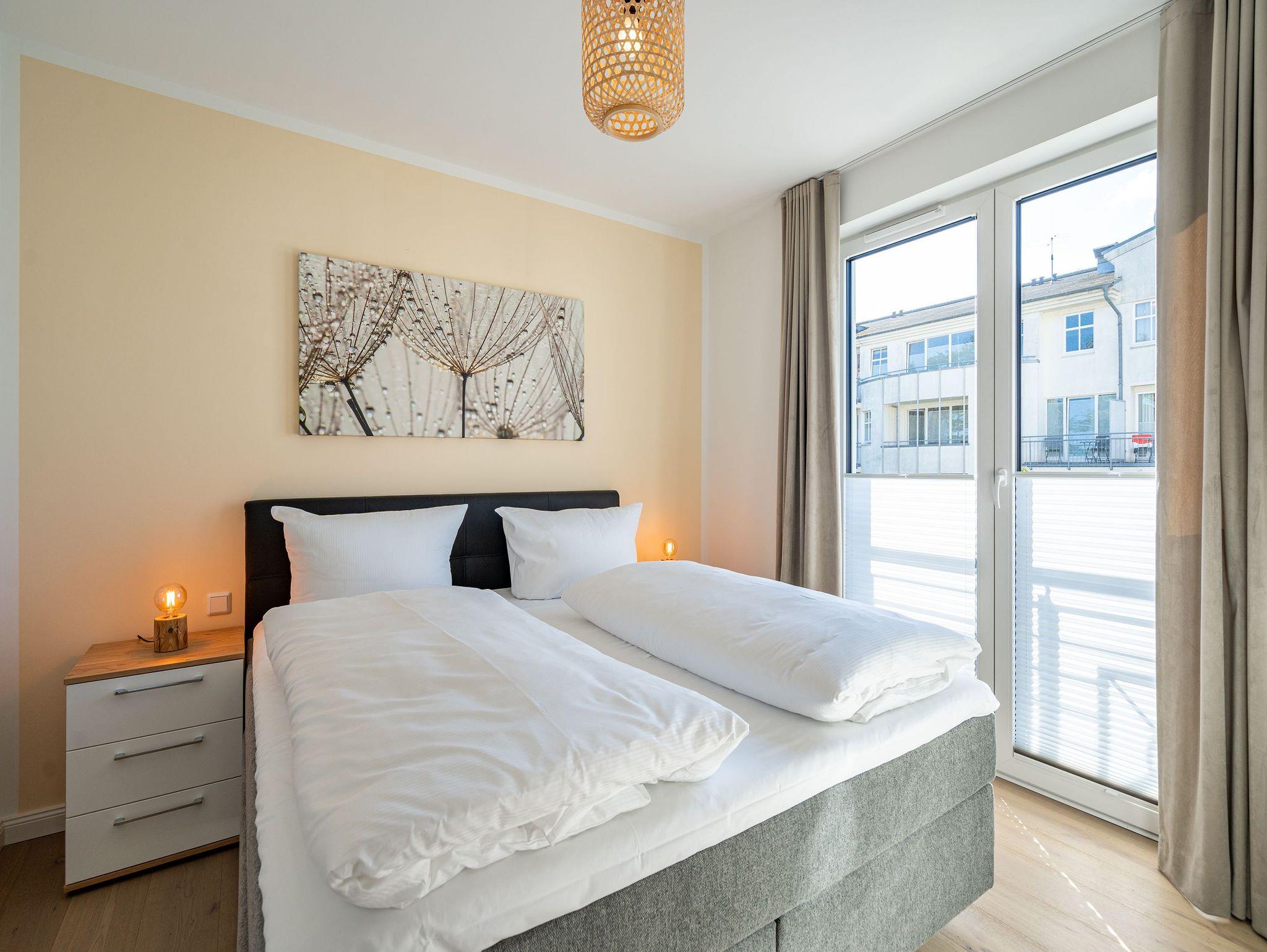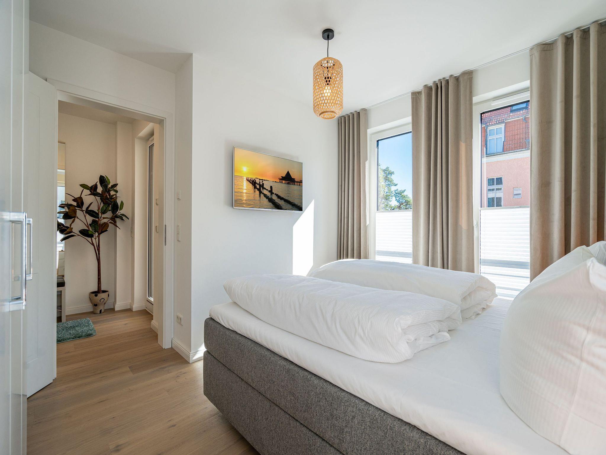 Die perfekte Auszeit für die ganze Familie oder befreundete Paare bietet Ihnen das Appartement 06 im Quartier am Strand. Die drei Räume verteilen sich großzügig auf insgesamt 84 Quadratmeter und bieten Platz für bis zu 4 Personen. Ideal ist die Aufteilung in diesem Urlaubsquartier: Während ein Schlafbereich etwas abseits vom Wohnzimmer liegt, grenzt ein zweiter direkt an den offenen Wohn-Essbereich an. Bereiten Sie morgens in Ruhe das Familienfrühstück vor, während auf der anderen Seite Ihres Appartements ausgeschlafen wird. In der modernen Küche finden Sie neben Kleinküchengeräten einen Induktionsherd mit Backofen sowie einen Kühlschrank mit Gefrierfach und eine Spülmaschine. Nach einem ausgiebigen Tag am Strand stehen Ihnen im Wohnbereich ein Flat-TV sowie eine Sofalandschaft und zwei Sessel zum Relaxen zur Verfügung. Kostenfreies W-Lan zählt selbstverständlich ebenfalls zu den Vorzügen dieses Appartements. Ein Holzkamin komplettiert die hochwertige Ausstattung, die farblich in allen Räumen aufeinander abgestimmt ist. Verlagern Sie Ihren Essplatz von drinnen nach draußen und genießen Sie Ihre gemeinsame Zeit auf dem 8 Quadratmeter großen Balkon, auf dem Ihnen ein Tisch und vier Stühle zur Verfügung stehen. Ein zweiter Balkon befindet sich auf der Nordost-Seite des Hauses. Hier finden zwei Personen Platz für eine gemütlich Zeit zu Zweit. Auf erholsamen Schlaf müssen Sie auch im Urlaub nicht verzichten. Bequeme Boxspringbetten (1,80m x 2,00m) laden zum Füße hochlegen ein. Für Ihre Urlaubsgarderobe wurde an ausreichend Schrankraum gedacht. Selbstverständlich verfügen beide Schlafbereiche über einen Flat-TV. Den Komfort von zwei Badezimmern finden Sie ebenfalls im Appartement 06. Während ein Badezimmer direkt über ein Schlafzimmer zu erreichen ist, lädt ein weiteres Bad zum gemeinsamen Gang in die Finnische Sauna ein. Waschtische, WCs und Duschen runden die Nassbereiche ab. An einen Waschtrockner im Appartement wurde ebenso gedacht. Für Ihr Auto ist ein Stellplatz in der Tiefgarage verfügbar (mit kostenpflichtiger E-Ladestation). Gern können Sie Ihre Fahrräder mitbringen, die Sie im wohnungseigenen Abstellraum in der Tiefgarage verstauen können. Für Ihren Komfort sind die Betten bei Ihrer Anreise bereits bezogen und Handtücher liegen für Sie bereit.