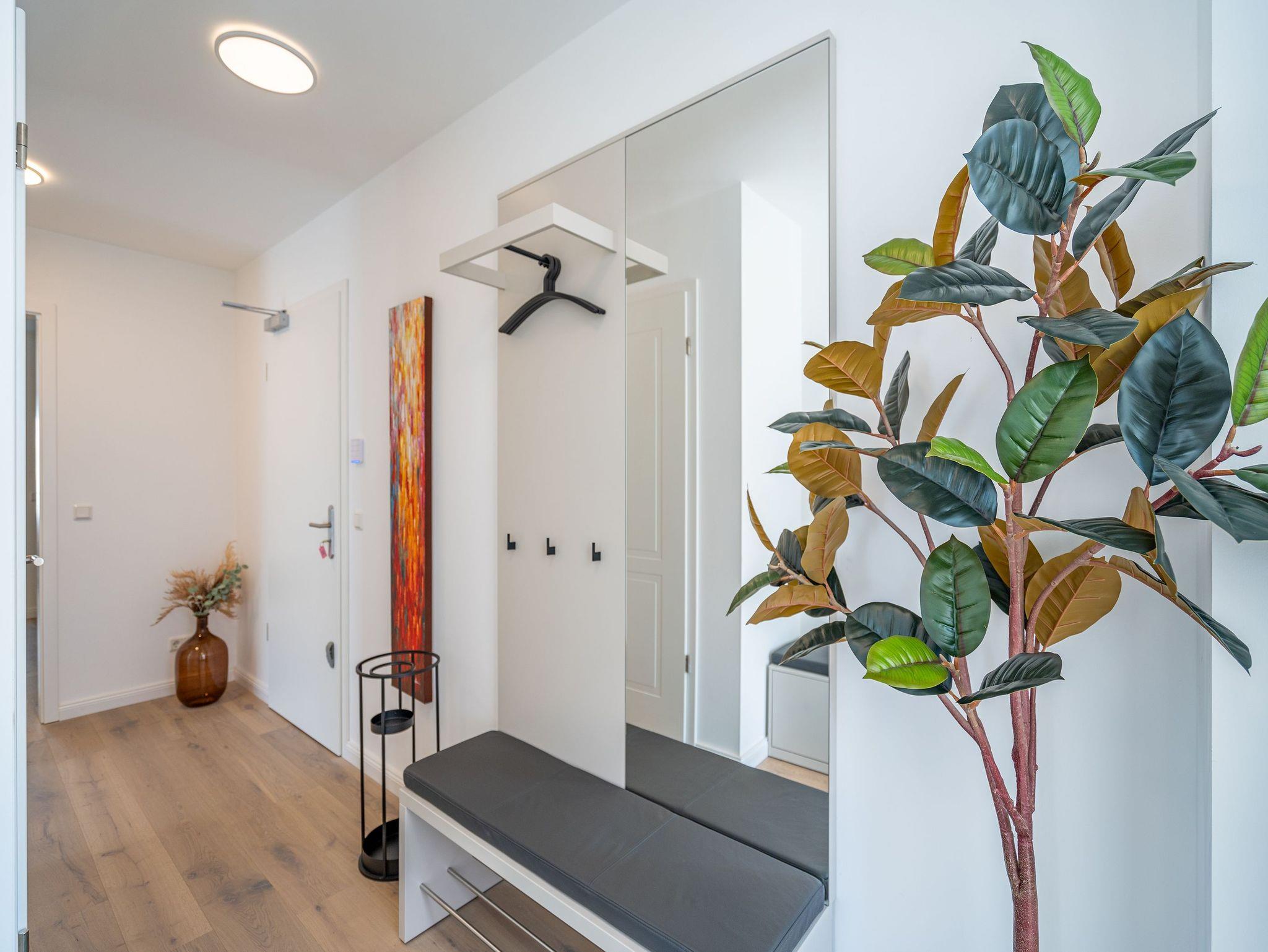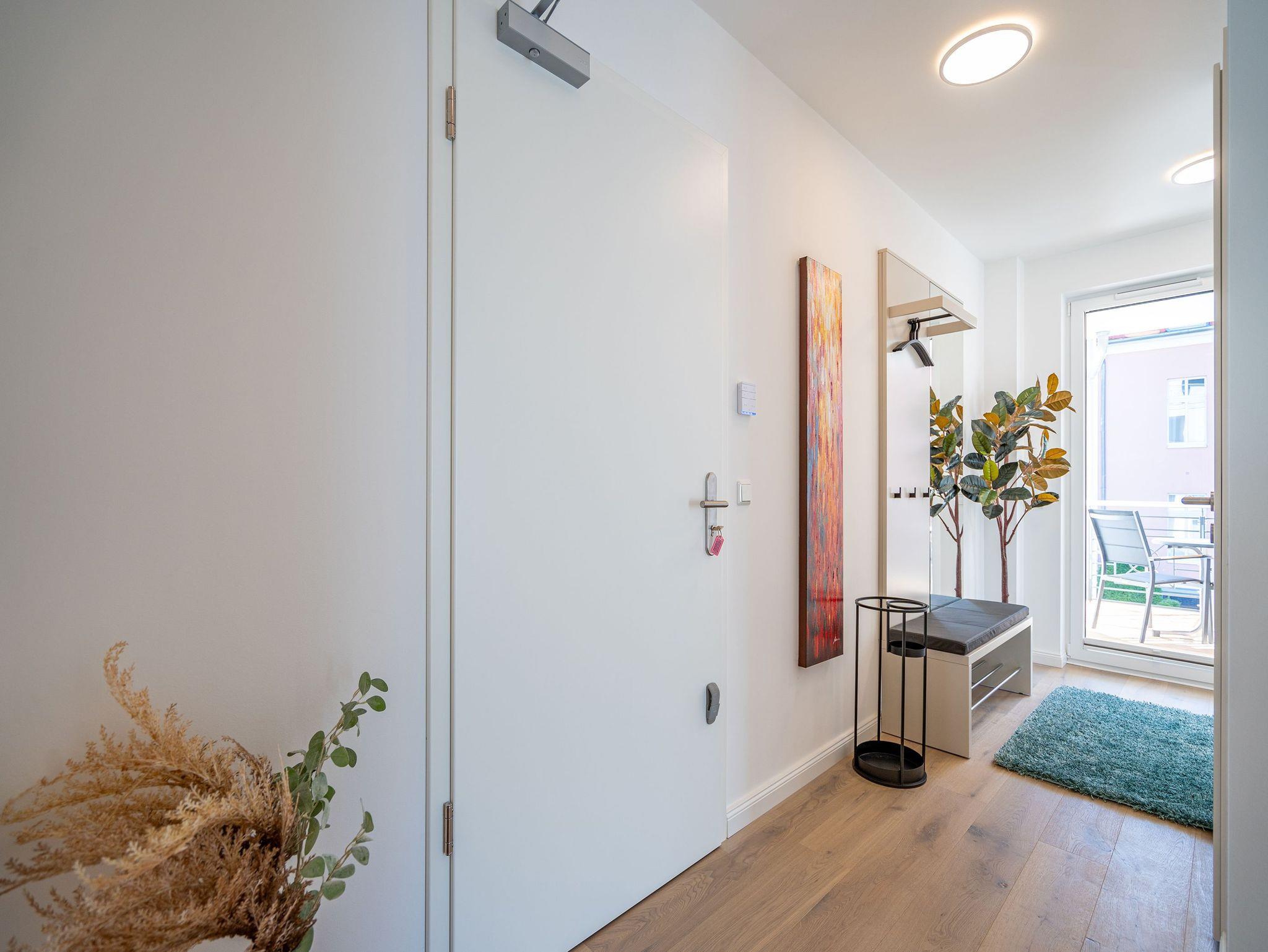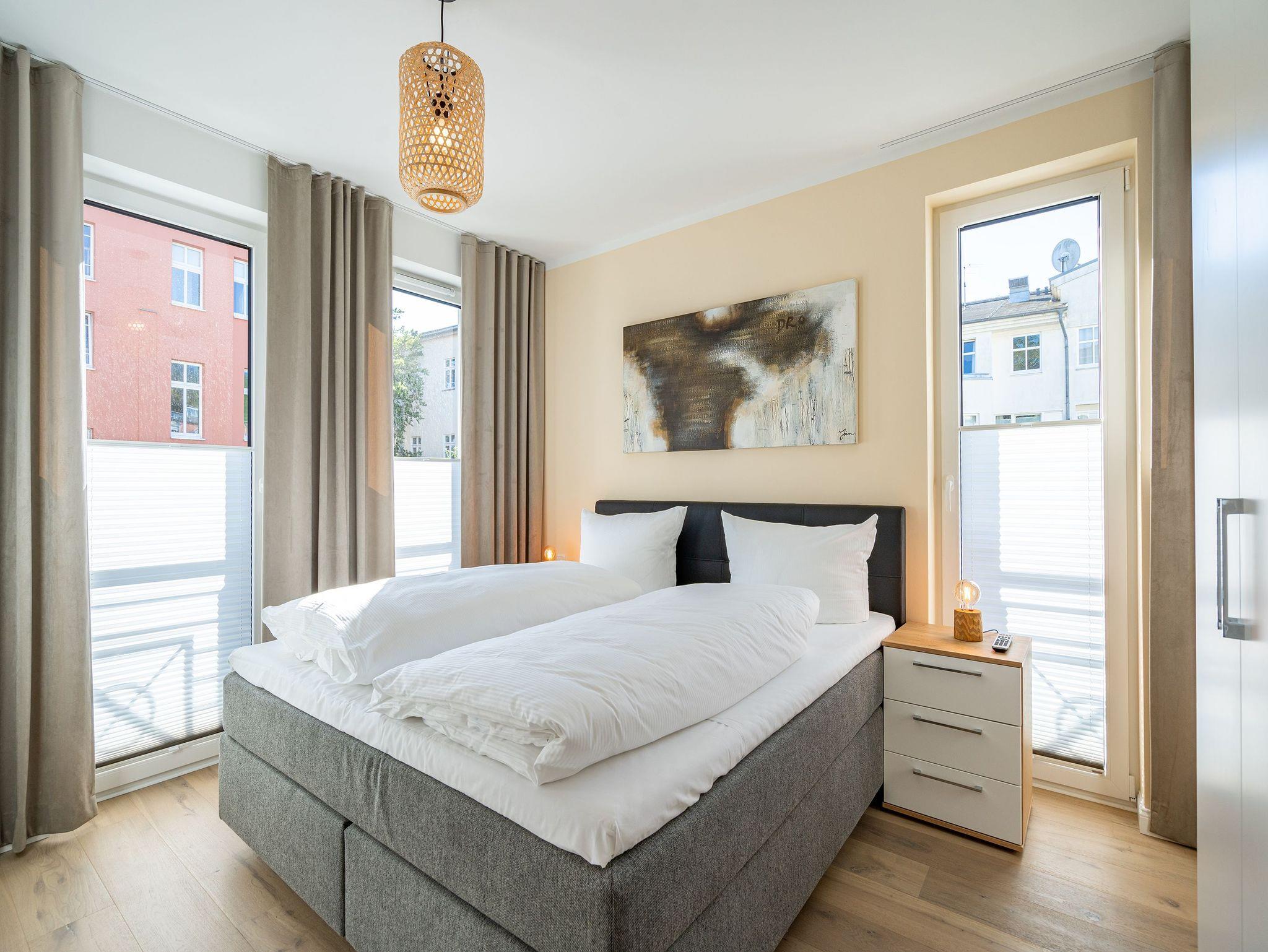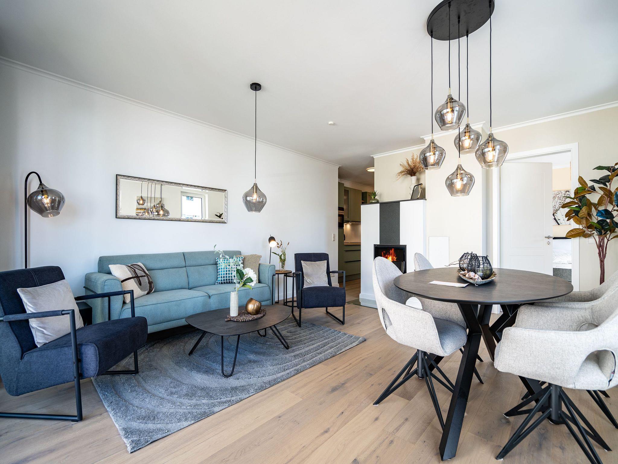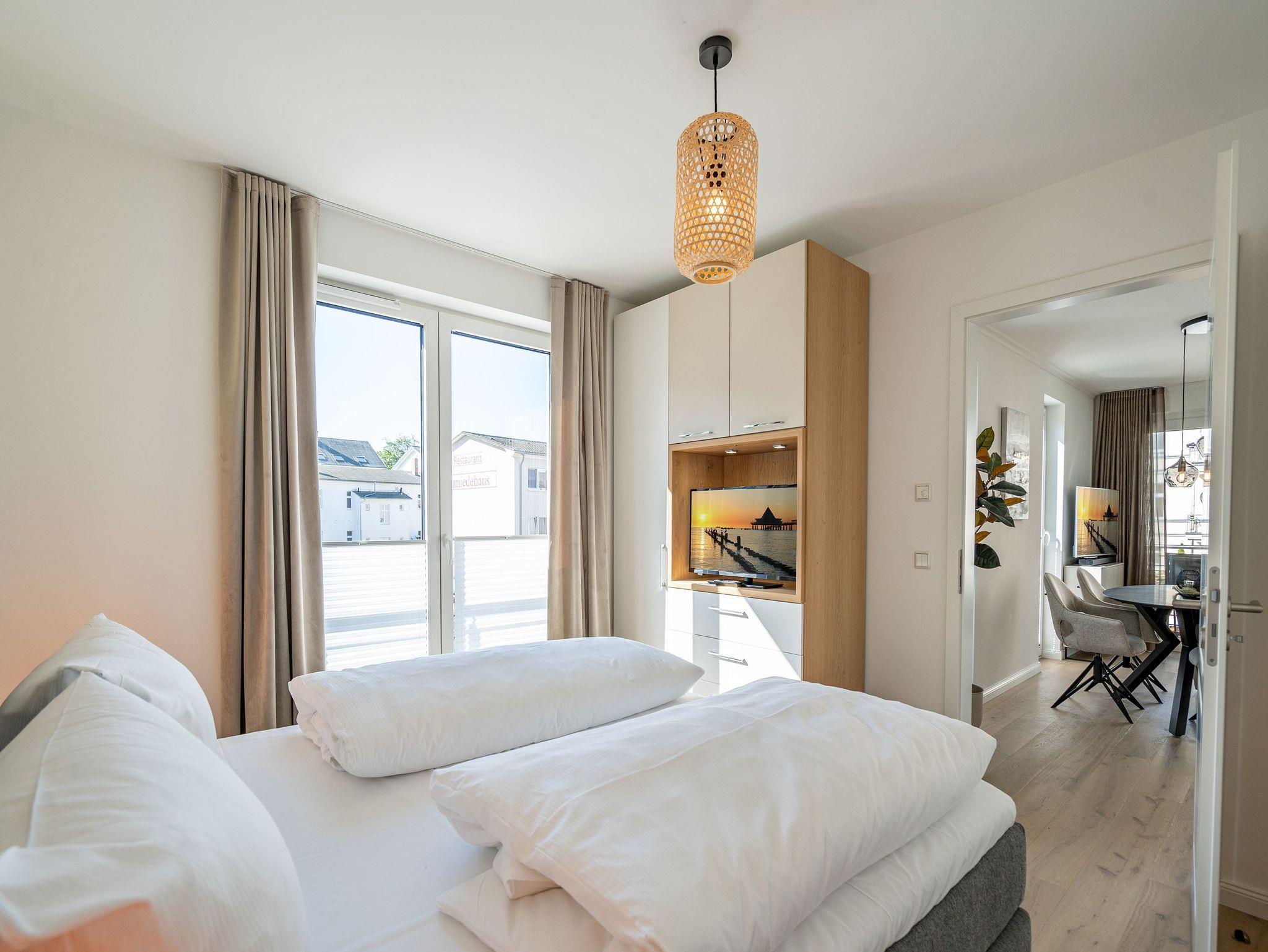 Die perfekte Auszeit für die ganze Familie oder befreundete Paare bietet Ihnen das Appartement 06 im Quartier am Strand. Die drei Räume verteilen sich großzügig auf insgesamt 84 Quadratmeter und bieten Platz für bis zu 4 Personen. Ideal ist die Aufteilung in diesem Urlaubsquartier: Während ein Schlafbereich etwas abseits vom Wohnzimmer liegt, grenzt ein zweiter direkt an den offenen Wohn-Essbereich an. Bereiten Sie morgens in Ruhe das Familienfrühstück vor, während auf der anderen Seite Ihres Appartements ausgeschlafen wird. In der modernen Küche finden Sie neben Kleinküchengeräten einen Induktionsherd mit Backofen sowie einen Kühlschrank mit Gefrierfach und eine Spülmaschine. Nach einem ausgiebigen Tag am Strand stehen Ihnen im Wohnbereich ein Flat-TV sowie eine Sofalandschaft und zwei Sessel zum Relaxen zur Verfügung. Kostenfreies W-Lan zählt selbstverständlich ebenfalls zu den Vorzügen dieses Appartements. Ein Holzkamin komplettiert die hochwertige Ausstattung, die farblich in allen Räumen aufeinander abgestimmt ist. Verlagern Sie Ihren Essplatz von drinnen nach draußen und genießen Sie Ihre gemeinsame Zeit auf dem 8 Quadratmeter großen Balkon, auf dem Ihnen ein Tisch und vier Stühle zur Verfügung stehen. Ein zweiter Balkon befindet sich auf der Nordost-Seite des Hauses. Hier finden zwei Personen Platz für eine gemütlich Zeit zu Zweit. Auf erholsamen Schlaf müssen Sie auch im Urlaub nicht verzichten. Bequeme Boxspringbetten (1,80m x 2,00m) laden zum Füße hochlegen ein. Für Ihre Urlaubsgarderobe wurde an ausreichend Schrankraum gedacht. Selbstverständlich verfügen beide Schlafbereiche über einen Flat-TV. Den Komfort von zwei Badezimmern finden Sie ebenfalls im Appartement 06. Während ein Badezimmer direkt über ein Schlafzimmer zu erreichen ist, lädt ein weiteres Bad zum gemeinsamen Gang in die Finnische Sauna ein. Waschtische, WCs und Duschen runden die Nassbereiche ab. An einen Waschtrockner im Appartement wurde ebenso gedacht. Für Ihr Auto ist ein Stellplatz in der Tiefgarage verfügbar (mit kostenpflichtiger E-Ladestation). Gern können Sie Ihre Fahrräder mitbringen, die Sie im wohnungseigenen Abstellraum in der Tiefgarage verstauen können. Für Ihren Komfort sind die Betten bei Ihrer Anreise bereits bezogen und Handtücher liegen für Sie bereit.