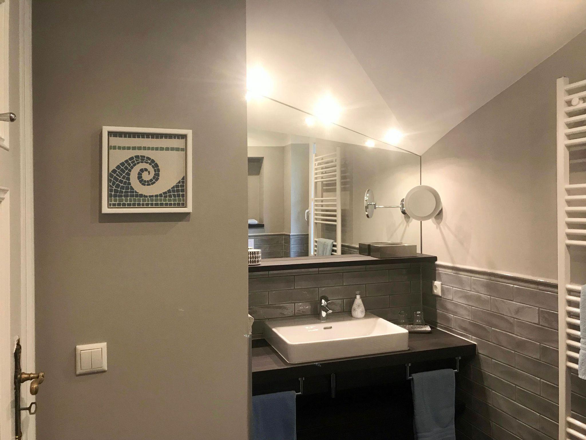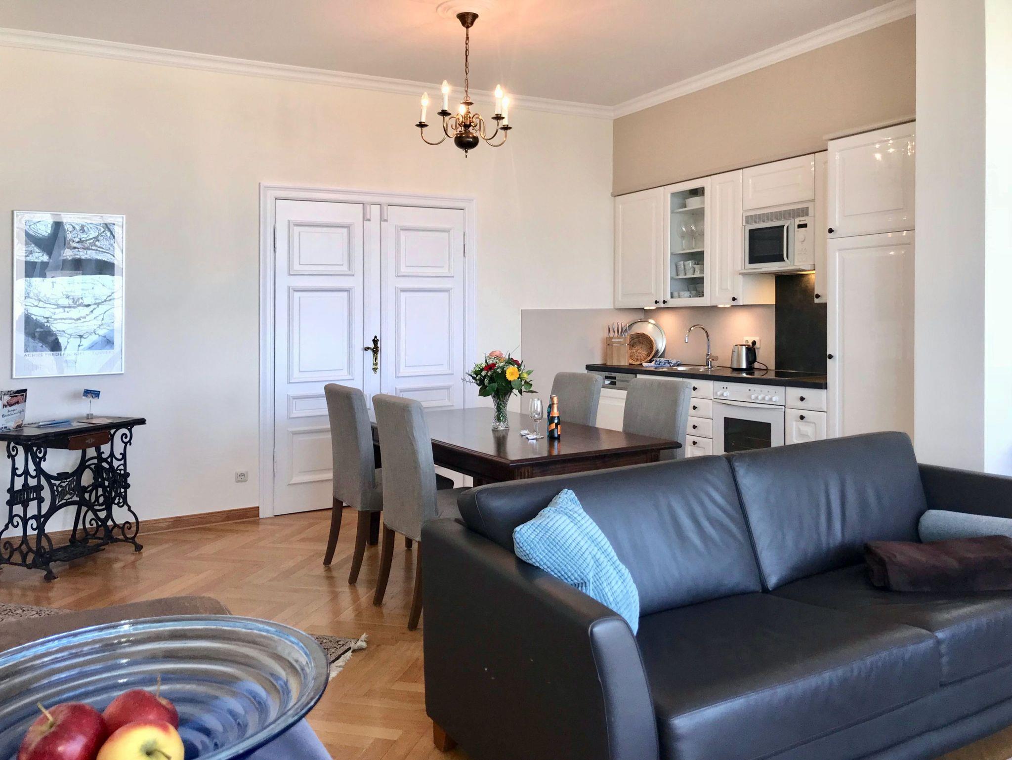 Komfortable Ferienwohnung mit Meerblick aus dem Wohn- und Schlafzimmer. Von der großzügigen Terrasse mit Liegestühlen und Essplatz genießen Sie einen herrlichen Blick auf die Ostsee. All unsere Wohnungen sind geschmackvoll und individuell eingerichtet. Das Schlafzimmer ist mit einem manufakturgefertigten Edelstahlbett, Einbauschrank incl. Safe, Flachbild-TV und Verdunklung ausgestattet, die Terrassentür ist mit Insektenschutz versehen. Ausgesuchte Möbelstücke und Bilder des Braunschweiger Künstlers Achim Kiel, Echtholz-Parkett - teils mit hochwertigen Teppichen belegt ? prägen den Stil des Hauses. Als zusätzliche Schlafgelegenheit befindet sich im Wohnbereich eine komfortable ausklappbare Ledercouch. Zur Ausstattung gehört ein Smart-TV mit Soundbar - zur einfachen Verbindung mit Ihrem Smartphone, iPad oder anderen bluetoothfähigen Geräten - sowie ein DVD-Player. In den Wohn-/Essbereich integriert ist ein Tisch für vier Personen und eine komplett ausgestattete Küchenzeile (Kühlschrank mit Gefrierfach, Backofen, Cerankochfeld, Dunstabzug, Mikrowelle, Toaster, Wasserkocher, Filter-Kaffeemaschine u. Nespresso-Kapselmaschine, Rührgerät etc.). Das Badezimmer ist ein Tageslicht-Bad mit Dusche.