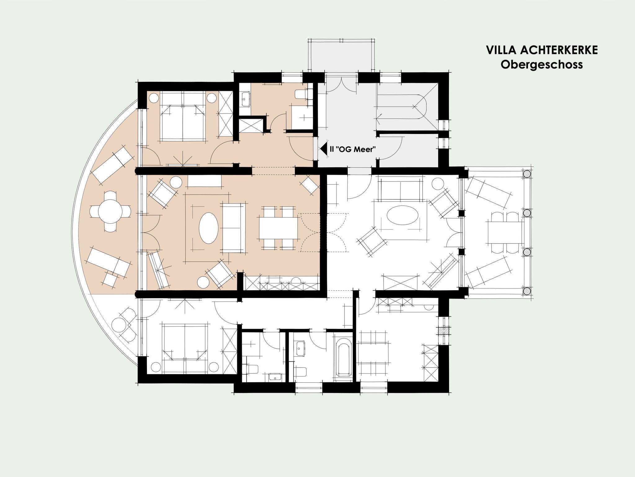 Die Villa umfasst vier Ferienwohnungen, wobei jeweils zwei zu einer großzügigen Einheit etagenweise verbunden werden können. Das Haus ist also flexibel für bis zu 12 Personen (Preise auf Anfrage) buchbar: als Ganzes - als Etage für max. 6 Personen - oder 4 Einheiten a max. 3 Personen !