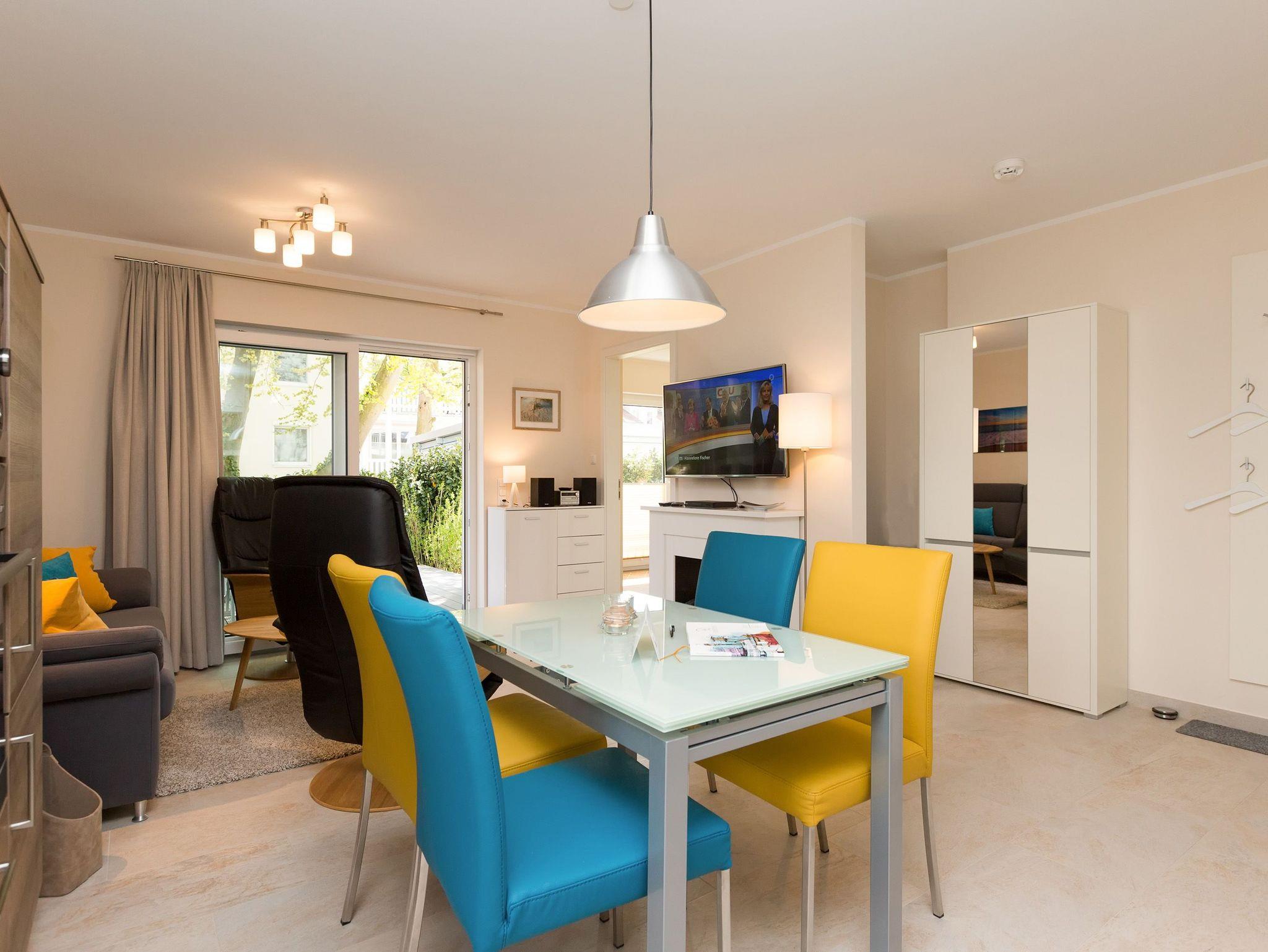 Modern wohnen - schöner Urlauben! Im neuen 3-Raum-Appartement 6 (67 qm) im Erdgeschoss der Dünenresidenz werden Sie erholsame Urlaubstage verleben. Bis zu 4 Personen und ein Kleinkind (als Aufbettung im Babyreisebett) finden hier Platz. Die geschmackvolle Einrichtung, abgestimmte Farben und Materialen und ausgesuchte Dekorationen schaffen ein wunderschönes Urlaubsdomizil. Schon beim Eintreten öffnet sich der helle Wohnbereich mit bequemer Sitzgruppe, Elektro-Kamin mit Fernbedienung und Flat-TV, die komplett ausgestattete Küchenzeile und der Essbereich schließen sich an. Zwei Schlafzimmer mit komfortablen Doppelboxspringbetten (1,80 m x 2,00 m und 1,60 m x 2,00 m) und eigenem Flat-TV sowie zwei Bäder mit Dusche und WC und einer Waschmaschine ergänzen die Wohnung. Selbstverständlich darf die wohnungseigene Sauna nicht fehlen! Ein weiteres Highlight des Appartements ist die großzügige Nord-Ost-Terrasse mit Gartenmöbeln (Zugang vom Wohnbereich und von einem Schlafzimmer). Bevor der Strand lockt, genießt man bei Meeresrauschen hier sein Frühstück in der Morgensonne. Für Ihren Komfort sind bei der Anreise die Betten bezogen und die Erstausstattung Handtücher liegt bereit. Das kostenfreie WLAN steht Ihnen zur Verfügung. Ein Pkw-Stellplatz befindet sich in der Tiefgarage (max. Einfahrtshöhe 1,85 m) und für Fahrräder gibt es einen separaten Abstellraum im Keller.