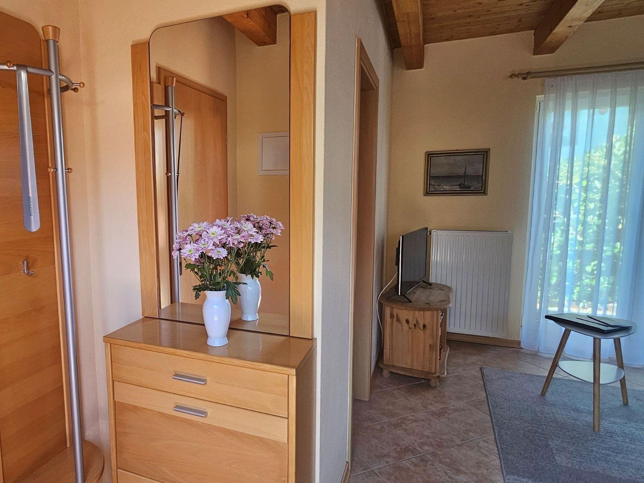 Die gepflegte 2 Raum-Nichtraucherferienwohnung besteht aus einem Wohnraum mit integrierter Pantryküche und einem separaten Esstisch. Außerdem sind TV und Radio vorhanden. Vom Wohnbereich aus erreichen Sie die Terrasse in Südwestlage mit Strandkorb und Sitzmöbeln. Im Schlafzimmer befinden sich ein Doppelbett und ein Kleiderschrank. Das Bad ist mit DU/WC ausgestattet. Der Fußboden ist gefliest. Bettwäsche ist im Preis inklusive, Handtücher bitte mitbringen.