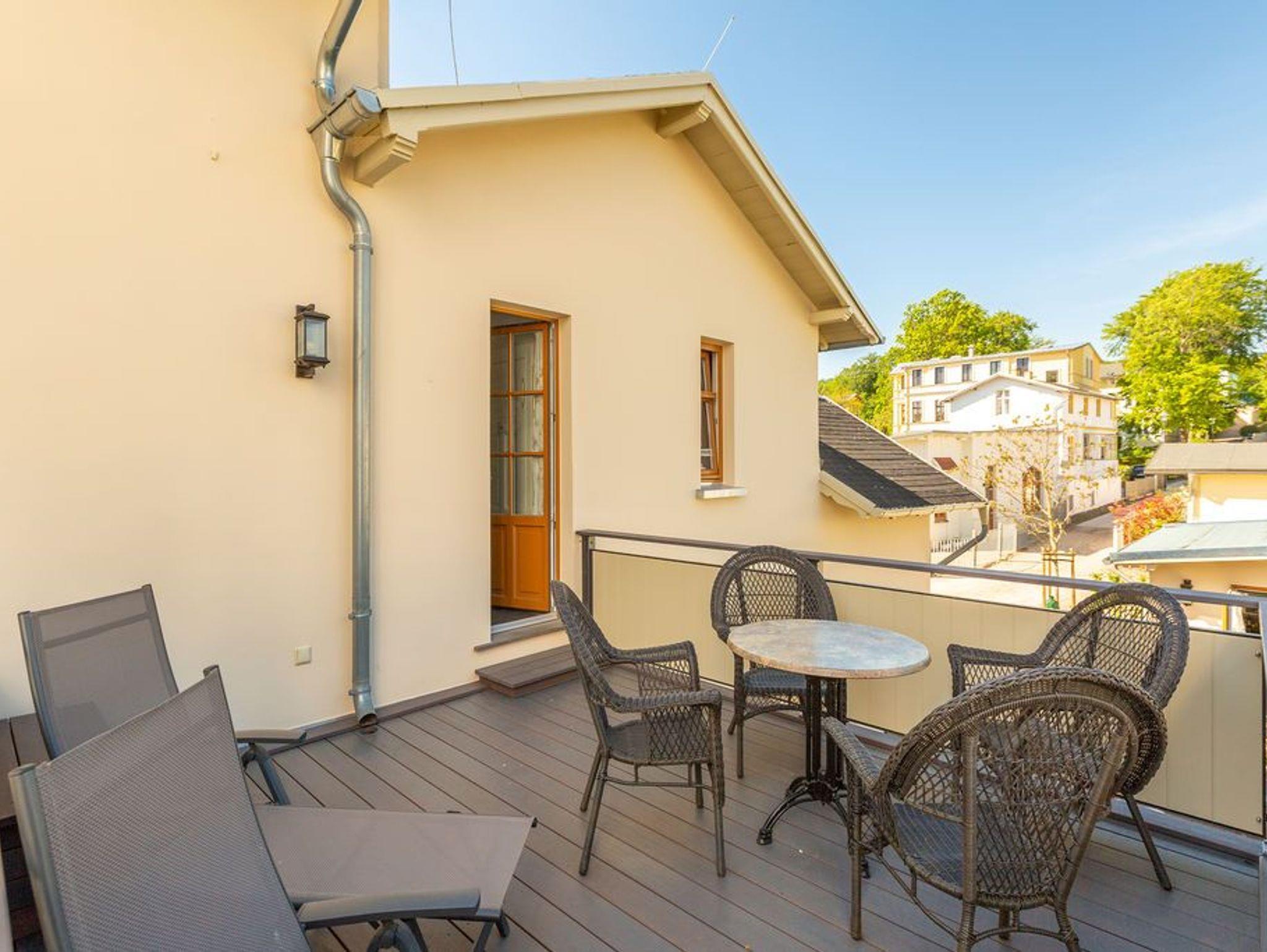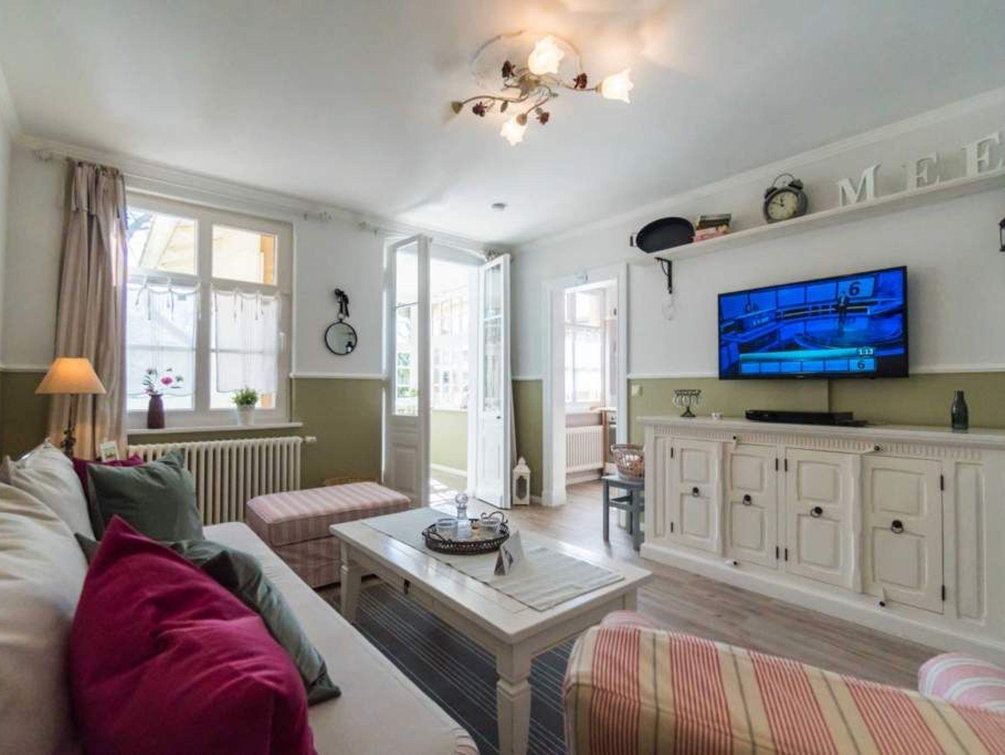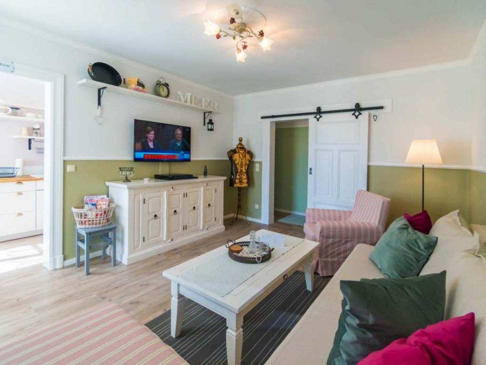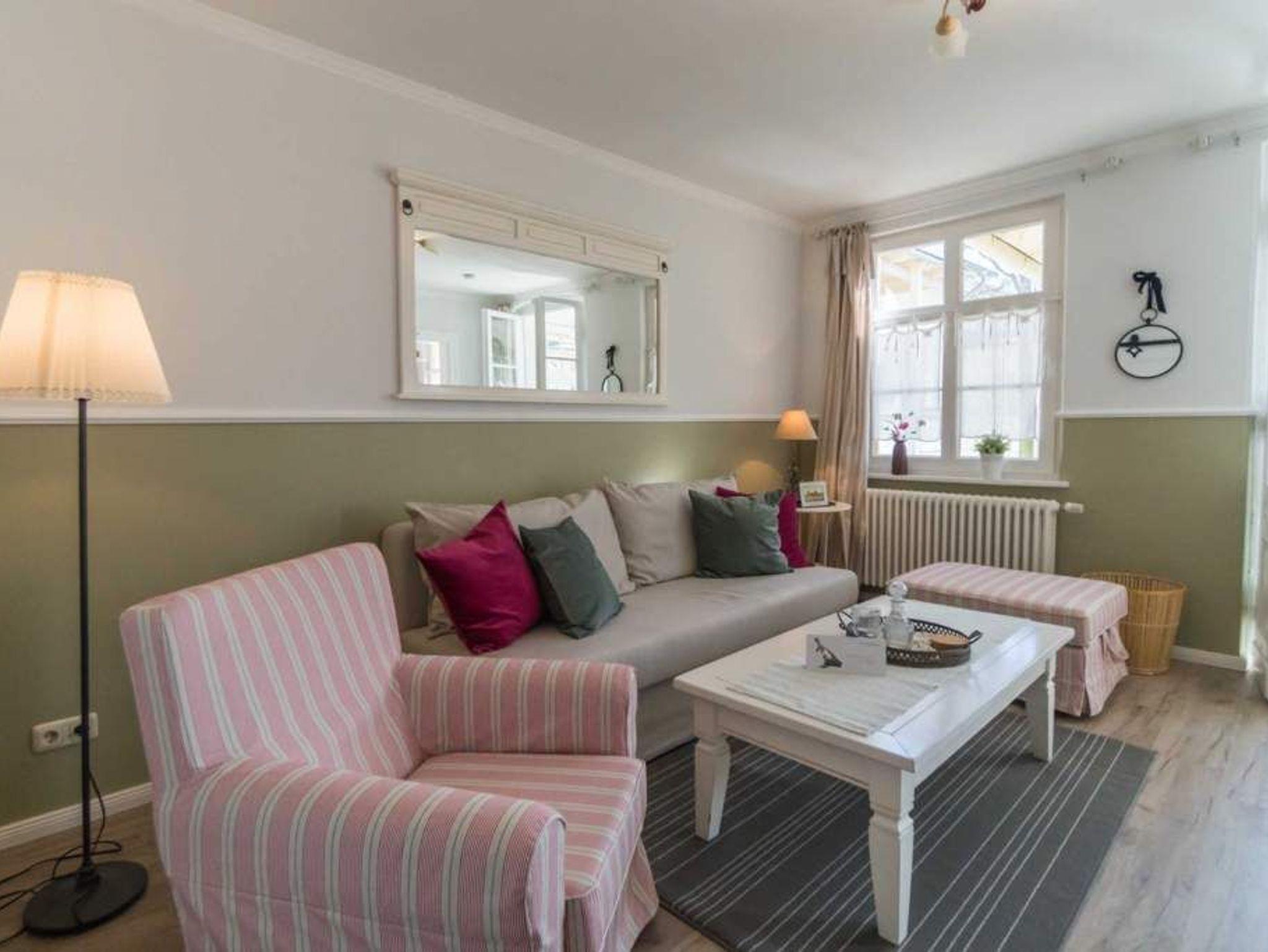 Gemütliche 2-Raum-Ferienwohnung ( 59 qm) für 2 Erwachsene und 1 Kind bis 5 Jahre; schöner Wohnbereich mit Sitzgruppe [&] Flat-TV und angrenzende helle Veranda mit Essplatz, kleine offene Küche mit Backofen [&] Geschirrspüler, Schlafzimmer mit 1 Doppelbett ( 1,60m x 2,00m) und 1 Juniorbett ( 0,70m x 1,60m) mit Zugang zum Balkon ( mit Gartenmöbeln ausgestattet und zur Südseite gelegen, 2. Eingang zum Balkon ist vom Flur möglich); Bad mit Dusche und WC, 1 PKW-Stellplatz am Haus, kostenfreies WLAN. Auf Wunsch stellen wir für unsere kleinen Gäste ein Kinderreisebett (ohne zusätzliche Matratze [&] Bettzeug) und einen Kinderhochstuhl ( gegen einen Aufpreis) zur Verfügung. Bei Ihrer Anreise sind die Betten bezogen und Handtücher liegen bereit (als Erstausstattung). Auf Nachfrage ist es möglich ein 2. Kind ( bis 3 Jahre im Kinderreisebett) mitzubringen. Für den Tag am Meer steht Ihnen von Mitte Mai bis September (je nach Witterung) ein Strandkorb am Strand zur Verfügung. Sie planen einen größeren Familienausflug - dann lässt sich diese Wohnung super mit der Wohnung 05 ( im Erdgeschoss) kombinieren. Beide Appartements befinden sie in einem Haus und sind über den selben Haupteingang zu nutzen.