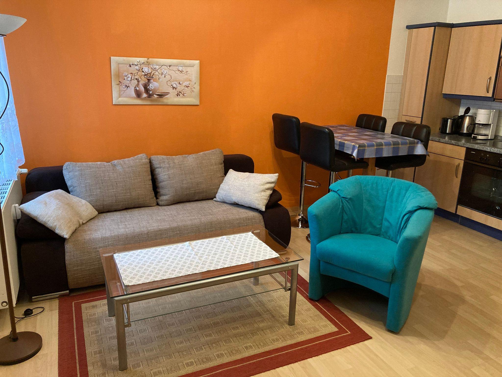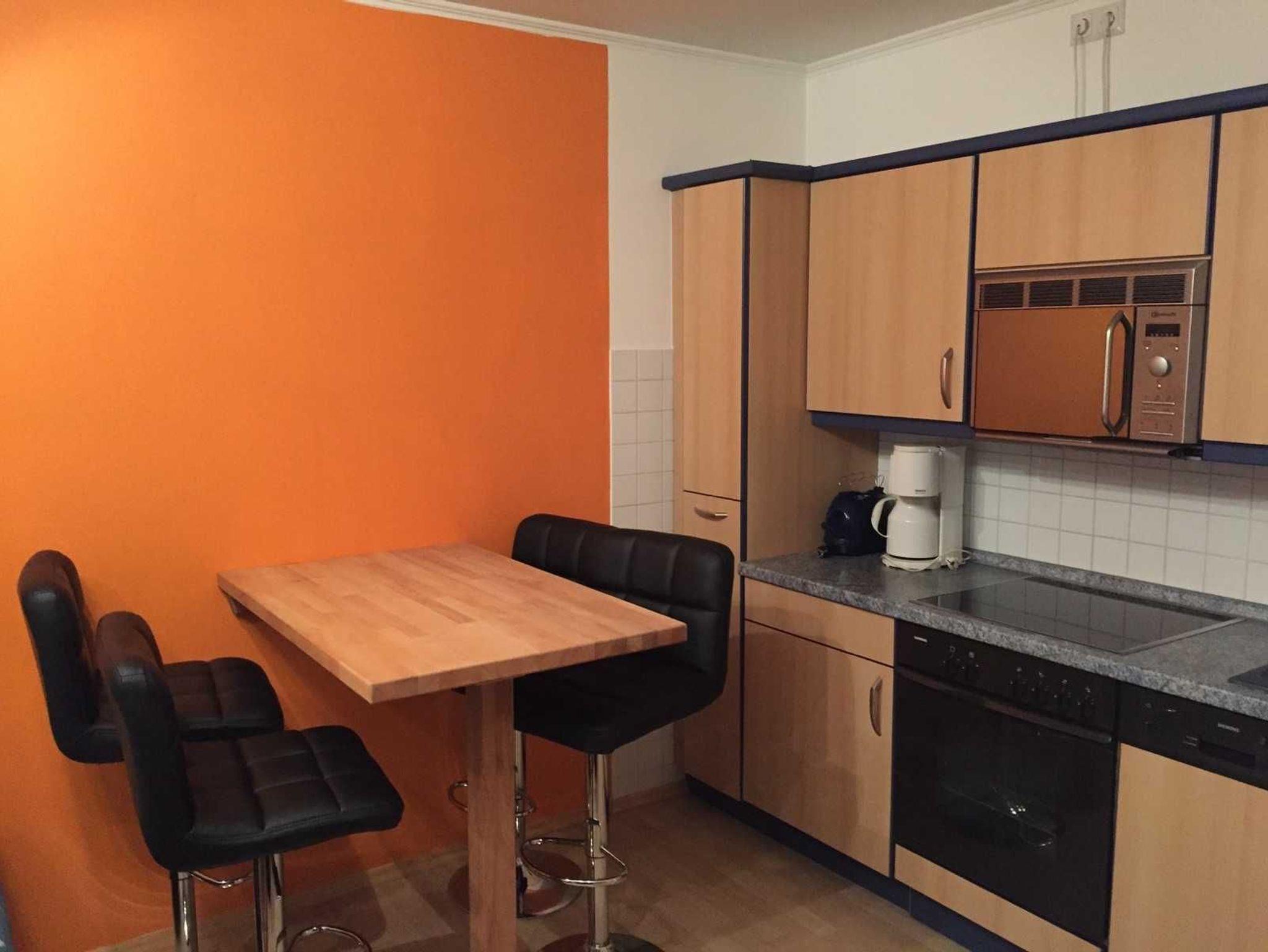 Die helle, freundlich eingerichtete Ferienwohnung (42qm) ist für maximal 3 Personen ausgestattet. Im Wohnzimmer befindet sich eine komplett ausgestattete Küchenzeile (Mikrowelle, Geschirrspüler, Herd mit Backofen, usw.) Die ausziehbare Couch ist zugleich Schlafplatz für die dritte Person.