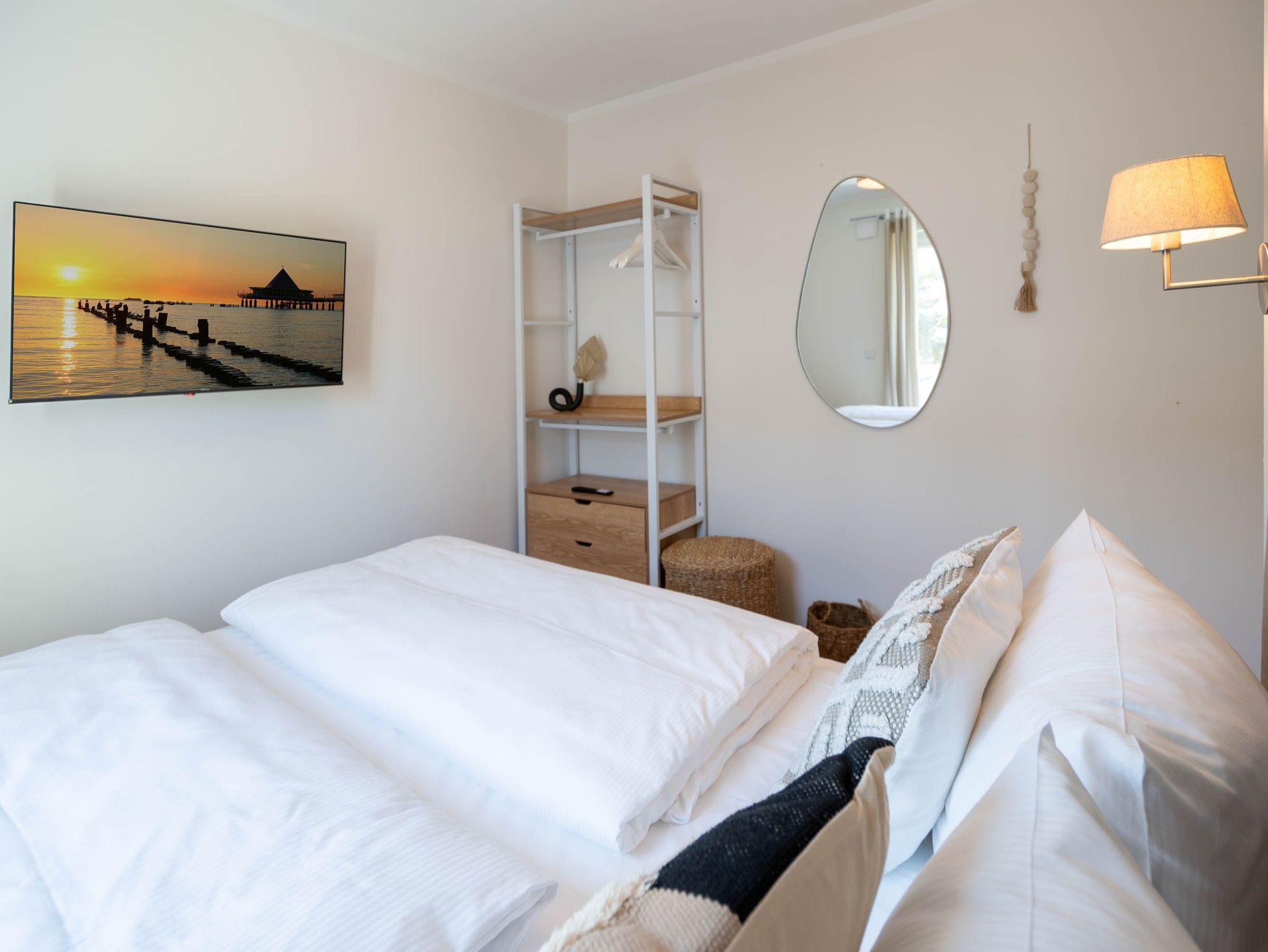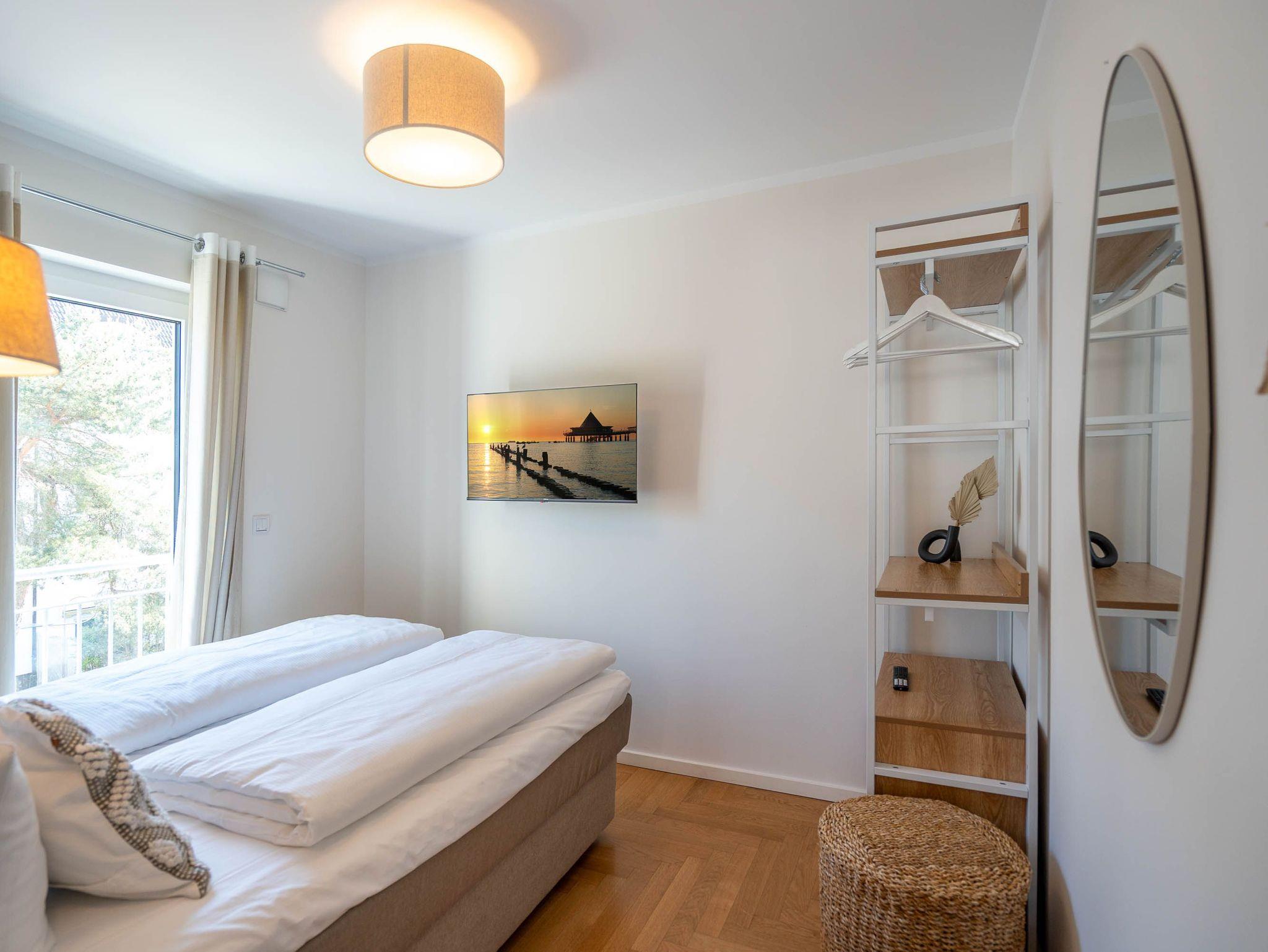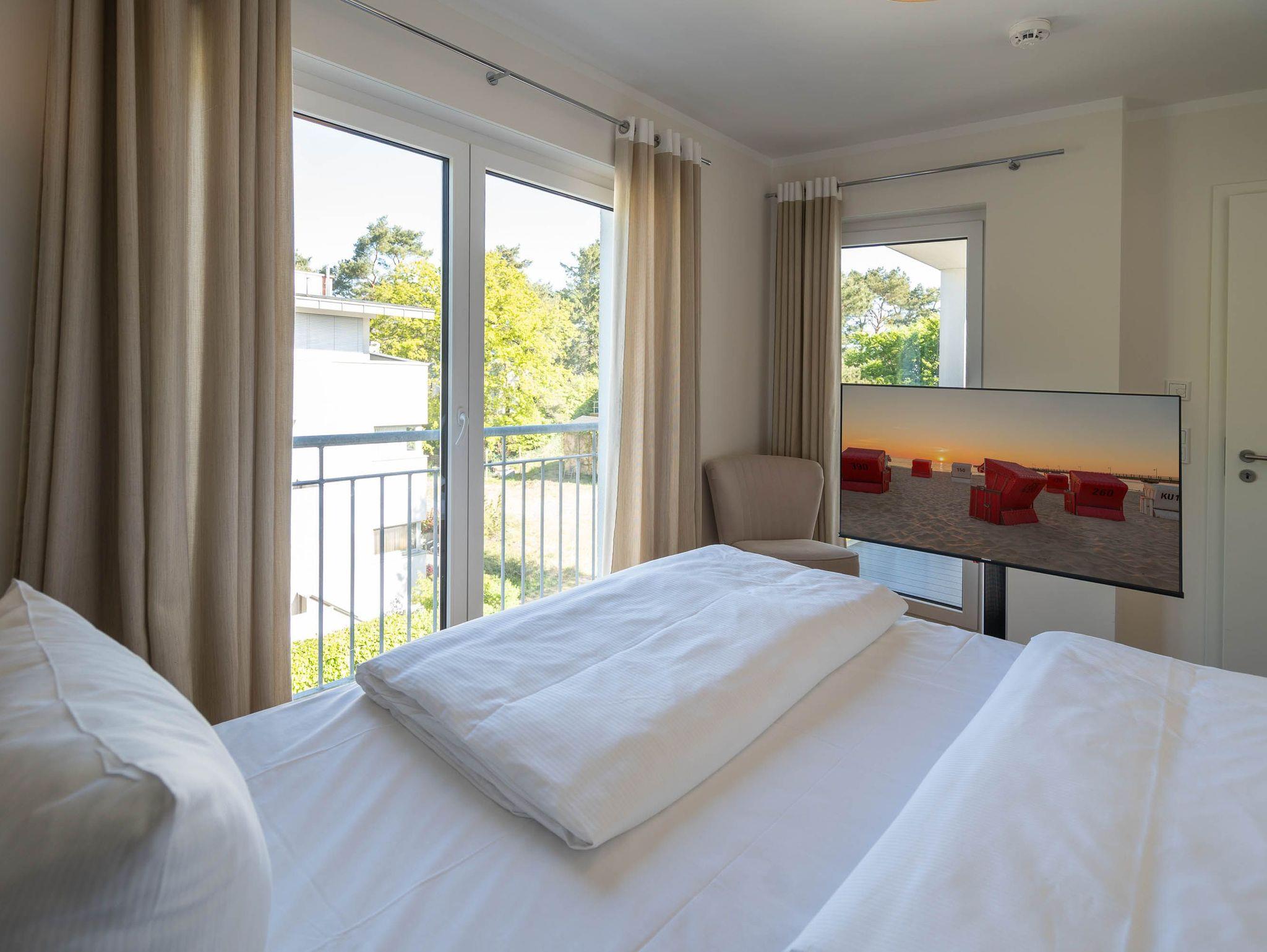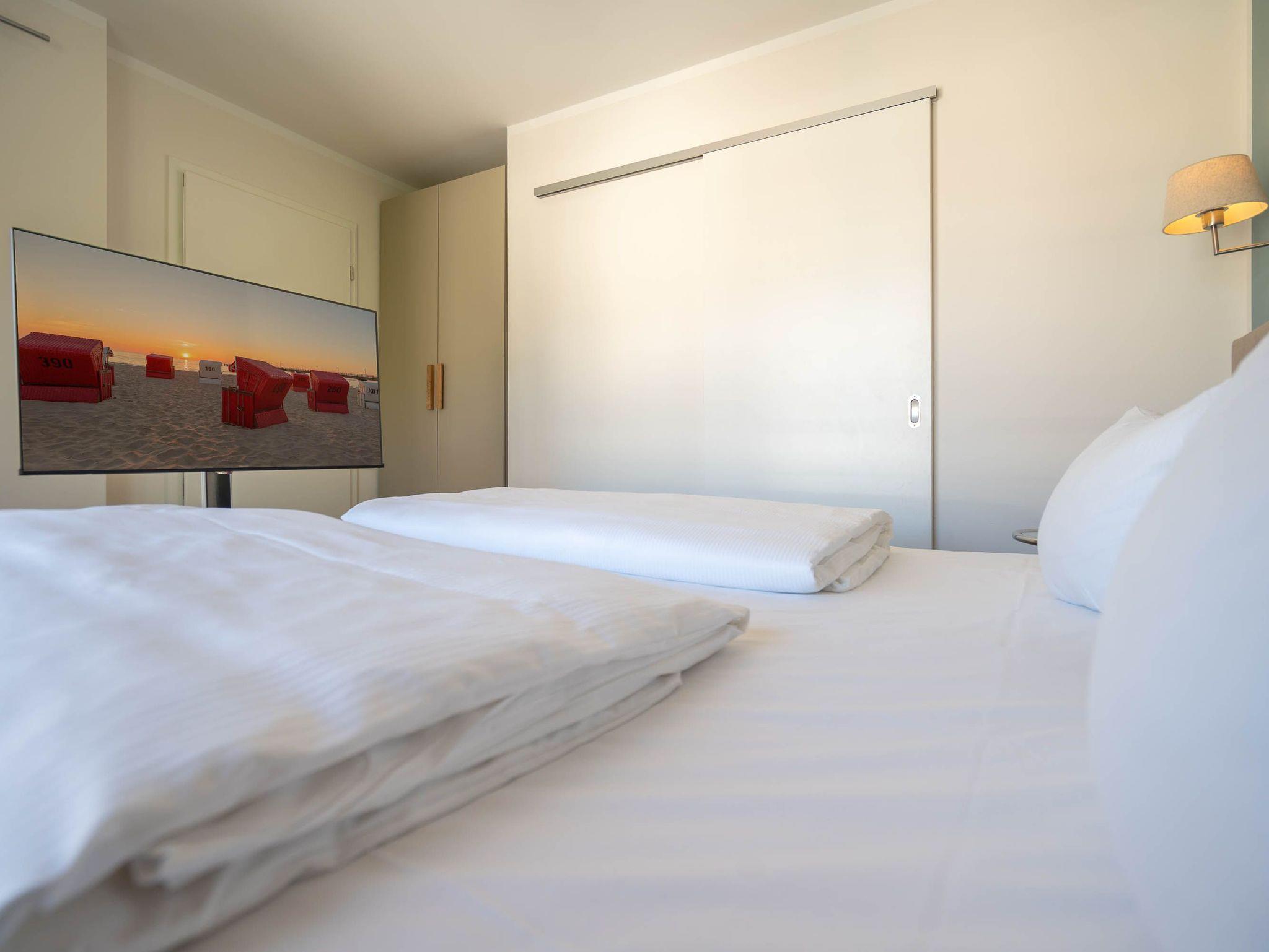 Ein kuscheliges Hideaway in einem modernen, komfortablen Neubau erwartet Sie im Appartement 13. Helle, luftige Farben, ausgesuchte Materialien und ein funktionaler Grundriss sorgen für eine entspannte, von Innenarchitektenhand designte Urlaubsstimmung. Eine ideale 3-Raum-Ferienwohnung (62 qm im 2. Obergeschoss) für 2 bis 4 Personen. Schon beim Eintreten offeriert sich Ihnen der gemütliche Wohnbereich mit bequemer Sitzgruppe, Flat-TV und einem per Knopfdruck zu bedienenden Elektrokamin der neuesten Generation. Vom Wohnbereich hat man Zugang zum schönen Westbalkon, der mit Gartenmöbel ausgestattet ist. Die, im Wohnbereich integrierte Küchenzeile ist ein kleines Raumwunder und hält alles parat, was Sie zum Kochen benötigen. Der angrenzende Esstisch bietet Platz für gemütliches Beisammensein. Klein aber fein, die wohnungseigene Sauna bietet nicht nur in der kalten Jahreszeit eine erholsame Abwechslung. Das erste Schlafzimmer ist mit einem komfortablen Boxspringbett (1,80m x 2,00m), Einbauschrank und Flat-TV ausgestattet, von hier hat man ebenfalls Zugang zum Balkon und zum eigenen kleinen Duschbad mit WC. Das zweite Schlafzimmer verfügt über ein komfortables Boxspringbett (1,60m x 2,00m) und einen Flat-TV, auch hier steht ein eigenes Duschbad mit WC zur Verfügung. Für das Urlaubsgepäck kann hier der Einbauschrank im Flur genutzt werden. Für Ihren Komfort sind die Betten bei der Anreise bezogen und Handtücher liegen bereit. Ein Pkw-Stellplatz steht in der Tiefgarage (max. Einfahrtshöhe 1,85 m) zur Verfügung.