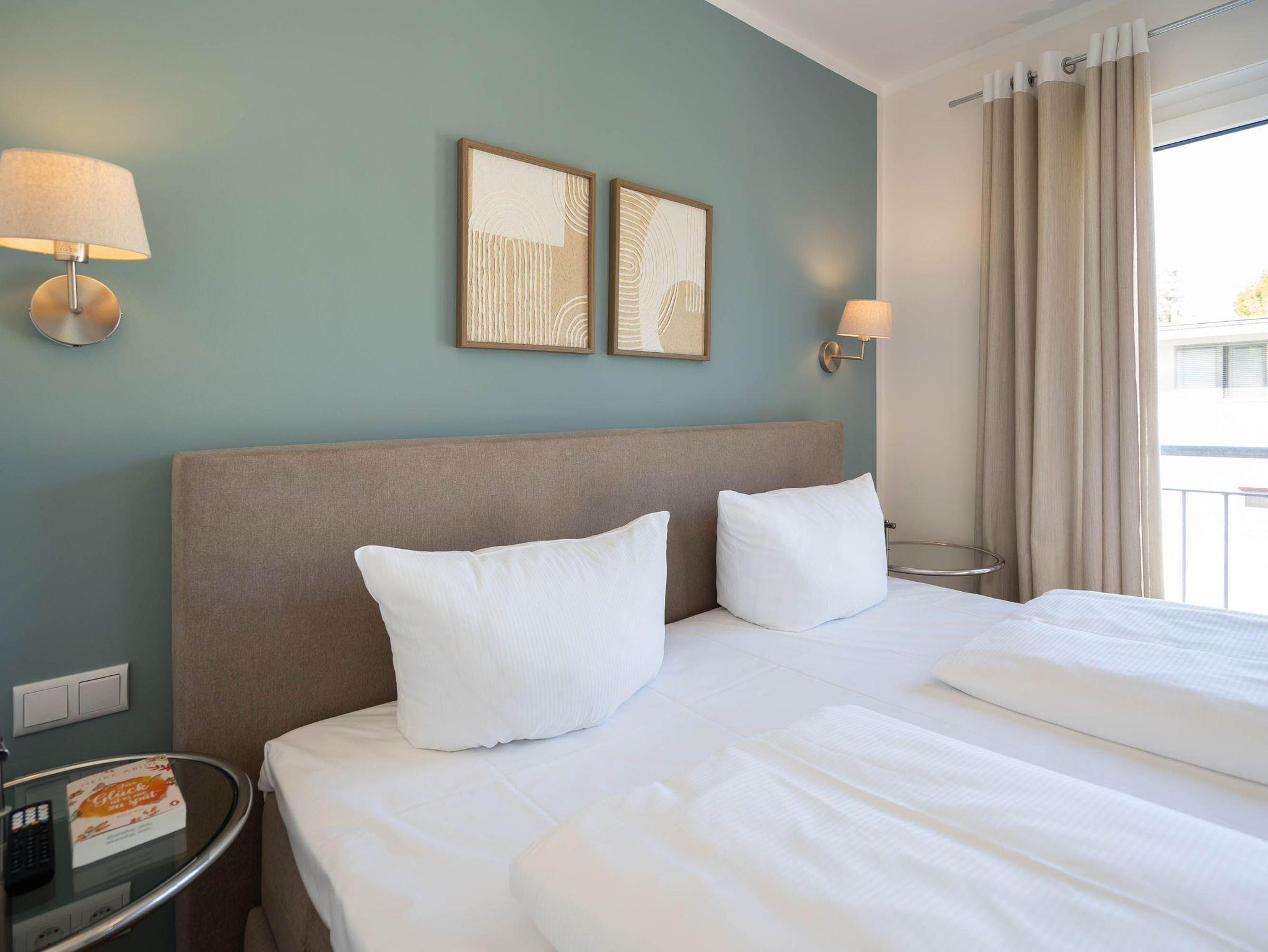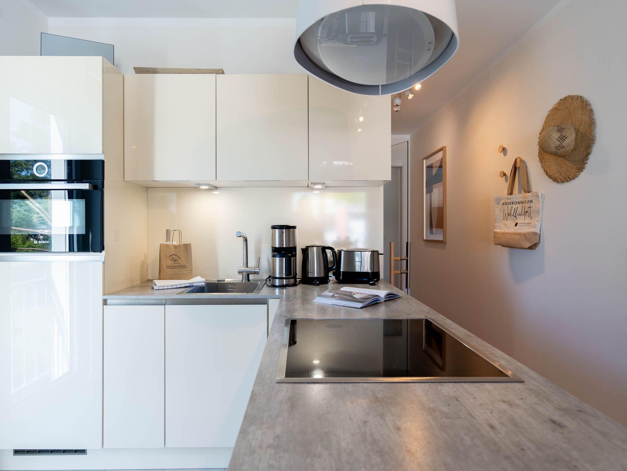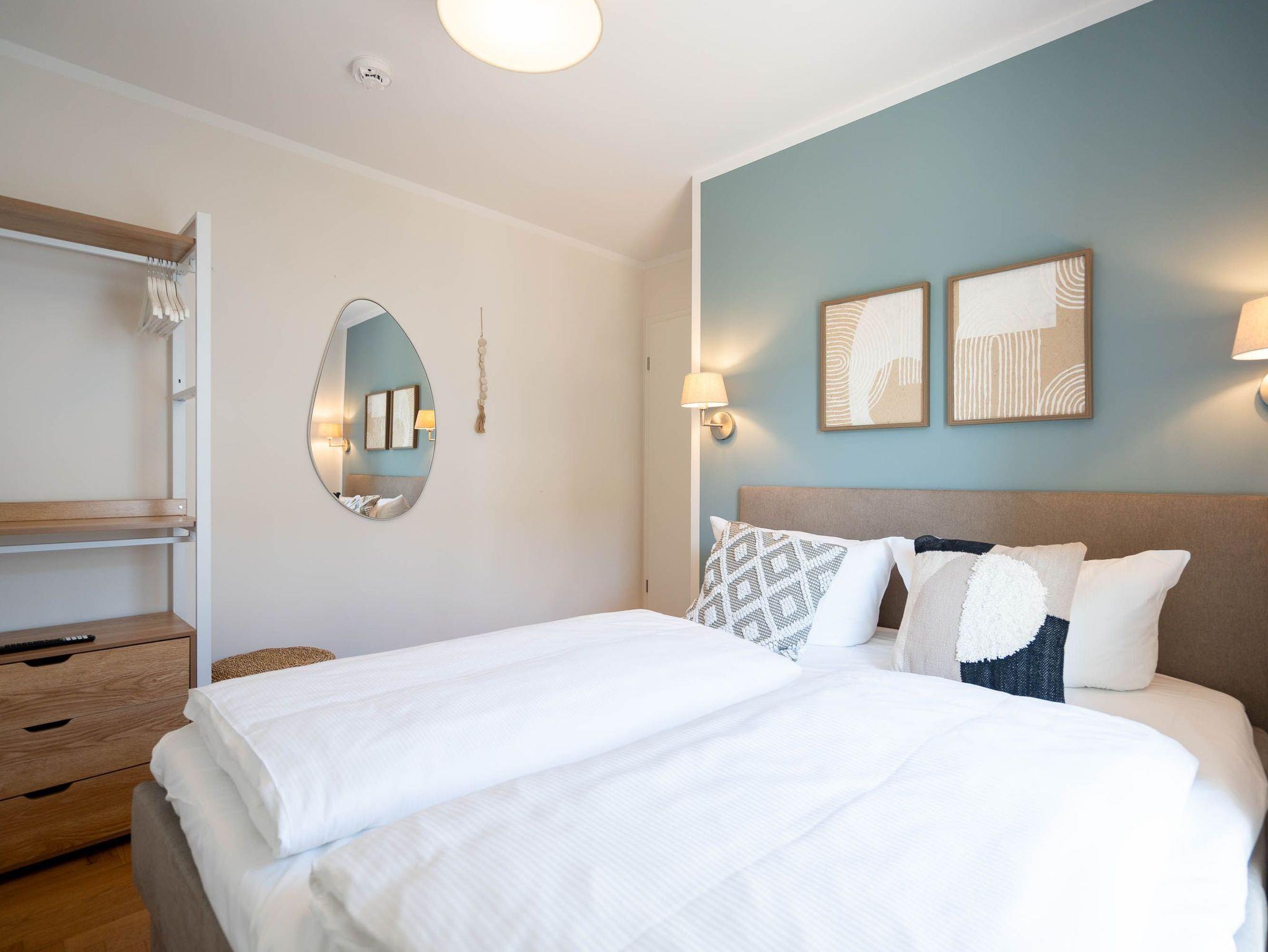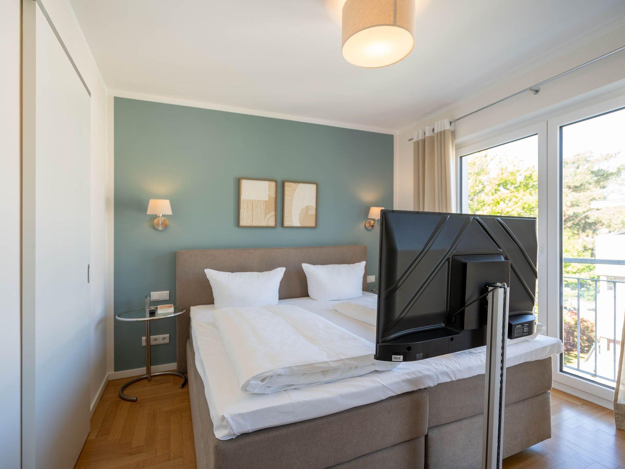 Ein kuscheliges Hideaway in einem modernen, komfortablen Neubau erwartet Sie im Appartement 13. Helle, luftige Farben, ausgesuchte Materialien und ein funktionaler Grundriss sorgen für eine entspannte, von Innenarchitektenhand designte Urlaubsstimmung. Eine ideale 3-Raum-Ferienwohnung (62 qm im 2. Obergeschoss) für 2 bis 4 Personen. Schon beim Eintreten offeriert sich Ihnen der gemütliche Wohnbereich mit bequemer Sitzgruppe, Flat-TV und einem per Knopfdruck zu bedienenden Elektrokamin der neuesten Generation. Vom Wohnbereich hat man Zugang zum schönen Westbalkon, der mit Gartenmöbel ausgestattet ist. Die, im Wohnbereich integrierte Küchenzeile ist ein kleines Raumwunder und hält alles parat, was Sie zum Kochen benötigen. Der angrenzende Esstisch bietet Platz für gemütliches Beisammensein. Klein aber fein, die wohnungseigene Sauna bietet nicht nur in der kalten Jahreszeit eine erholsame Abwechslung. Das erste Schlafzimmer ist mit einem komfortablen Boxspringbett (1,80m x 2,00m), Einbauschrank und Flat-TV ausgestattet, von hier hat man ebenfalls Zugang zum Balkon und zum eigenen kleinen Duschbad mit WC. Das zweite Schlafzimmer verfügt über ein komfortables Boxspringbett (1,60m x 2,00m) und einen Flat-TV, auch hier steht ein eigenes Duschbad mit WC zur Verfügung. Für das Urlaubsgepäck kann hier der Einbauschrank im Flur genutzt werden. Für Ihren Komfort sind die Betten bei der Anreise bezogen und Handtücher liegen bereit. Ein Pkw-Stellplatz steht in der Tiefgarage (max. Einfahrtshöhe 1,85 m) zur Verfügung.