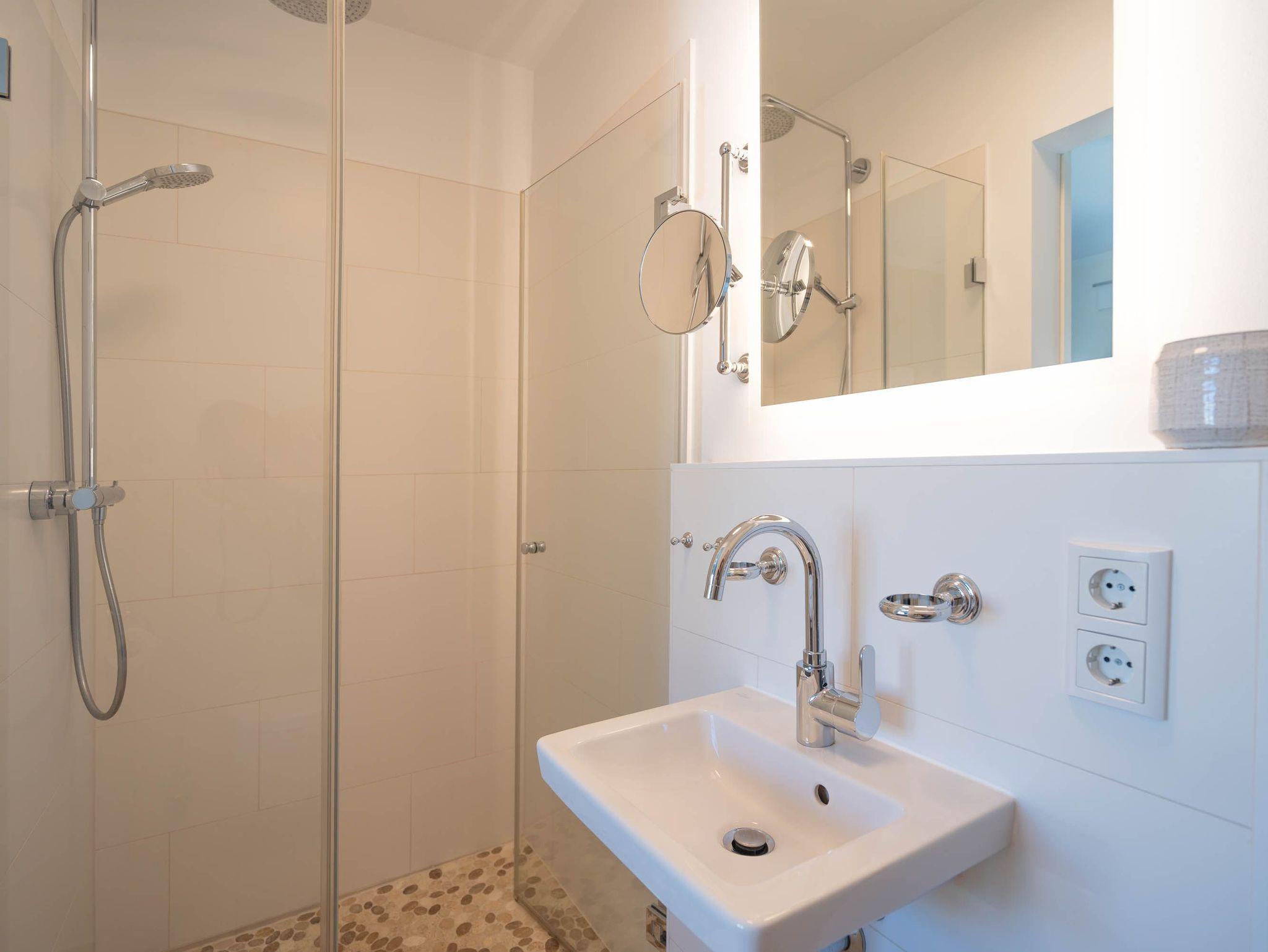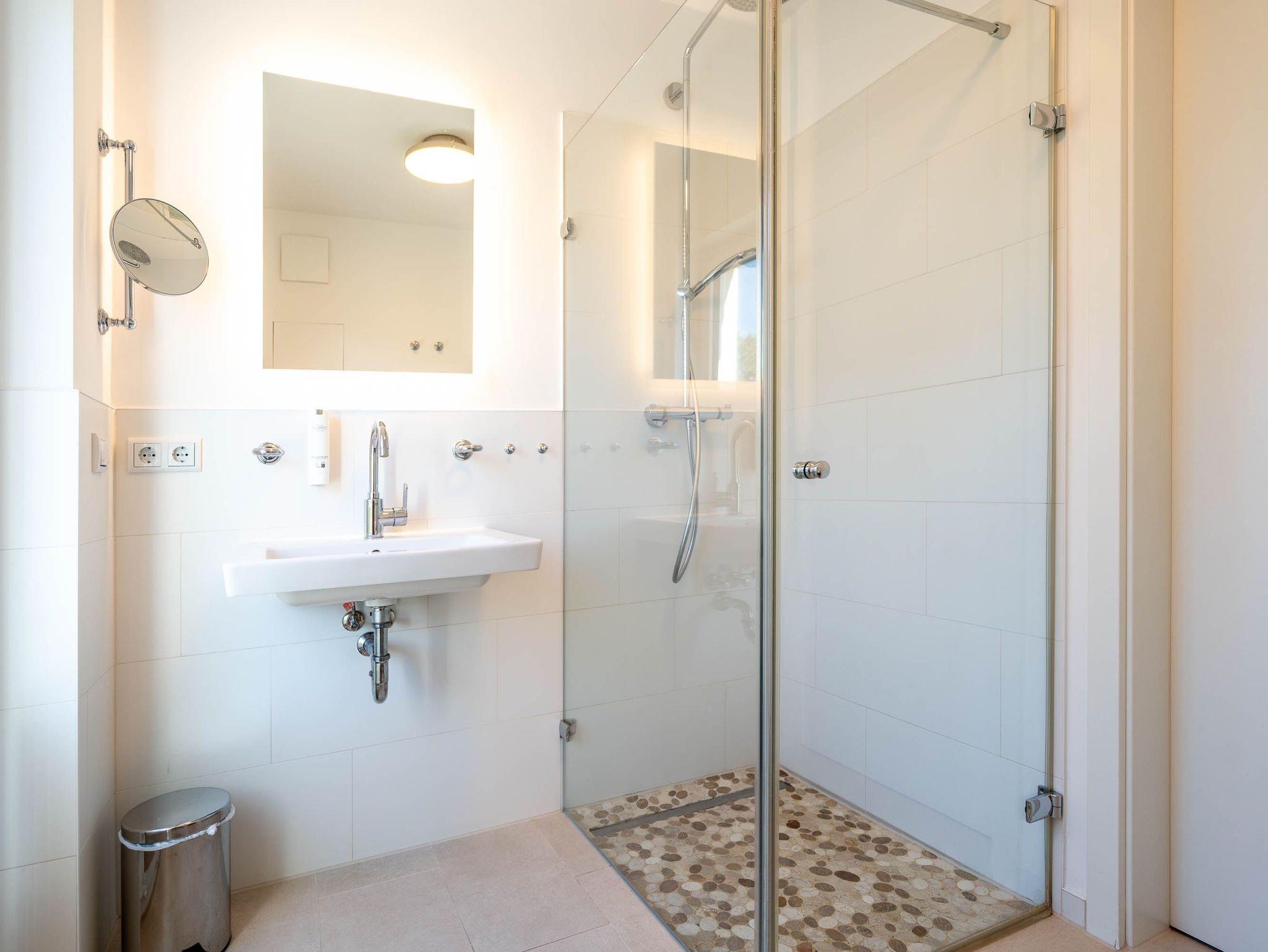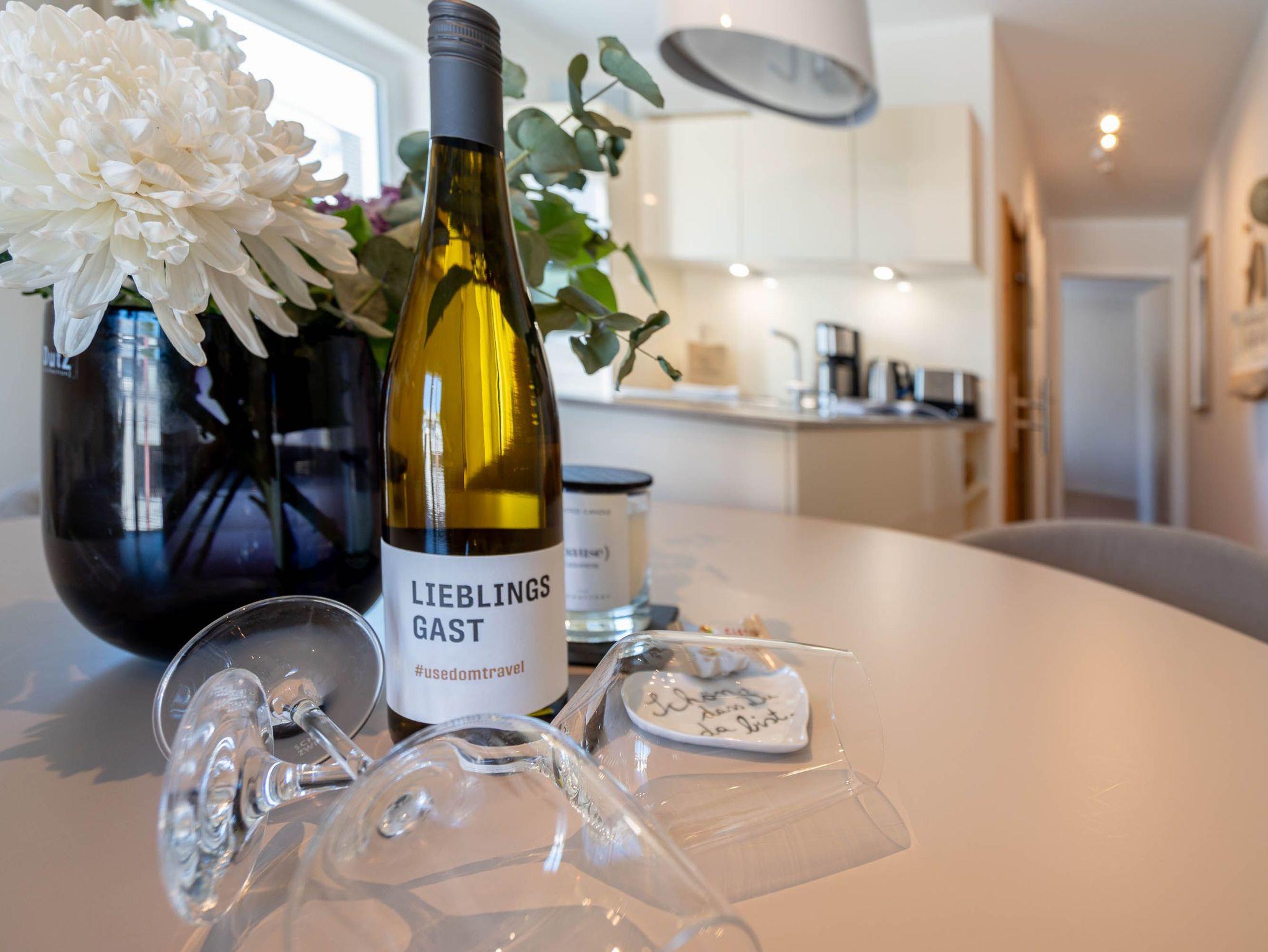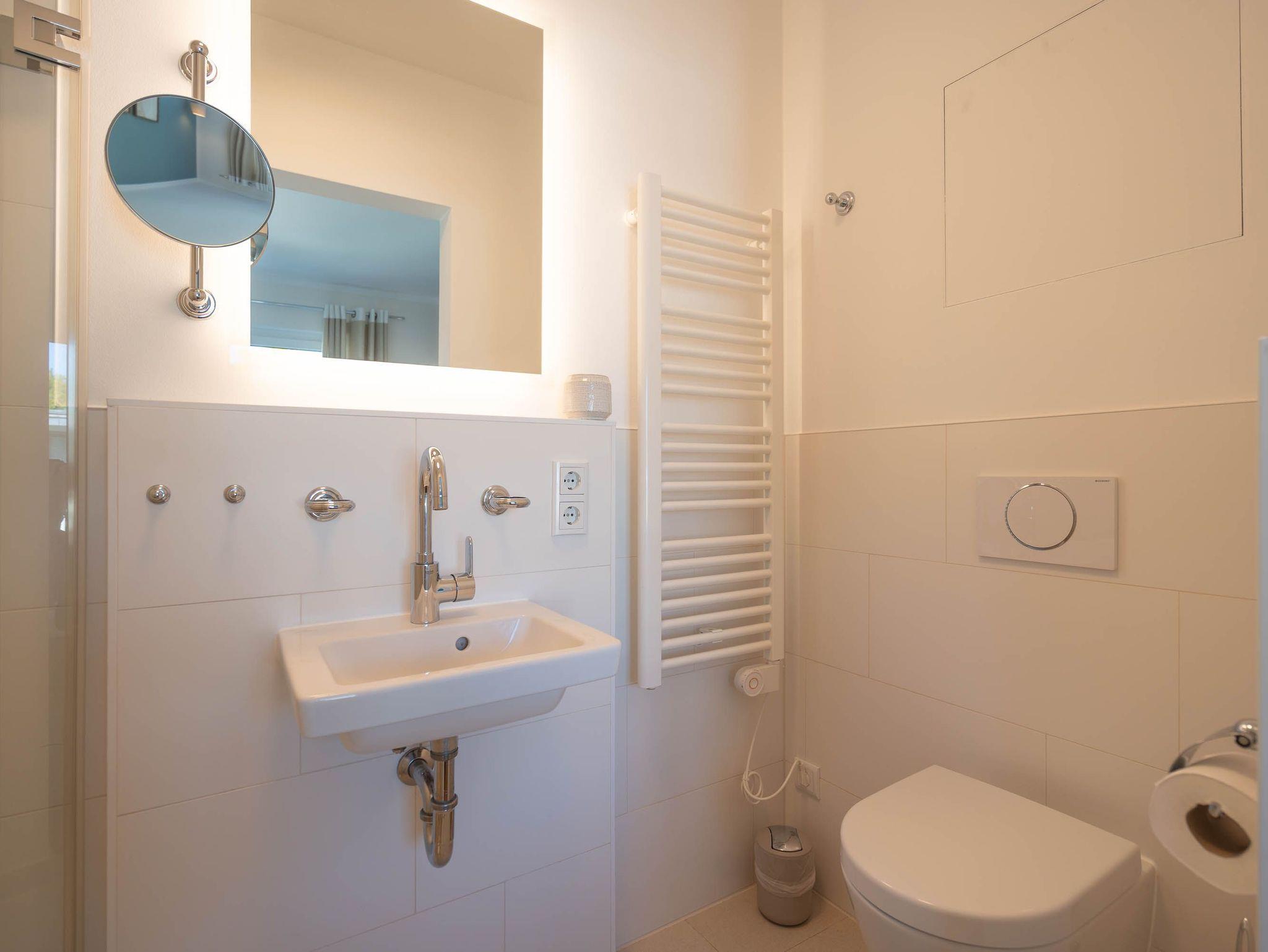 Ein kuscheliges Hideaway in einem modernen, komfortablen Neubau erwartet Sie im Appartement 13. Helle, luftige Farben, ausgesuchte Materialien und ein funktionaler Grundriss sorgen für eine entspannte, von Innenarchitektenhand designte Urlaubsstimmung. Eine ideale 3-Raum-Ferienwohnung (62 qm im 2. Obergeschoss) für 2 bis 4 Personen. Schon beim Eintreten offeriert sich Ihnen der gemütliche Wohnbereich mit bequemer Sitzgruppe, Flat-TV und einem per Knopfdruck zu bedienenden Elektrokamin der neuesten Generation. Vom Wohnbereich hat man Zugang zum schönen Westbalkon, der mit Gartenmöbel ausgestattet ist. Die, im Wohnbereich integrierte Küchenzeile ist ein kleines Raumwunder und hält alles parat, was Sie zum Kochen benötigen. Der angrenzende Esstisch bietet Platz für gemütliches Beisammensein. Klein aber fein, die wohnungseigene Sauna bietet nicht nur in der kalten Jahreszeit eine erholsame Abwechslung. Das erste Schlafzimmer ist mit einem komfortablen Boxspringbett (1,80m x 2,00m), Einbauschrank und Flat-TV ausgestattet, von hier hat man ebenfalls Zugang zum Balkon und zum eigenen kleinen Duschbad mit WC. Das zweite Schlafzimmer verfügt über ein komfortables Boxspringbett (1,60m x 2,00m) und einen Flat-TV, auch hier steht ein eigenes Duschbad mit WC zur Verfügung. Für das Urlaubsgepäck kann hier der Einbauschrank im Flur genutzt werden. Für Ihren Komfort sind die Betten bei der Anreise bezogen und Handtücher liegen bereit. Ein Pkw-Stellplatz steht in der Tiefgarage (max. Einfahrtshöhe 1,85 m) zur Verfügung.