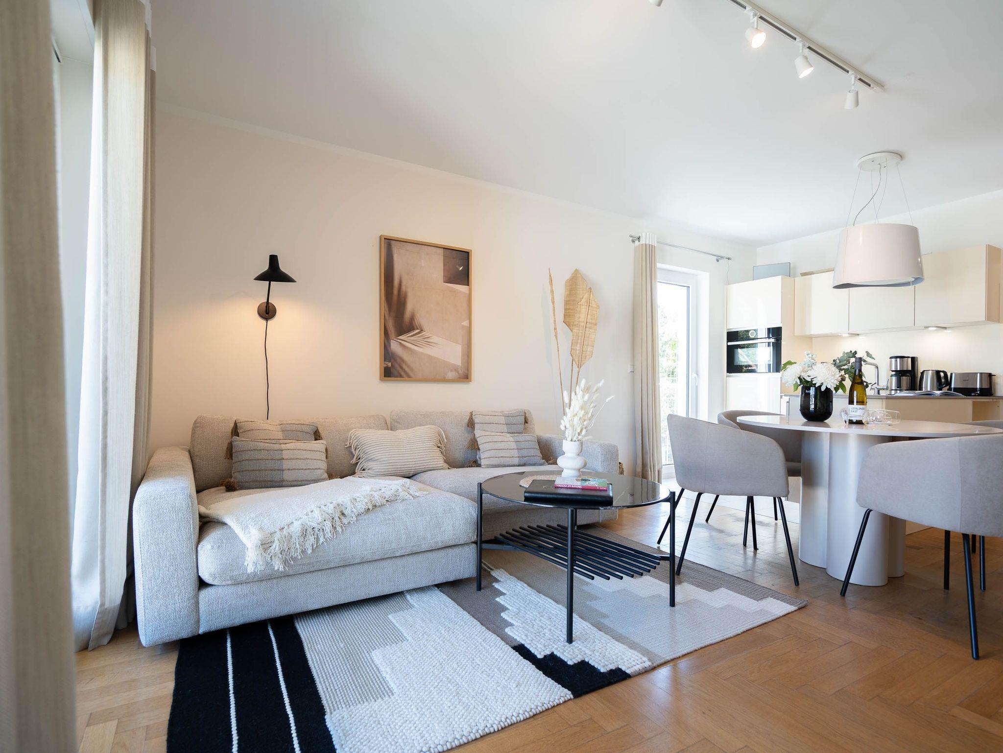 Ein Domizil für Anspruchsvolle und Genießer! Freuen Sie sich auf ein wunderschönes Urlaubsdomizil, denn die Dünenresidenz Heringsdorf verbindet den zeitgemäßen Komfort eines Neubaus mit einer strandnahen Lage. Eine Tiefgarage (max. Einfahrtshöhe 1,85 m) und ein Aufzug im Haus sind hier selbstverständlich. Helle, geschmackvoll designte 2- und 3-Raum-Appartements mit Balkonen oder Terrassen laden zum Erholen ein. Die Dachgeschosswohnungen überzeugen mit großzügigen Dachterrassen und schönen Ausblicken. Aus einigen Wohnungen kann man sogar durch die Dünenbepflanzung das Meer schimmern sehen. Als besonderes Highlight verfügen die Wohnungen über eine Sauna und/oder einen Elektrokamin, der per Knopfdruck Gemütlichkeit zaubert. Außerdem sind alle Appartements mit Fußbodenheizung und elektrische Rollläden ausgestattet.