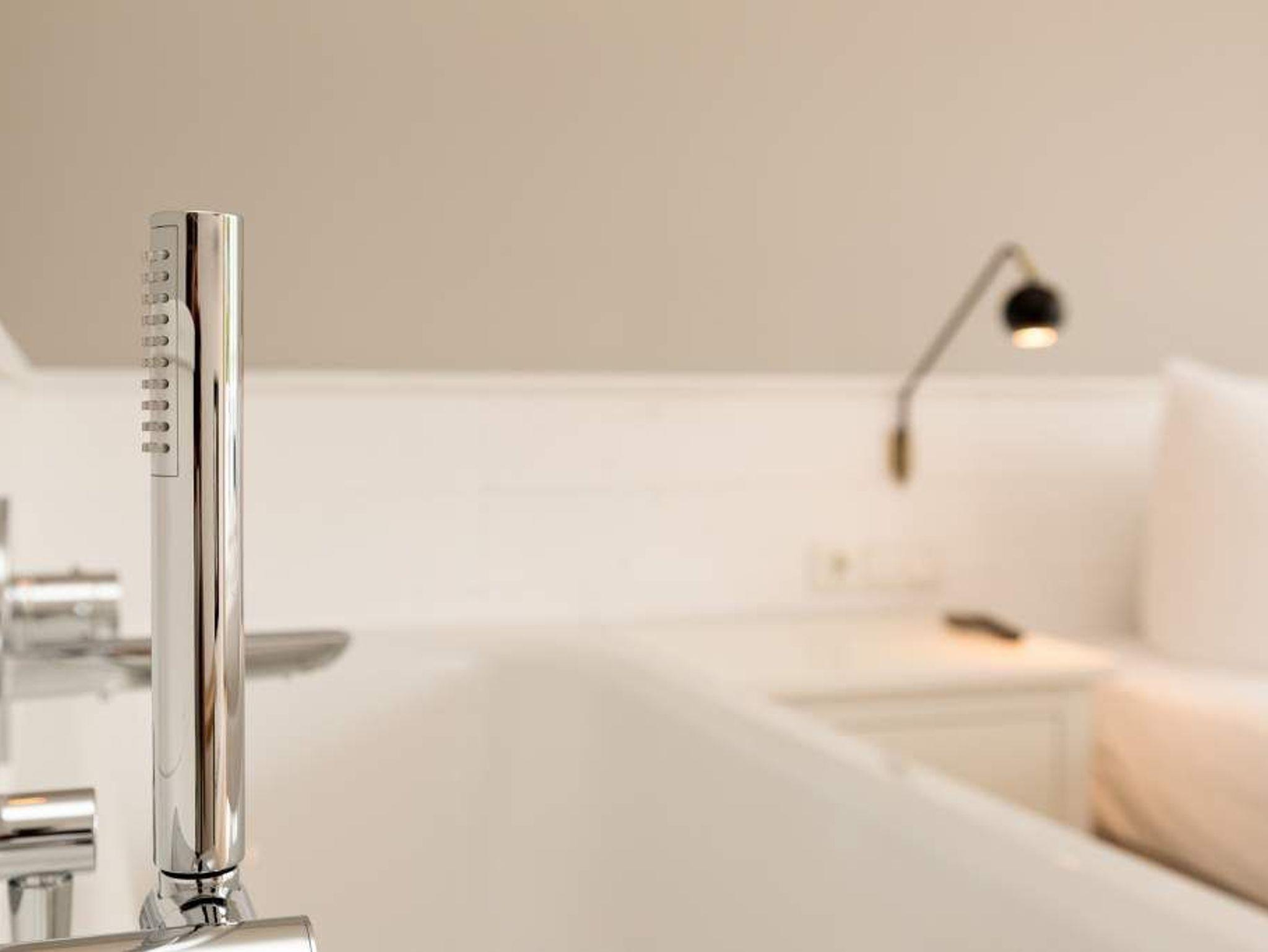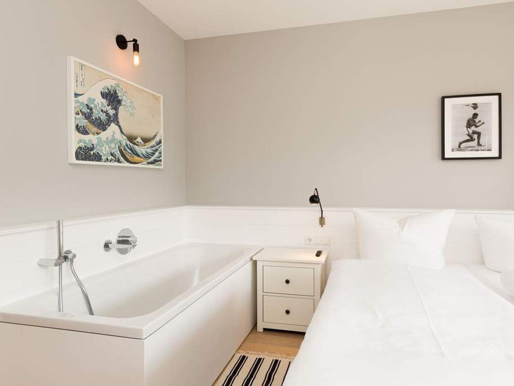 Dieses Appartement ist außergewöhnlich. Die Nummer 08 im zweiten Obergeschoss der Villa Strandgrün in Heringsdorf bietet auf 68 Quadratmetern stylisches Understatement und modernes Wohndesign. Platz ist hier für drei bis vier Personen. Design- und Echtholzmöbel gehen hier eine wunderbar harmonische Liaison mit Industrial Chic ein. Die offene und hochwertig ausgestattete Küche mit großem Vintage-Kühlschrank gibt den Blick auf einen modern und komfortabel eingerichteten Wohnraum frei. An dem großen Echtholztisch lässt es sich wunderbar dinieren. Vom bequemen Sofa aus schauen Sie auf den Flat-TV oder den extravaganten Röhrenkamin, der auch vom Schlafzimmer aus seine romantische Atmosphäre verbreitet. Der Süd-Westbalkon, mit gemütlichen Loungemöbeln ausgestattet, lädt zum Entspannen und Sonne-tanken ein. Im Schlafzimmer wartet ein 1,80 m x 2,00 m großes Doppelboxspringbett nur darauf, Ihnen wunderbare Träume zu schenken. Baden im Schlafzimmer oder schlafen im Bad? Dieses Appartement bietet Ihnen ein ganz besonderes Schmankerl. Denn mit der freistehenden Badewanne direkt im Schlafzimmer können Sie sich herrlich entspannen und gleich danach ins Bett schlüpfen. Für eine dritte und vierte Person gibt es eine gemütliche Schlafkoje (Doppelbett 1,47 m x 1,97 m), die auf Wunsch mit Schiebetüren verschlossen werde kann. Im geräumigen Bad mit Dusche, Waschtisch und WC ist eine Panorama-Sauna eingebaut. Außerdem verfügt die Wohnung über ein Gäste-WC. Das WLAN ist für Sie kostenfrei. Für Ihr uneingeschränktes Urlaubsgefühl sind die Betten bezogen und Handtücher liegen bereit. In der Tiefgarage gibt es einen Pkw-Stellplatz.