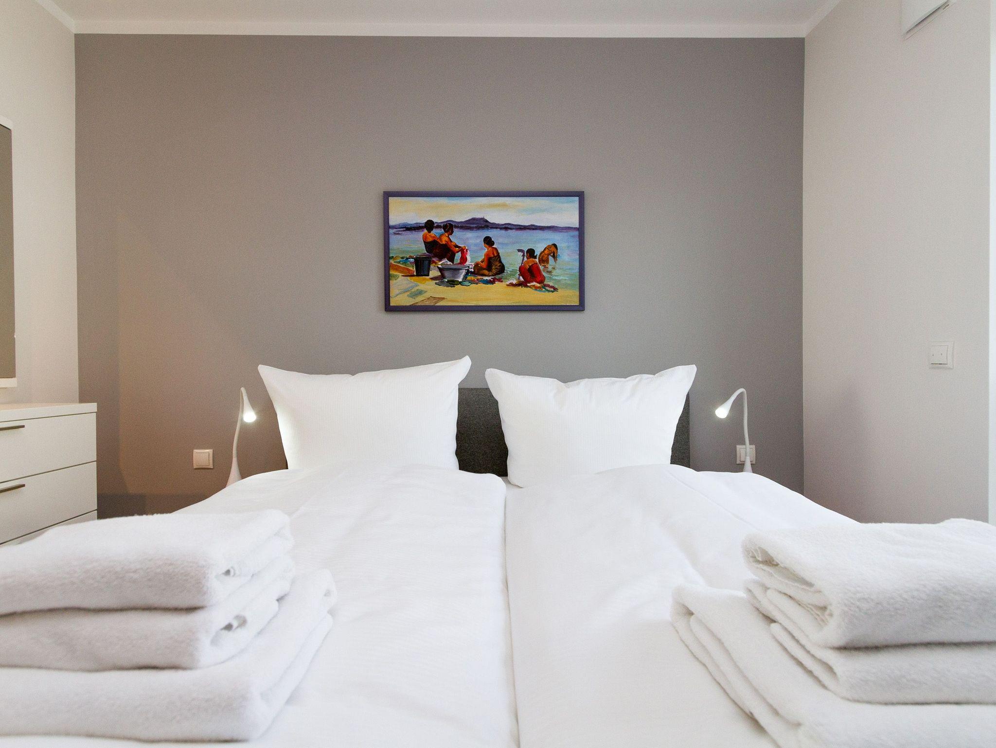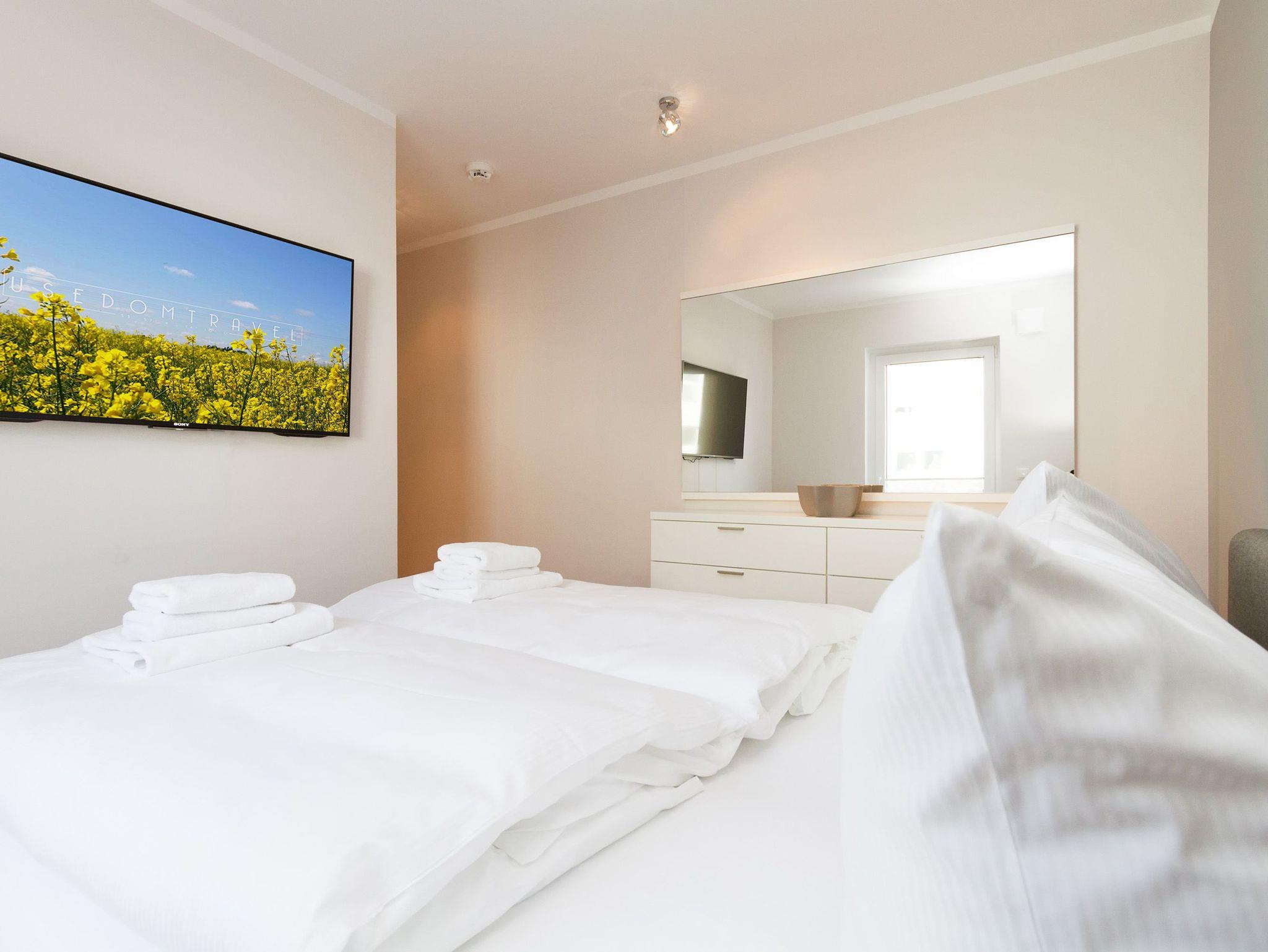 Klare Linie und kräftige Farben, ausgesuchte Materialien und ein modernes Design überzeugen im Appartement 18. Eintreten und Wohlfühlen ist hier die Devise, denn der Wohlfühlfaktor kommt hier nicht zu kurz! Die 3-Raum-Ferienwohnung (62 qm) für 4 Personen inklusive Kleinkind befindet sich im 2. Obergeschoss der Dünenresidenz. Schon beim Eintreten offeriert sich der helle Wohnbereich, ausgestattet mit zwei modernen Ledersofas und Flat-TV. Die angrenzende, offene Küche mit Essplatz fügt sich harmonisch ein und ist natürlich komplett ausgestattet. Zwei Schlafzimmer mit jeweils eigenem Bad bieten einen idealen Rückzugsort. Das erste Schlafzimmer verfügt über ein komfortables Doppelboxspringbett (1,80m x 2,00m), ein kleines Duschbad und Zugang zum Balkon. Das zweite Schlafzimmer wartet mit einem bequemen Doppelboxspringbett (1,60m x 2,00m) und Flat-TV auf, hier ist eine eigene Sauna im Duschbad integriert. Die Usedomer Sonne genießen Sie schon beim Frühstück auf dem Ostbalkon, ausgestattet mit Gartenmöbeln. Hier kann man bei ein bisschen Meerblick wunderbar Relaxen. Für Ihren Komfort sind die Betten bei der Anreise bezogen und Handtücher liegen bereit. Ein Pkw-Stellplatz steht in der Tiefgarage zur Verfügung (max. Einfahrtshöhe 1,85 m). Das Wlan-Netz kann kostenlos genutzt werden.