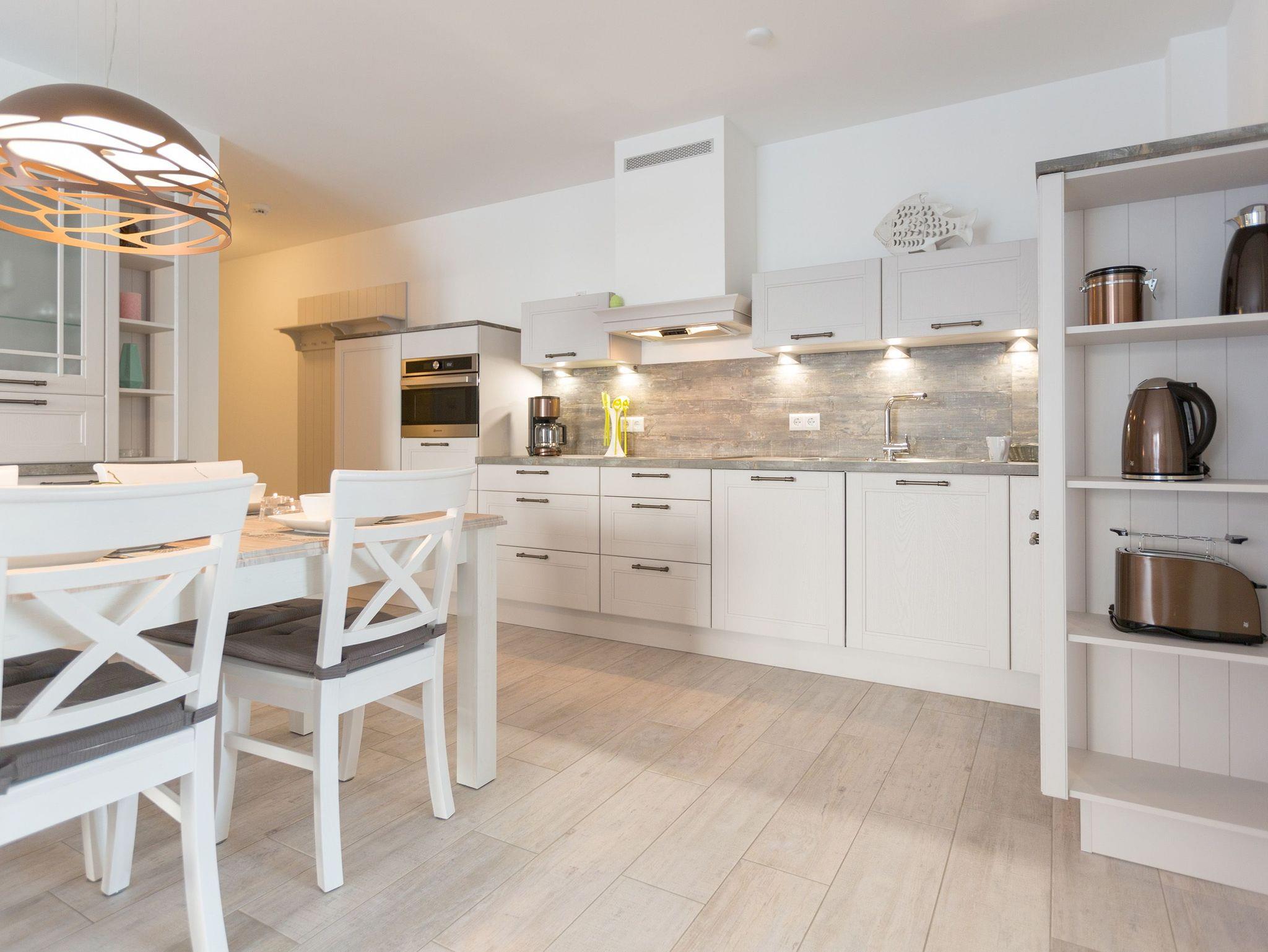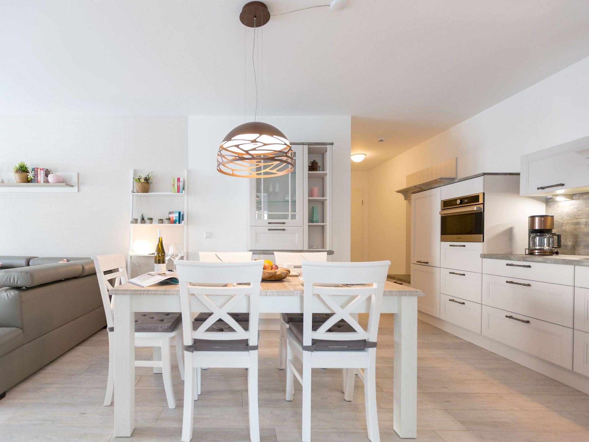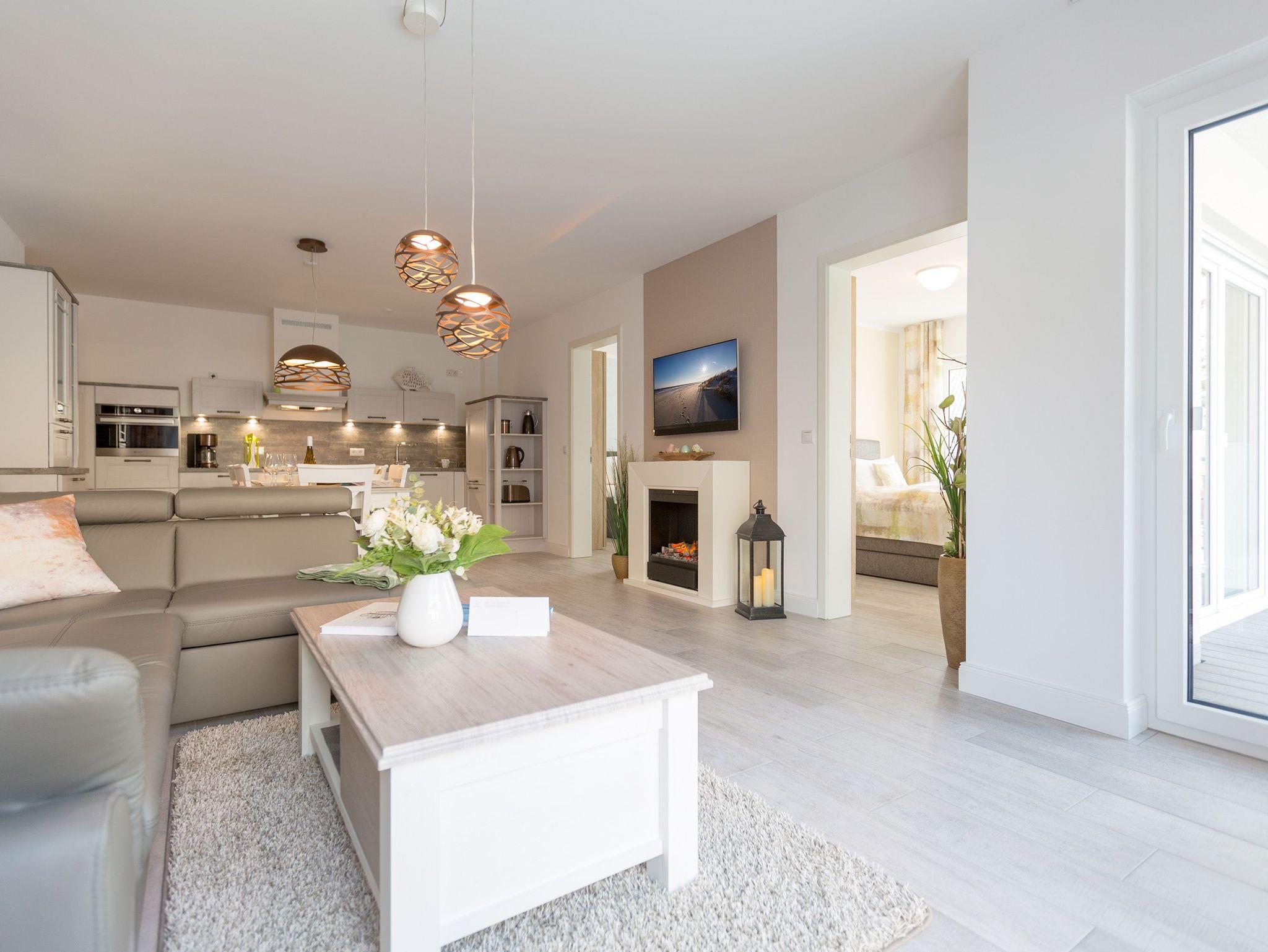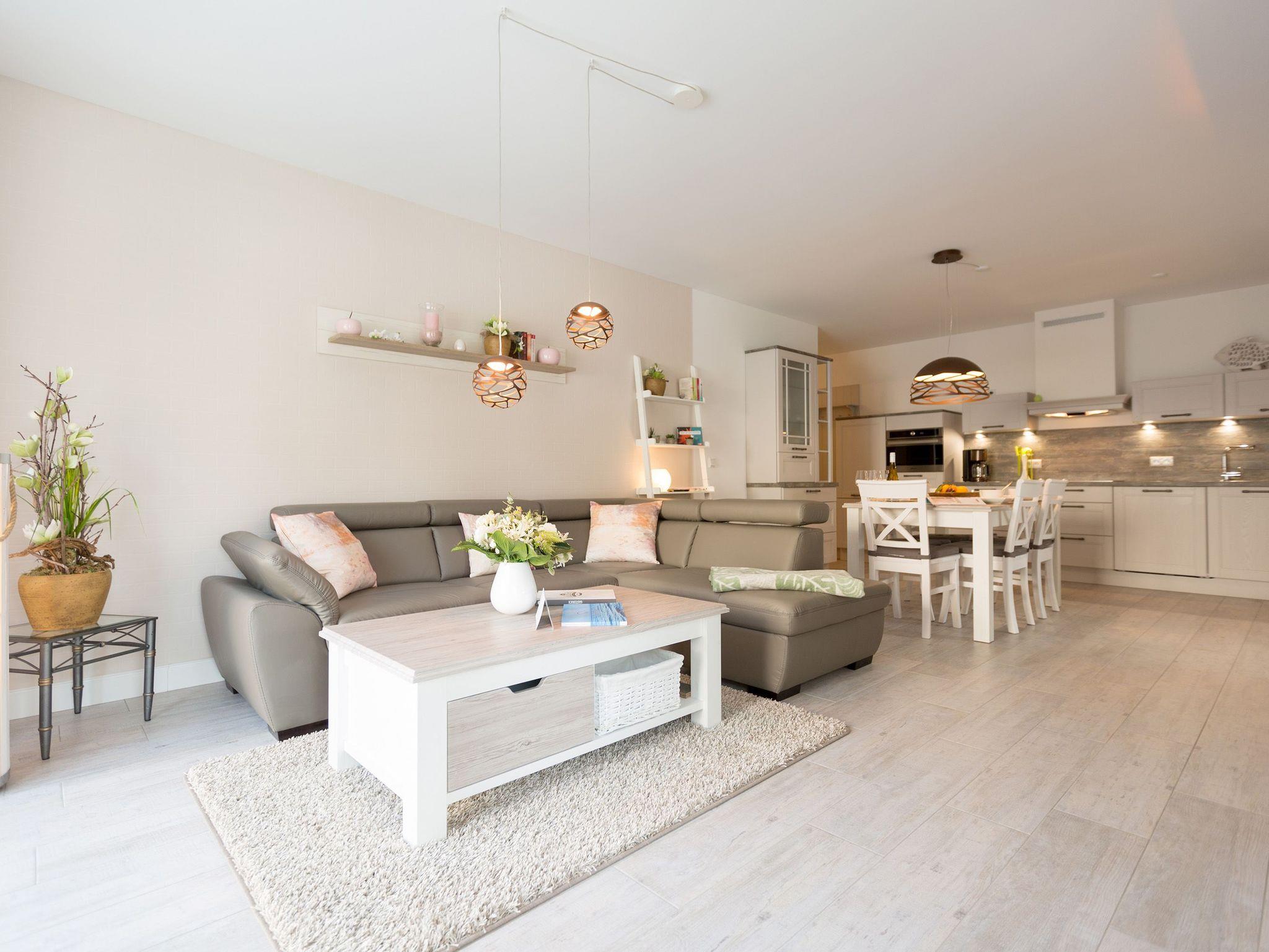 In diesem 67 Quadratmeter großen Ferienappartement im Erdgeschoss der Dünenresidenz in Heringsdorf passt alles harmonisch zusammen. Hell und lichtdurchflutet schafft es eine Atmosphäre voller Leichtigkeit. Genauso sollte ein Urlaub sein. Stilvoll und komfortabel sind die drei Räume eingerichtet, die Platz bieten für bis zu vier Personen und ein Kleinkind bis drei Jahre im Kinderreisebett. Leder, Echtholzmöbel, Designlampen und geschmackvolle Accessoires ? hier empfängt Sie eine wunderschöne Wohlfühlatmosphäre. Mit viel Liebe zum Detail wurde dieses Urlaubsdomizil eingerichtet. Alles ist ebenerdig konzipiert. Eine große Wohnlandschaft verführt zum Entspannen bei Kaminfeuer oder Kerzenlicht. Für Unterhaltung sorgt ein großer Flat-TV. Eine offene, in schlichtem Weiß gehaltene Küche ? mit hochwertigen Bauknecht-Geräten ausgestattet ? ist zum Kochen und Zusammensitzen ideal. Lassen Sie sich in die beiden großen Doppelboxspringbetten (1x 1,60m x 2,00m / 1x 1,80m x 2,00m) in den beiden Schlafzimmern fallen und genießen Sie einen erholsamen Schlaf oder ausgiebige Kuschelzeiten. Von einem der Schlafzimmer sowie vom Wohnzimmer aus haben Sie Zugang zum Westbalkon, der Ihnen allabendlich den Sonnenuntergang in den schönsten Farben präsentiert. Das Badezimmer hat eine geräumige Dusche, einen Waschtisch, eine Waschmaschine und ein WC. Lassen Sie sich vom ersten Moment an rundum verwöhnen. Handtücher liegen für Sie bereit und die Betten sind bezogen. Ein Pkw-Stellplatz steht in der Tiefgarage (max. Einfahrtshöhe 1,85 m) zur Verfügung.