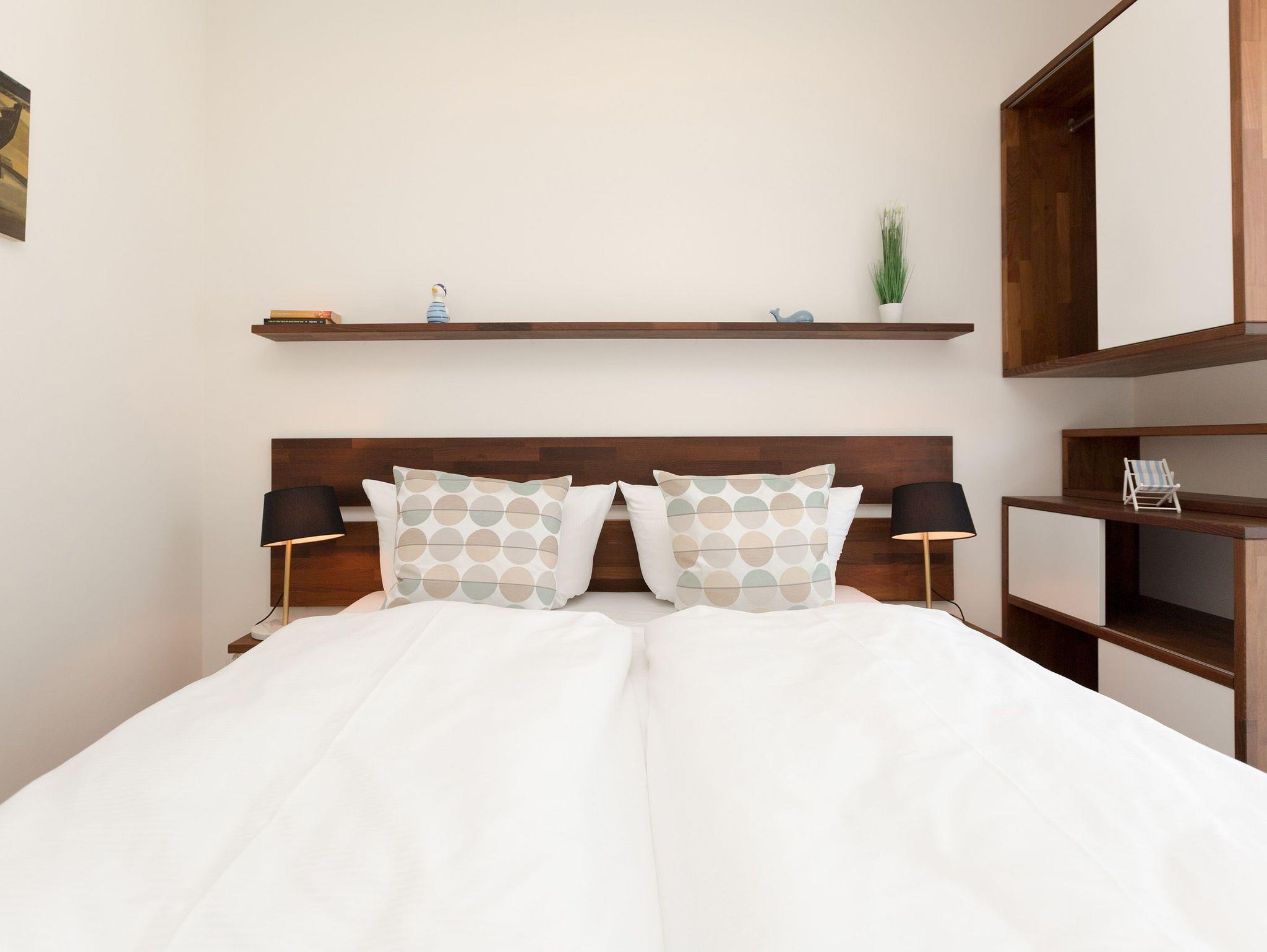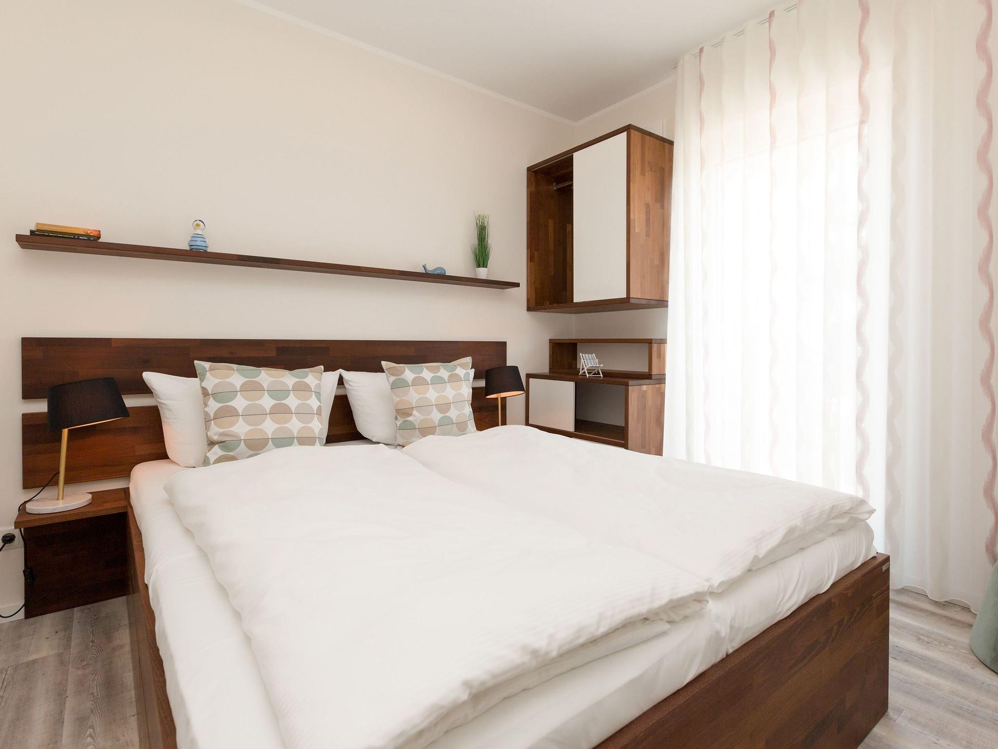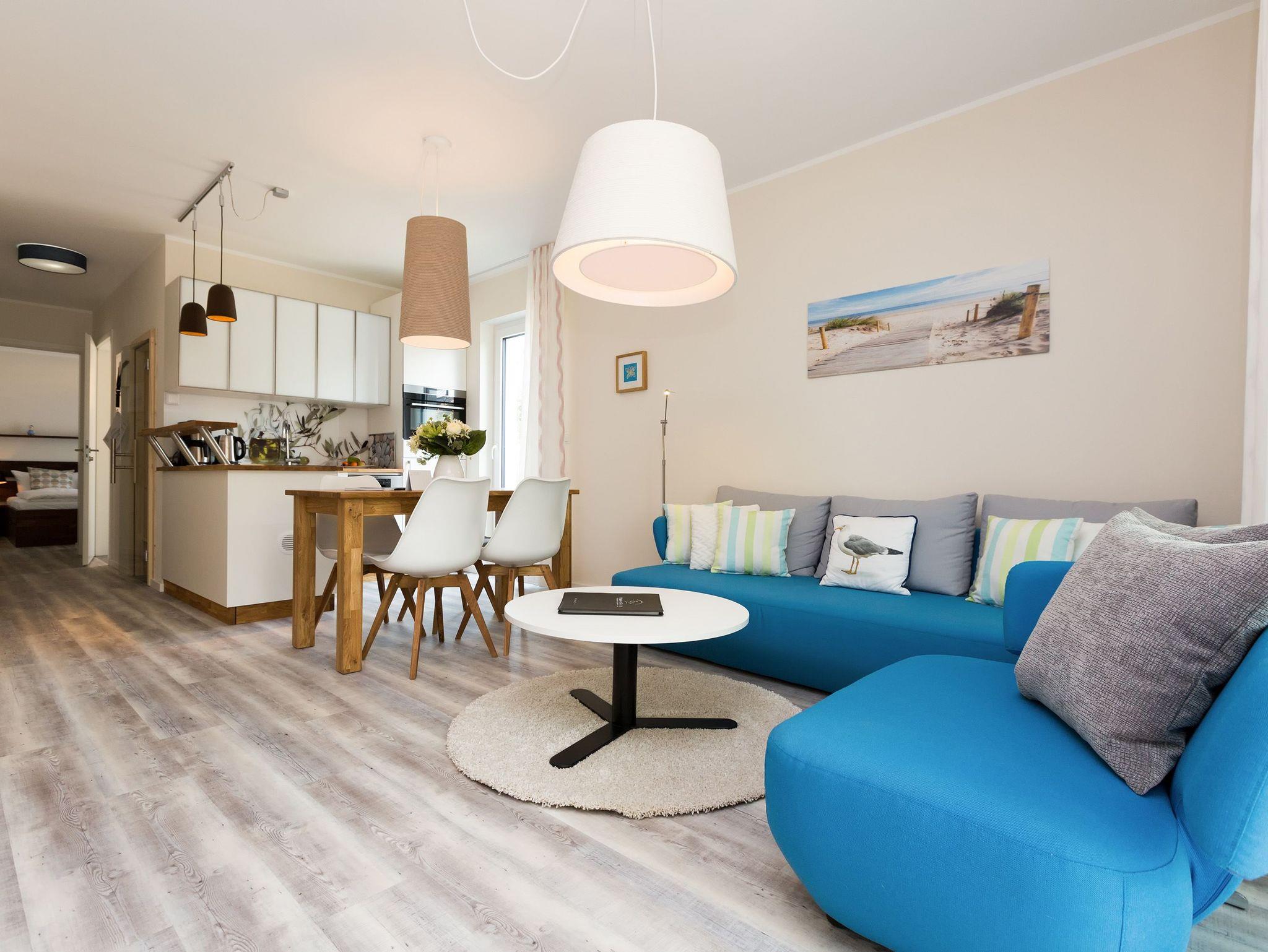 Urlaubsfeeling zum Wohlfühlen. Unsere neue 3-Raum-Ferienwohnung (62 qm) im 1.Obergeschoss der Dünenresidenz empfängt Sie mit hellen Farben und liebevollen Dekorationen. Wertige Einbauten aus Eiche [&] Akazie und eine gelungene Raumaufteilung schaffen hier ein schönes Urlaubziel für 4 Personen und ein Kleinkind bis 3 Jahre (als Aufbettung im Babyreisebett). Schon beim Eintreten offeriert sich der helle Wohnbereich, ausgestattet mit einer modernen Sitzgruppe und Flat-TV. Die angrenzende, offene Küche mit Essplatz fügt sich harmonisch ein und ist natürlich komplett ausgestattet. Zwei Schlafzimmer mit jeweils eigenem Bad bieten einen idealen Rückzugsort. Das erste Schlafzimmer verfügt über ein komfortables Doppelbett mit Bettkasten (1,80m x 2,00m) und Flat-TV, ein kleines Duschbad und Zugang zum Balkon. Das zweite Schlafzimmer wartet mit einem bequemen Doppelbett (1,60m x 2,00m) und Flat-TV auf, angrenzend gibt es hier ein Bad mit Dusche und WC. Klein aber fein, die wohnungseigene Sauna bietet nicht nur in der kalten Jahreszeit eine erholsame Abwechslung. Die Usedomer Sonne und das Meeresrauschen genießen Sie schon beim Frühstück auf dem Ostbalkon, ausgestattet mit Gartenmöbeln. Hier kann man bei ein bisschen Meerblick wunderbar Relaxen. Für Ihren Komfort sind die Betten bei der Anreise bezogen und Handtücher liegen bereit. Ein Pkw-Stellplatz steht in der Tiefgarage zur Verfügung (max. Einfahrtshöhe 1,85 m). Das Wlan-Netz kann kostenlos genutzt werden.