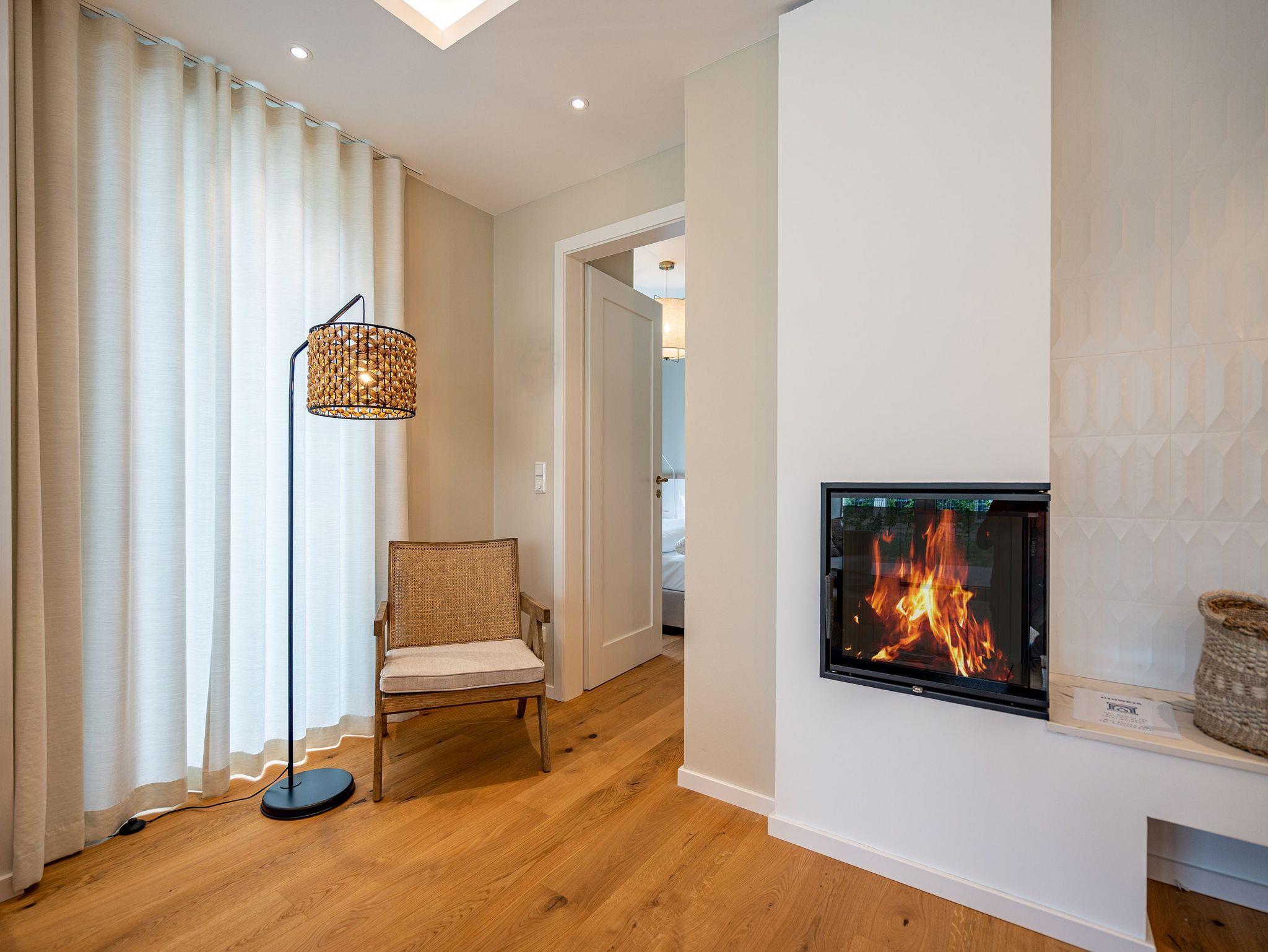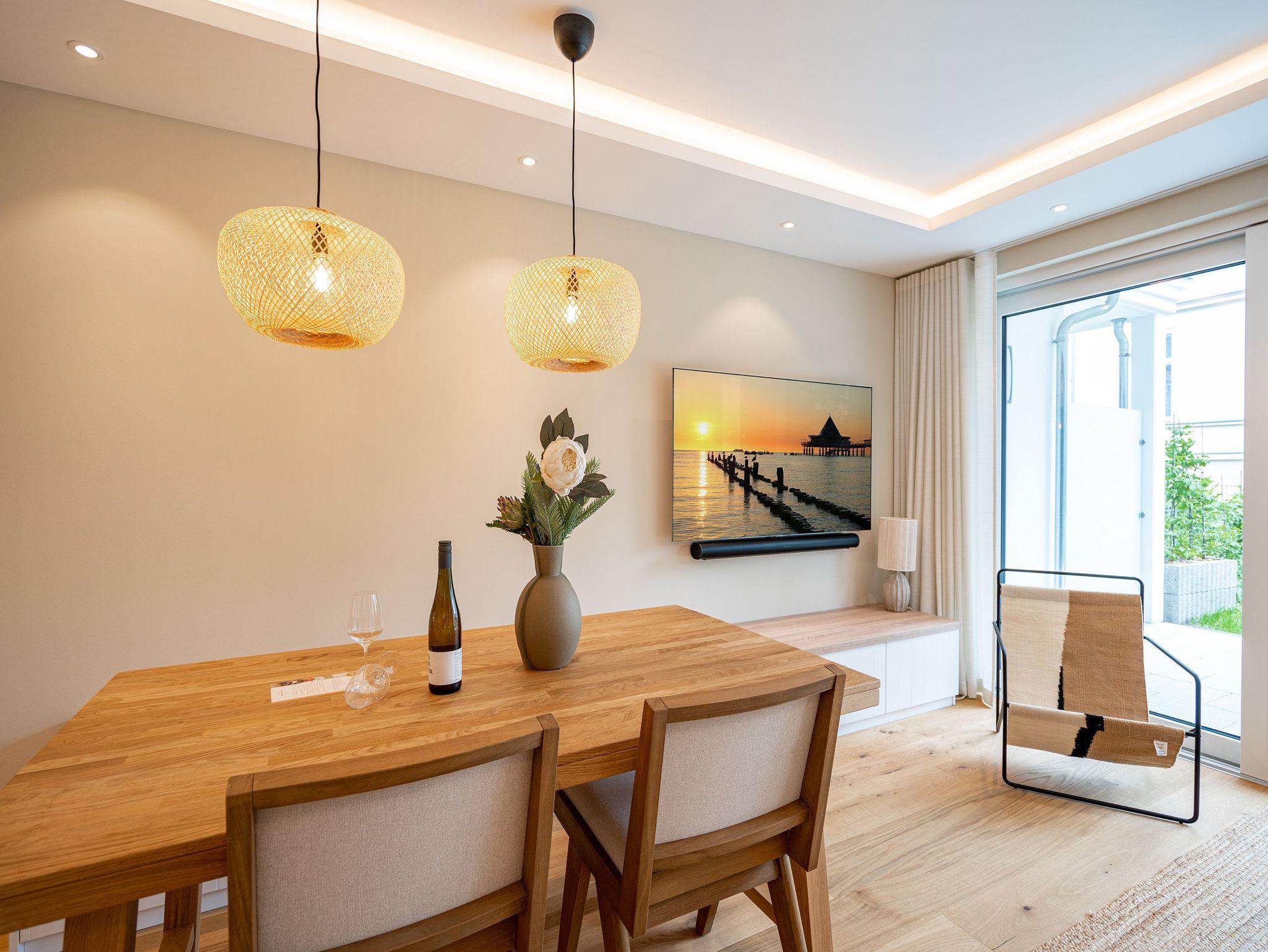 Nordisch nobel beginnt Ihr Usedomurlaub im Appartement 01 im Quartier am Strand in Seebad Heringsdorf. Viel Licht, helle Naturtöne und Möbel mit Korbelementen begrüßen Sie in dem 87 Quadratmeter großen Appartement und sorgen direkt beim Betreten für Urlaubsfeeling. In dem geräumigen 3-Raum-Appartement im Erdgeschoss können sich bis zu 4 Erwachsene auf eine erholsame Zeit auf der Insel Usedom freuen. Als zweites Haus am Platz, direkt hinter der Strandpromenade gelegen, sind Sie der Ostsee nicht nur ganz nahe, Sie können Sie auch bei geöffnetem Terrassenfenster und der richtigen Windrichtung von Ihrer 6 Quadratmeter großen Nord-Terrasse oder der 9 Quadratmeter großen Süd-Terrasse vom Wohnzimmer aus hören. Der offene Wohn-Essbereich lädt außerdem zum Entspannen nach einem ausgiebigen Strandtag ein. Machen Sie es sich auf der bequemen Sofalandschaft gemütlich und genießen Sie das TV-Programm auf dem 65-Zoll großen Flat-TV. An kühleren Tagen sorgt der Kamin für wohlige Wärme im Innenbereich. Der Essbereich für bis zu 4 Personen bietet ausreichend Platz zum Genießen Ihrer Speisen, die Sie in der voll ausgestatteten Küche zubereiten können. Hier befindet sich neben einem Backofen mit Mikrowellenfunktion und einem Induktionskochfeld eine Spülmaschine, ein Kühlschrank mit Gefrierfach sowie diverse Kleinküchengeräte. Auf Ihren erholsamen Schlaf müssen Sie auch im Urlaub nicht verzichten. Die beiden Schlafzimmer sind mit bequemen Boxspringbetten ausgestattet (1,80m x 2,00m). Ein luxuriöses Badezimmer (innenliegend) mit Doppelwaschtisch und WC grenzt an eines der beiden Schlafzimmer an. Ein weiteres Badezimmer mit Doppelwaschtisch, WC und Dusche verfügt außerdem über eine Finnische Sauna, die Platz für 2-3 Personen bietet. Ein PKW-Stellplatz (mit Wallbox gegen Gebühr) in der hauseigenen Tiefgarage zählt ebenso zu den Annehmlichkeiten dieses Appartements wie kostenfreies W-Lan. Bei Ihrer Anreise sind die Betten bereits bezogen und Handtücher liegen für Sie bereit.