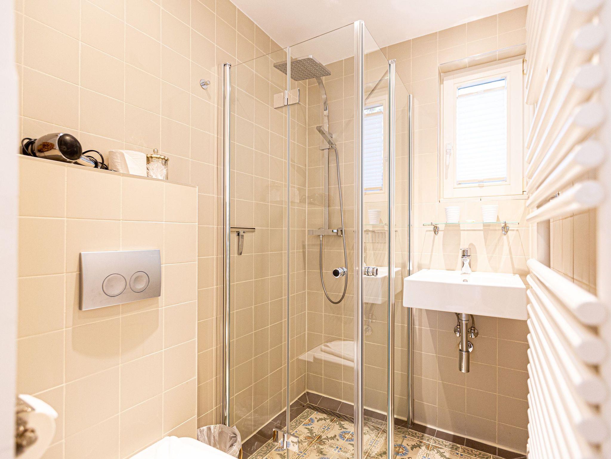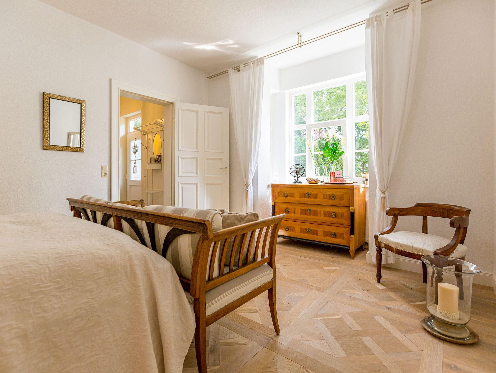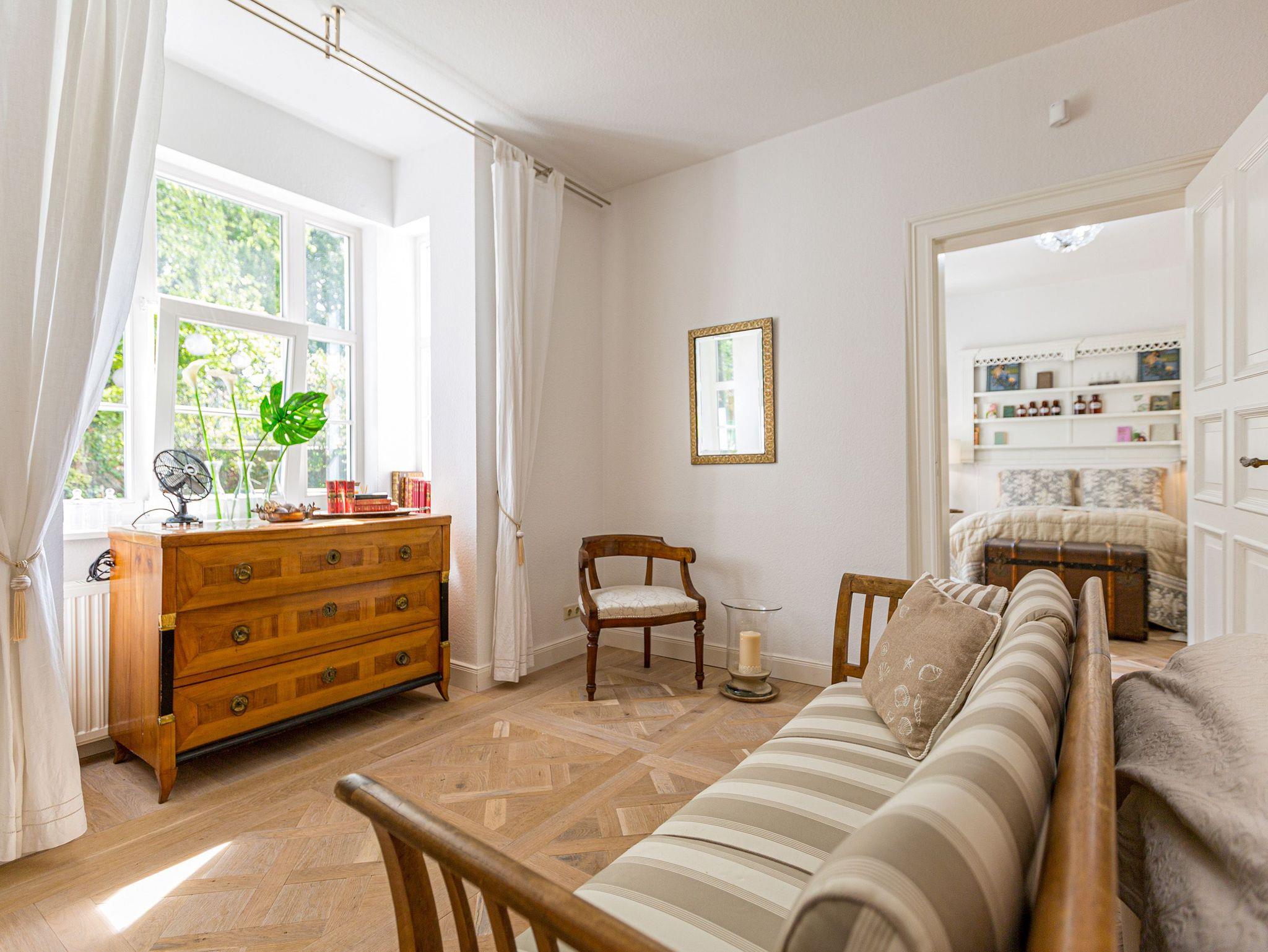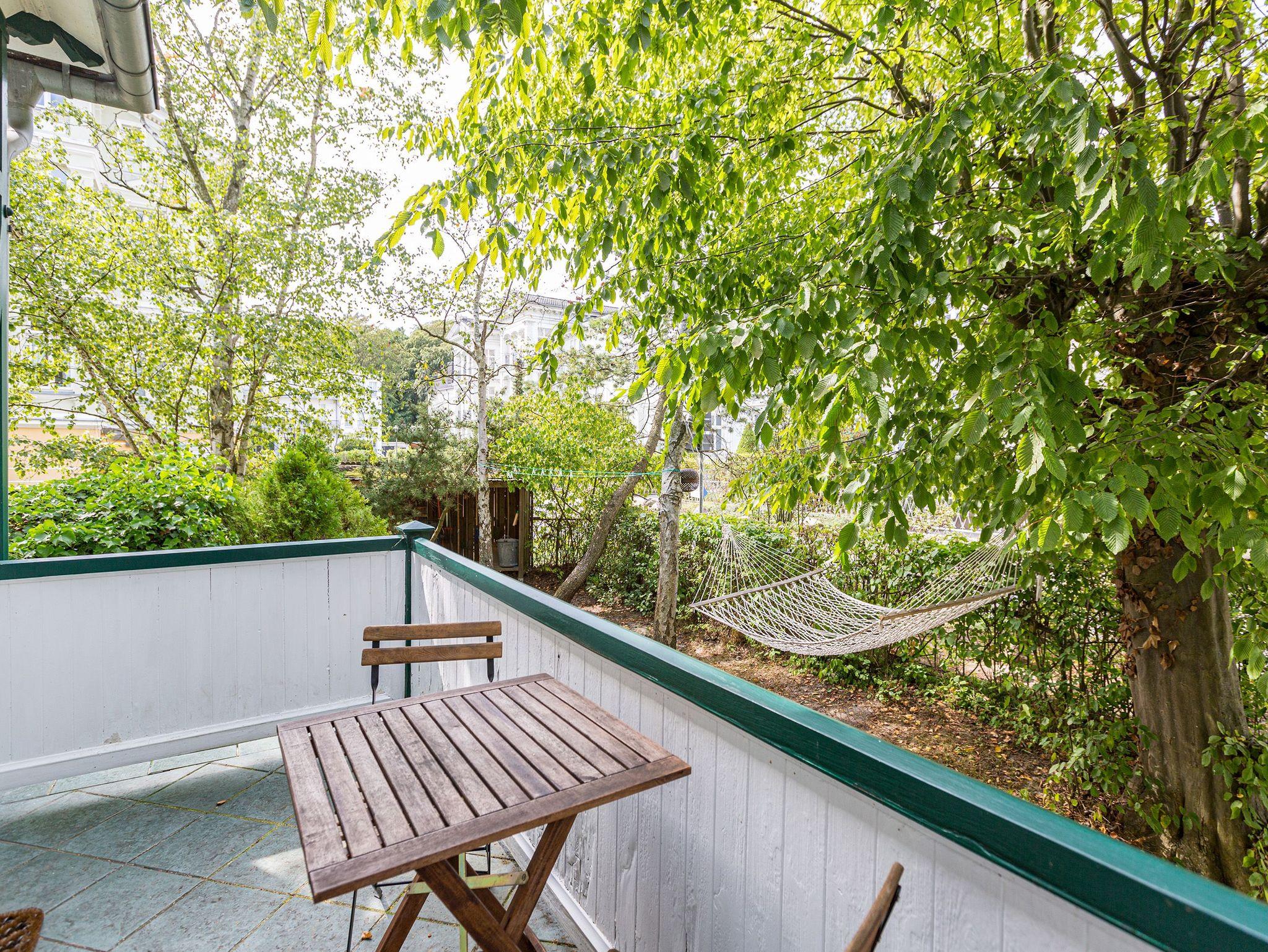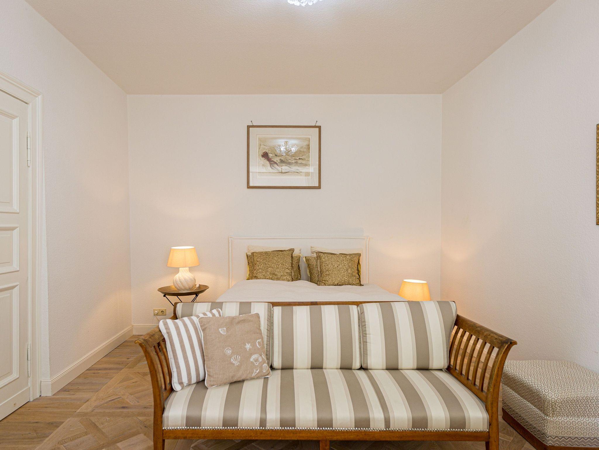 Wohnen in einem kleinen Schlösschen ganz dicht am Meer - das können Sie im idyllischen Strandschlösschen mit seinen 3 Schlafzimmern ideal. Das rundum sanierte Schmuckstück der Bäderarchitektur aus Holz vom Ende des 19. Jahrhunderts bietet über drei Etagen viel Platz für bis zu 6 Personen und zwei Kleinkinder * bis zwei Jahre (im Kinderreisebett). Die Haustür auf der Gartenetage öffnet sich und Sie werden sich fühlen wie in eine andere Zeit versetzt. Alles genügt natürlich mondernstem Wohnkomfort. Und dennoch ist es, als wandle man durch die Räume einer längst vergangenen und luxuriös glamourösen Epoche. Tauchen Sie ein in dieses „Zur Sommerfrische an die Ostsee - Urlaubsgefühl“. Auf dieser unteren Etage finden Sie die beiden charmanten Schlafzimmer, die mit Doppelbetten (1,60 m breit) ausgestattet sind. Das hintere Schlafzimmer (1x Durchgangszimmer) verfügt über einen Zugang zur Terrasse. Kommoden und ein geräumiger Einbauschrank auf dem Flur bieten hier Stauraum. Ein kleines Gäste-WC und ein außergewöhnliches Bad mit verspiegelter Wand, Glasdusche und traumhafter Löwenfuß-Badewanne ergänzen das untere Geschoss. Über eine schöne Holztreppe gelangt man in die mittlere Etage. Das wundervoll aufgearbeitete Parkett verleiht dieser Etage ein exklusives und warmes Flair. Nur die separate Küche ist mit einem alten Kachelboden versehenen und mit hochwertigen Markengeräten voll ausgestattet. In den großen, amerikanischen Kühlschrank von Smeg passt viel hinein, was den Magen erfreut. Auch sonst finden Sie dort alles, was zum Kochen und Speisen benötigt wird. Ganz besonders schön ist hier der kleine hölzerne Balkon zur Ostseite. Auf der kleinen Bank genießt man in Ruhe den ersten Kaffee. Gleich nebenan befindet sich das wunderschöne Esszimmer mit antikem Esstisch und einem eleganten, antiken Kachelofen. Das angrenzende Wohnzimmer, das mit seinen vielen Bücherregalen und der Sitzgruppe wie ein Salon aus Kaisers Zeiten anmutet, ist ein absoluter Ruhepol. Ein Flat TV mit DVD Player wurde hier gekonnt im Schrank versteckt. Vom kleinen Balkon mit Sitzmöbeln schaut man auf den umgebenden Garten mit Hängematte. Über eine kleine Veranda führt eine zweite Haustür direkt auf den Weg zum Strand. Ganz nach oben gelangt man über eine enge, steile Holztreppe. Aber der Aufstieg lohnt sich, denn direkt unter dem Dach mit offener und reich verzierter Balkendecke befindet sich ein kleines Studio mit zwei Einzelbetten. Der weiße, stylische Barcelona-Chair mit dazugehörigem Hocker ist eine kleine Ruhe Oase. Ein angrenzendes Bad mit Dusche und WC komplettiert diese Etage. Bei Anreise sind die Betten bereits bezogen und Handtücher liegen bereit. Zwei Außenstellplätze befinden sich am Haus. Das einzige, was Sie nun noch tun müssen, ist anzukommen und sich wohlzufühlen.
