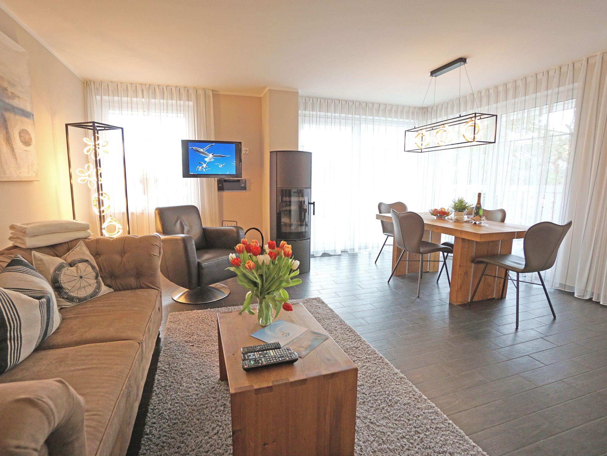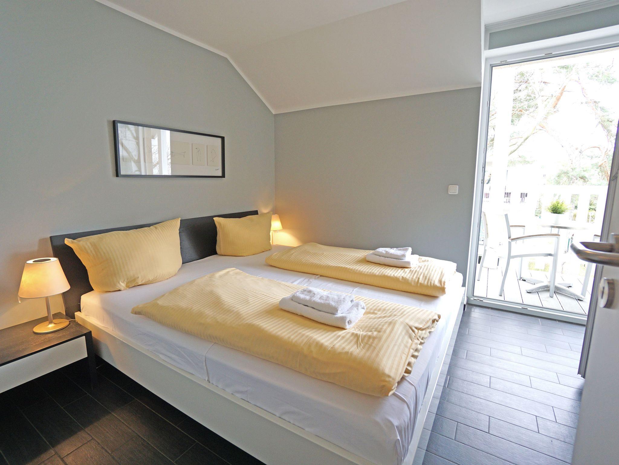 Die stylisch und modern eingerichtete Ferienwohnung ist ein wunderbarer Rückzugsort für maximal 4 Personen. Der feine Ostseestrand ist nur 20 Meter entfernt. Die Wohnung 8 im Dünendomizil im 2. OG mit seinen großzügigen 70 Quadratmetern ist aufgeteilt auf drei Zimmer und zwei Bäder. Das Wohnzimmer, ausgestattet mit einer komfortablen Sitzgruppe und einem Kaminofen, hat durch seine bodentiefen Fenster direkten Zugang zu einem von zwei schönen, großen Balkonen. Die Küche ist vollausgestattet. Die beiden Schlafzimmer verfügen über hochwertige Doppelbetten (180cmx200cm). Eines der beiden Schlafzimmer verfügt zusätzlich über einen Fernseher. Die Bäder besitzen jeweils eine Dusche, einen modernen Waschtisch und ein WC. Ein Pkw-Stellplatz ist für Sie reserviert. Die Betten sind bezogen. Der WLAN-Anschluss ist kostenfrei nutzbar.