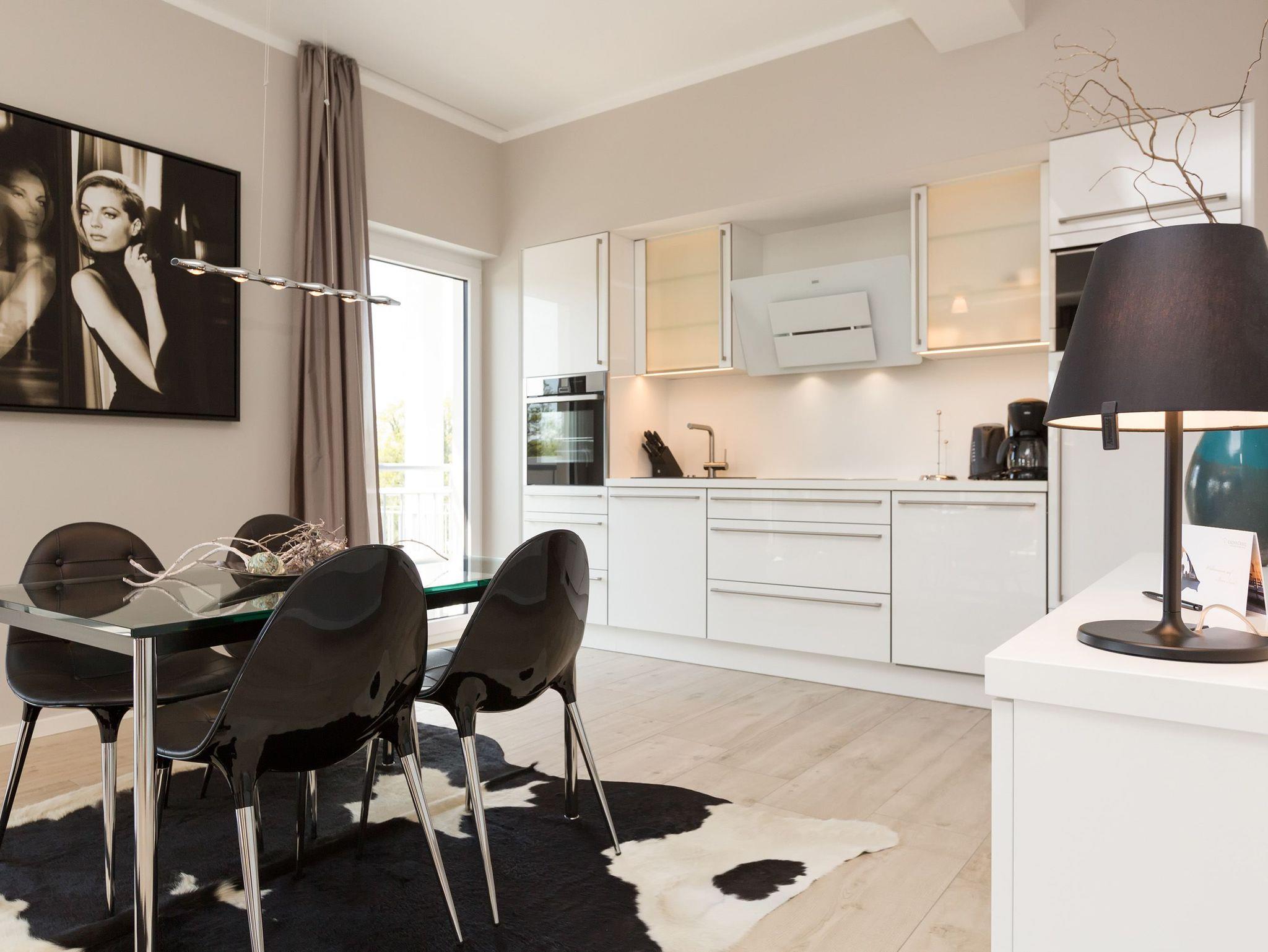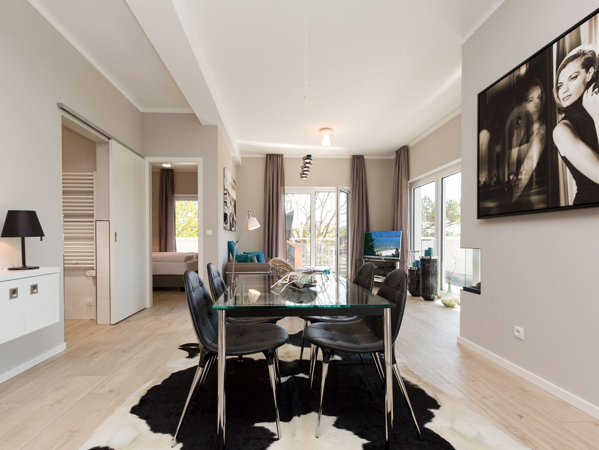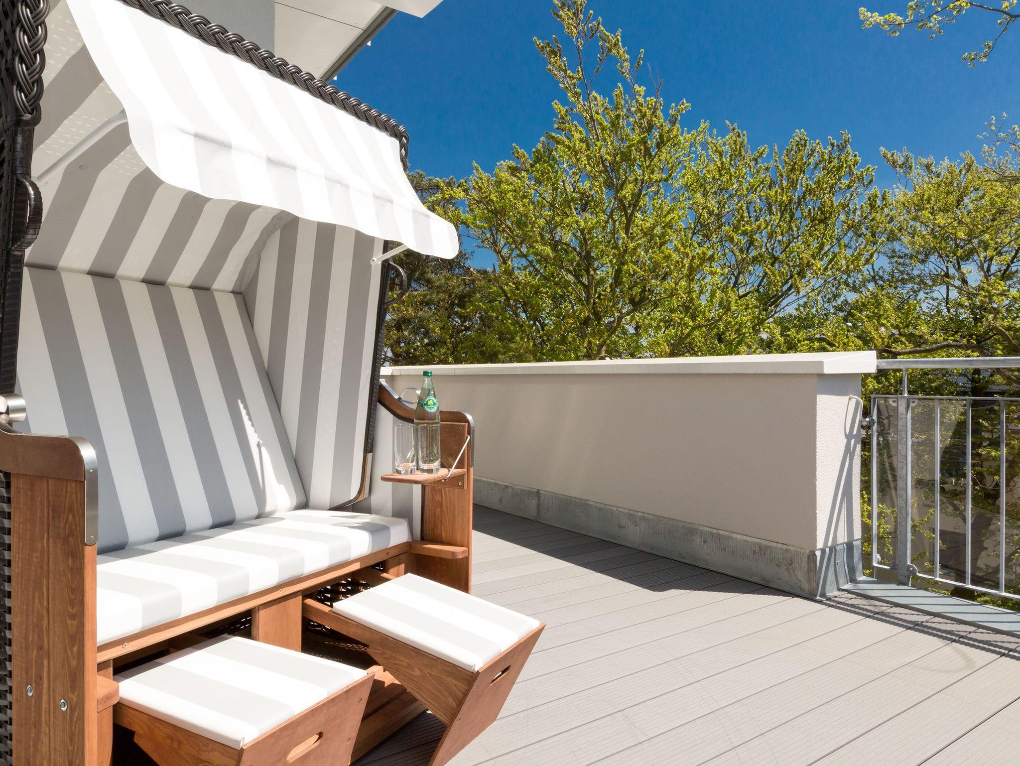 Design at it´s best! Im Appartement 21 genießen Sie Ihren Urlaub auf hohem Niveau. In dieser lichtdurchfluteten, luxuriösen 2-Raum-Ferienwohnung (64 qm) verstehen sich stylische Wohnelemente und wertiges Design von selbst. Abgestimmte Farben und Stoffe, ausgewählte Designermöbel von Cassina und die wunderschönen Fotocollagen sorgen für ein harmonisches Wohnerlebnis für 2 Personen und ein Kleinkind (im Babyreisebett). Der Eingangsbereich mit Garderobe öffnet sich und die offene, komplett ausgestattete Küche schließt sich an. Hier ist alles vorhanden, was ein Hobbykoch sich wünscht. Der schöne Essplatz ist der Mittelpunkt der Wohnung, hier lässt es sich besonders schön zusammen sitzen. Der Wohnbereich mit stylischer Couch und Flat-TV, Blue-Ray-Player und eine Hifi-Anlage mit ipod-Dock lädt zum Relaxen ein. Der moderne Elektrokamin schafft per Knopfdruck den perfekten Rahmen für einen kuschligen Abend. Das Schlafzimmer mit exklusivem Treca interiors Paris Doppelboxspringbett (1,80 x 2,00m), Flat-TV und wertigem Einbauschrank und ein Bad mit großer Dusche und WC ergänzt die Wohnung. Ein besonderes Highlight ihres Urlaubsdomizils ist die großzügige Ost-Süd-Dachterrasse. Mit Gartenmöbeln und gemütlichem Strandkorb ausgestattet, bietet sie schöne Ausblicke auf die Umgebung der Maxim-Gorki-Straße. Auch die Ostsee schimmert durch die Kiefern der Dünen. Erholung garantiert. Für Ihren Komfort sind die Betten bei der Anreise bezogen und Handtücher liegen bereit. Für kleine Gäste kann ein Kinderreisebett und ein Kinderhochstuhl (gegen Gebühr) bestellt werden. Ein Pkw-Stellplatz steht in der Tiefgarage zur Verfügung (max. Einfahrtshöhe 1,85 m).