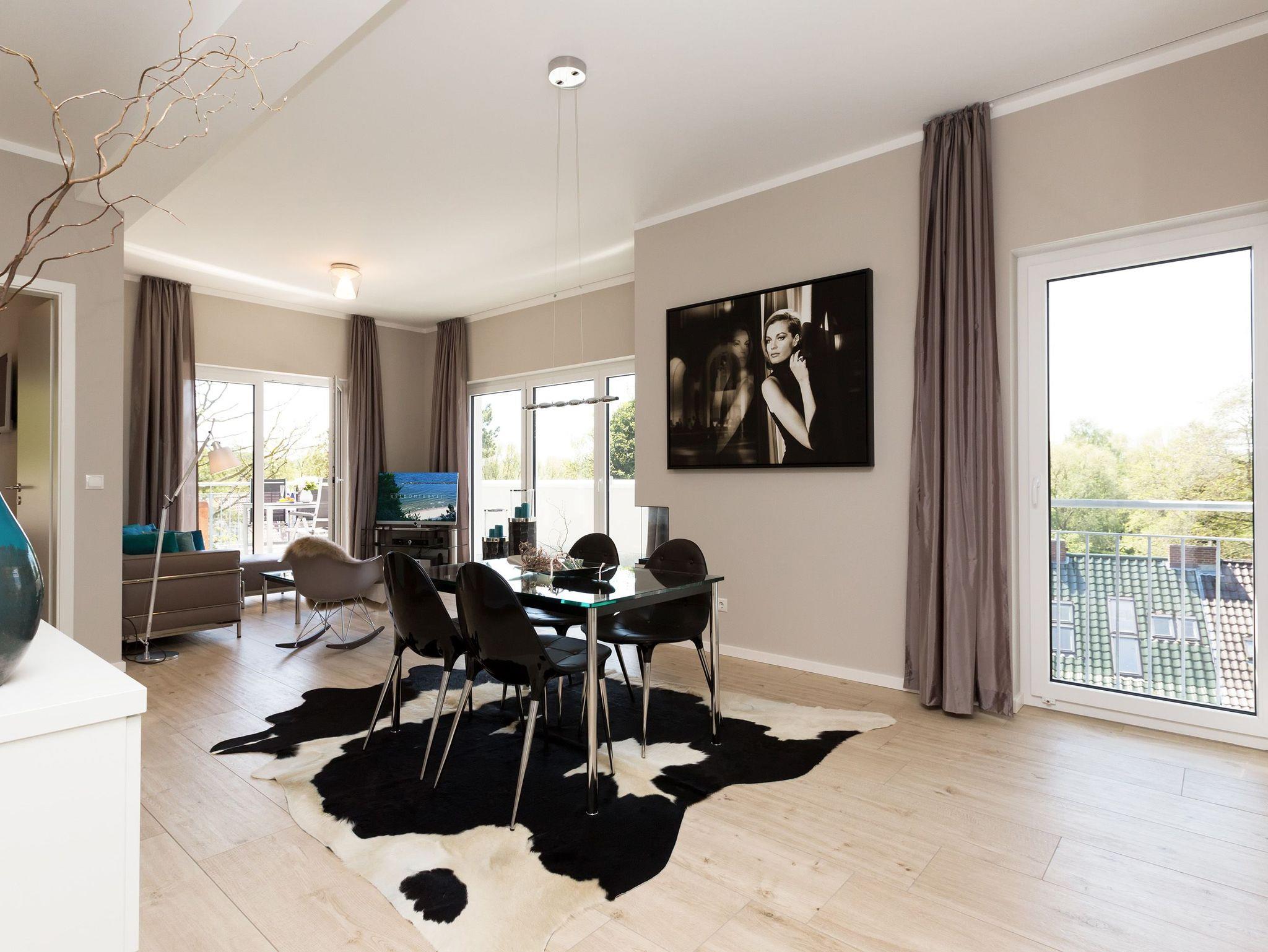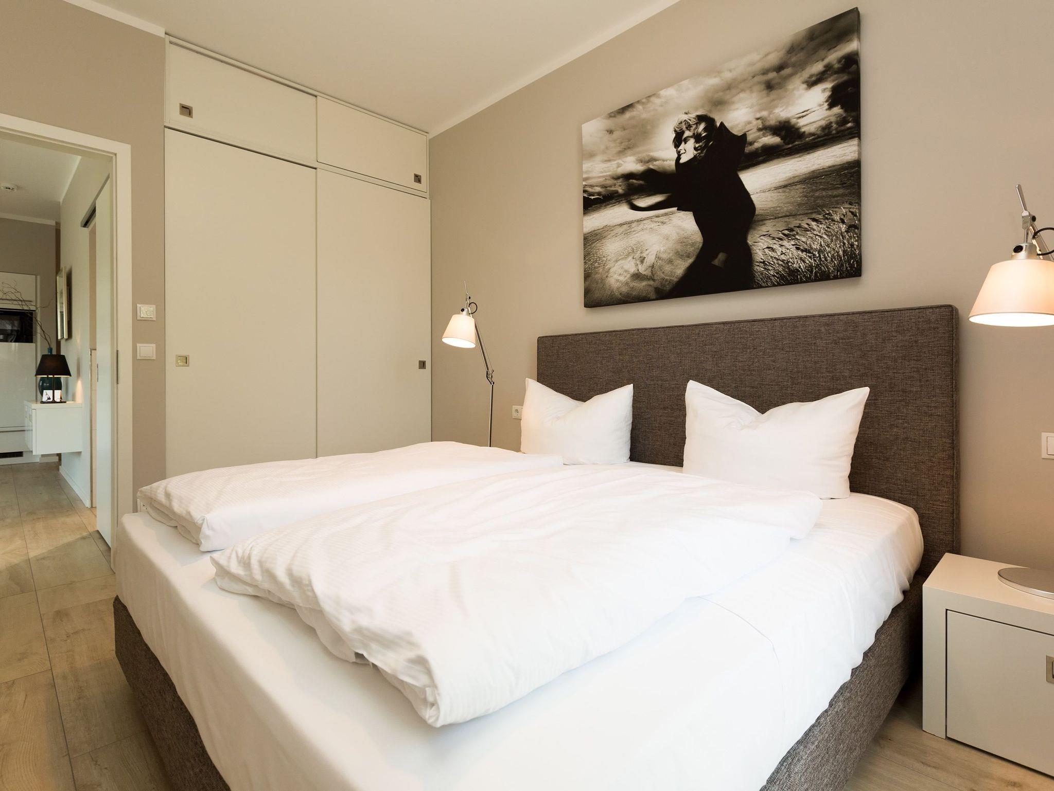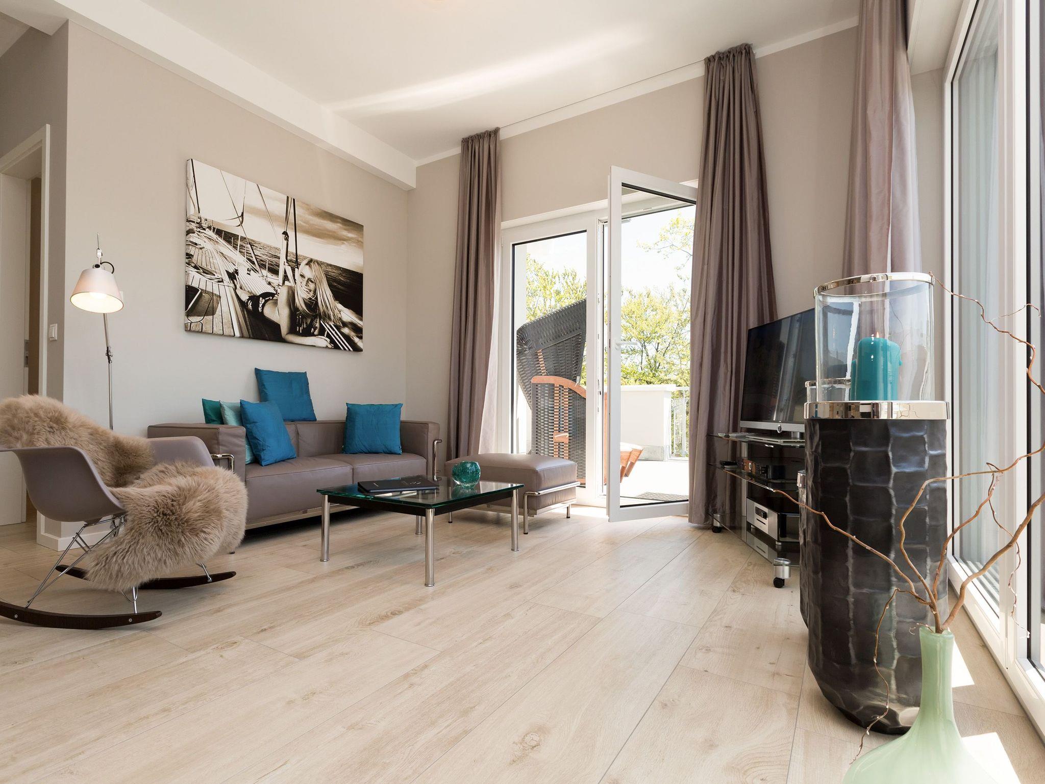 Design at it´s best! Im Appartement 21 genießen Sie Ihren Urlaub auf hohem Niveau. In dieser lichtdurchfluteten, luxuriösen 2-Raum-Ferienwohnung (64 qm) verstehen sich stylische Wohnelemente und wertiges Design von selbst. Abgestimmte Farben und Stoffe, ausgewählte Designermöbel von Cassina und die wunderschönen Fotocollagen sorgen für ein harmonisches Wohnerlebnis für 2 Personen und ein Kleinkind (im Babyreisebett). Der Eingangsbereich mit Garderobe öffnet sich und die offene, komplett ausgestattete Küche schließt sich an. Hier ist alles vorhanden, was ein Hobbykoch sich wünscht. Der schöne Essplatz ist der Mittelpunkt der Wohnung, hier lässt es sich besonders schön zusammen sitzen. Der Wohnbereich mit stylischer Couch und Flat-TV, Blue-Ray-Player und eine Hifi-Anlage mit ipod-Dock lädt zum Relaxen ein. Der moderne Elektrokamin schafft per Knopfdruck den perfekten Rahmen für einen kuschligen Abend. Das Schlafzimmer mit exklusivem Treca interiors Paris Doppelboxspringbett (1,80 x 2,00m), Flat-TV und wertigem Einbauschrank und ein Bad mit großer Dusche und WC ergänzt die Wohnung. Ein besonderes Highlight ihres Urlaubsdomizils ist die großzügige Ost-Süd-Dachterrasse. Mit Gartenmöbeln und gemütlichem Strandkorb ausgestattet, bietet sie schöne Ausblicke auf die Umgebung der Maxim-Gorki-Straße. Auch die Ostsee schimmert durch die Kiefern der Dünen. Erholung garantiert. Für Ihren Komfort sind die Betten bei der Anreise bezogen und Handtücher liegen bereit. Für kleine Gäste kann ein Kinderreisebett und ein Kinderhochstuhl (gegen Gebühr) bestellt werden. Ein Pkw-Stellplatz steht in der Tiefgarage zur Verfügung (max. Einfahrtshöhe 1,85 m).