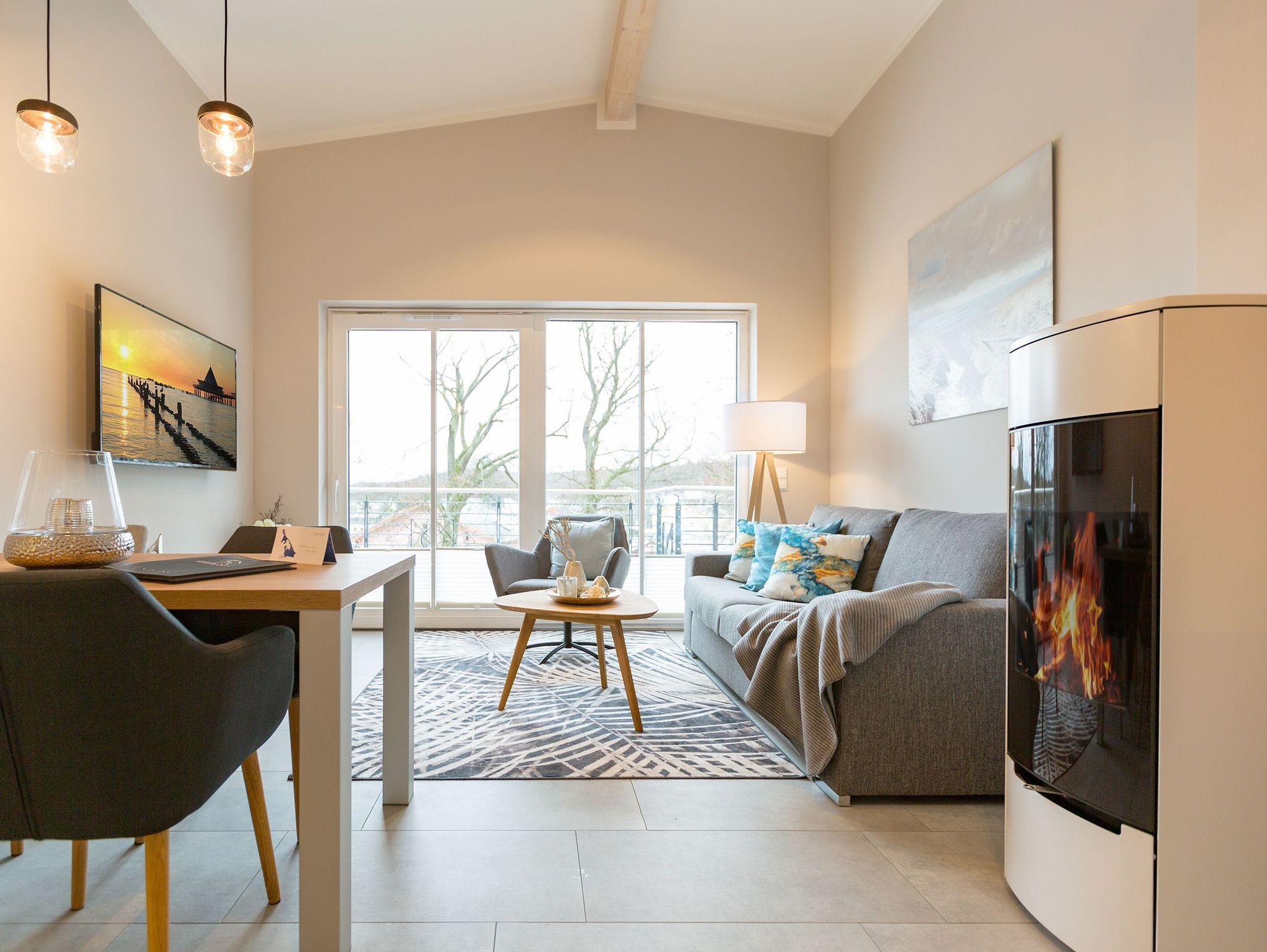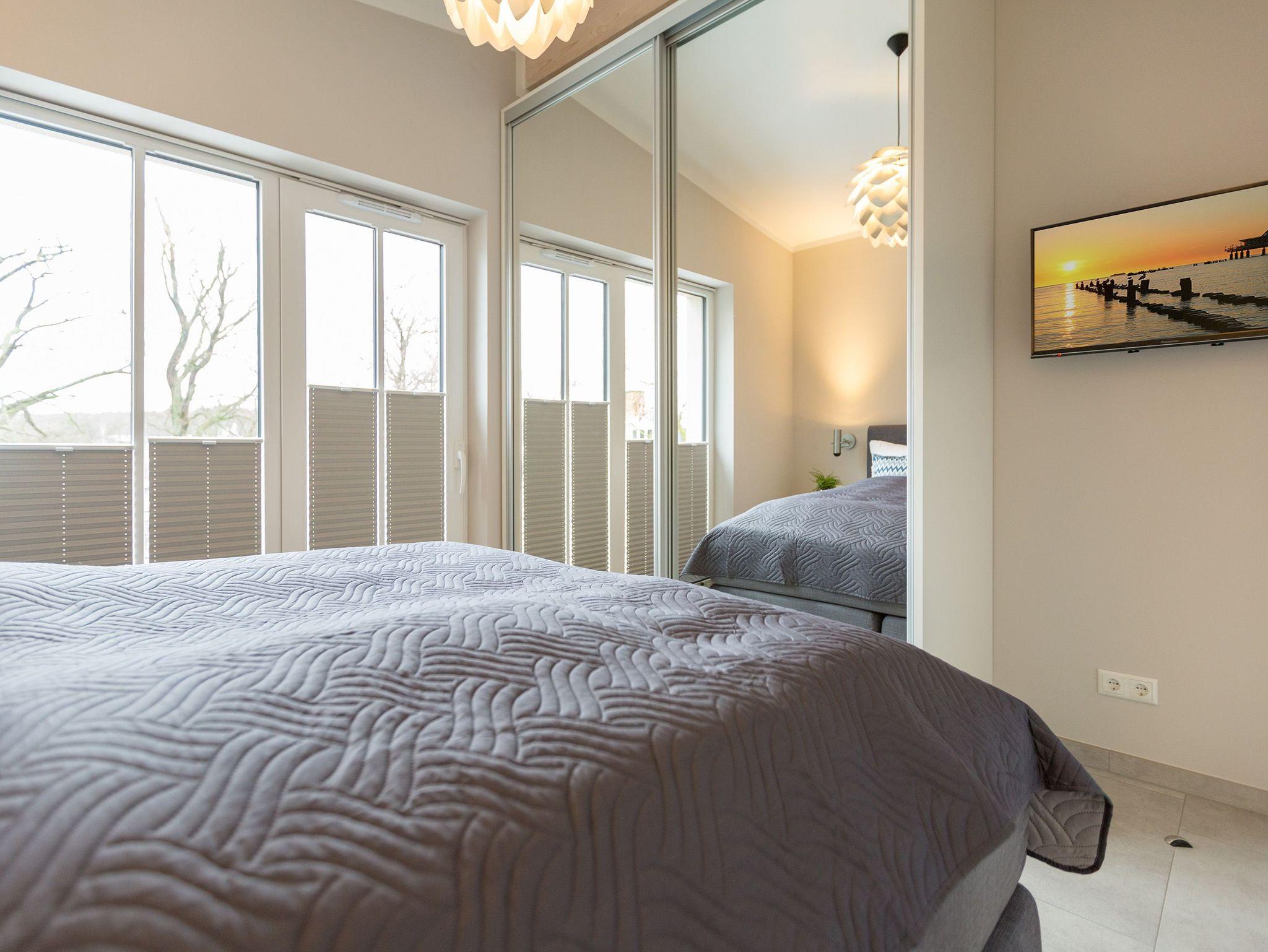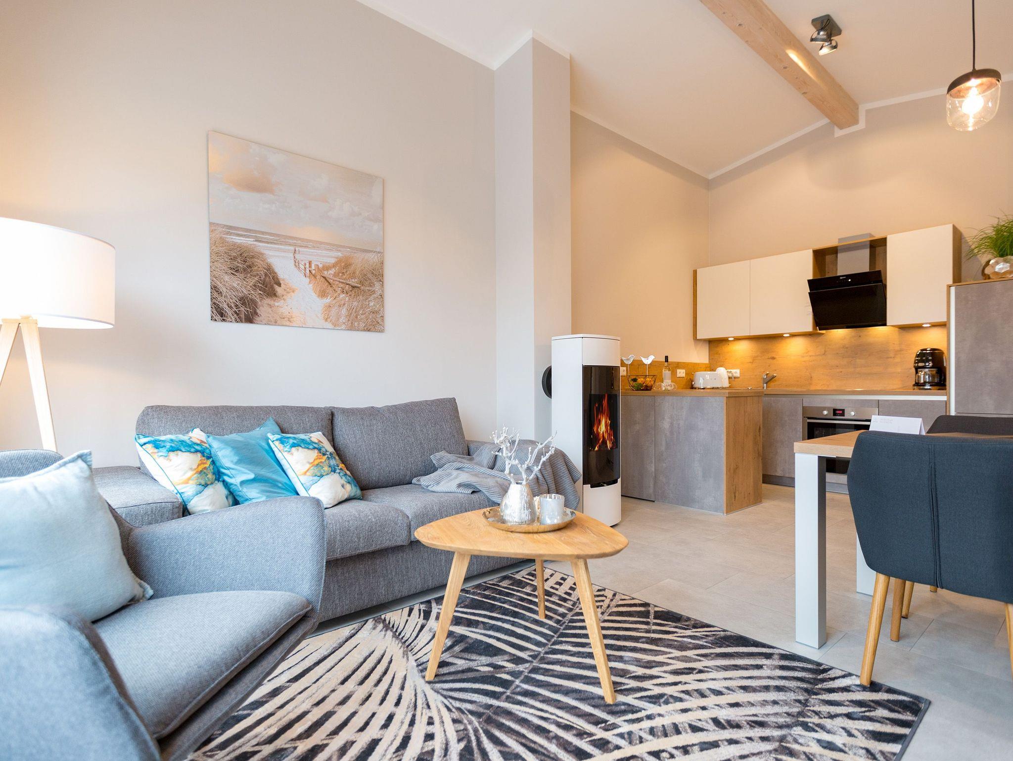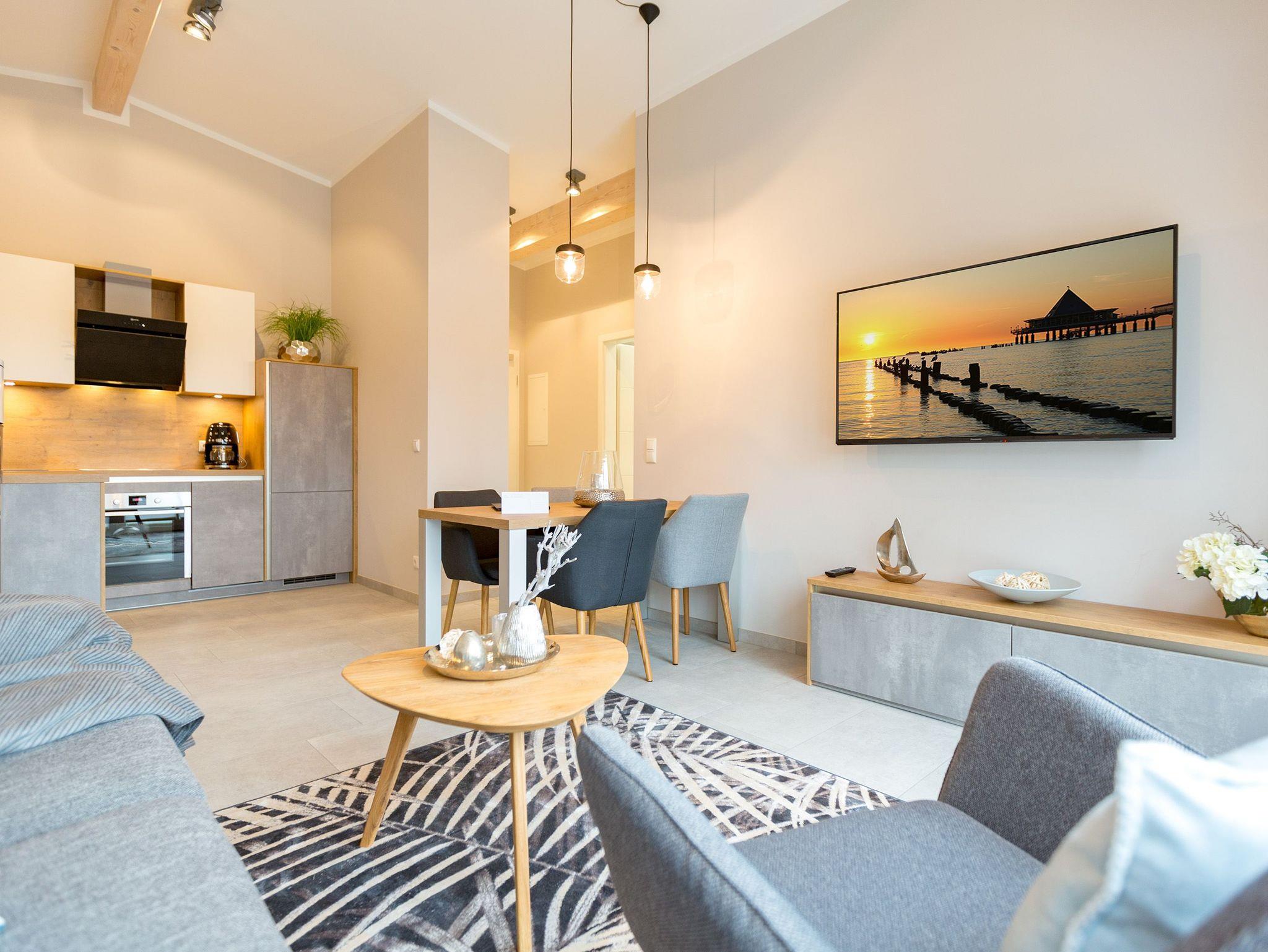 Eine schöne Dachgeschosswohnung (51 Quadratmeter) wartet im 2. Stock nur darauf, Sie in den Urlaubshimmel zu befördern. Zwei Erwachsene finden in den zwei Zimmern den idealen Ort für viel Zeit zu zweit. Durch die 1,40 m breite Schlafcouch im Wohnzimmer besteht die Möglichkeit der Aufbettung für eine Person. Ansonsten lässt es sich auf dem Sofa mit Blick auf den Flat-TV wunderbar entspannen. Über sich die hohen Decken des Daches. Um sich herum erlesene und ausgesuchte Designmöbel, die dem ganzen Appartement ein stylisches Flair geben. Die voll ausgestattete und offene Wohnküche ist mit hochwertigen Markengeräten wie Geschirrspüler, Induktionsherd, Wasch-Trockner, Kühlschrank mit Gefrierfach und Kaffeemaschine bestückt. Ein schöner Essplatz vor dem Kaminofen lädt zu romantischen Essen ein. Vom Wohnzimmer geht?s durch die bodentiefen Fenster auf die riesige umlaufende Terrasse (ca.13 Quadratmeter groß) mit Südost-Ausrichtung hinaus. Lassen Sie sich hier die frische Ostseeluft um die Nase wehen und genießen Sie ein ausgiebiges Sonnenbad oder Ihr Frühstück unter freiem Himmel. Auch vom Schlafzimmer aus können Sie auf die Terrasse hinaustreten. Das komfortable Boxspringdoppelbett (1,80 m x 2,00 m) sorgt für einen erholsamen Schlaf und wunderbare Urlaubsträume. Im Spiegelschrank finden Sie viel Platz für Ihre Garderobe. Auch hier befindet sich ein Flat-TV. Das Bad hat Tageslicht, eine geräumige Dusche, ein Waschbecken mit großem Spiegel und ein WC. Außerdem wartet es mit einer ganz besonderen Urlaubsüberraschung auf, die Sie mächtig ins Schwitzen bringen wird. Entspannen Sie in der eigenen, kleinen Finnischen Sauna. Handtücher müssen Sie nicht mitbringen. Die Betten sind frisch bezogen. In der Tiefgarage ist für Sie ein Parkplatz reserviert.