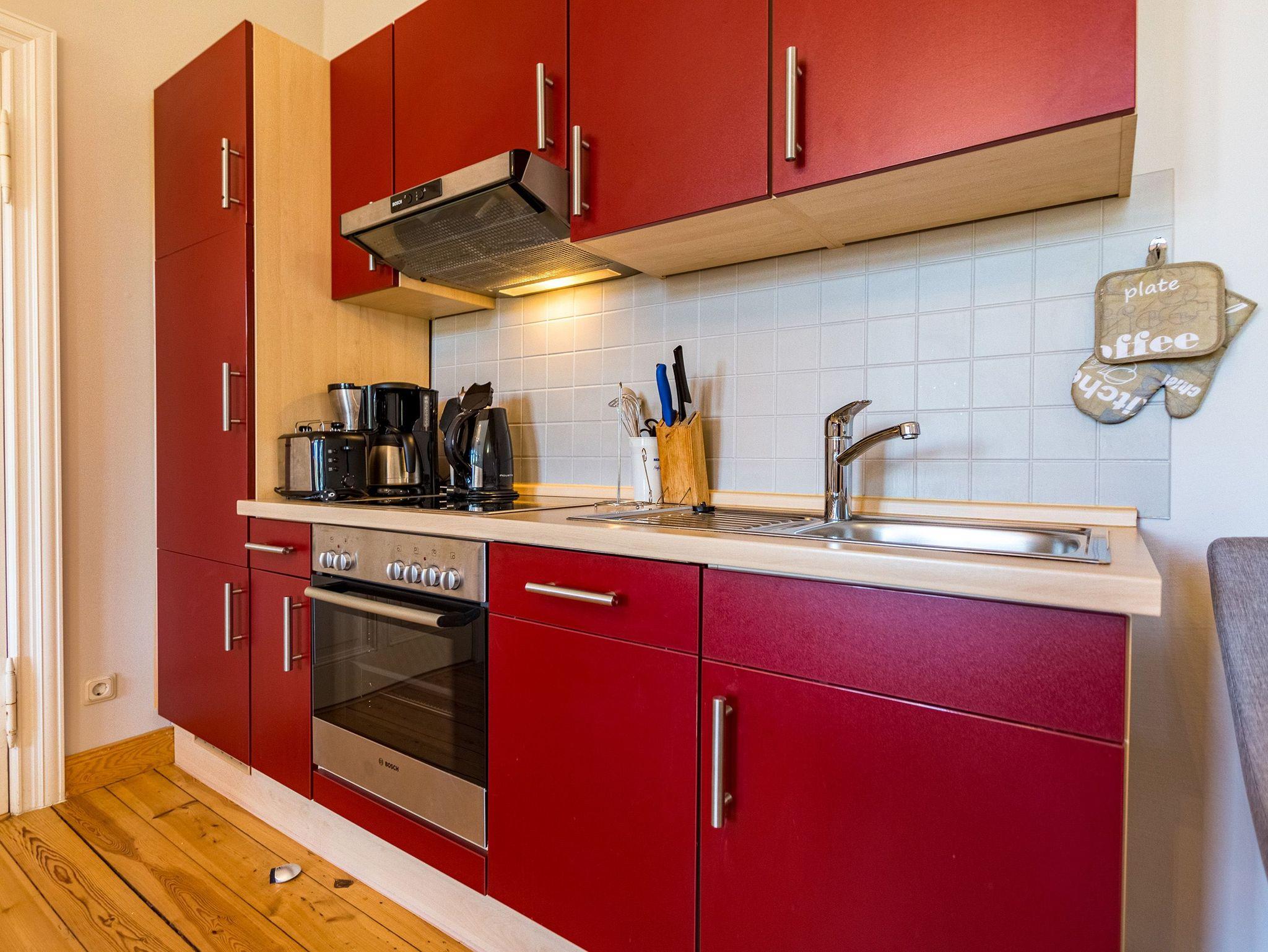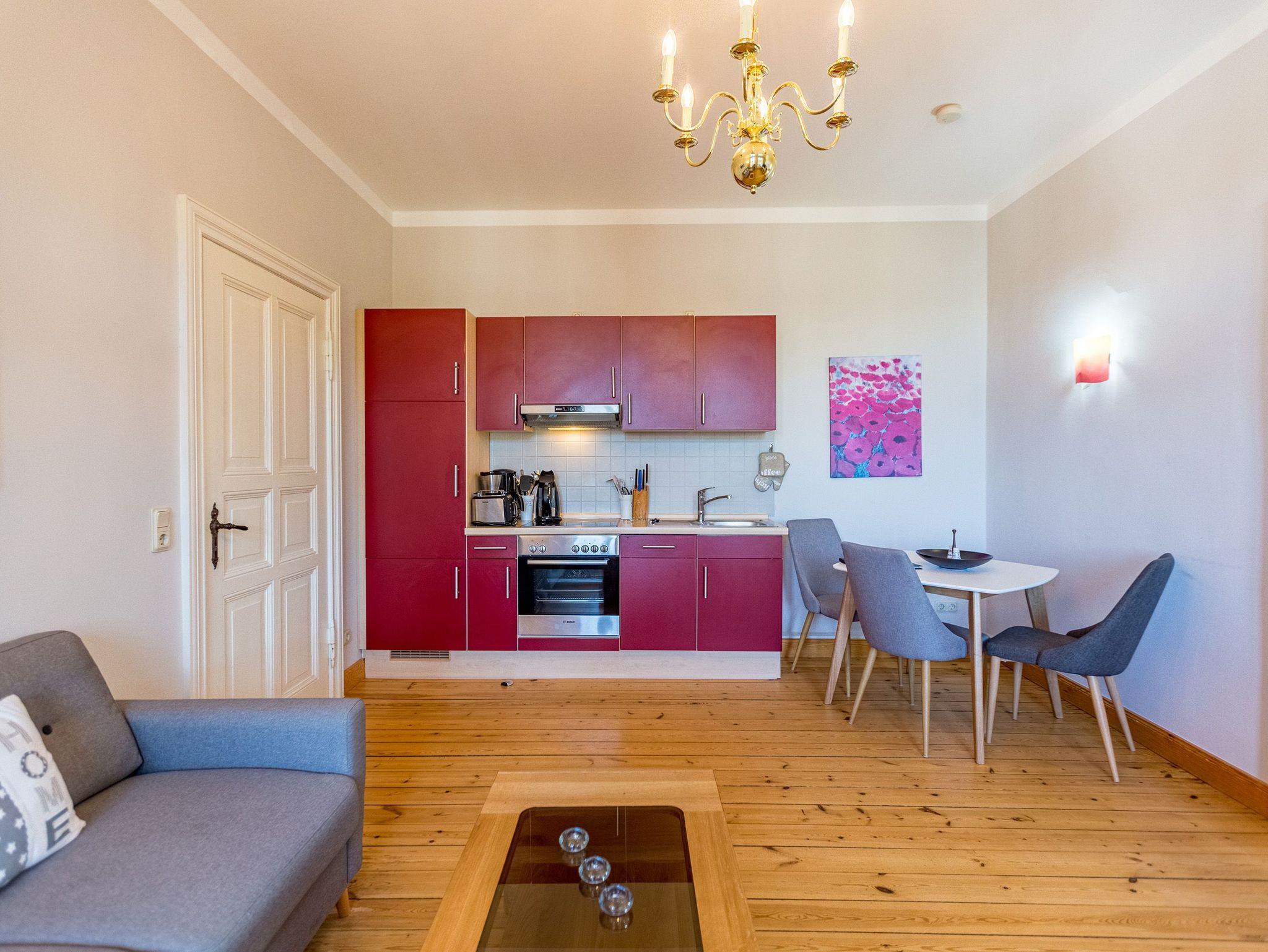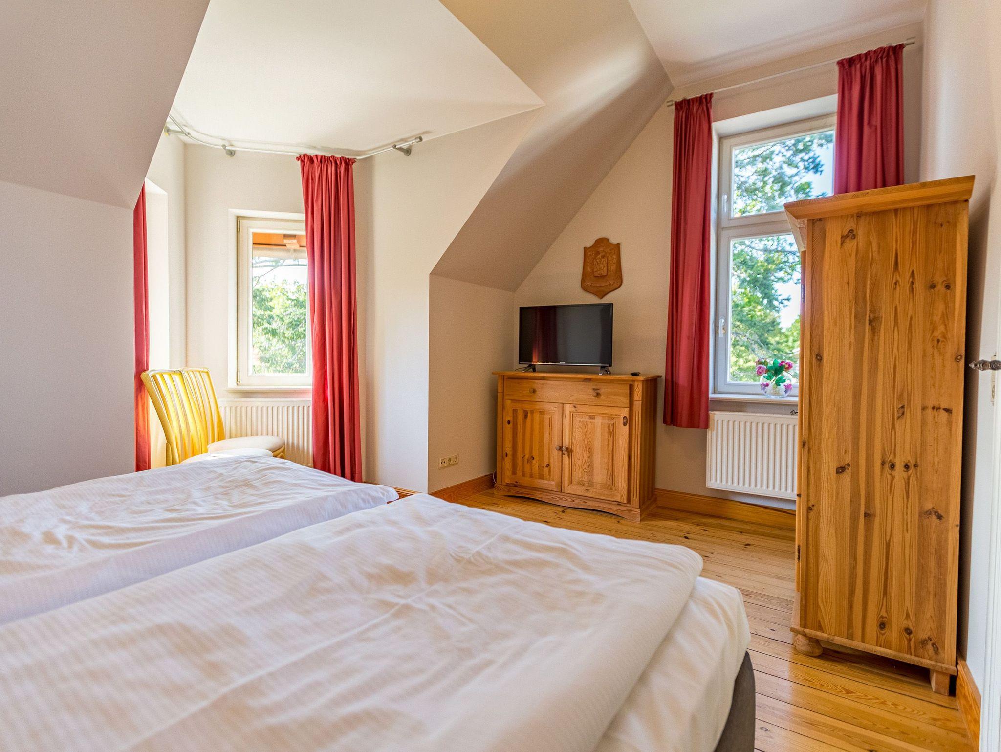 Die helle, freundliche Ferienwohnung im 2. Obergeschoss der Villa ist 50 qm groß und bietet zwei Personen und einem Kleinkind Platz zum Wohlfühlen. Die moderne, geschmackvolle Einrichtung lässt keine Wünsche offen. Das Appartement verfügt über ein Wohnzimmer mit Balkon der zur Südseite ausgerichtet ist und vom Nachmittag bis Abend viel Sonne spendet. Das Schlafzimmer mit Doppelbett und zusätzlichem Fernseher bietet erholsame Nächte. Auf Wunsch stellen wir für unsere kleinen Gäste ein Kinderreisebett (ohne Bettzeug) und einen Kinderhochstuhl kostenfrei zur Verfügung. Für Ihren Komfort sind die Betten bei der Anreise bezogen und Handtücher liegen bereit. Eine vollständig ausgestattete Küchenzeile mit Essbereich und ein großzügiges Duschbad komplettieren dieses Wohlfühlappartement. Für Ihre Fahrräder finden Sie auf dem Gelände einen separaten Abstellraum.