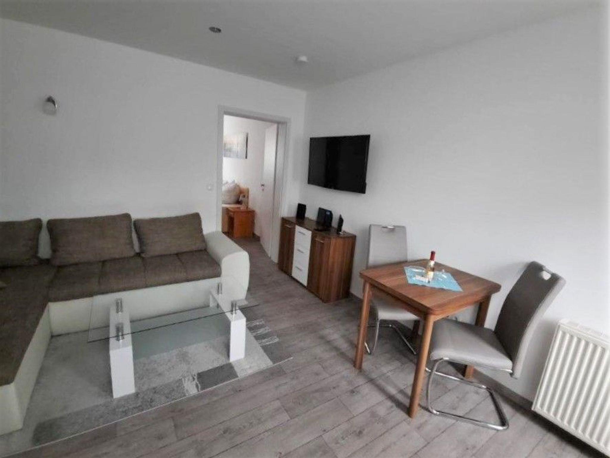 Beim Eintreten erwartet Sie ein kombiniertes Wohn-Esszimmer mit integrierter Küche. Die Küche ist mit ausreichend Besteck, Geschirr, Gläsern und Töpfen/Pfannen ausgestattet. Darüber hinaus ist ein Backofen, Cerankochfeld, Kühlschrank, Wasserkocher, Toaster und Kaffeemaschine vorhanden. Der separate Esstisch mit 2 Stühlen bietet die Möglichkeit Ihre Mahlzeiten dort einzunehmen. Die gemütliche Couch lädt zum Verweilen und Fernsehen ein.