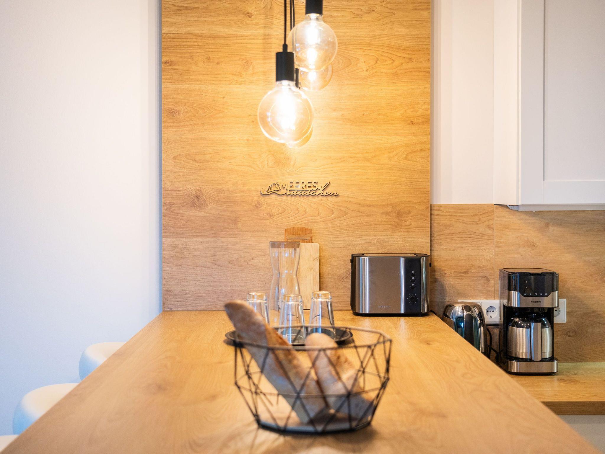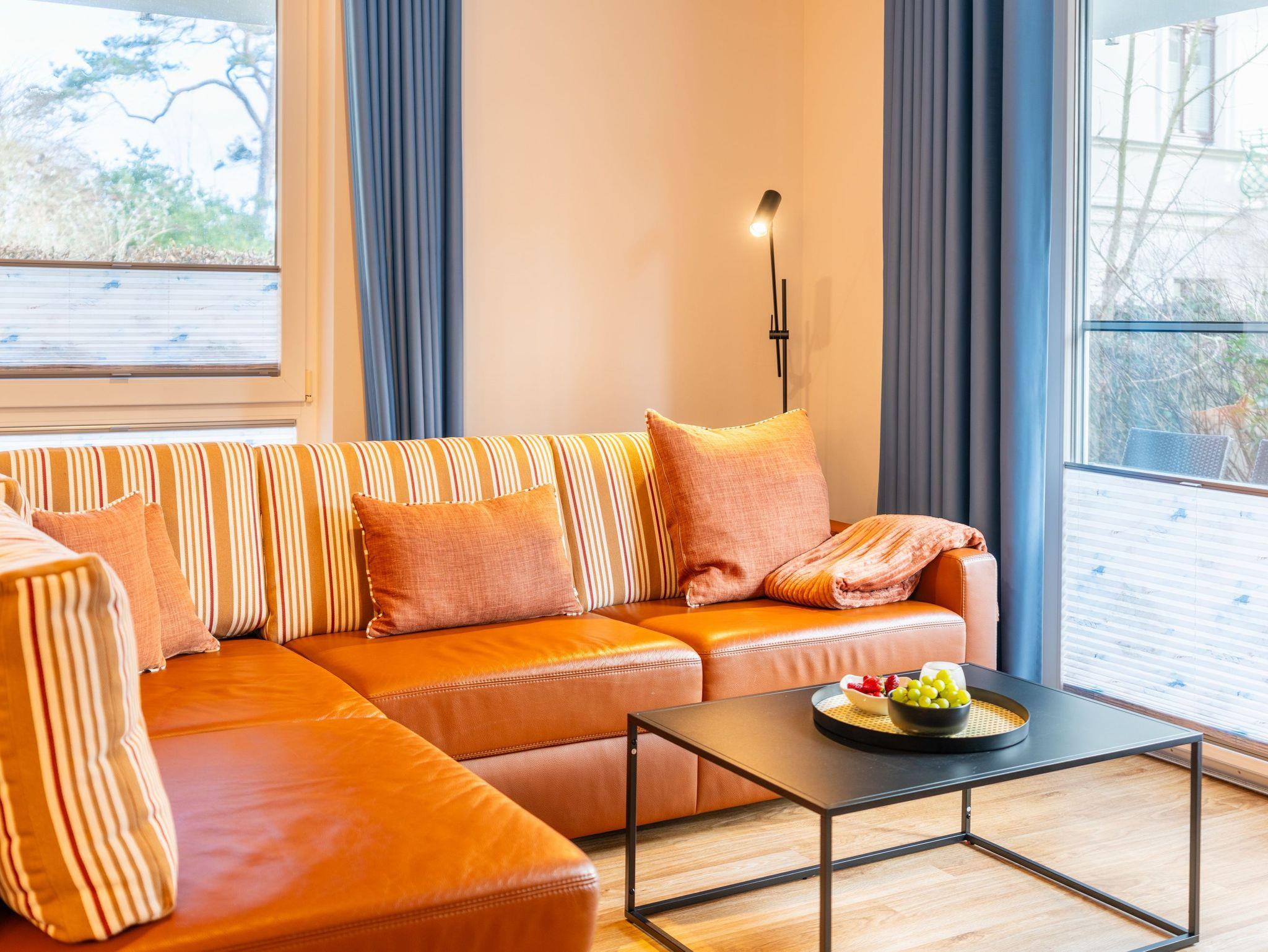 Modern und gemütlich zugleich: auf Ihrer Terrasse im Grünen können Sie bereits beim morgendlichen Kaffee den Wellen der Ostsee lauschen. Der stilvolle Wohnbereich verfügt über einen Flat-TV, ein komfortables Ecksofa und einen Couchtisch, der dank seiner höhenverstellbaren und ausziehbaren Funktionen leicht in einen zweiten Essbereich verwandelt werden kann. Die integrierte Küchenzeile ist für die Zubereitung Ihrer Lieblingsspeisen rundum ausgestattet (inkl. Ceranfeld, Backofen, Mikrowelle, Kühlschrank mit Gefrierfach, Geschirrspüler, Wasserkocher, Toaster und Kaffeemaschine). An dem großzügigem Essplatz kann die ganze Familie in geselliger Runde die zubereiteten Speisen genießen. Vom Wohnzimmer erreichen Sie Ihre private Terrasse, die zum Sonnenbaden oder zur abendlichen Spielrunde mit Blick ins Grüne einlädt. Das Schlafzimmer ist freundlich eingerichtet und mit einem bequemen Doppelbett (180x200cm) und verdunkelnden Gardinen ausgestattet. Für zwei weitere Urlaubsgäste kann die Schlafcouch im Wohnbereich für eine erholsame Nachtruhe und einen guten Start in den neuen Urlaubstag ausgezogen und als komfortable Schlafstätte genutzt werden.