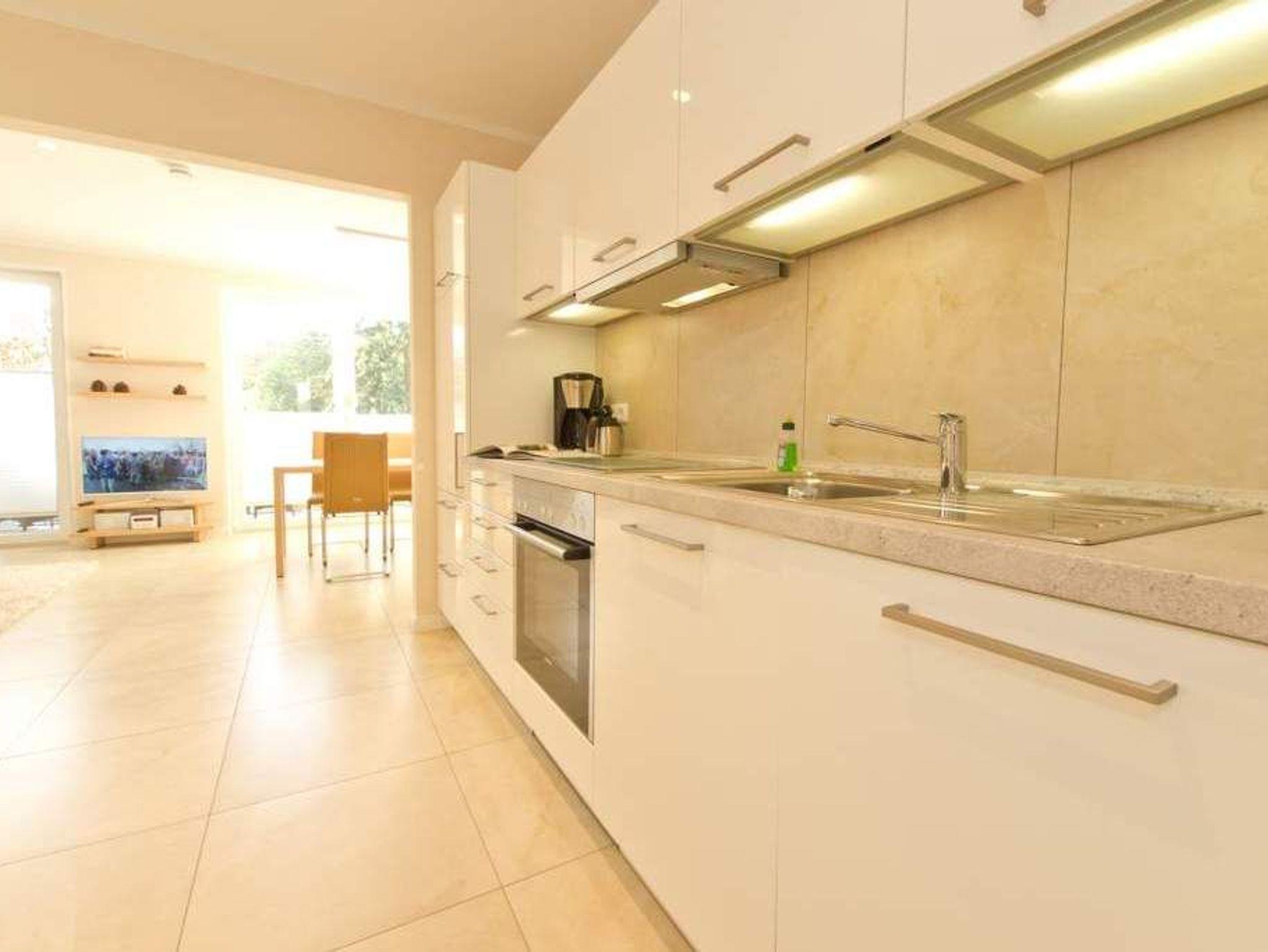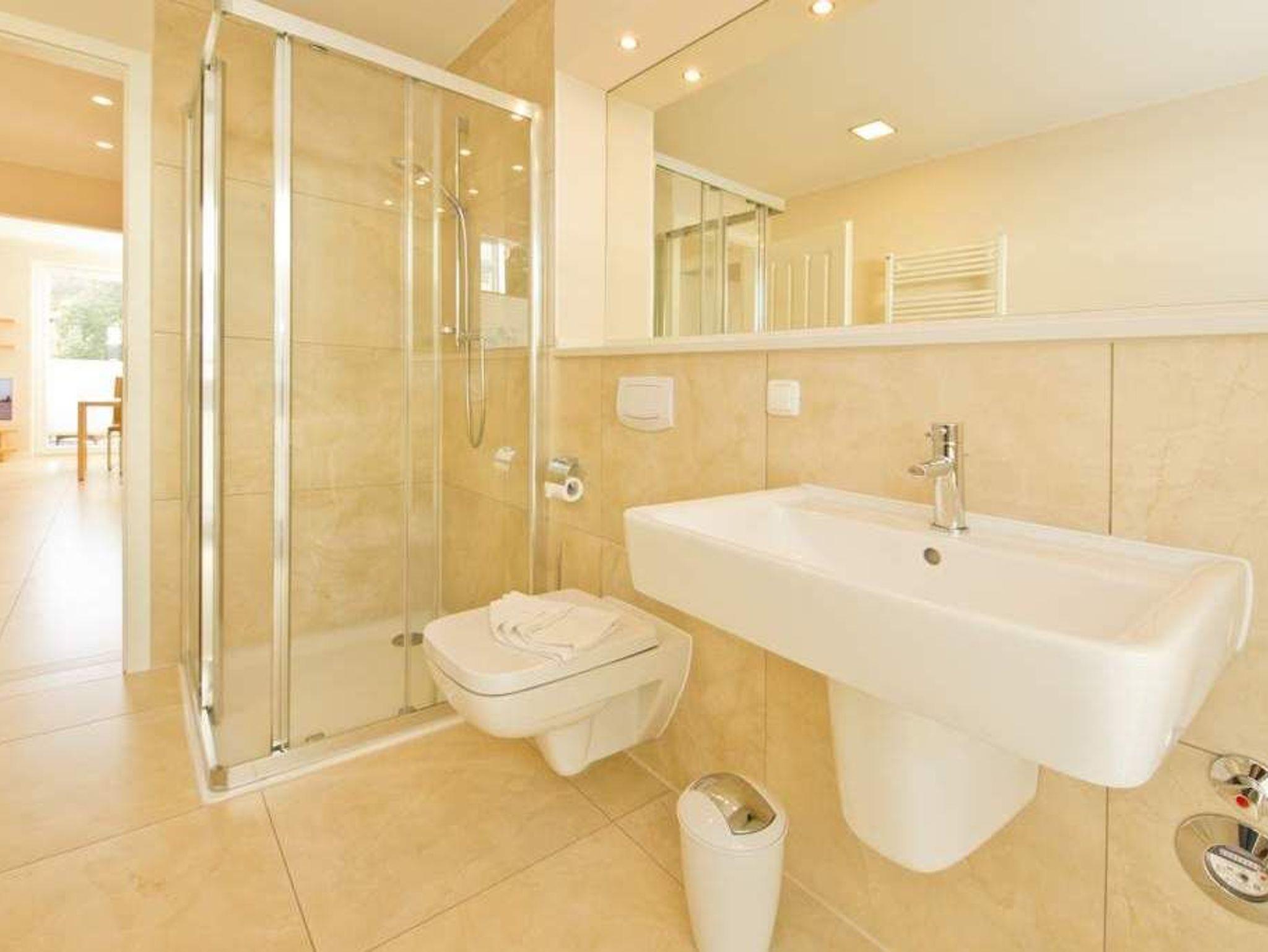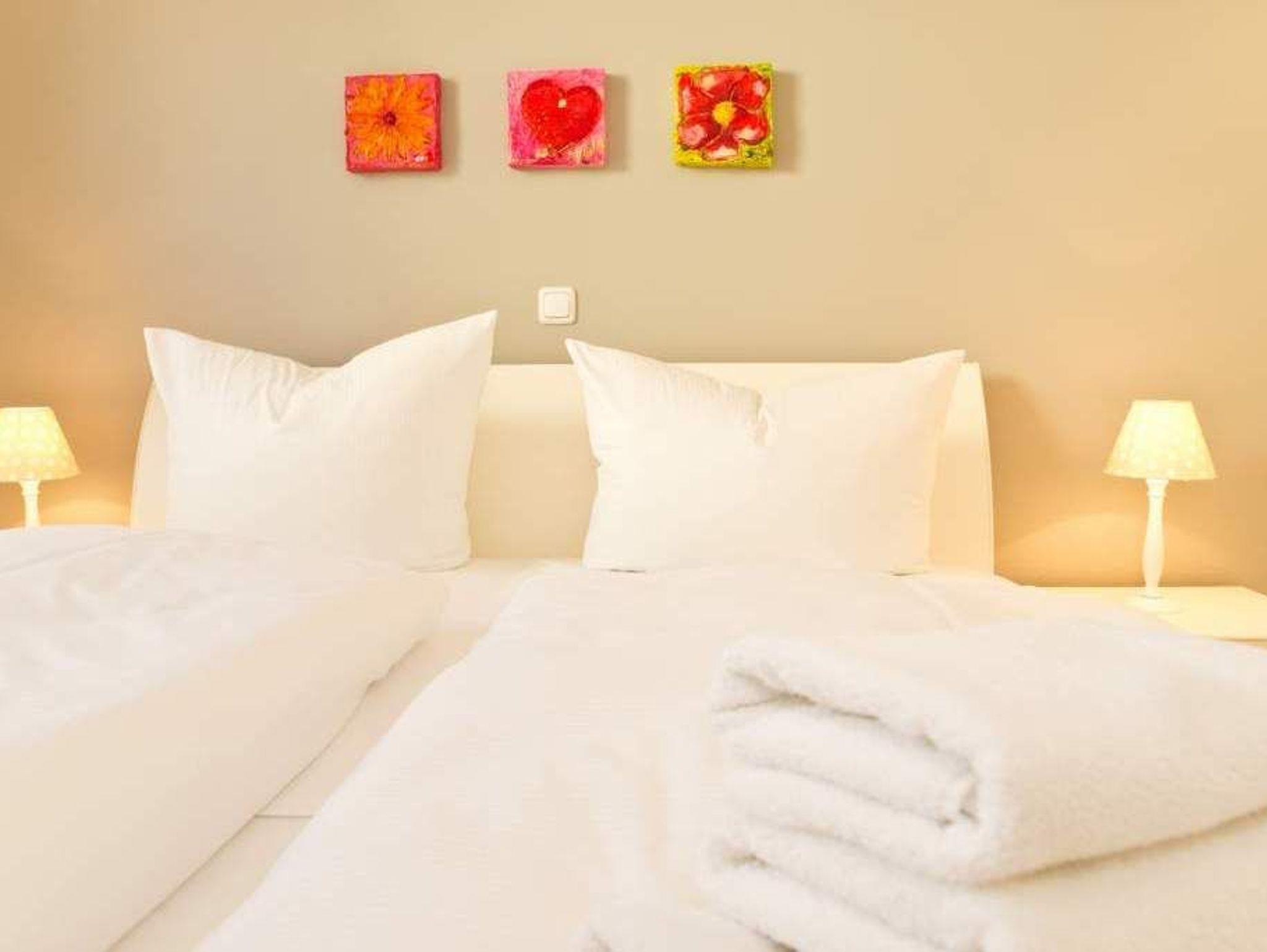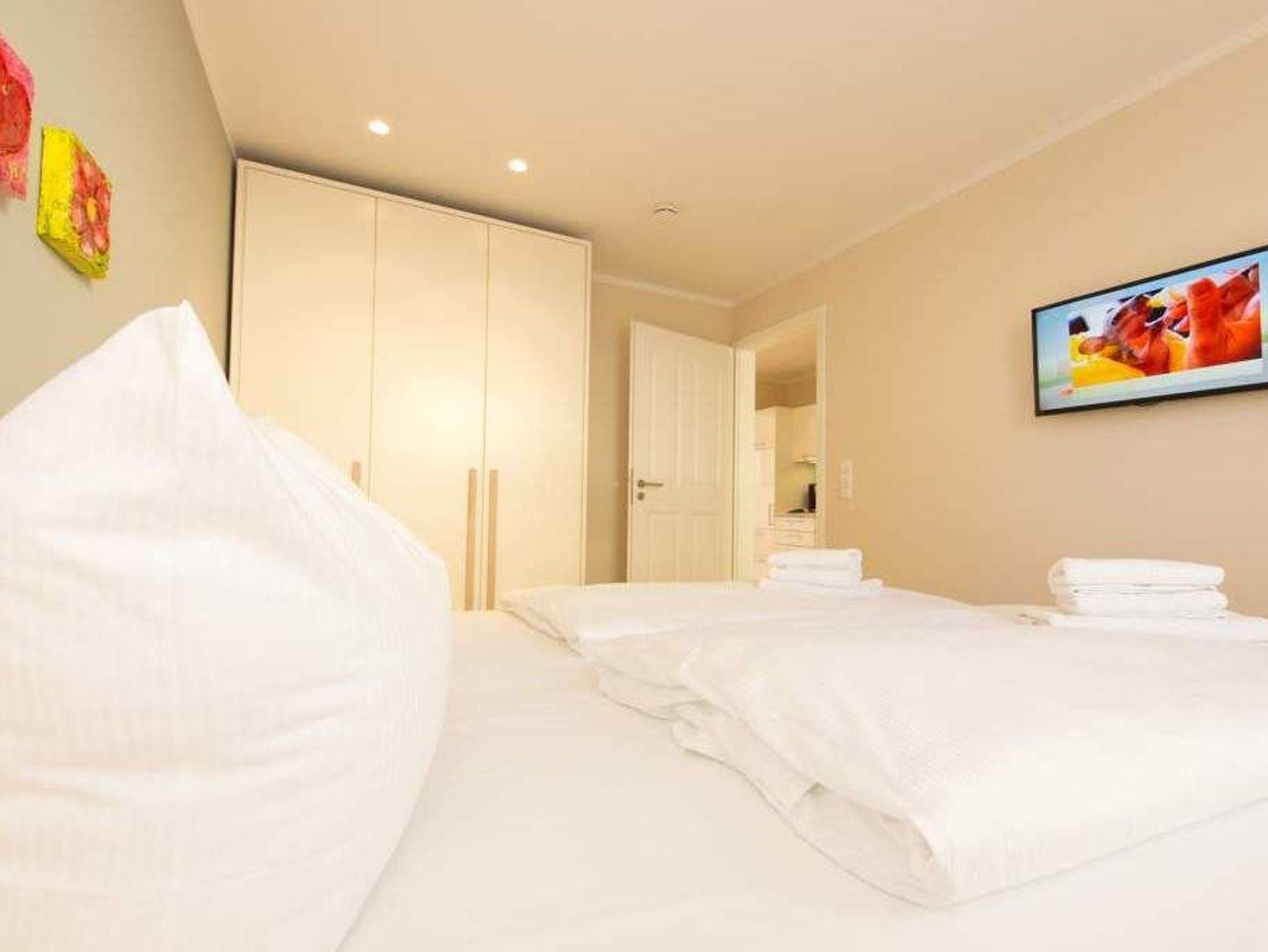 Modern. Lichtdurchflutet. Stilsicher, so empfängt Sie die Ferienwohnung 6 im 1. Obergeschoss des neuen Hauses (50 qm für 2 Personen). Warme, an Strand und Meer erinnernde Farben, ausgesuchte Materialien und stilvolle Dekorationen, verleihen dem komplett gefliesten Appartement Finesse und Leichtigkeit. Der Wohnbereich ist mit einer bequemen Ledercouch und technischen Feinheiten (Flat-TV, Minianlage, DVD) ausgestattet, von hier hat man auch den Zugang zum Südbalkon. Eine offene, komplett ausgestattete Küche, ein wertiges und gemütliches Schlafzimmer mit Doppelbett und Flat-TV sowie ein großzügiges Duschbad mit Fenster ergänzen die Wohnung und bieten Platz für zwei Personen. Für Fahrrad-Freunde ist ein abschließbarer und zur Wohnung gehörender Abstellraum vorhanden. Ein kostenfreier Parkplatz befindet sich auf dem angrenzenden Grundstück. Das WLAN-Netz ist kostenfrei nutzbar.