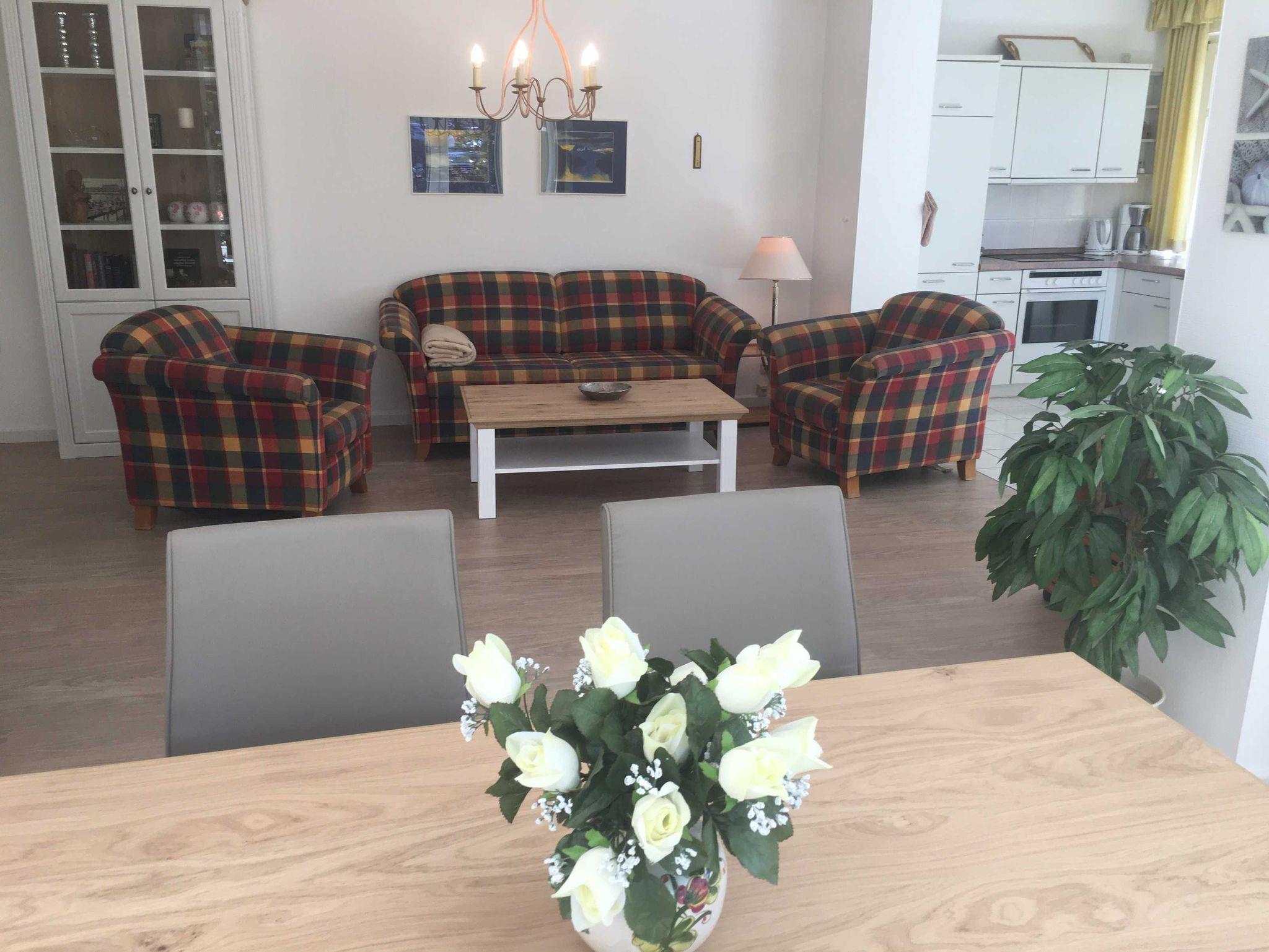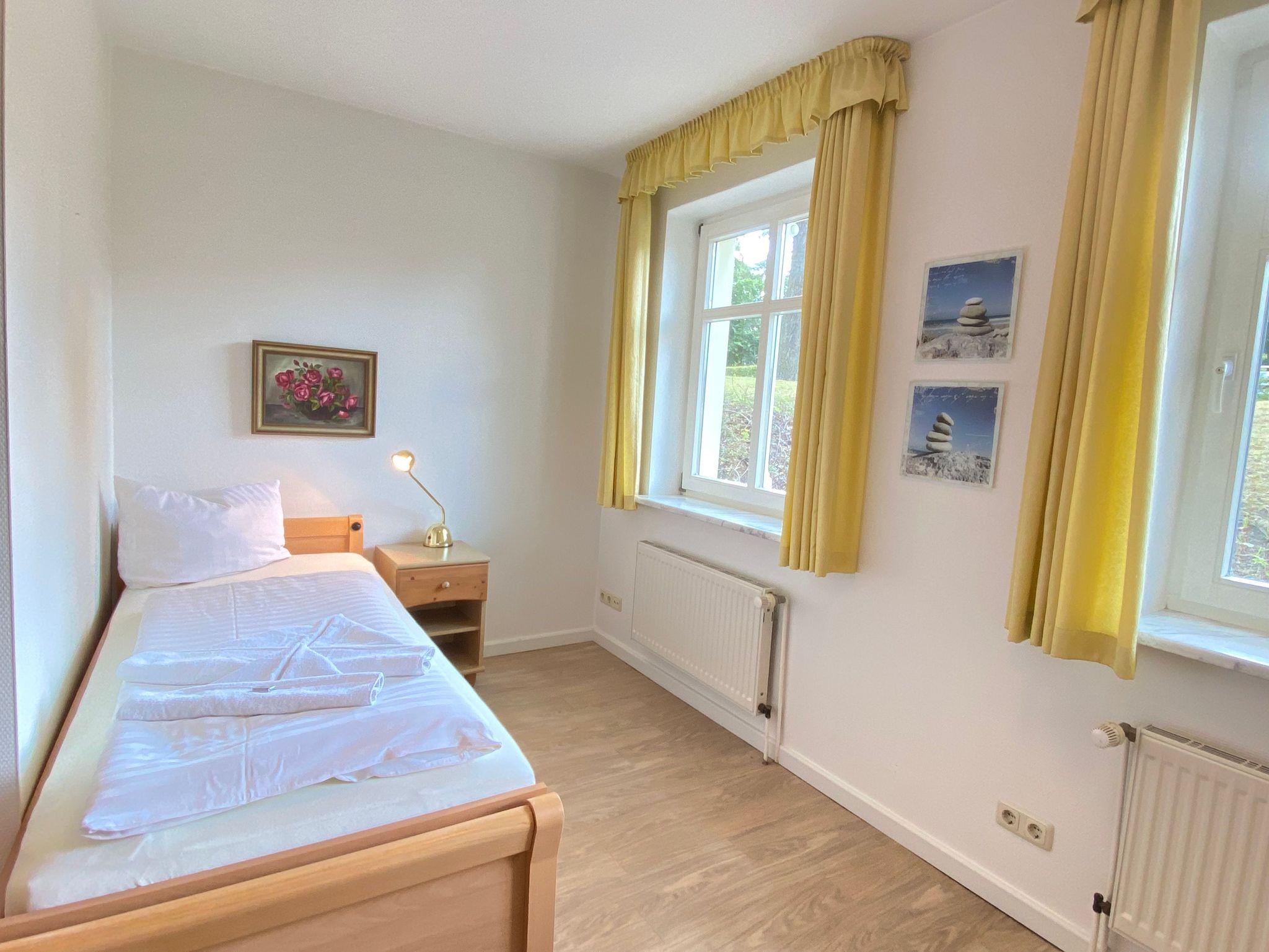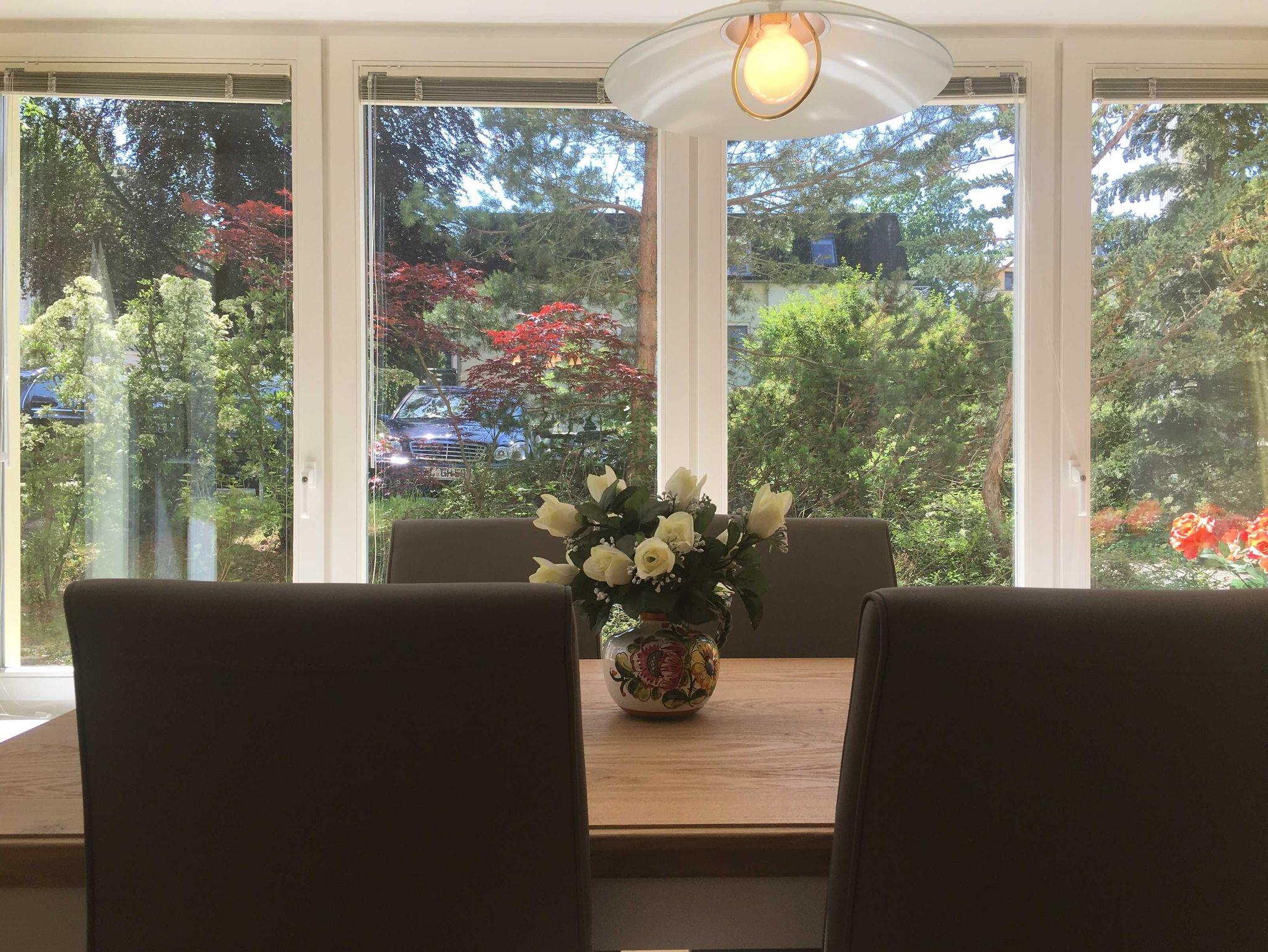 Die Ferienwohnung E2C befindet sich im Erdgeschoss der Villa Caprivi. Die 2 Raumwohnung besteht aus einem gemütlichen Wohnraum mit offener Küche (Herd, Geschirrspüler, Backofen) und Wintergartenflair für den Esstisch. Das Schlafzimmer verfügt über ein Doppelbett und ein Einzelbett. Das Bad ist innenliegend und hat eine Badewanne mit Duschabtrennung. Zur Ferienwohnung gehört eine Südterrasse im Grünen sowie ein Stellplatz.