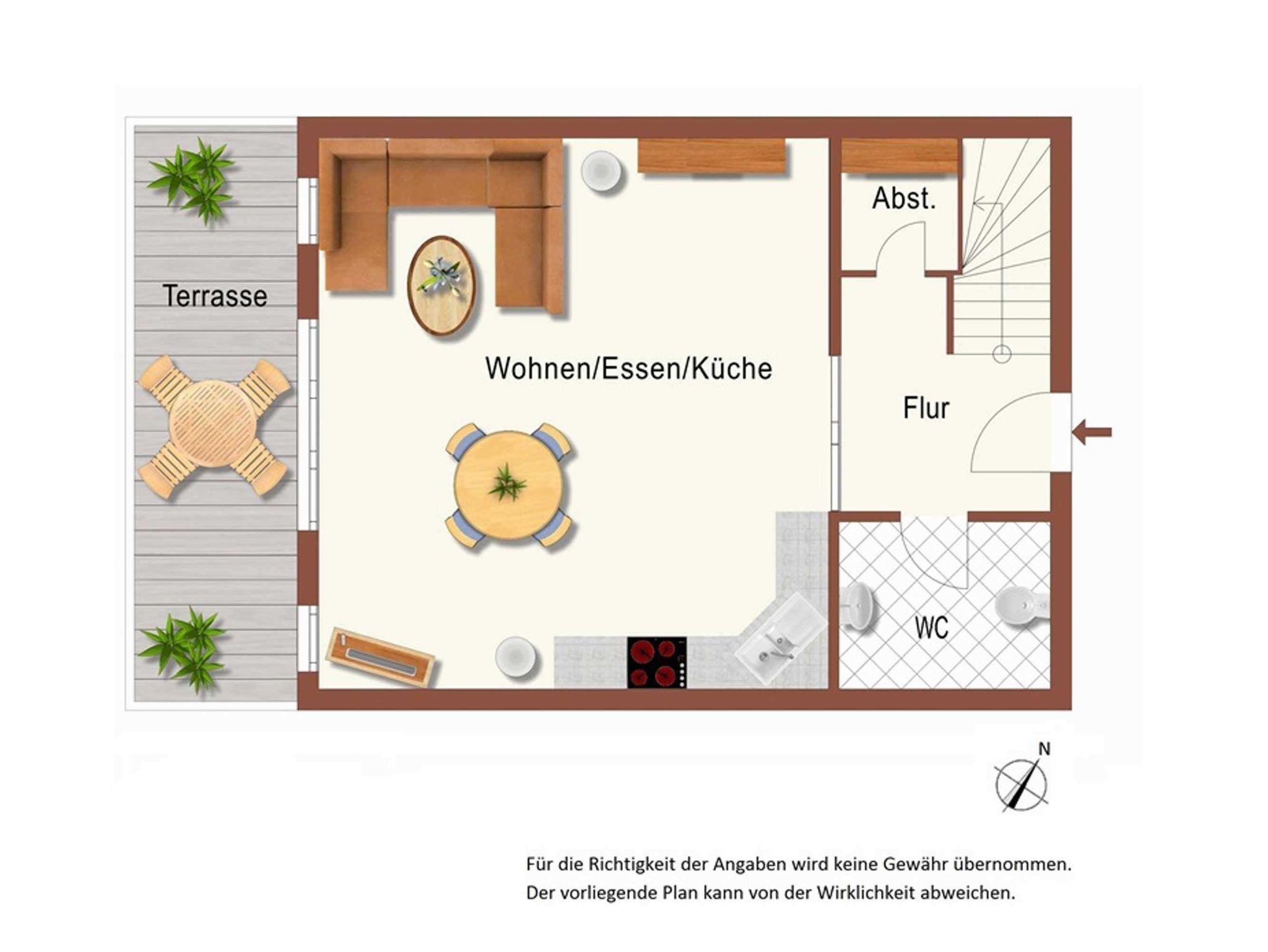 Der geräumige Wohnbereich mit einer vollständig ausgestatteten Küchenzeile führt direkt auf die sonnige Terrasse und lädt zum gemeinsamen Frühstück ein.