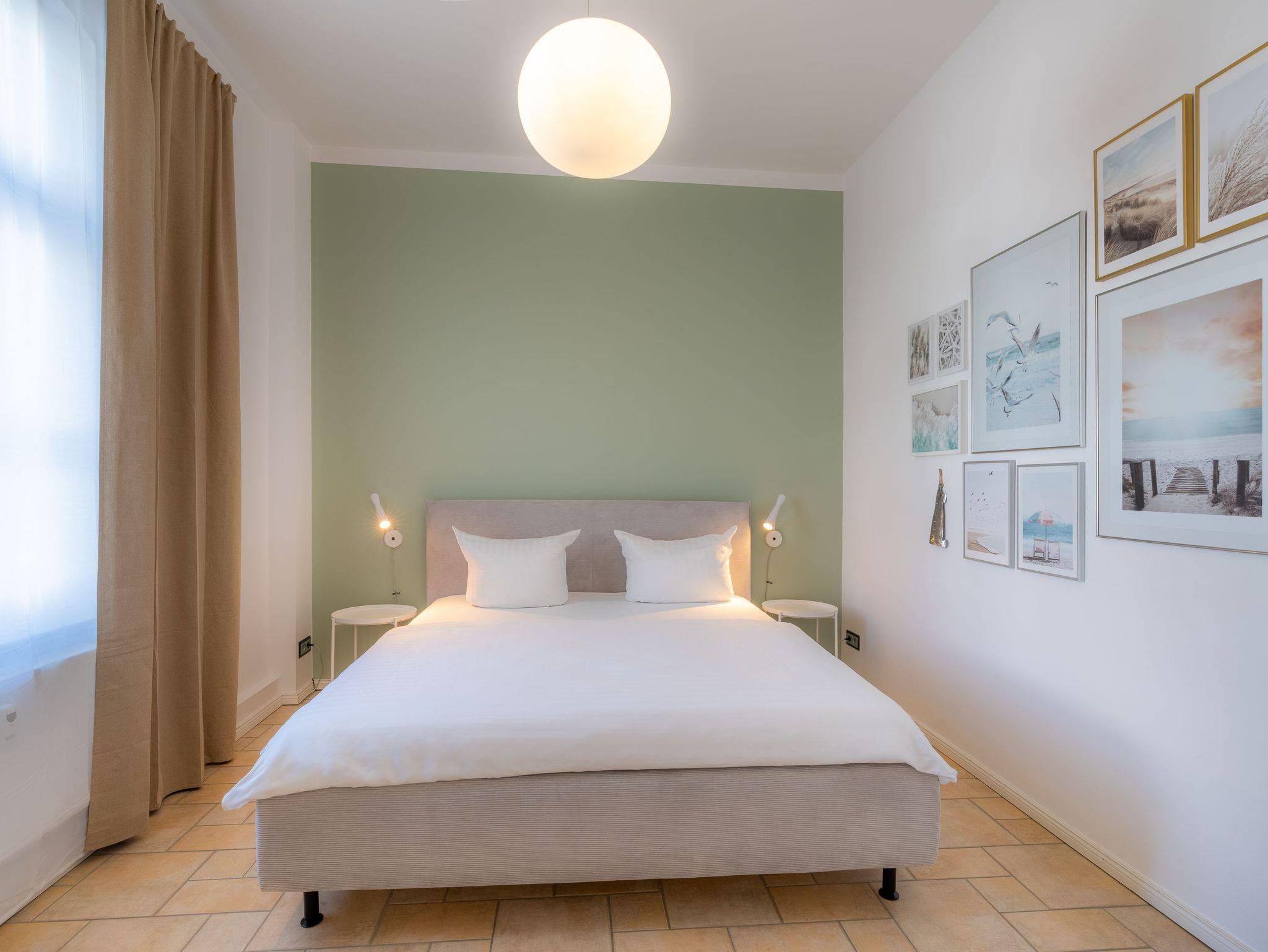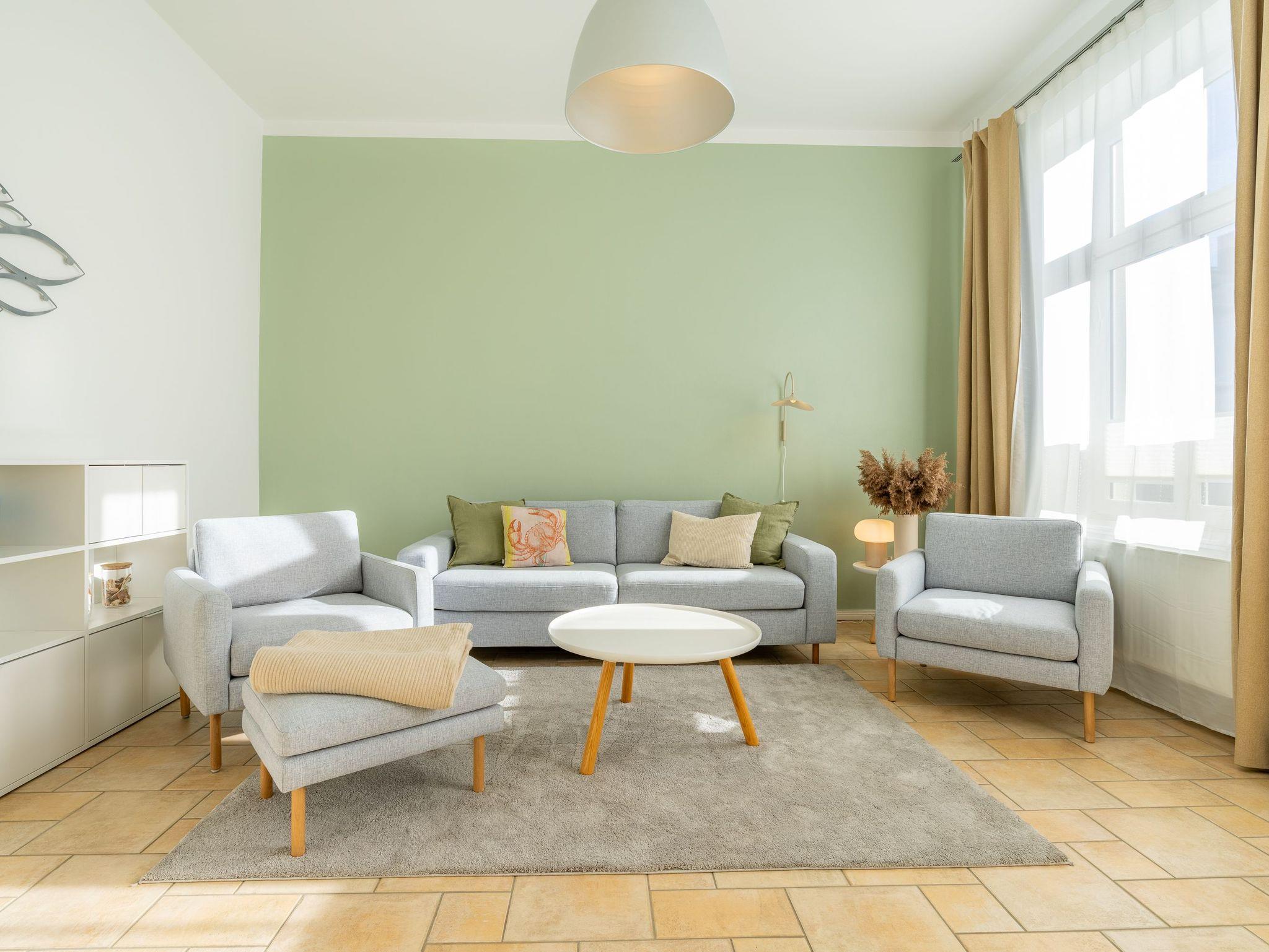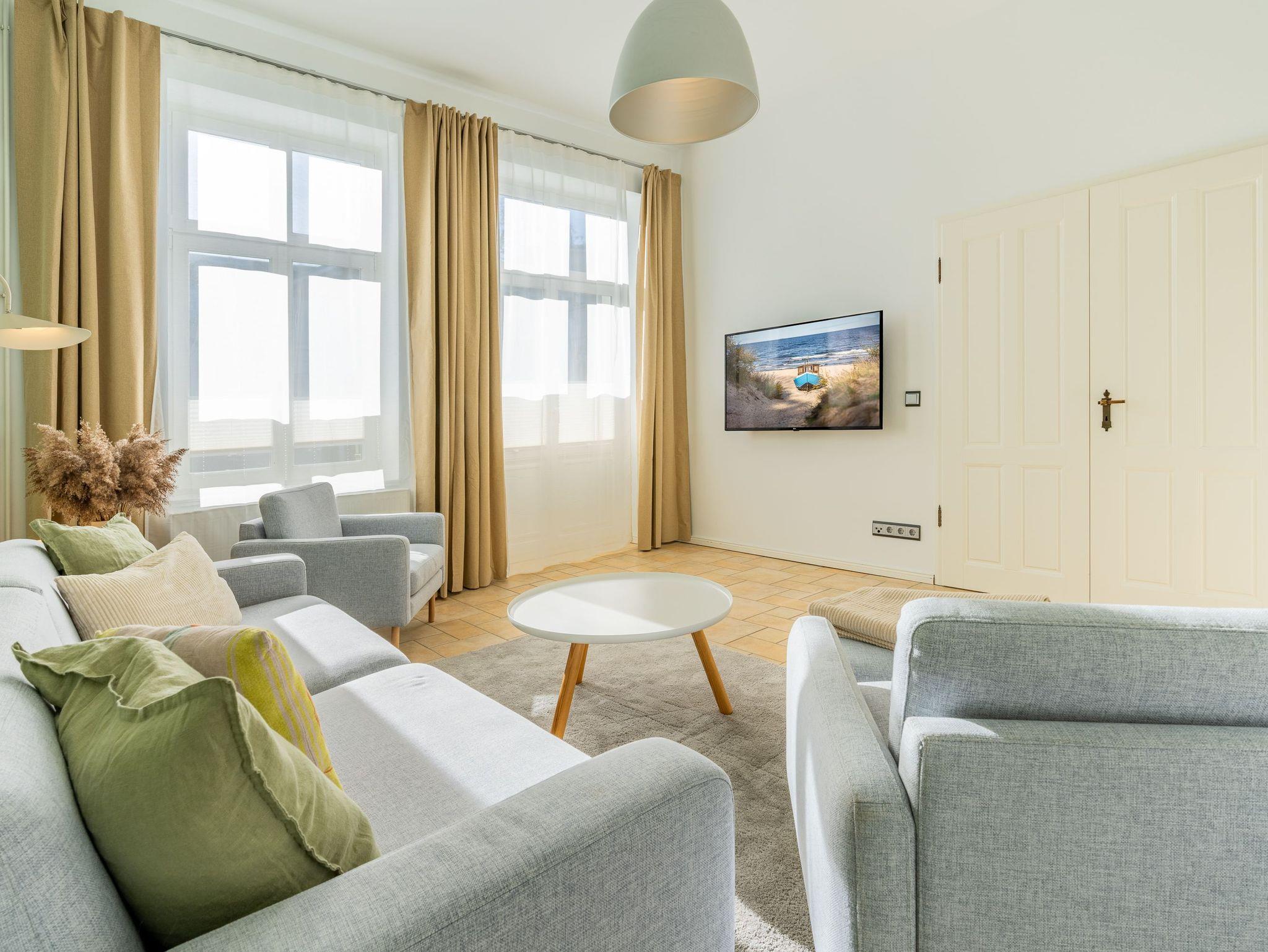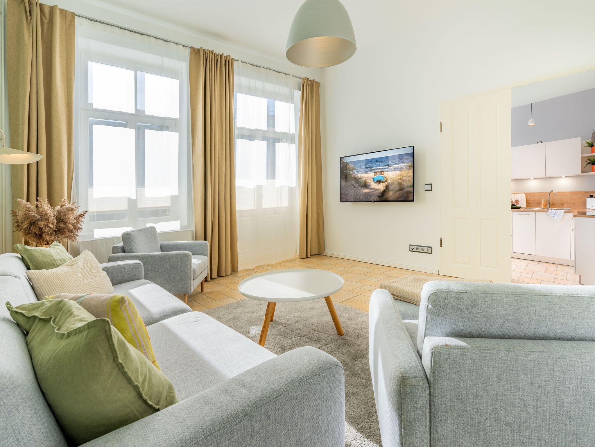 Im 1. OG der Villa Monico gelegen, hat sie einen schönen Süd-Ost-Balkon von welchem Sie aus schon morgens beim ersten Kaffee einen Blick auf die Ostsee werfen können. Bei der Renovierung ist Wert auf hochwertige Designmöbel sowie eine geschmackvolle Atmosphäre gelegt worden. Ideal zum Relaxen ist das geräumige und helle Wohnzimmer, welches Sie durch eine Doppelflügeltür betreten. Von der bequemen Sitzgruppe, oder dem Liegesessel aus haben Sie Blick auf den großen Flat TV (55 Zoll). Ein kostenloser Netflix-Zugang ist bereits enthalten und bietet somit auch an grauen Herbsttagen eine schöne Abwechslung.