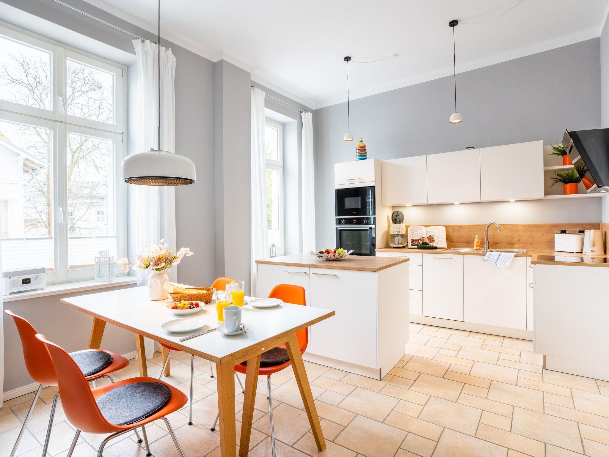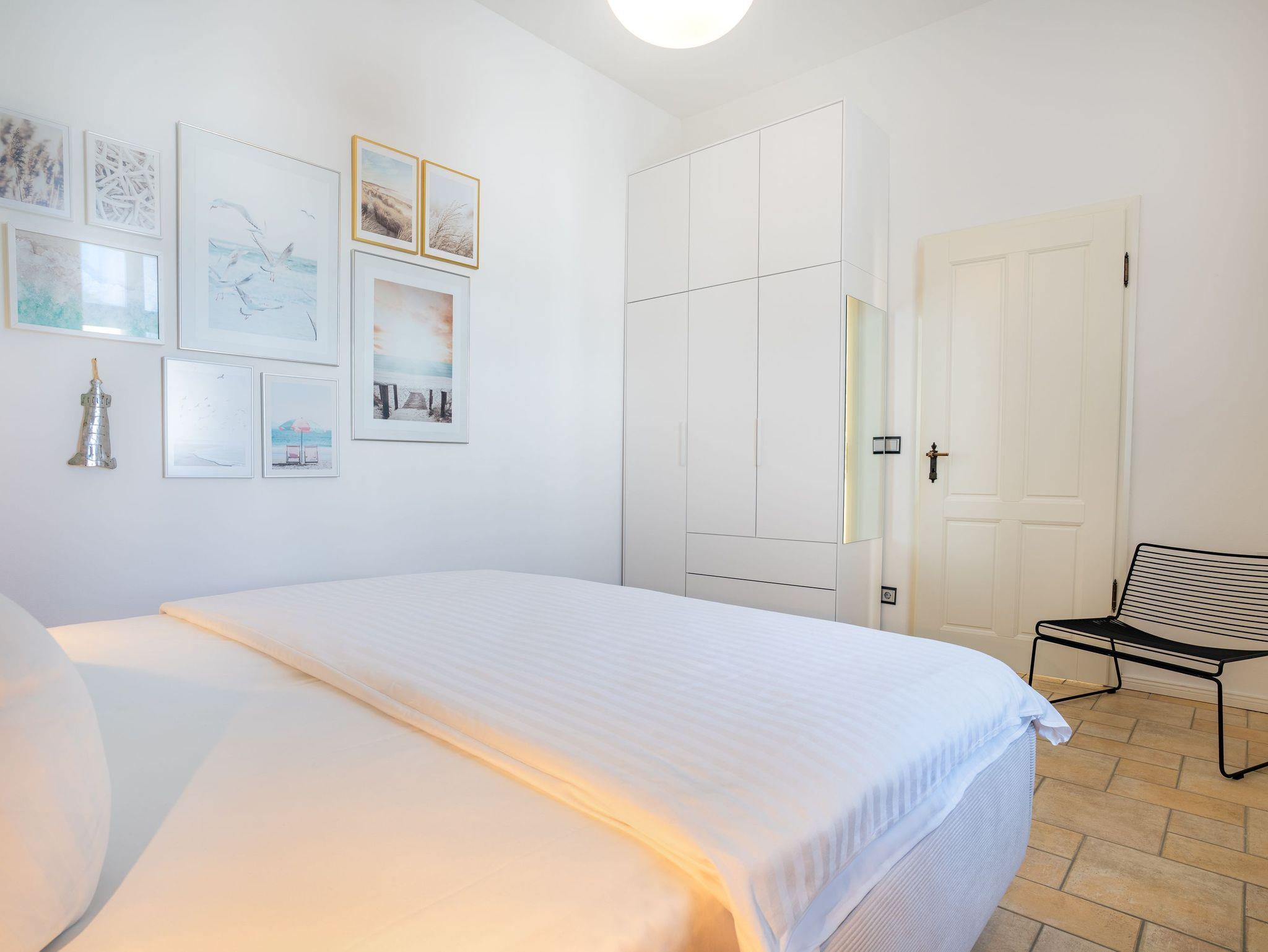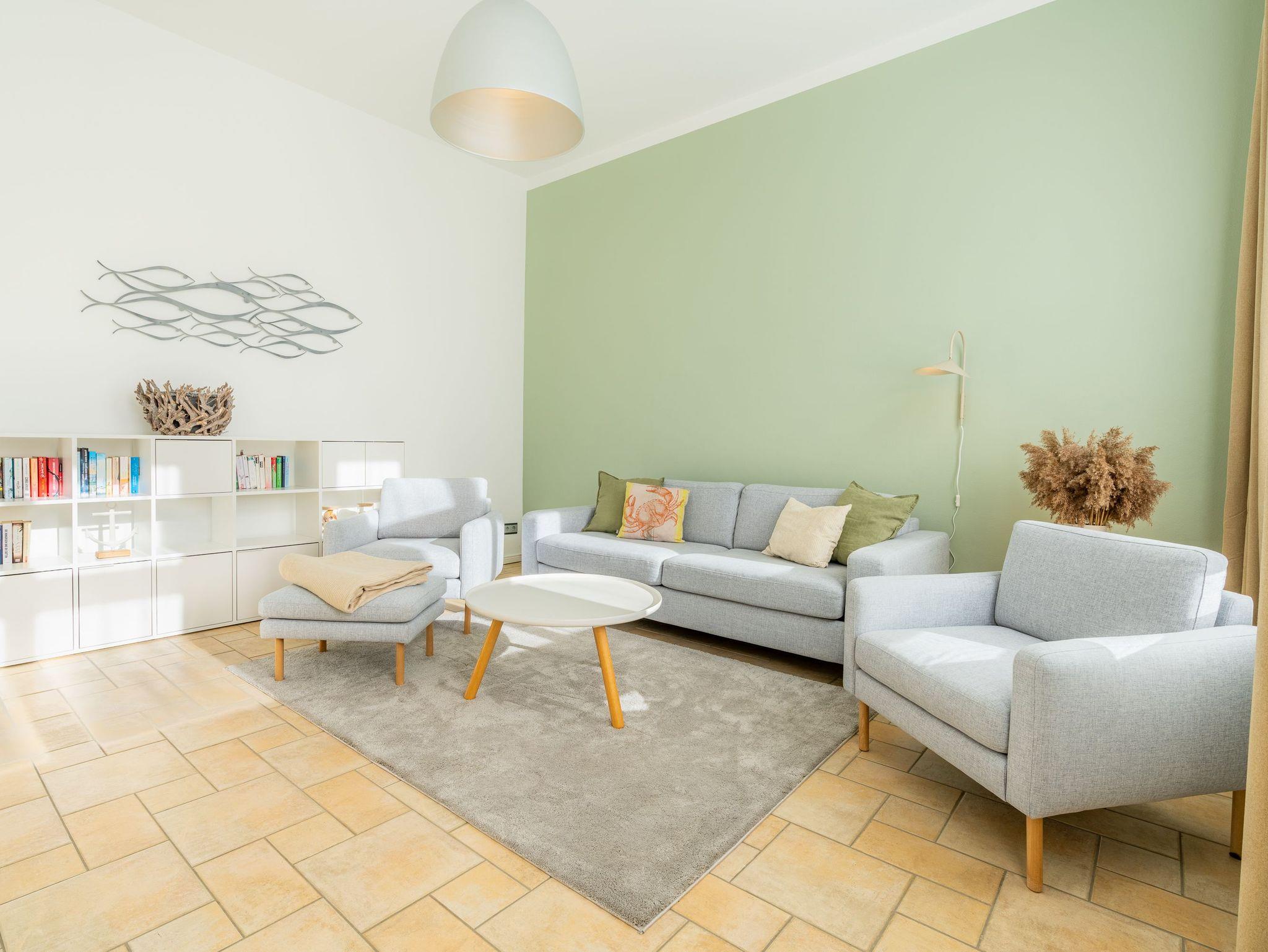 Im 1. OG der Villa Monico gelegen, hat sie einen schönen Süd-Ost-Balkon von welchem Sie aus schon morgens beim ersten Kaffee einen Blick auf die Ostsee werfen können. Bei der Renovierung ist Wert auf hochwertige Designmöbel sowie eine geschmackvolle Atmosphäre gelegt worden. Ideal zum Relaxen ist das geräumige und helle Wohnzimmer, welches Sie durch eine Doppelflügeltür betreten. Von der bequemen Sitzgruppe, oder dem Liegesessel aus haben Sie Blick auf den großen Flat TV (55 Zoll). Ein kostenloser Netflix-Zugang ist bereits enthalten und bietet somit auch an grauen Herbsttagen eine schöne Abwechslung.