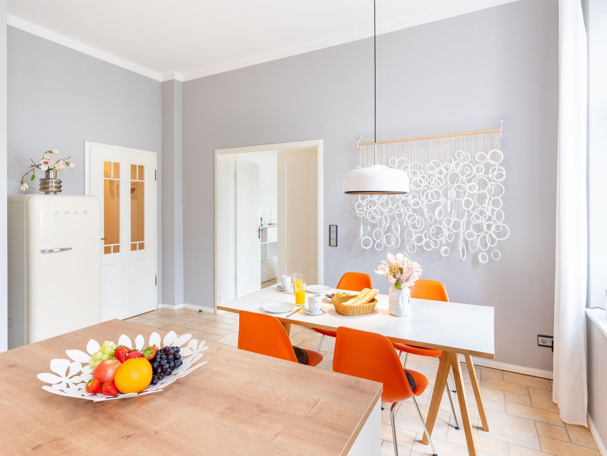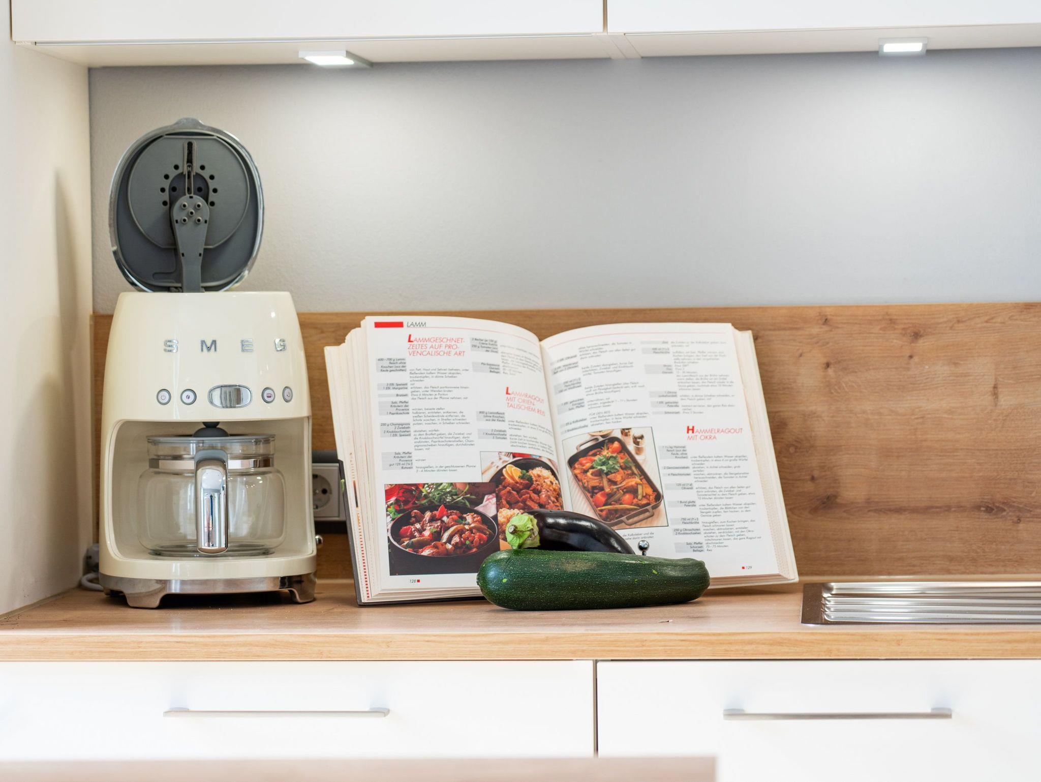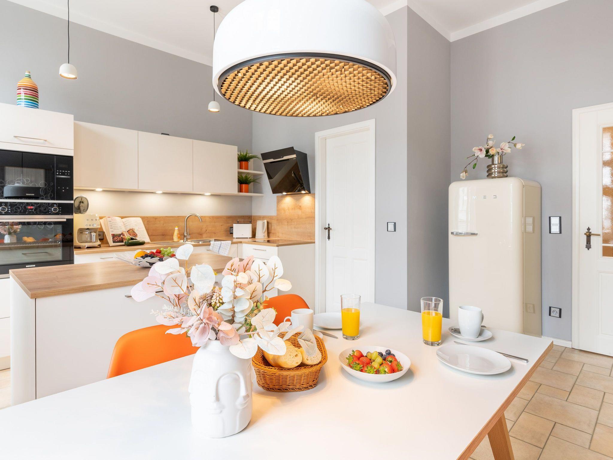 Die neue Küche mit Arbeitsinsel ist mit modernsten Geräten (Mikrowelle, Herd, Backofen, Geschirrspüler) sowie umfangreichen Kochutensilien und Geschirr ausgestattet. Hier schlagen die Herzen von Hobbyköchen höher, denn es gibt ausreichend Platz zur Zubereitung Ihrer Lieblingsspeisen. Optisches Highlight der Küche ist der freistehende SMEG-Kühlschrank. In der Küche befindet sich ebenfalls ein schöner Esstisch mit vier Stühlen. Ein stylisches Lampendesign sorgt dafür, dass es Ihnen nie zu dunkel wird. Pures Schlafvergnügen finden Sie im Schlafzimmer. Dieses bietet Ihnen ein hochwertiges Doppelbett (1,80 m x 2,00 m) und einen Kleiderschrank. Eine weitere Schlafgelegenheit für bis zu zwei Personen finden Sie auf dem Design-Schlafsofa (1,60m x 2,10m) im Wohnzimmer, welches eine robuste und einfache Ausklappfunktion und einen echten Lattenrost bietet. Das Tageslichtbad verfügt über eine ebenerdige Dusche, einen Waschtisch, einem WC und einer Waschmaschine ausgestattet.