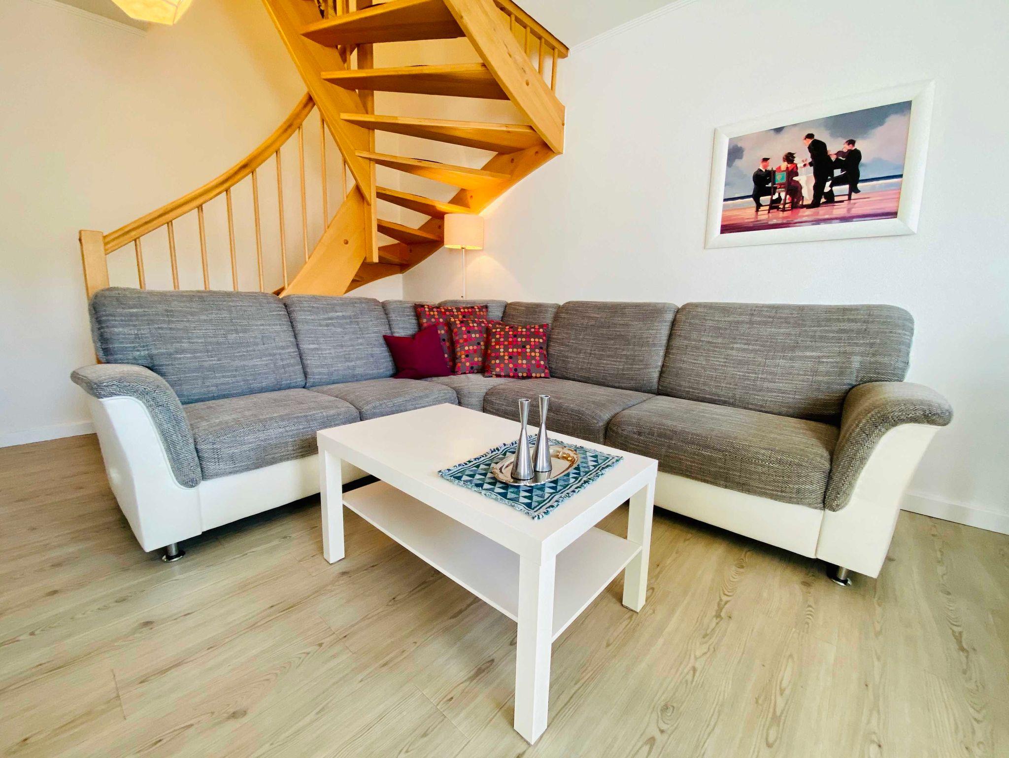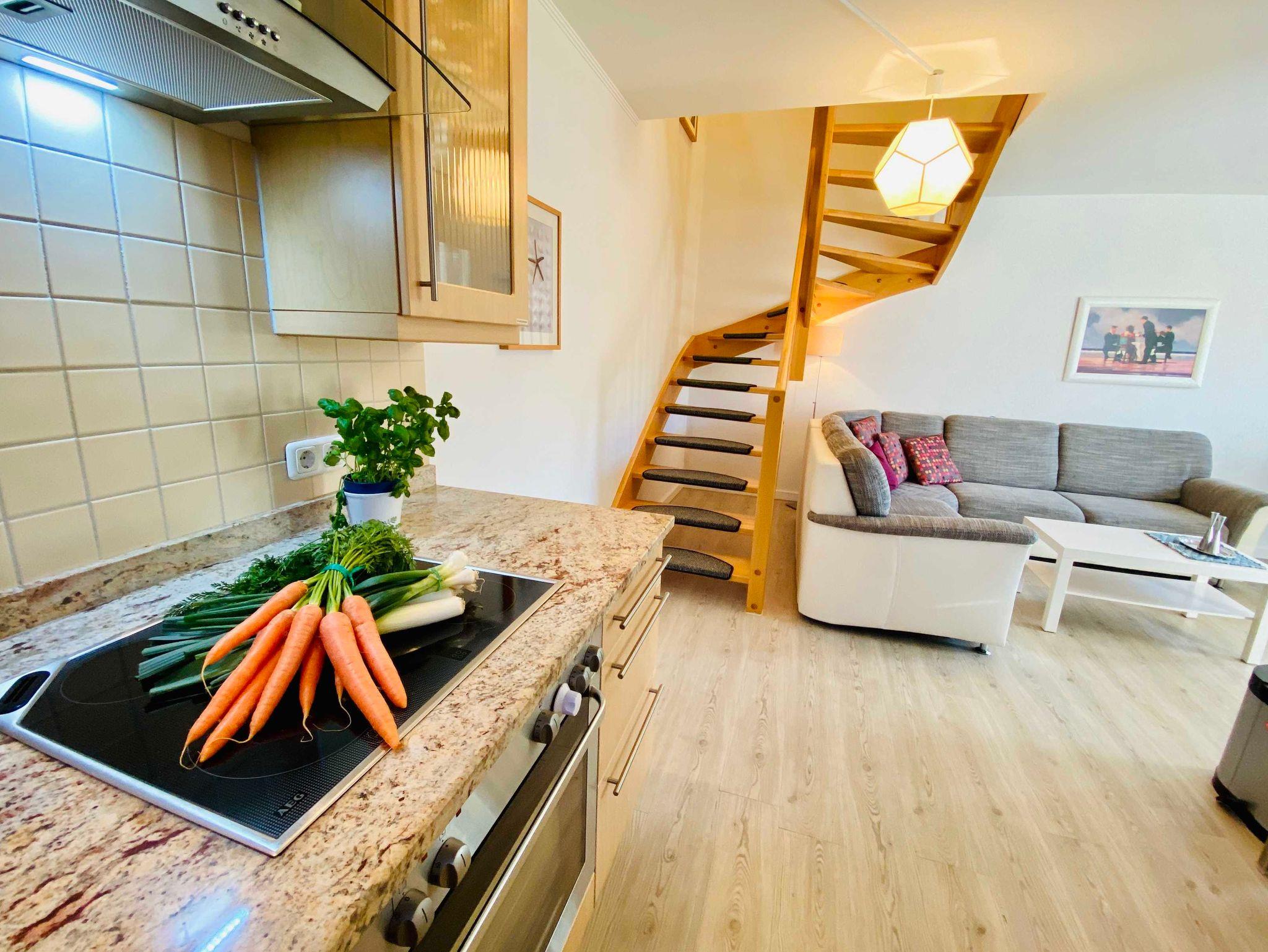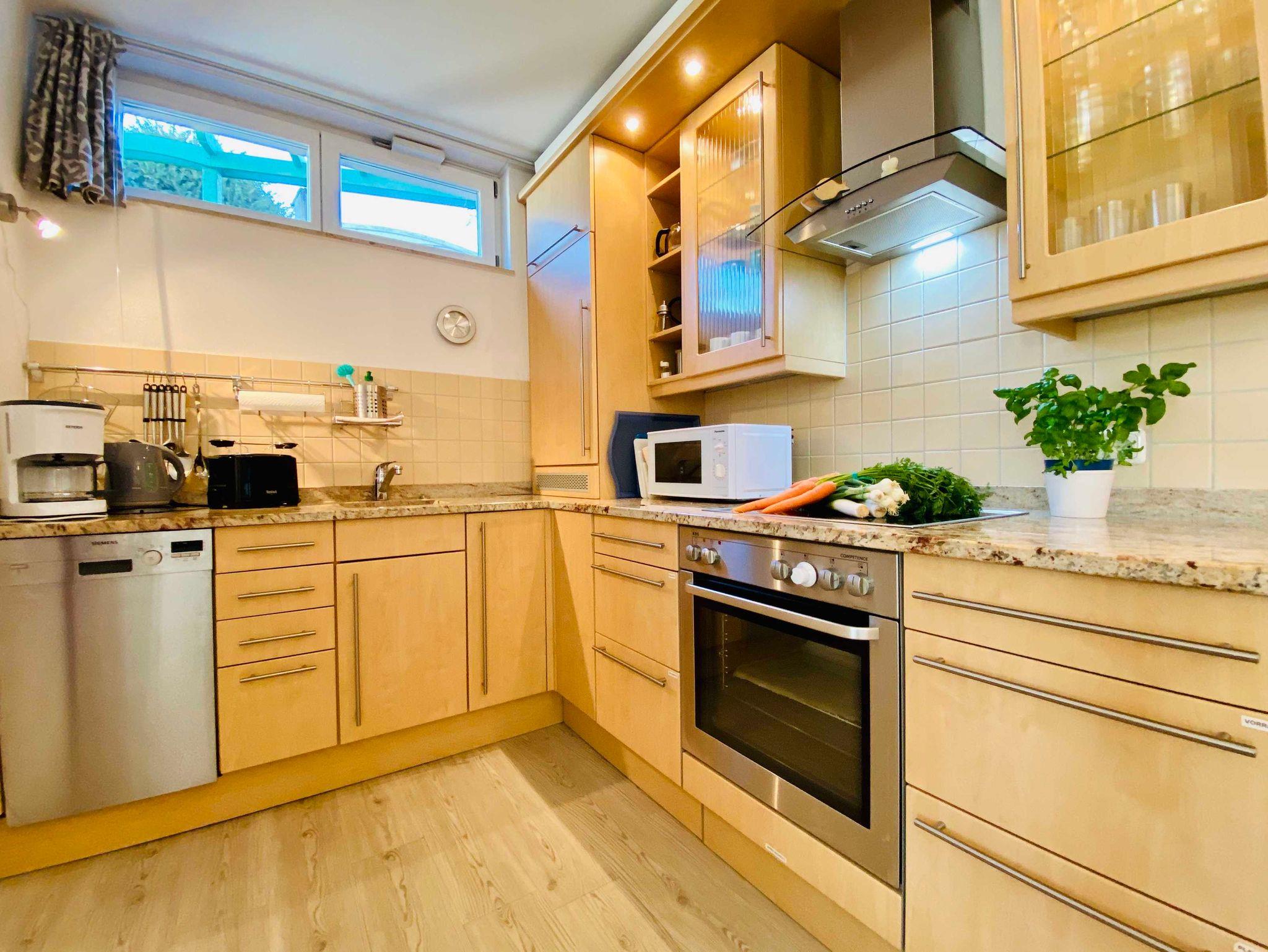 Im Erdgeschoss befindet sich der Wohn-Essraum mit Sitzecke, TV und Essecke sowie die offene Komplettküche (Geschirrspüler, Backofen, Mikrowelle). Ebenfalls unten befindet sich ein Gäste-WC und ein kleiner Abstellraum.