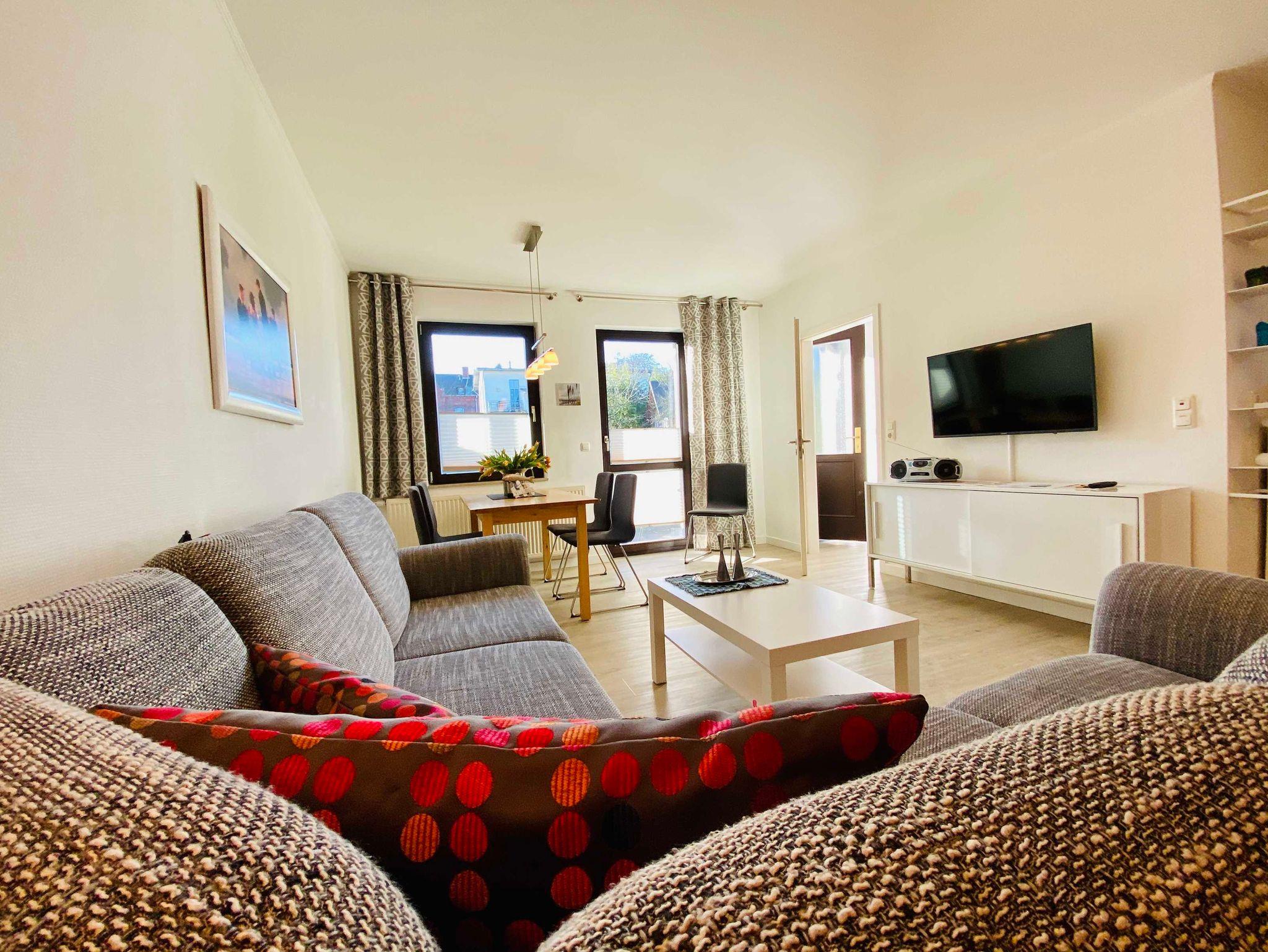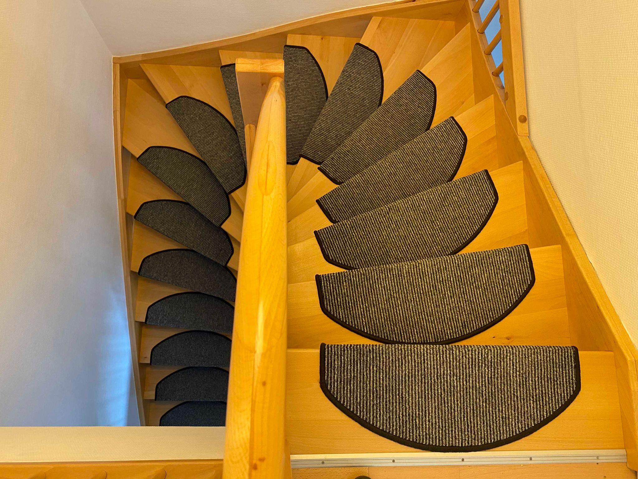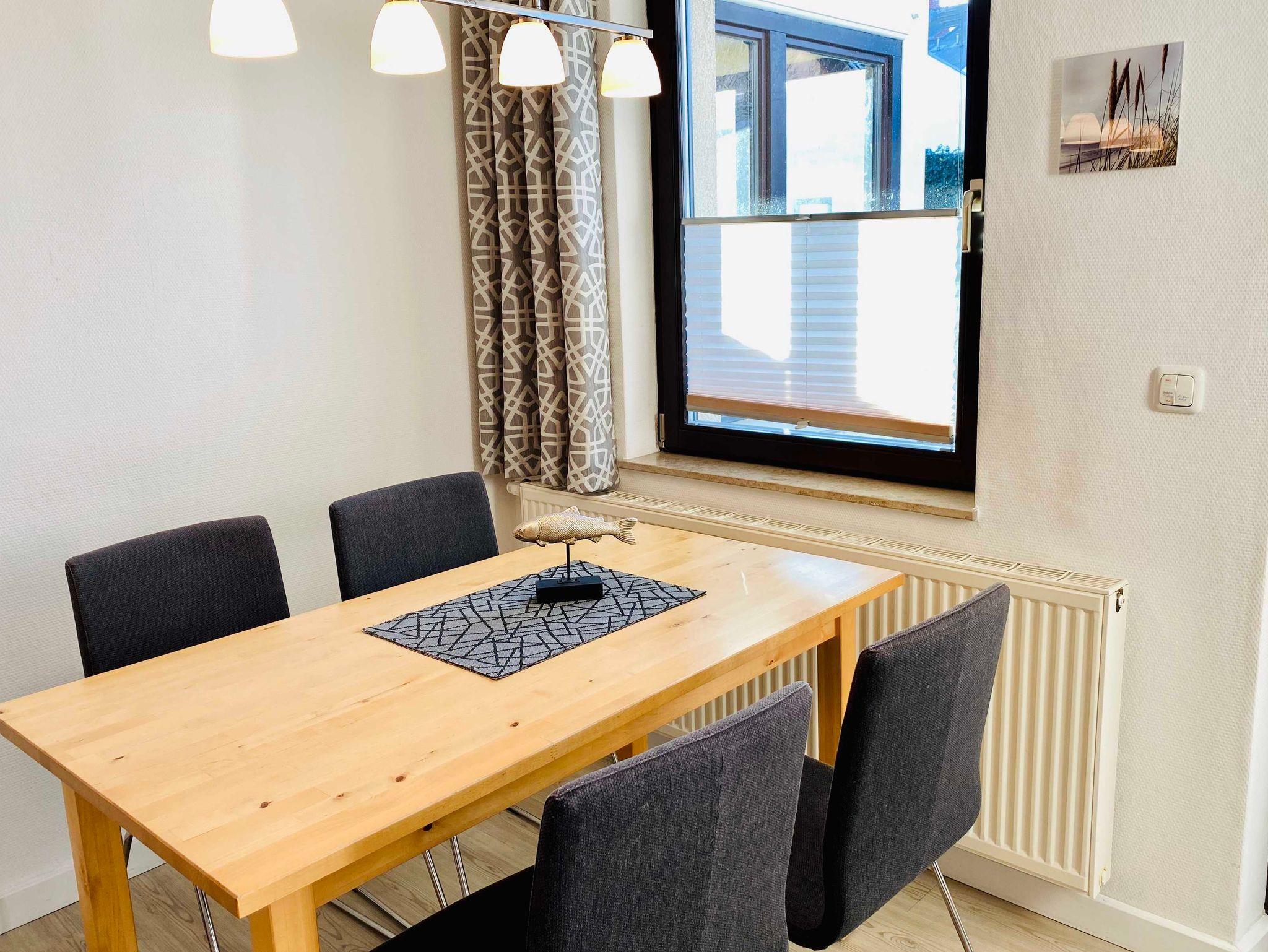 Im Erdgeschoss befindet sich der Wohn-Essraum mit Sitzecke, TV und Essecke sowie die offene Komplettküche (Geschirrspüler, Backofen, Mikrowelle). Ebenfalls unten befindet sich ein Gäste-WC und ein kleiner Abstellraum.