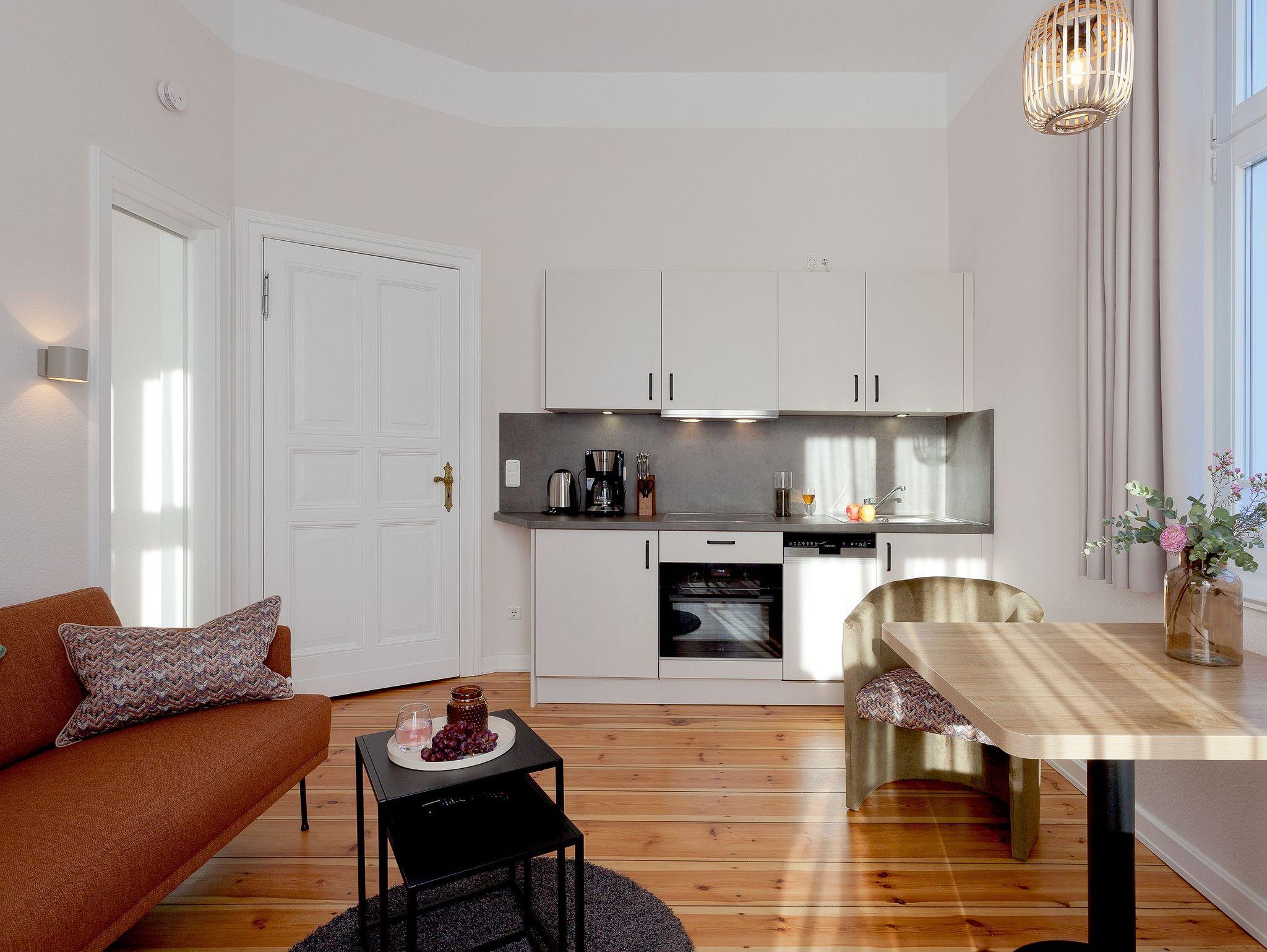 Unser Appartement 8 im 1. Obergeschoss wurde Winter 2024 - 25 renoviert und erstrahlt nun in neuem Glanz erstrahlen. Mit ca. 38 qm bietet das Appartement alles, was es für einen erholsamen Aufenthalt mit bis zu 2 Personen benötigt. Die neue, moderne Single-Küchenzeile ist vollausgestattet mit einem Cerankochfeld, Kühlschrank mit Gefrierfach, Backofen mit integrierter Mikrowelle, Spülmaschine sowie Kaffeemaschine, Wasserkocher und Toaster.