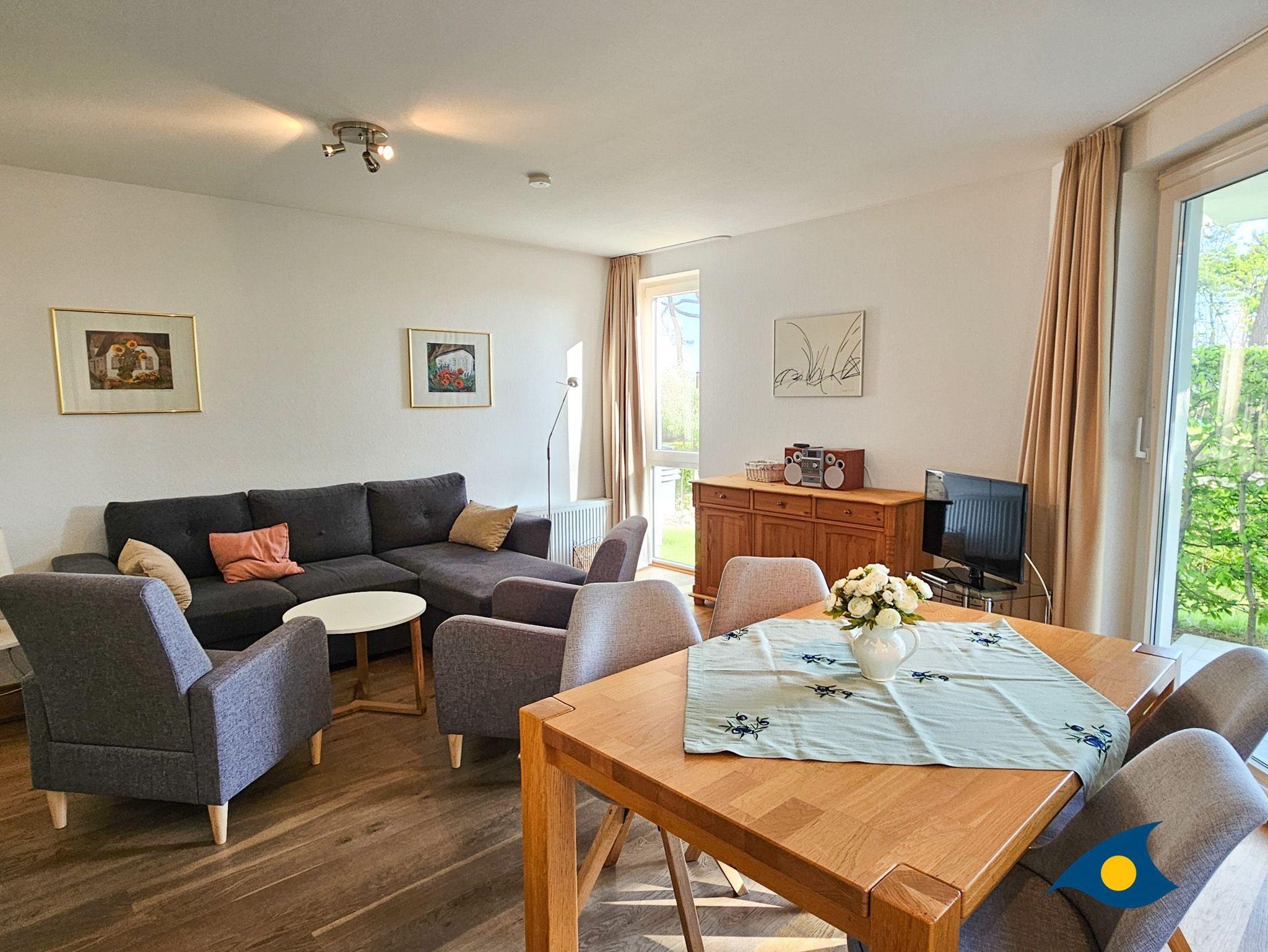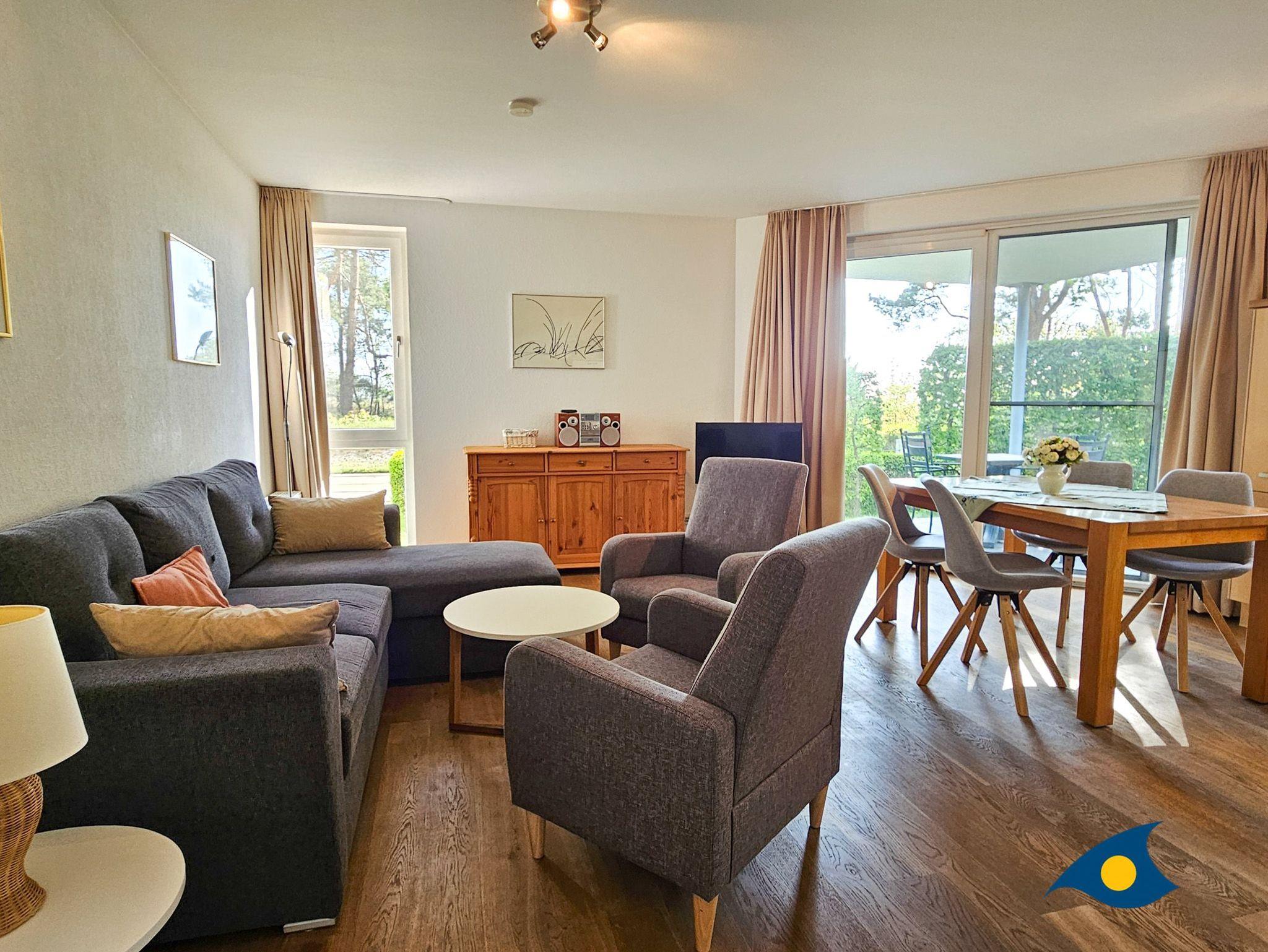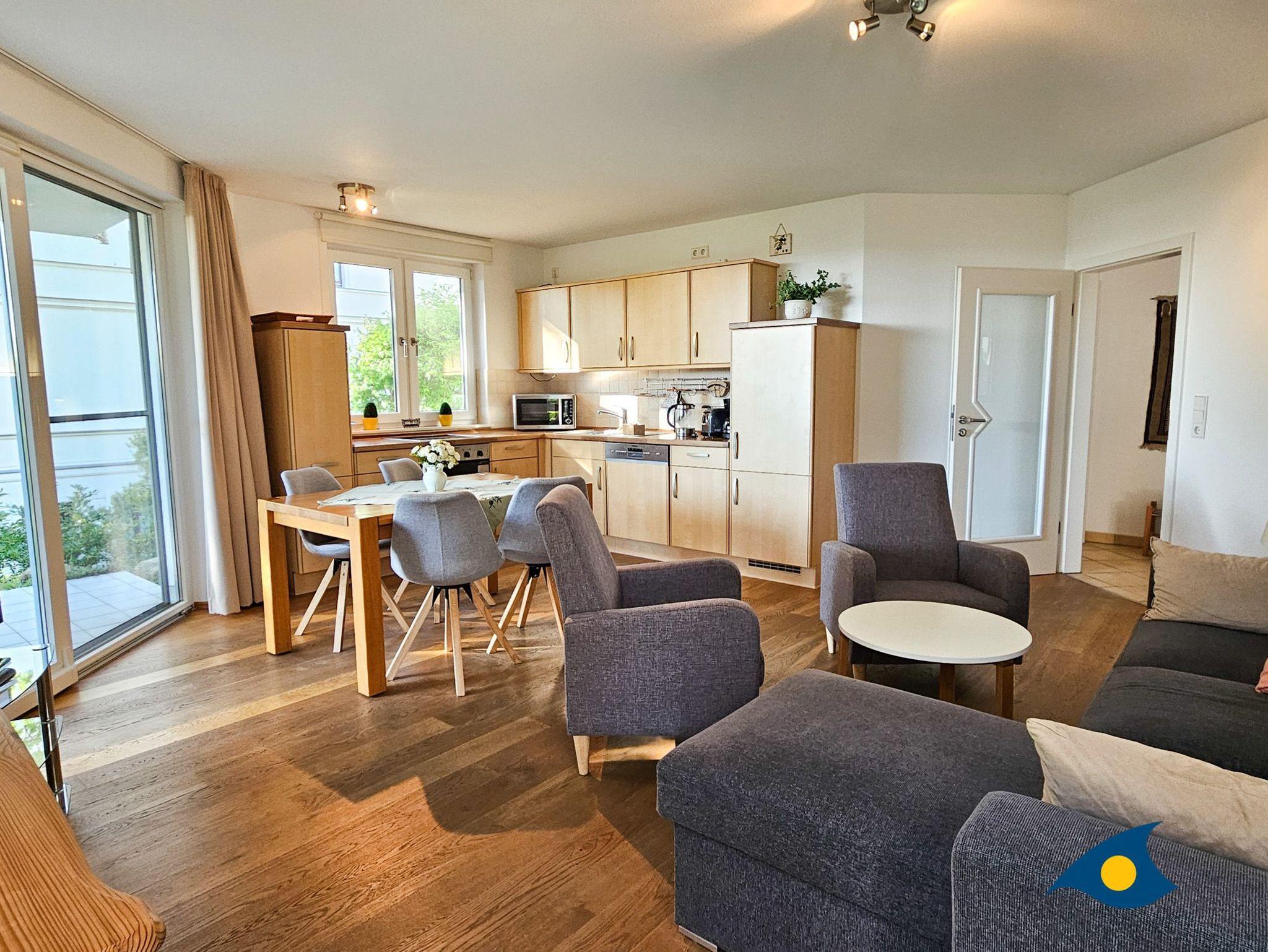 Der großzügige Wohnbereich besticht durch seine geschmackvolle Einrichtung und eine offene, voll ausgestattete Küche, perfekt für kulinarische Erlebnisse. Von hier aus haben Sie direkten Zugang zur überdachten Terrasse, die mit einem herrlichen Blick auf die Ostseedünen und das Meer begeistert. Eine gemütliche große Eckcouch mit Schlaffunktion für die 3. und 4. Person, zwei komfortable Sessel und ein Flachbild-TV laden zu entspannten Abenden ein. Die Essecke bietet ausreichend Platz für gemeinsame Mahlzeiten.