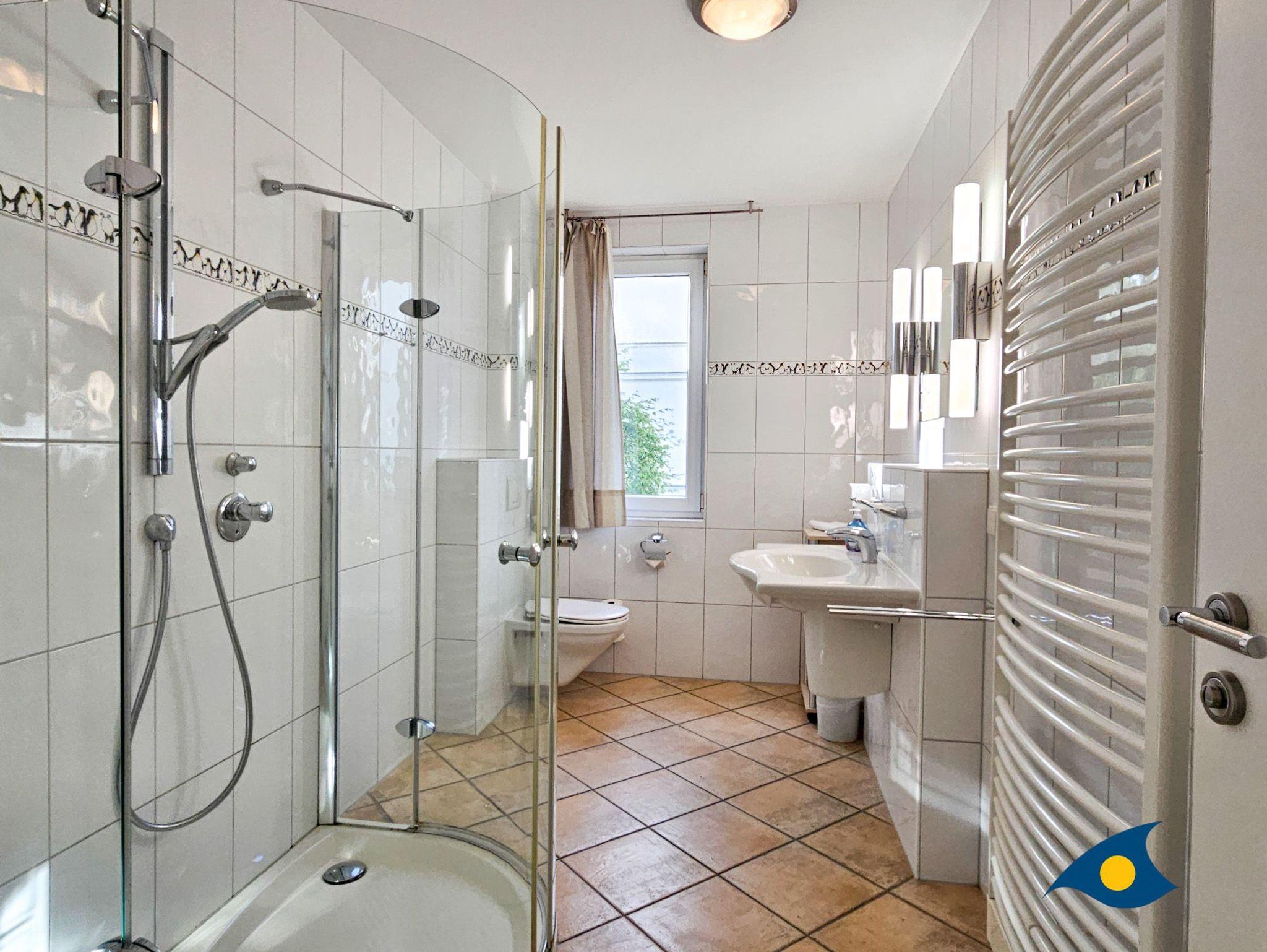 Das großzügige Tageslichtbad ist modern gestaltet und mit einer ebenerdigen Dusche ausgestattet, die höchsten Komfort bietet.