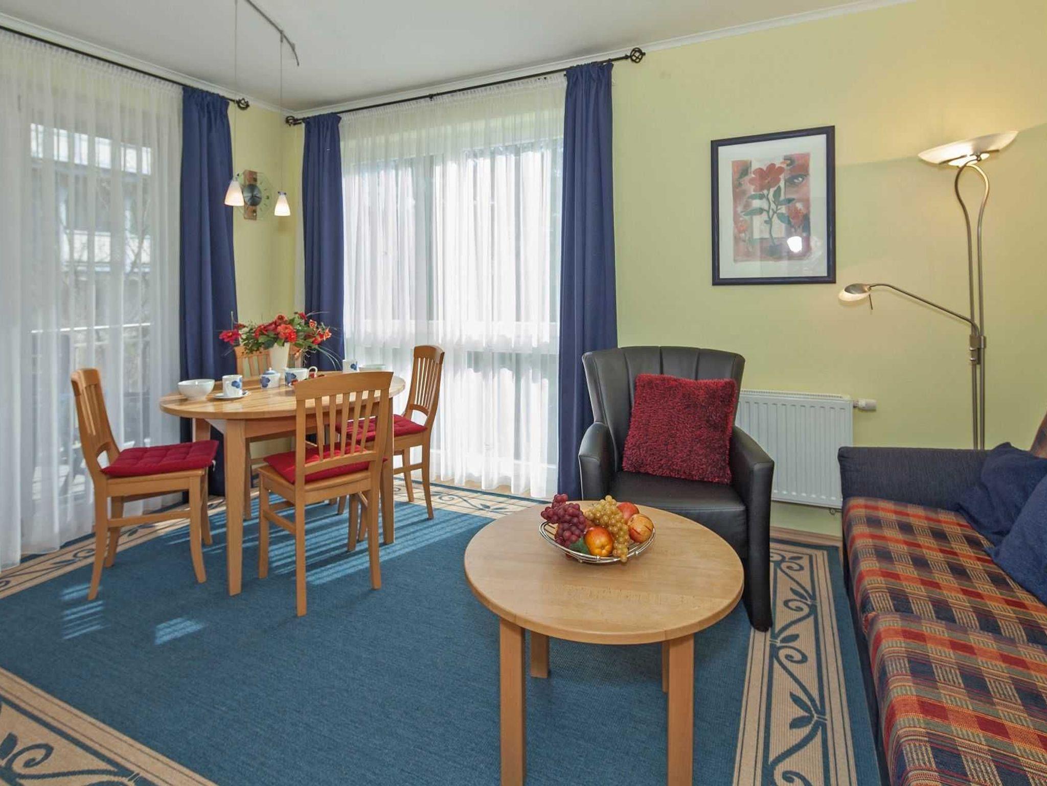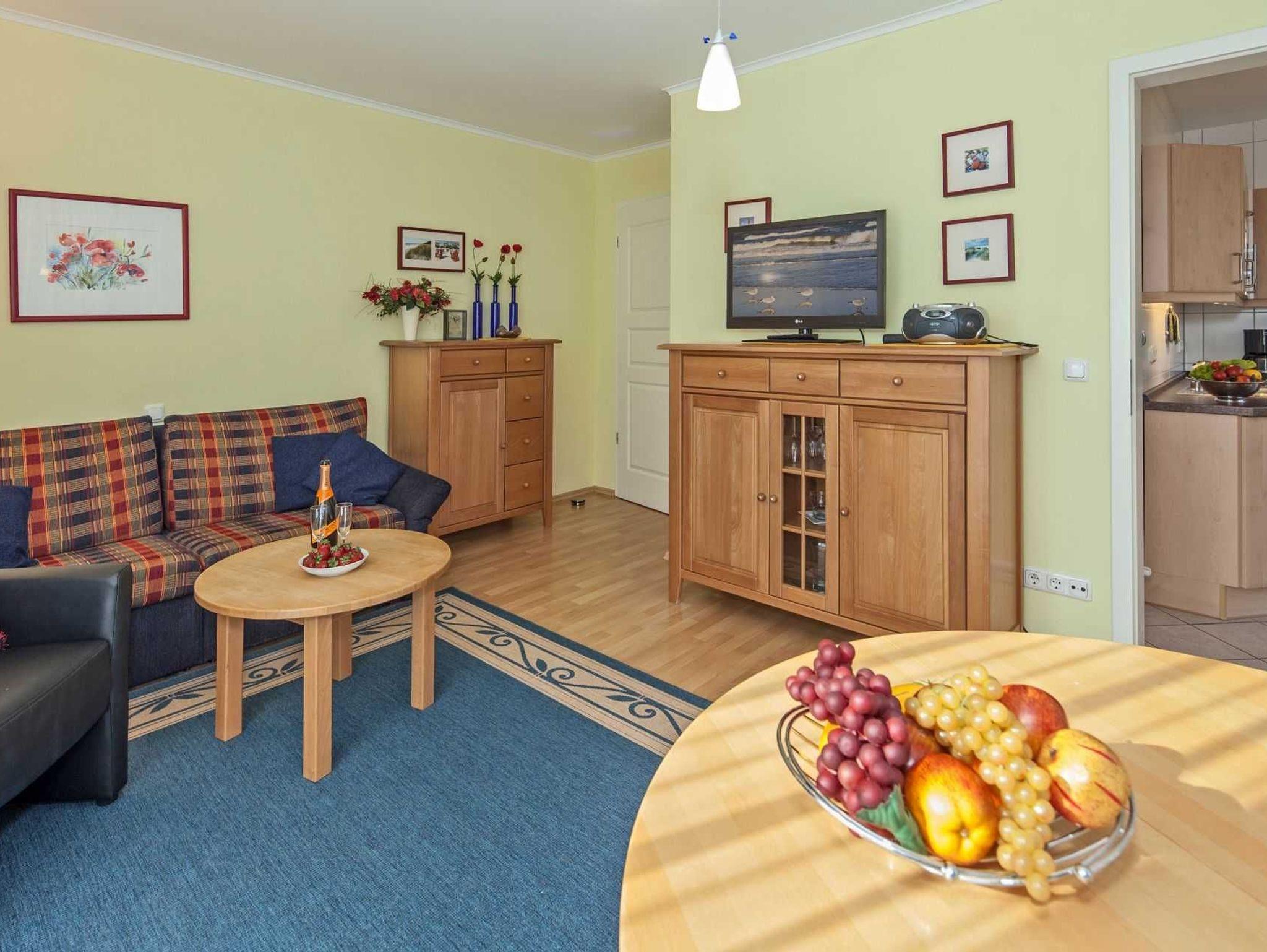 Die Wohnung besteht aus 3 Zimmern mit Duschbad und Flur. Wohnzimmer mit Ausziehcouch integrierte Küchenzeile komplett ausgestattet ( Mikrowelle, Geschirrspüler usw.) Fernseher, Hi-Fi-Anlage. Ein kostenloses WLAN-Netzwerk steht Ihnen zur Verfügung. Balkon, Parkplatz und Fahrradabstellplatz auf dem Grundstück. Ein Strandkorb im Zeitraum von Mai-September steht Ihnen kostenfrei zur Verfügung.