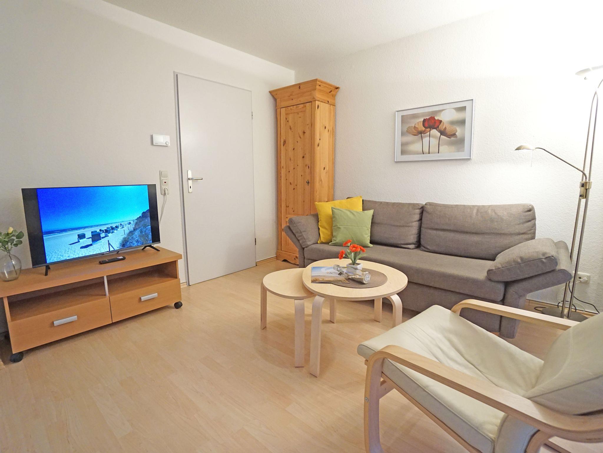 Die Zweizimmerwohnung ist ca. 50 m² groß. Bad mit Dusche und WC. Im Wohnzimmer eine komplett eingerichtete Küchenzeile mit Mikrowelle, Geschirrspüler usw. Wohnzimmer: Esstisch für 4 Personen, Schlafsofa, Kabel-TV, Radio mit CD und Kassette. Schlafzimmer: Doppelbett (180 x 200 cm), Radio. Terrasse mit Zugang zur angrenzenden Liegewiese. Liegestühle und Gartenmöbel vorhanden. Ein kostenloses WLAN-Netzwerk steht Ihnen zur Verfügung.
