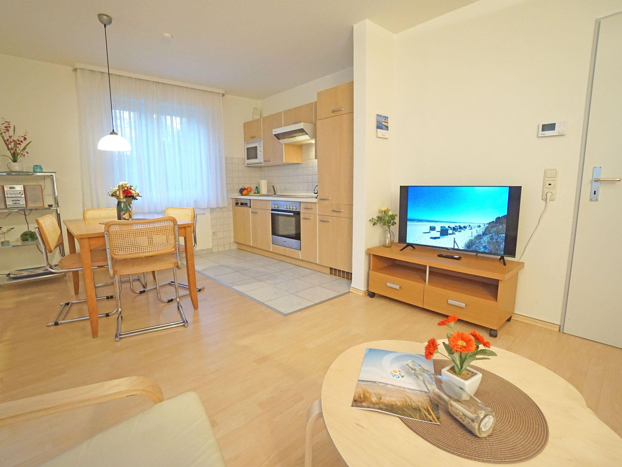 Die Zweizimmerwohnung ist ca. 50 m² groß. Bad mit Dusche und WC. Im Wohnzimmer eine komplett eingerichtete Küchenzeile mit Mikrowelle, Geschirrspüler usw. Wohnzimmer: Esstisch für 4 Personen, Schlafsofa, Kabel-TV, Radio mit CD und Kassette. Schlafzimmer: Doppelbett (180 x 200 cm), Radio, alle Räume mit Laminat bzw. Fliesen. Terrasse mit Zugang zur angrenzenden Liegewiese. Liegestühle und Gartenmöbel vorhanden. Ein kostenloses WLAN-Netzwerk steht Ihnen zur Verfügung.