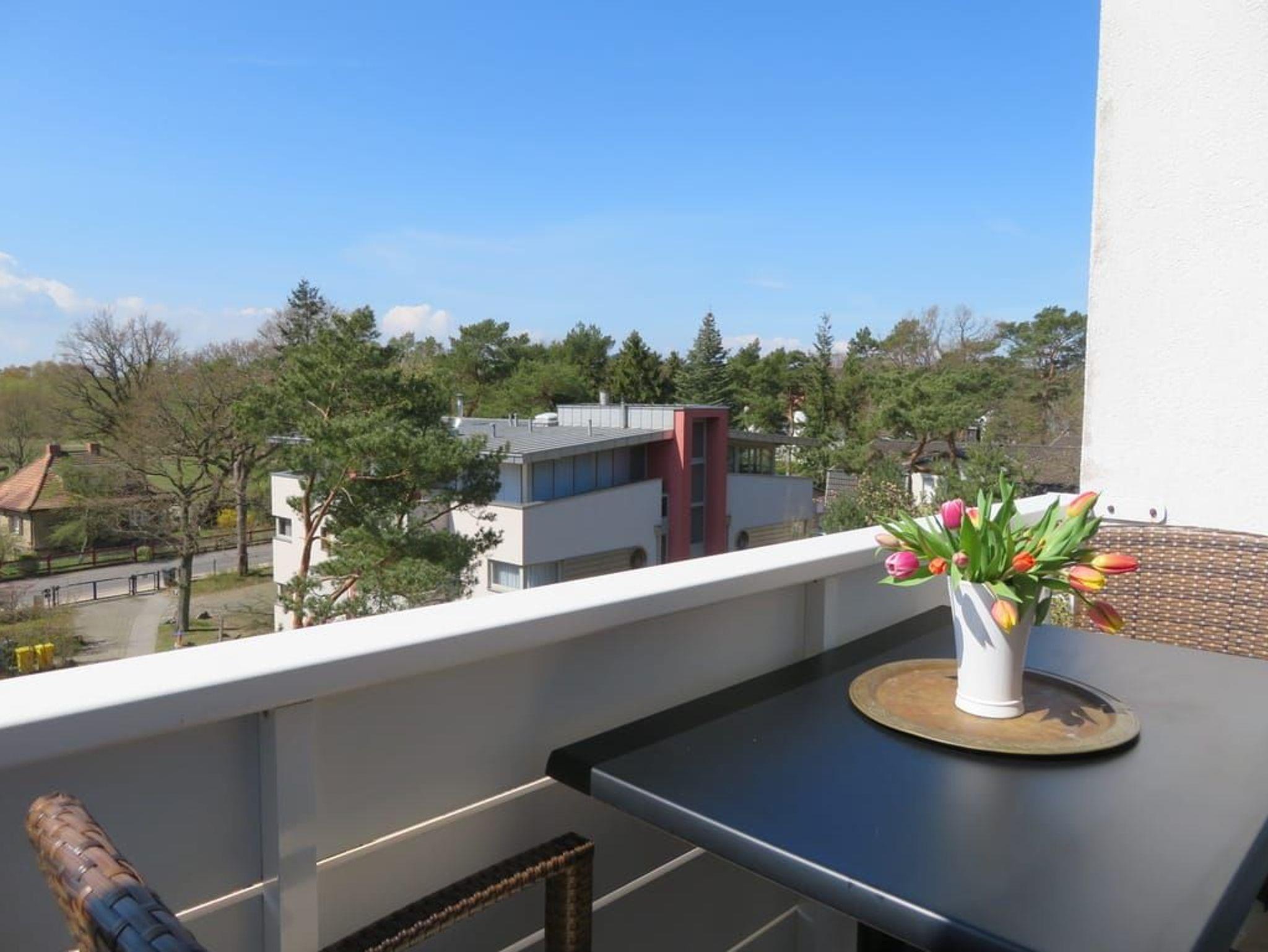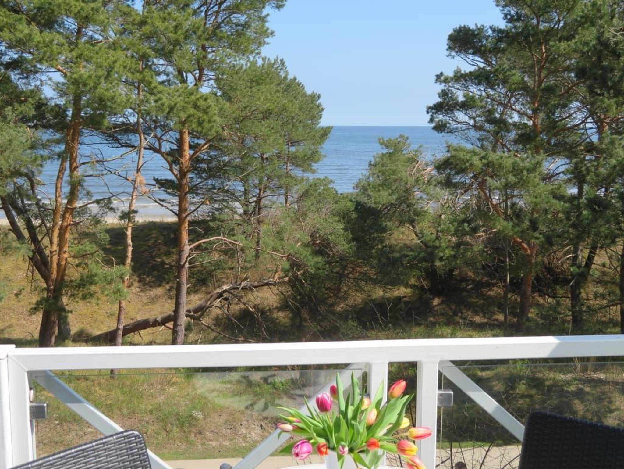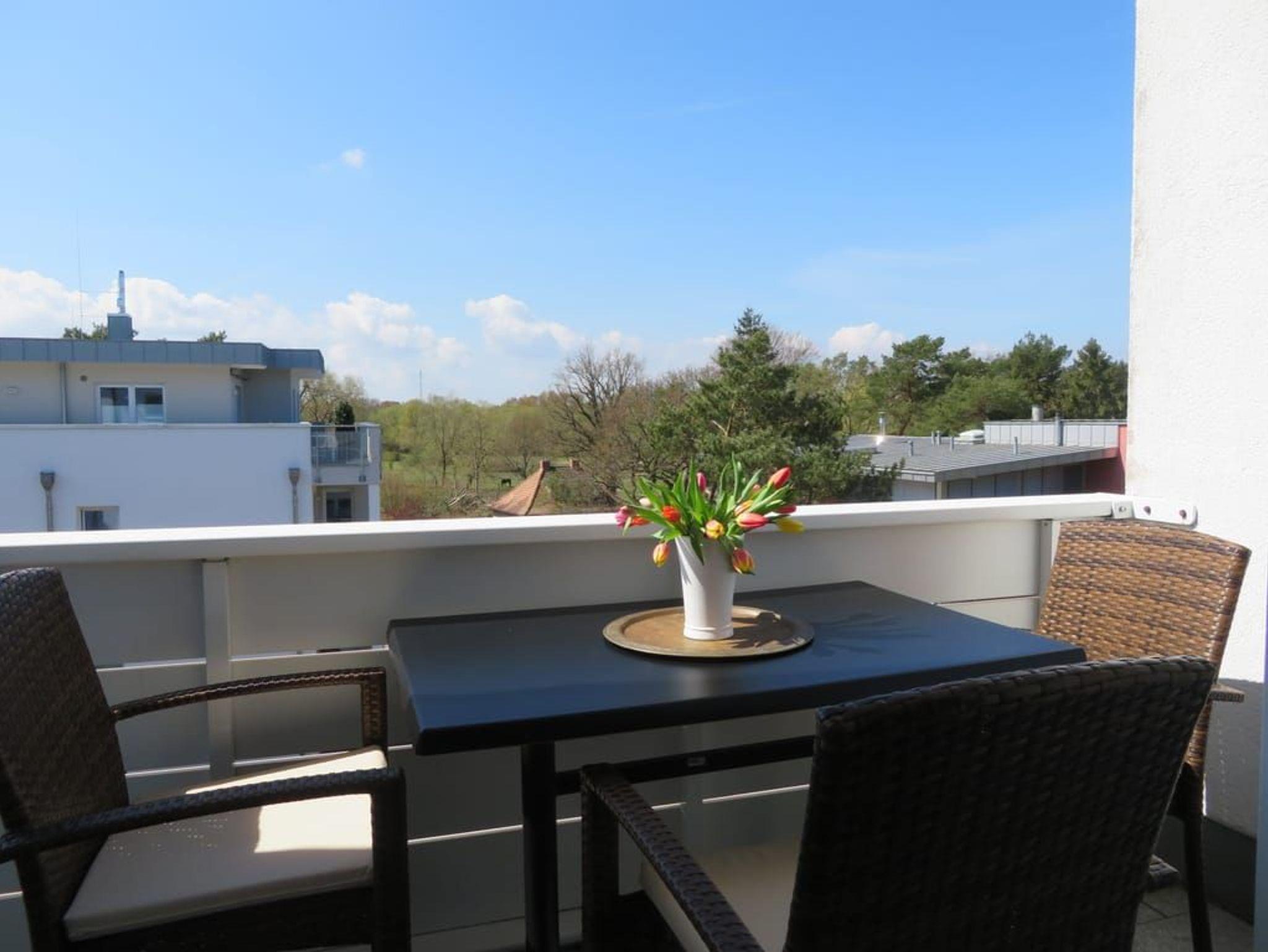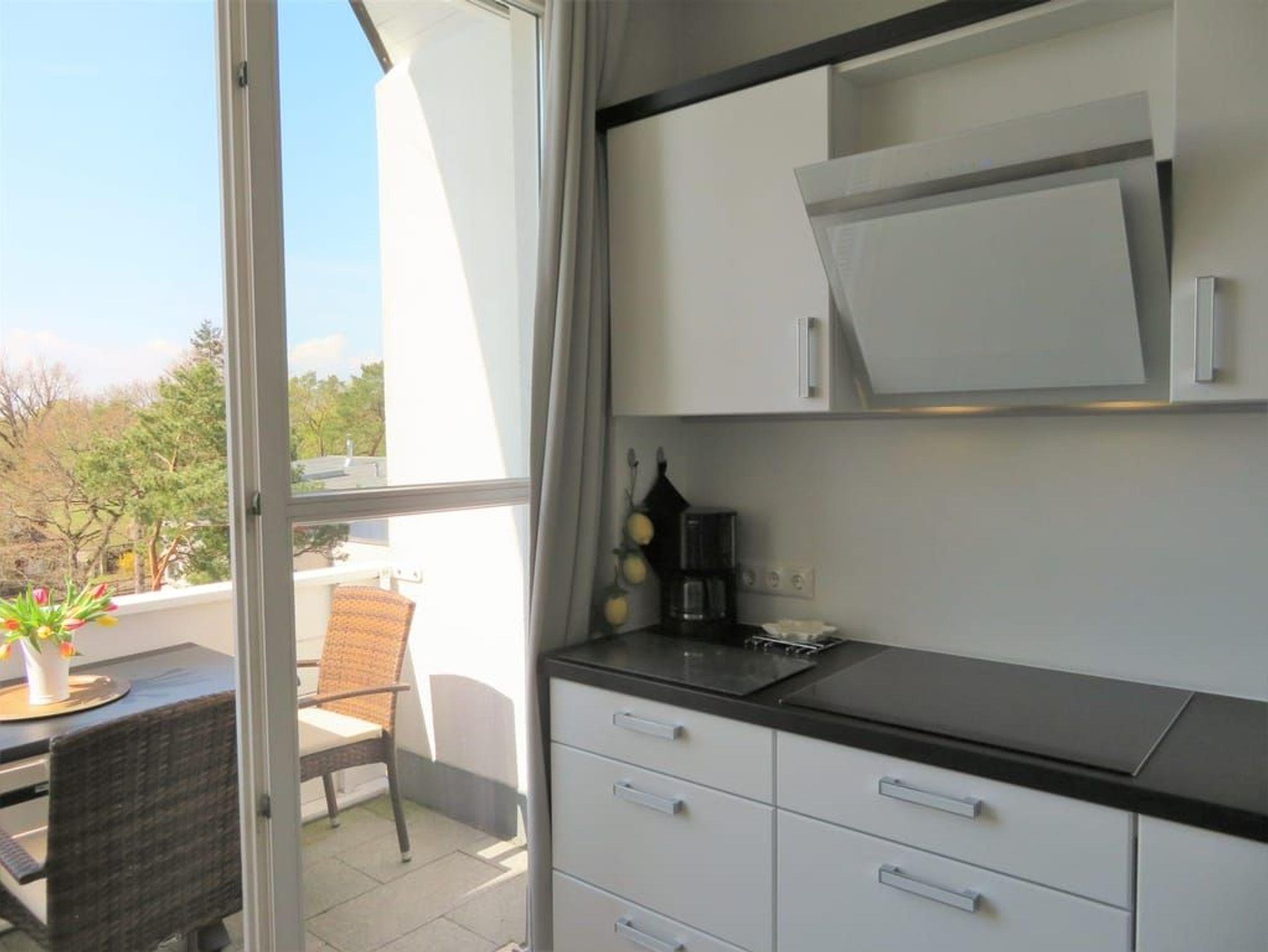 Ein Highlight dieser Wohnung sind die beiden Balkone. Der größere Balkon ist vom Wohnzimmer begehbar und bietet durch die Bäume auf der Düne hindurch einen Blick auf die Ostsee. Das großzügige Wohnzimmer verfügt über eine komfortable Sitzecke mit Flachbildfernseher sowie einen großen Esstisch. Die separate, vollausgestattete Küche ist mit Geschirrspüler, großem Kühlschrank mit Gefriermöglichkeit, Backofen, Mikrowelle und Waschmaschine (gg. Gebühr) ausgestattet. Von der Küche aus gelangt man auf den sonnigen Südbalkon zum Hof des Hauses.