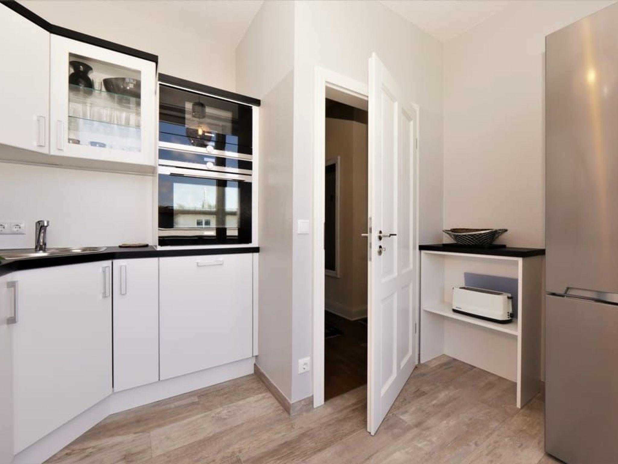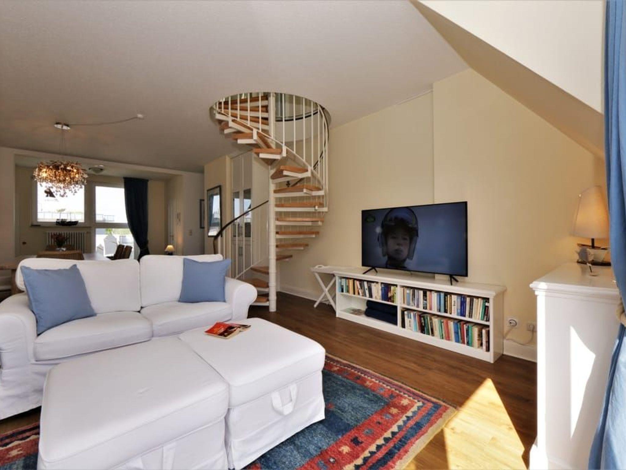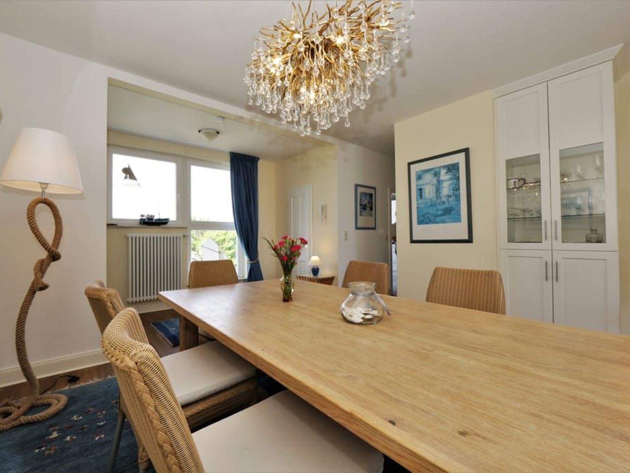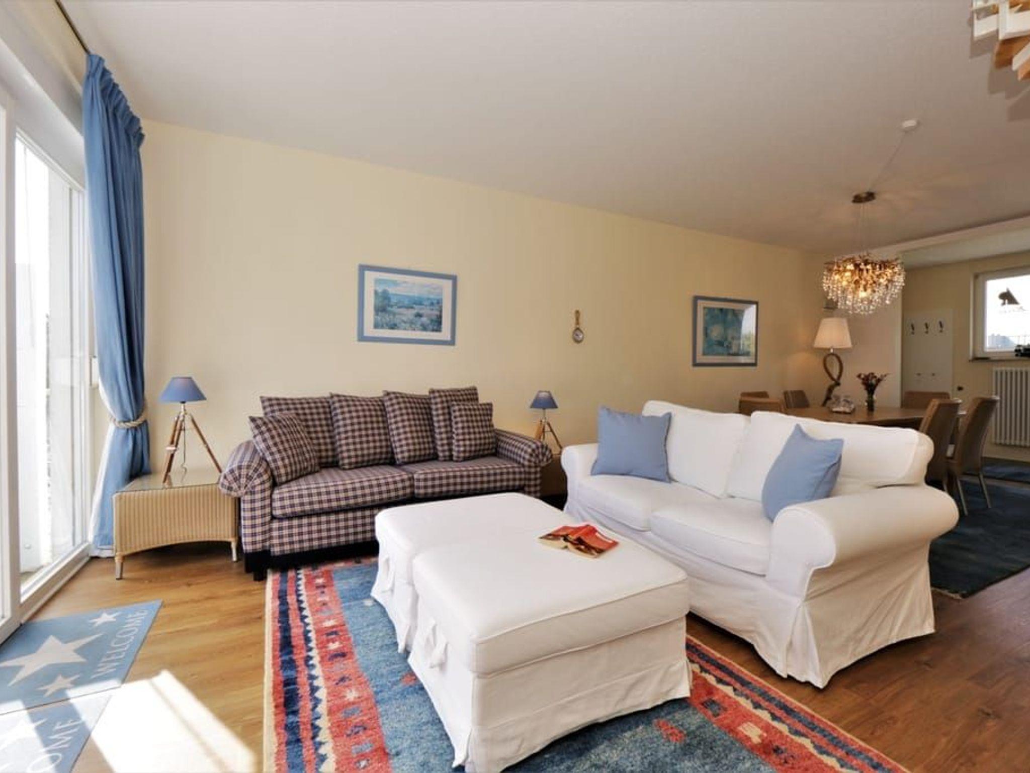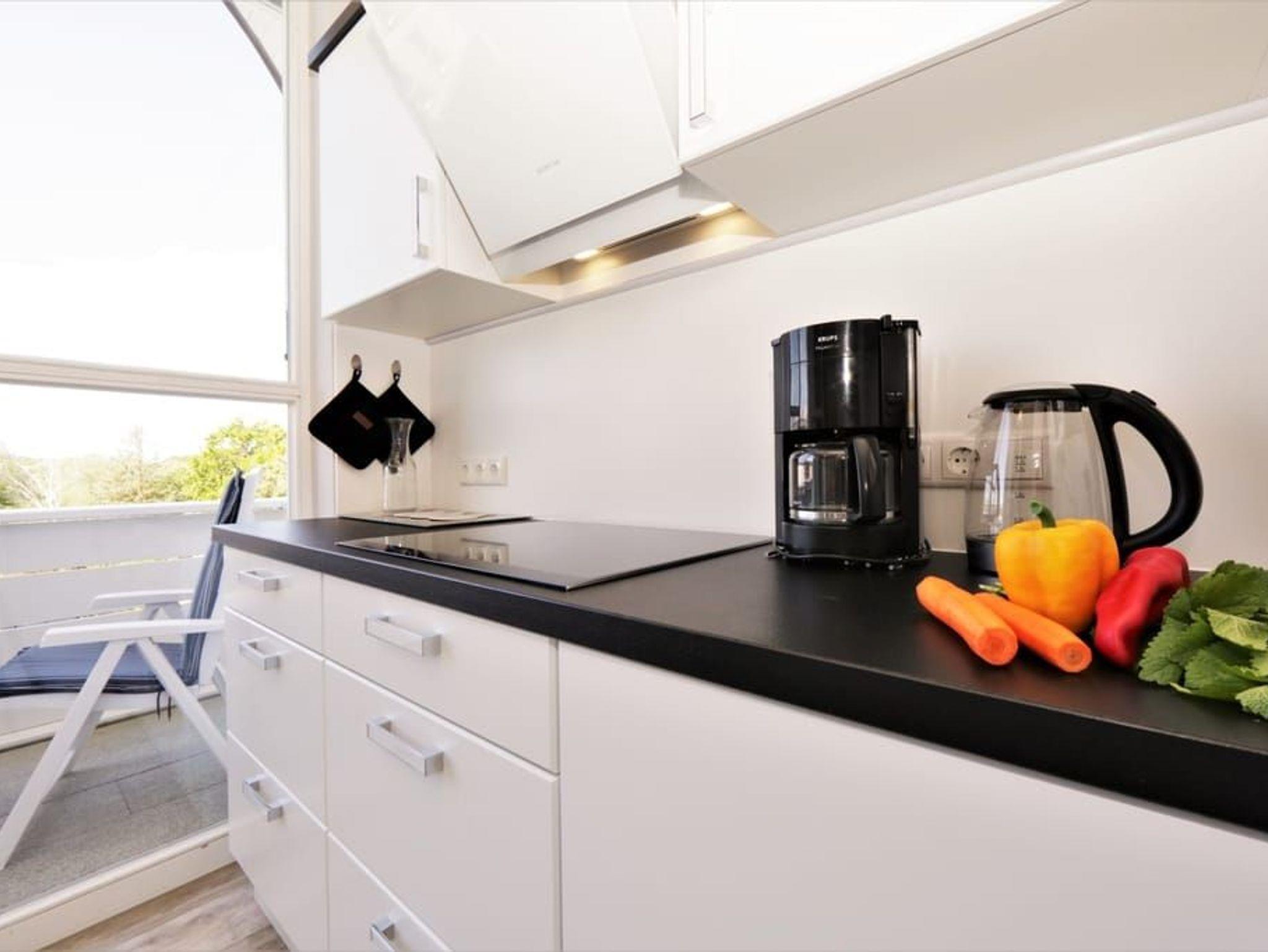 Ein Highlight dieser Wohnung sind die beiden Balkone. Der größere Balkon ist vom Wohnzimmer begehbar und bietet durch die Bäume auf der Düne hindurch einen Blick auf die Ostsee. Das großzügige Wohnzimmer verfügt über eine komfortable Sitzecke mit Flachbildfernseher sowie einen großen Esstisch. Die separate, vollausgestattete Küche ist mit Geschirrspüler, großem Kühlschrank mit Gefriermöglichkeit, Backofen, Mikrowelle und Waschmaschine (gg. Gebühr) ausgestattet. Von der Küche aus gelangt man auf den sonnigen Südbalkon zum Hof des Hauses.