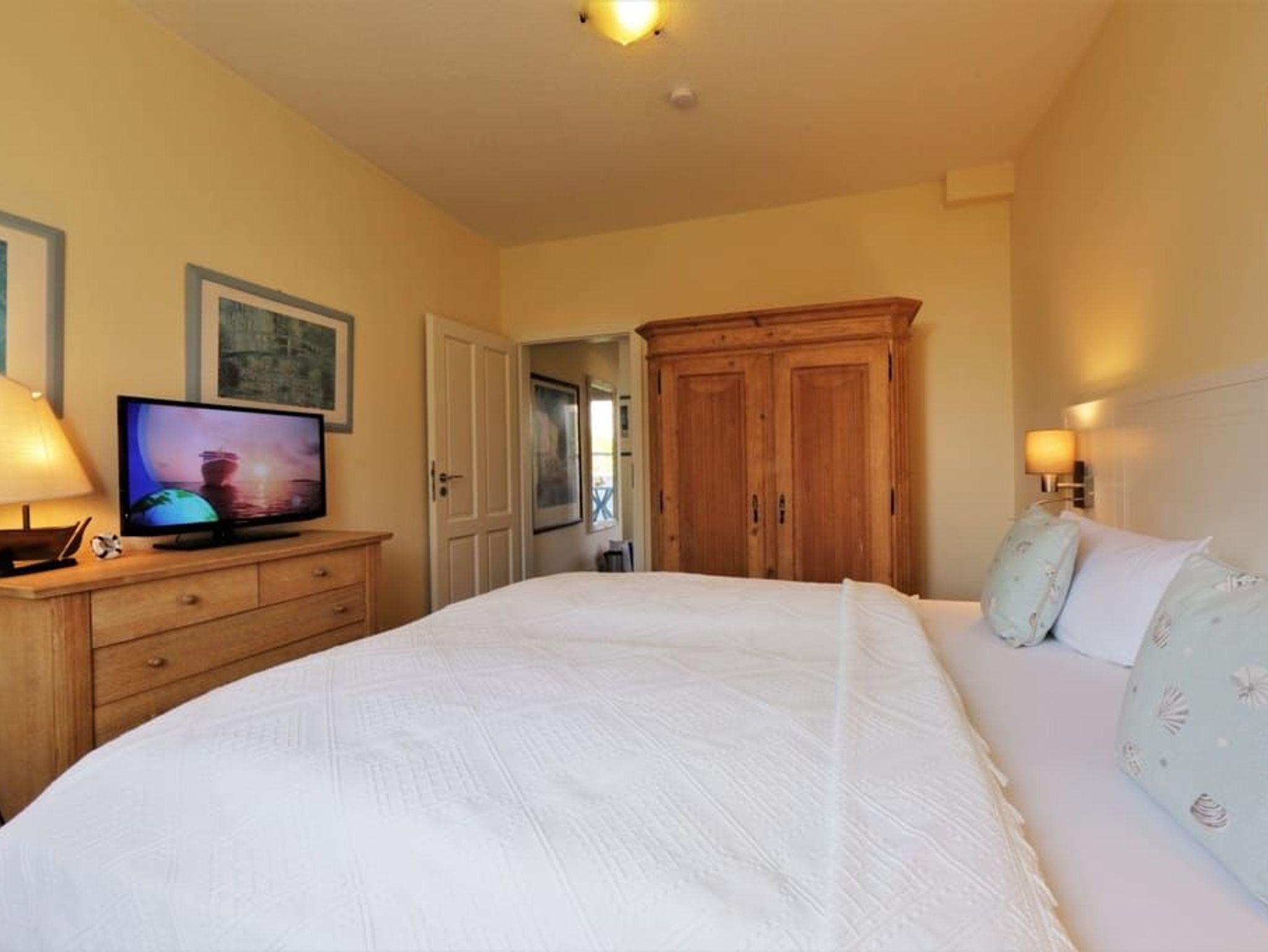 Das Schlafzimmer ist mit einem Doppelbett (180 x 200), Kleiderschrank und zweitem Fernseher ausgestattet. Als Aufbettungsmöglich steht die Couch im Wohnzimmer zur Verfügung (Liegefläche 140 x 195). Die abgebildete Treppe im Wohnzimmer führt zu privat genutzten Räumen und steht den Mietern der Ferienwohnung nicht zur Verfügung. Das Bad ist mit Dusche, Waschbecken und WC ausgestattet.