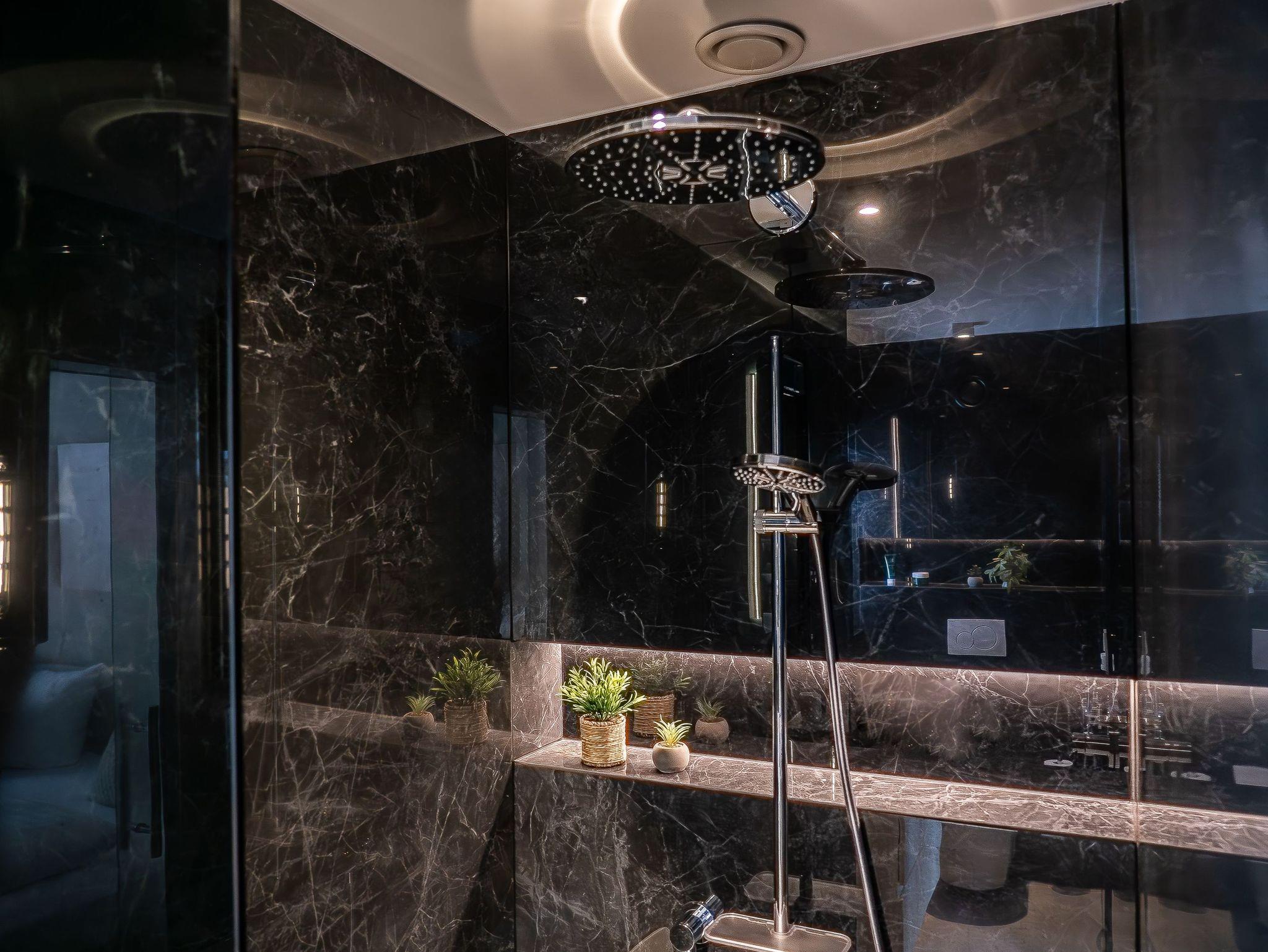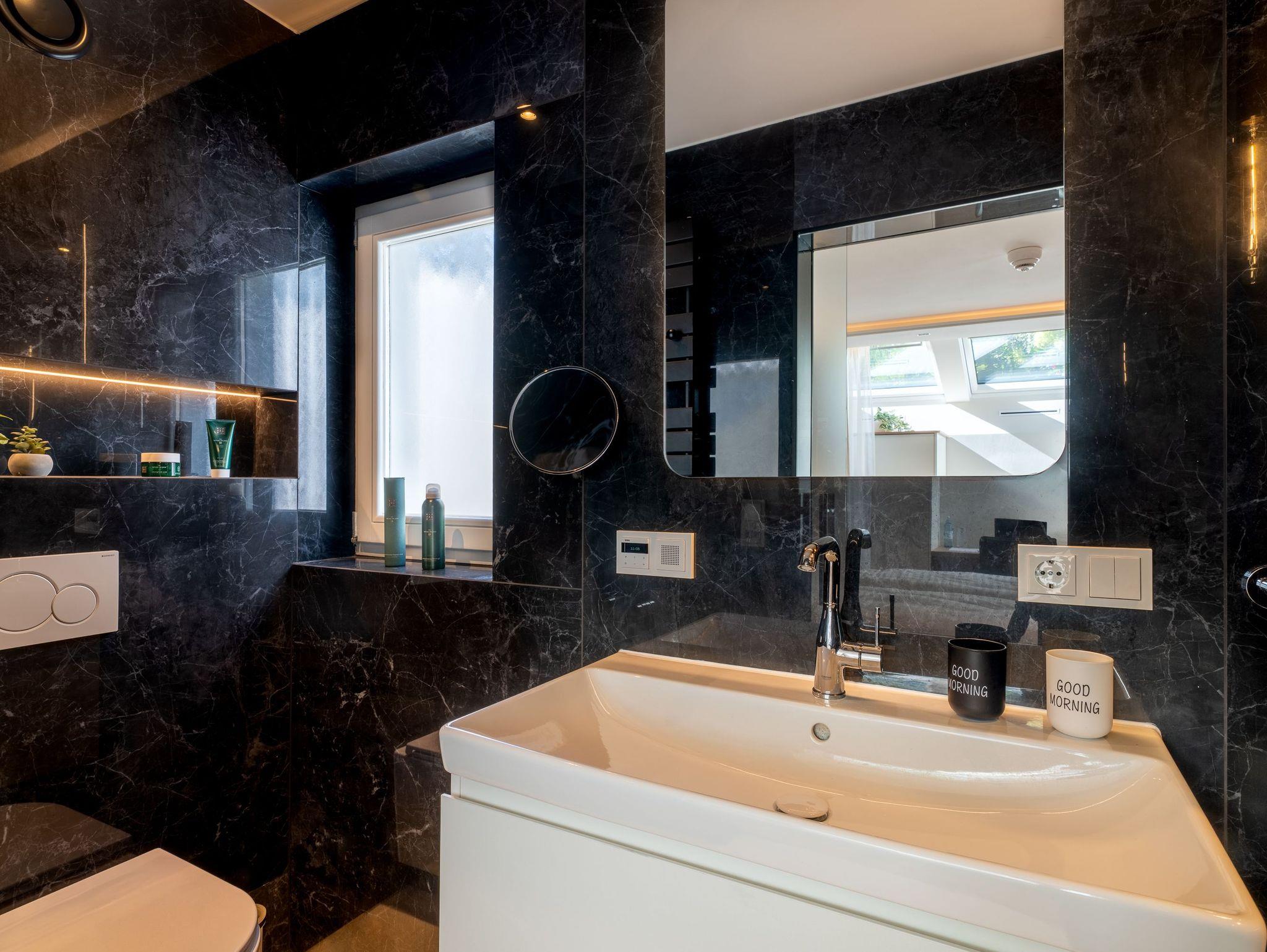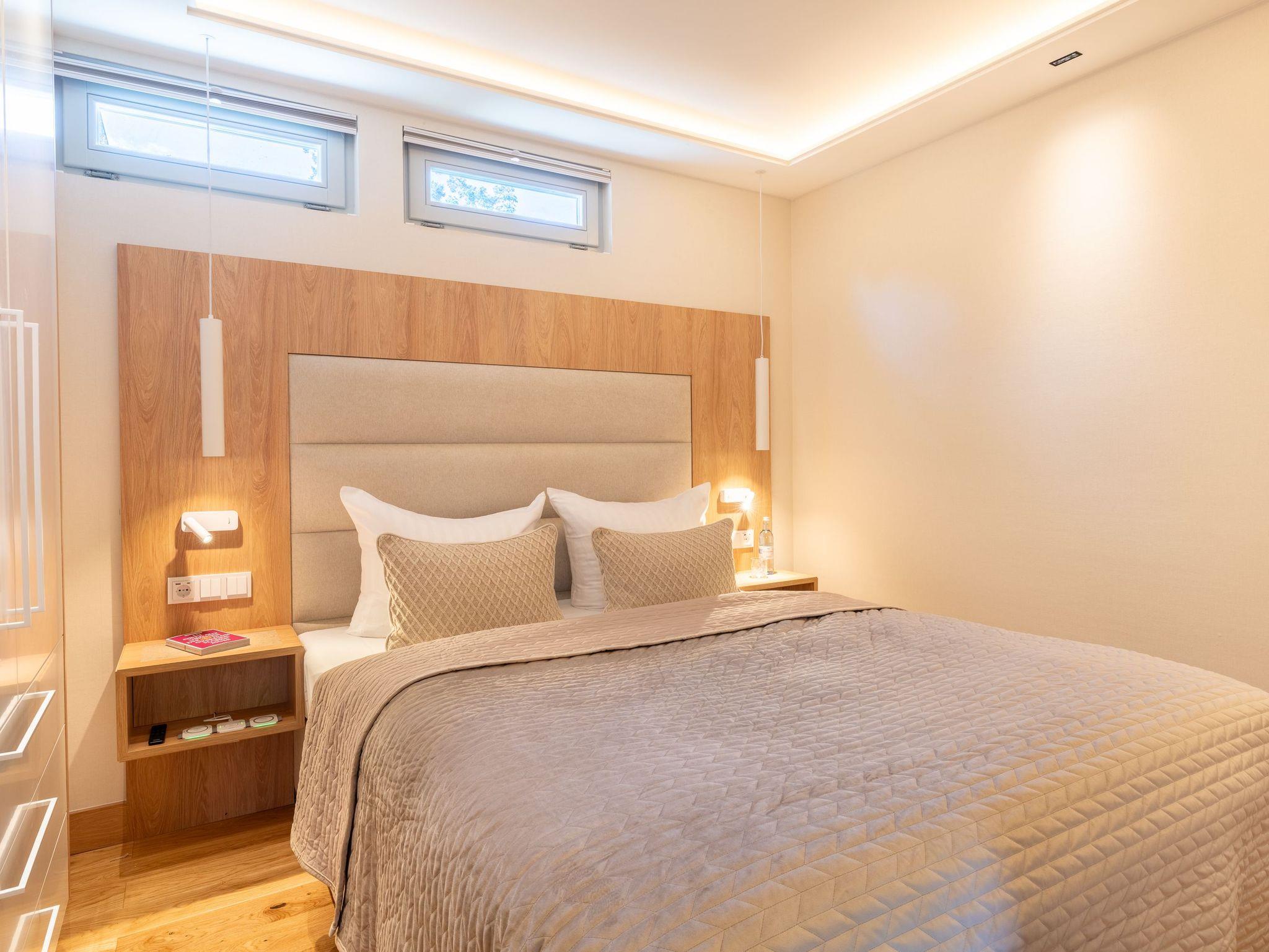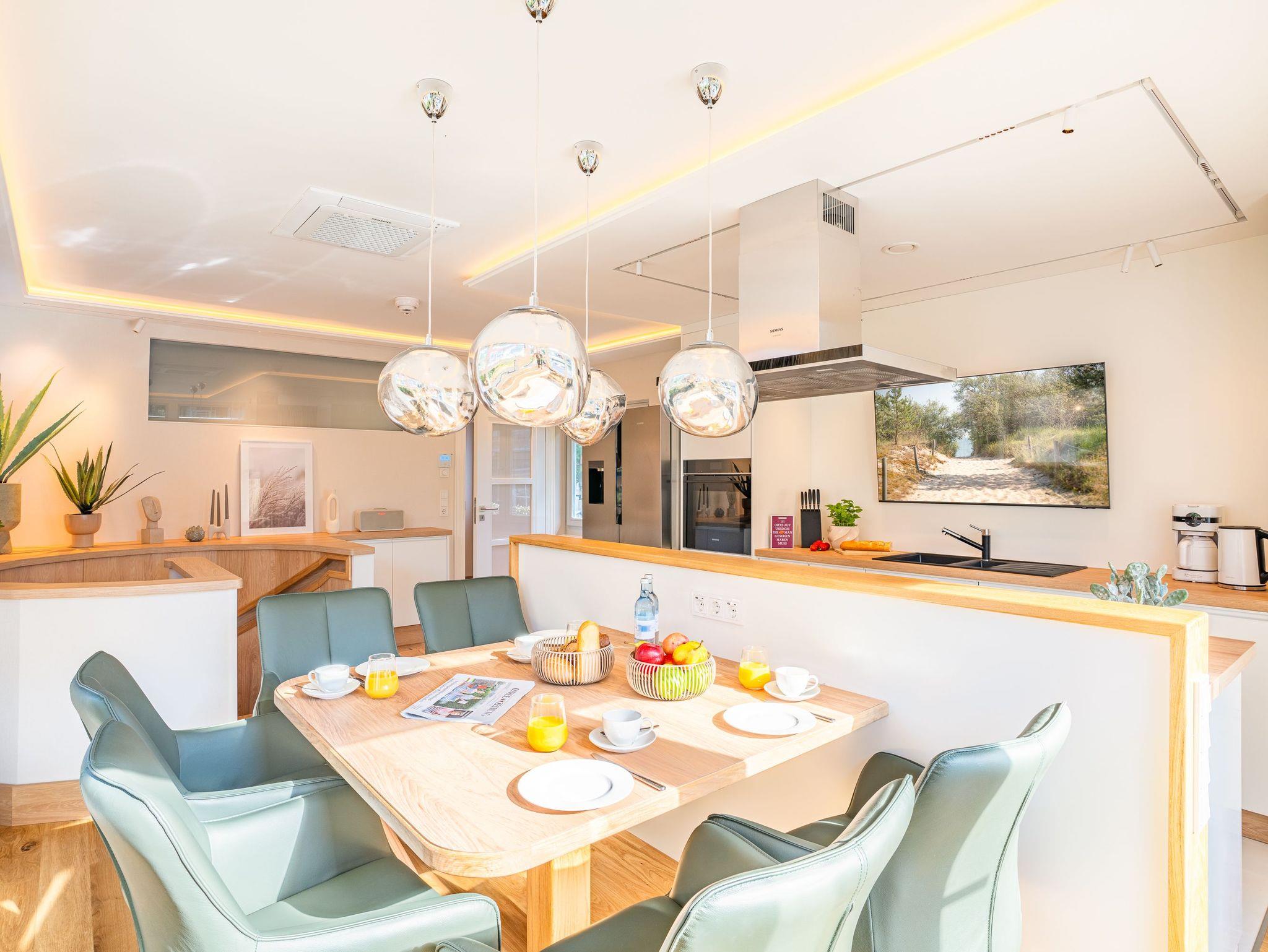Erdgeschoss: Wohnbereich mit Flat-TV, Gaskamin, großzügigen Fensterflächen, individuell einstellbare Verschattungsanlage und direktem Zugang zur möblierten Terrasse mit zwei Relaxliegen und kleiner Sitzecke ? perfekt für entspannte Sonnenstunden. Hochwertige, separate Küche mit Esstisch für sechs Personen, Smart-TV, Induktionskochfeld, Kombibackofen mit Mikrowelle, Wärmeschublade mit Tellerwärmer, Side-by-Side-Kühlschrank mit großem Gefrierschrank und Wasser- und Eiswürfelspender, Geschirrspüler sowie Kaffeevollautomat. Vom Essbereich gelangen Sie auf eine zweite Terrasse mit großem Gartentisch, Sonnenschirm und Elektrogrill ? ideal für gesellige Grillabende. Im Erdgeschoss befindet sich zudem ein gemütliches Schlafzimmer mit Doppelbett (160 x 200 cm) und Smart-TV sowie ein modernes Badezimmer mit Dusche und WC.