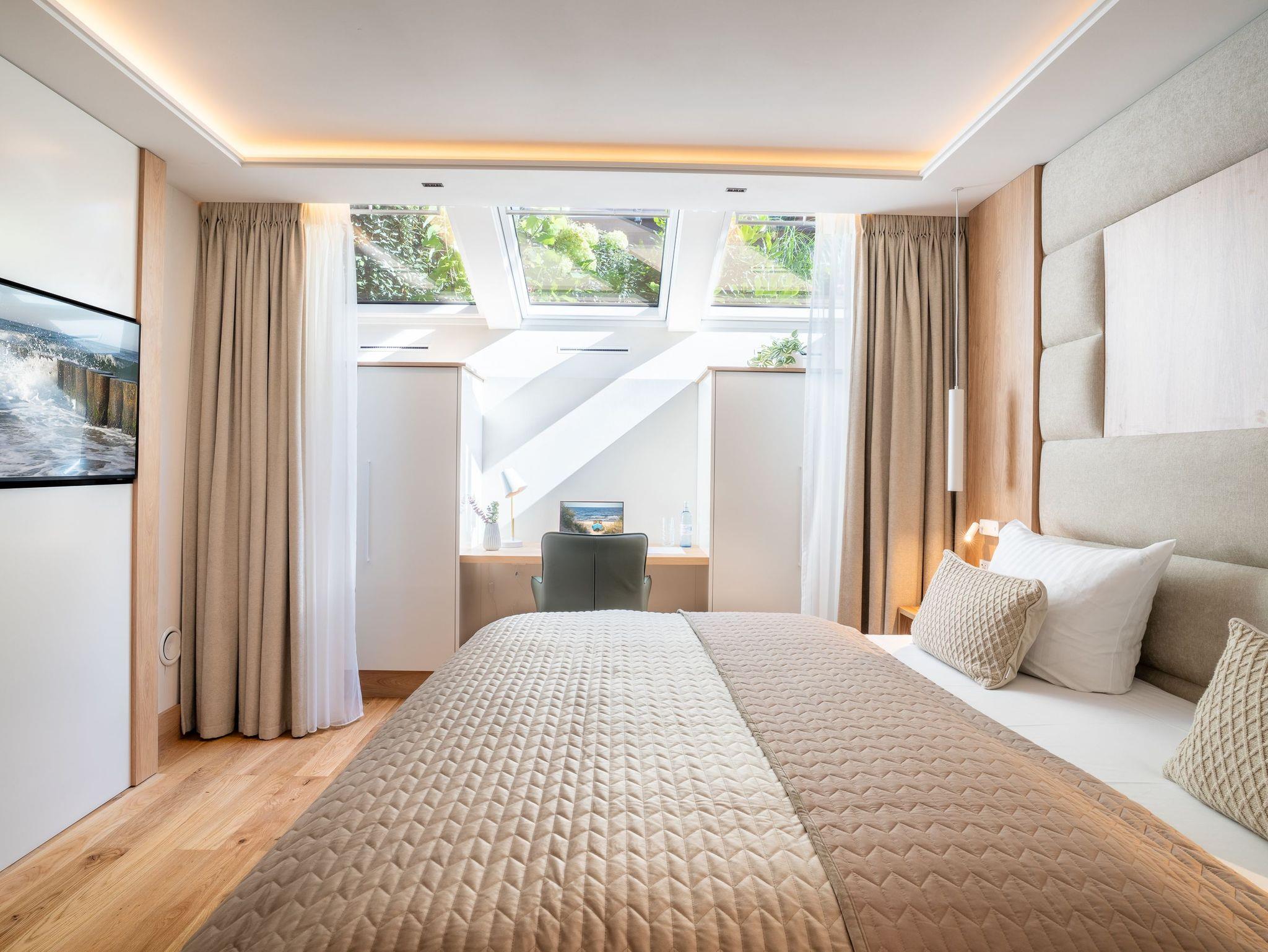 Gartengeschoss: Zwei weitere komfortable Schlafzimmer ? eines mit Doppelbett (180 x 200 cm), das andere mit XXL-Doppelbett (200 x 200 cm). Beide Zimmer verfügen über eigenen Flat-TV und ein Bad en suite mit Dusche und WC. Alle Betten mit Federkernmatratzen und integriertem Stauraum. Im Schlafzimmer ist eine Aufbettung für ein Kleinkind bis 3 Jahren in einem Babyreisebett möglich: Hochstuhl und Babyreisebett können separat kostenfrei hinzugebucht werden.